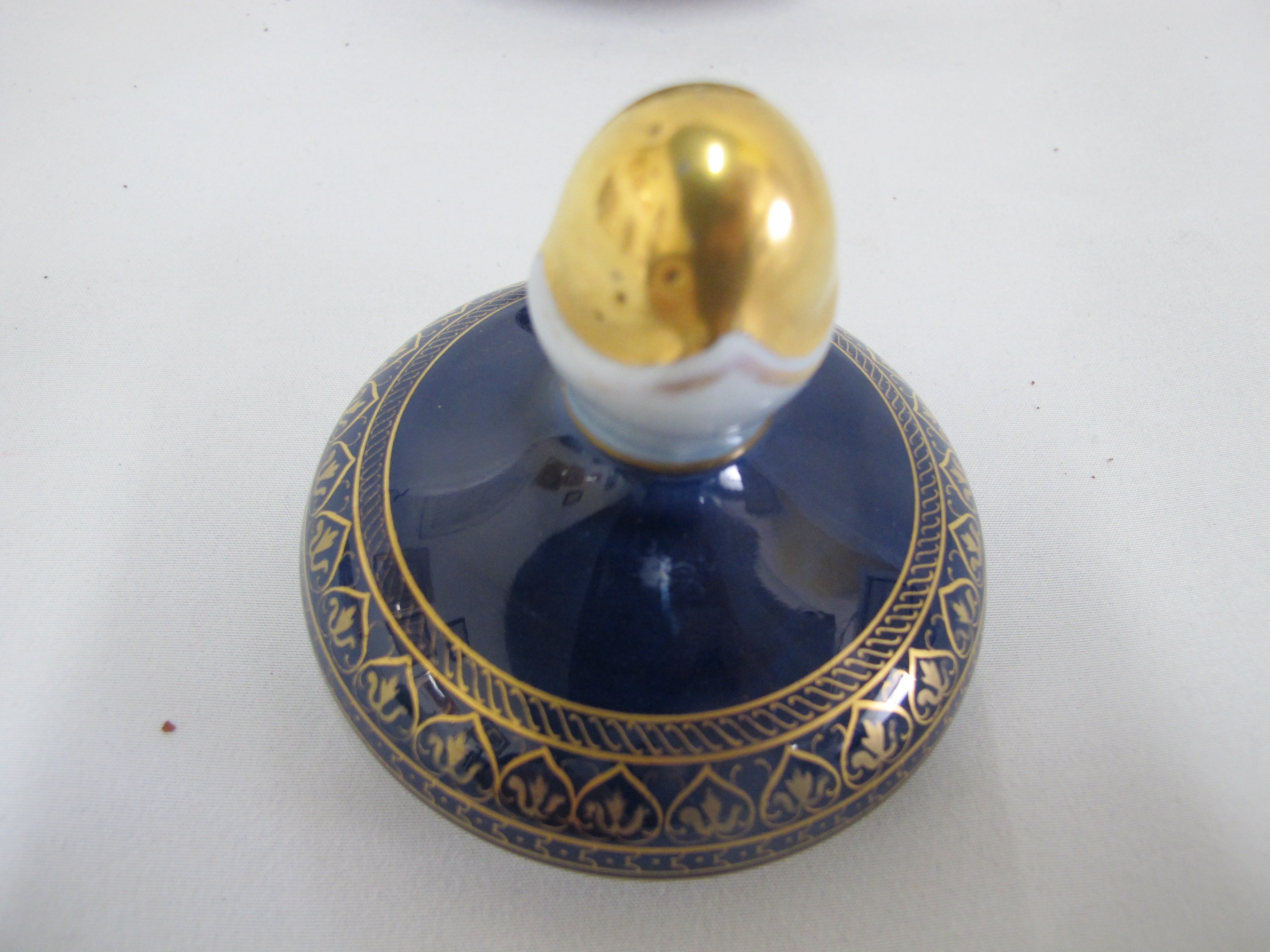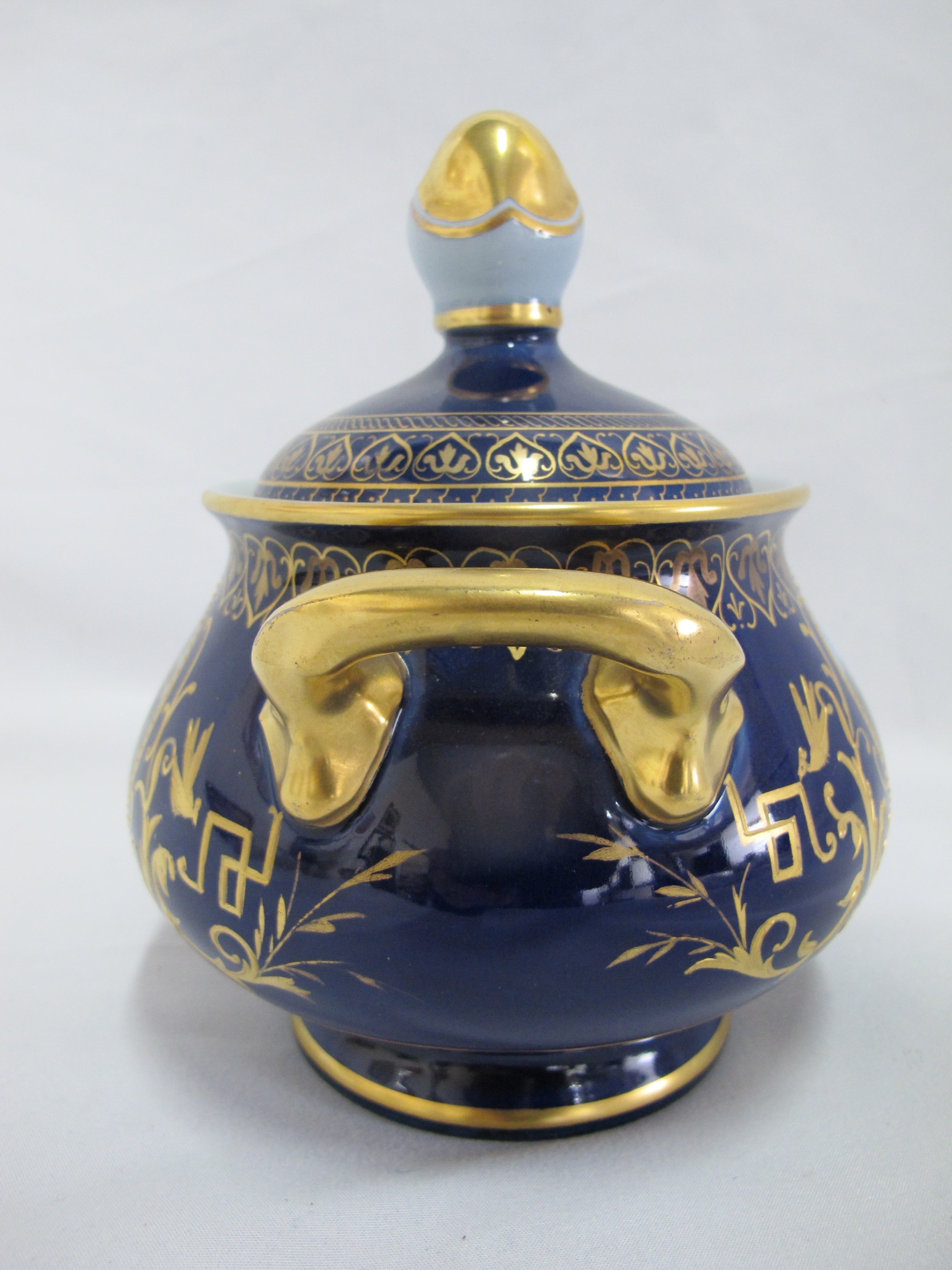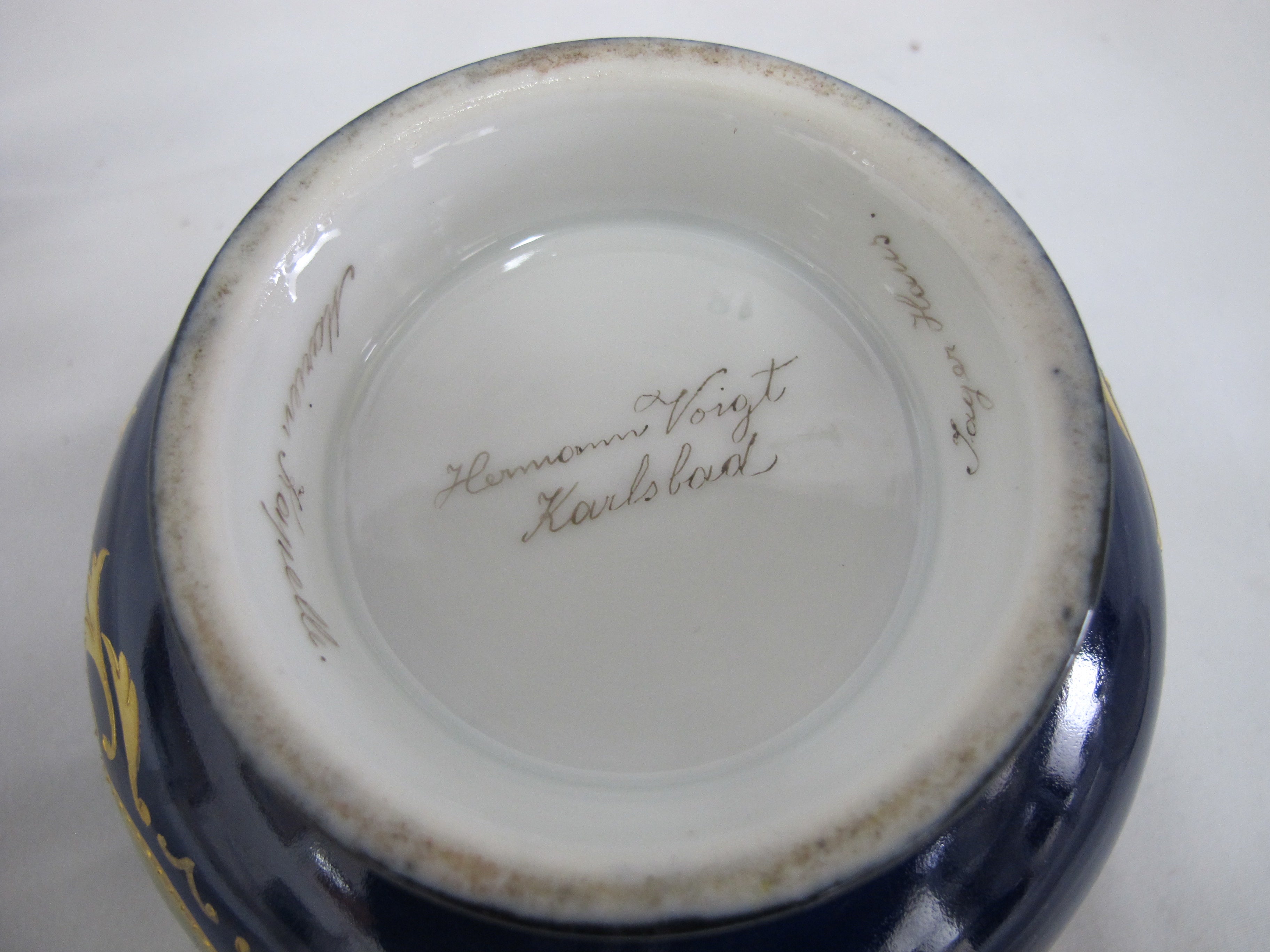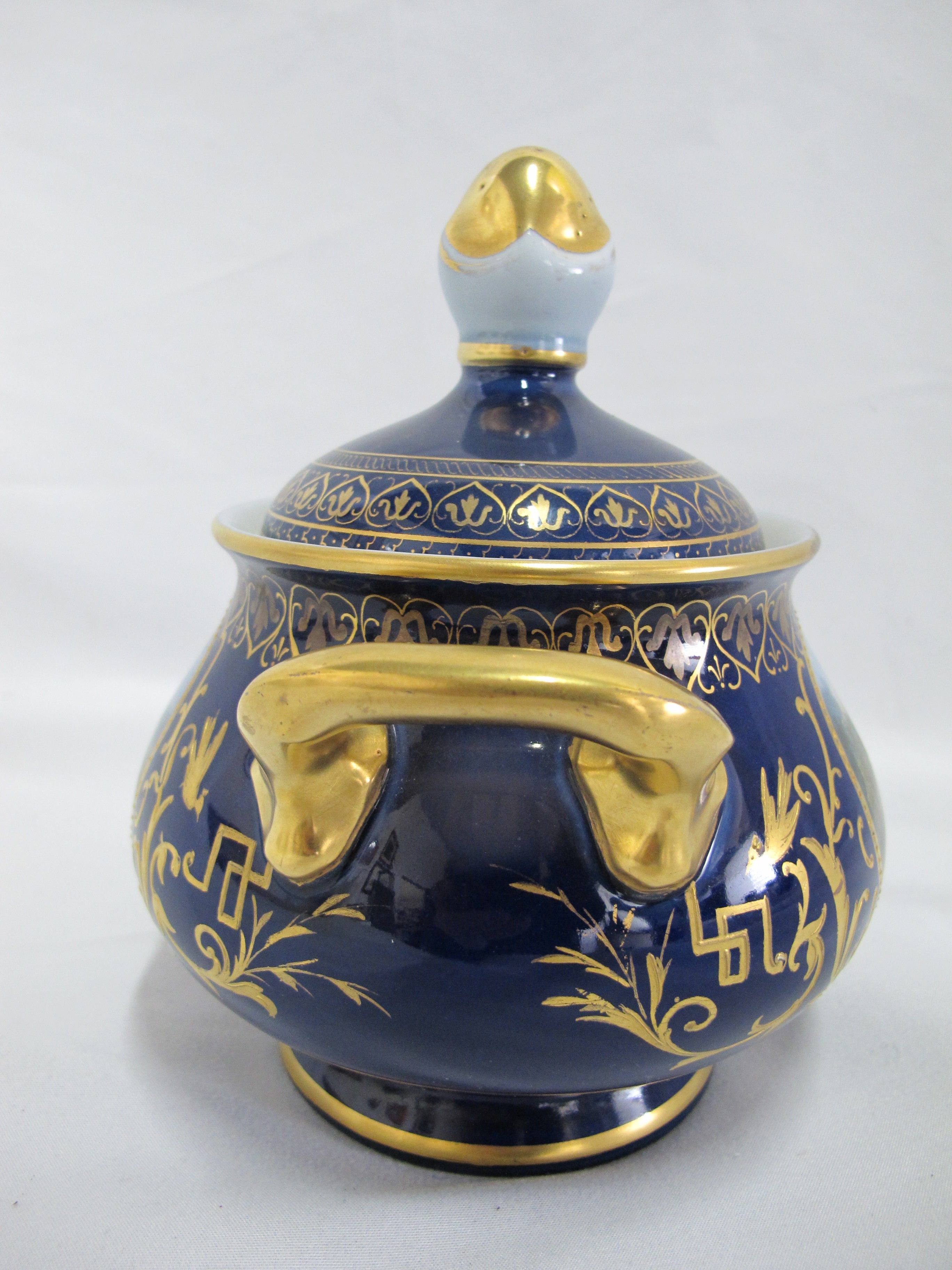 19th century, Karlsbad Hermann Voigt, Bohemia porcelain sugar bowl with lid. Cobalt blue with ornate gilt accents and finely hand painted architectural landscape showing 2 churches, Marien Kapelle and Tayer Haus (as marked on base). Absolutely stunning.