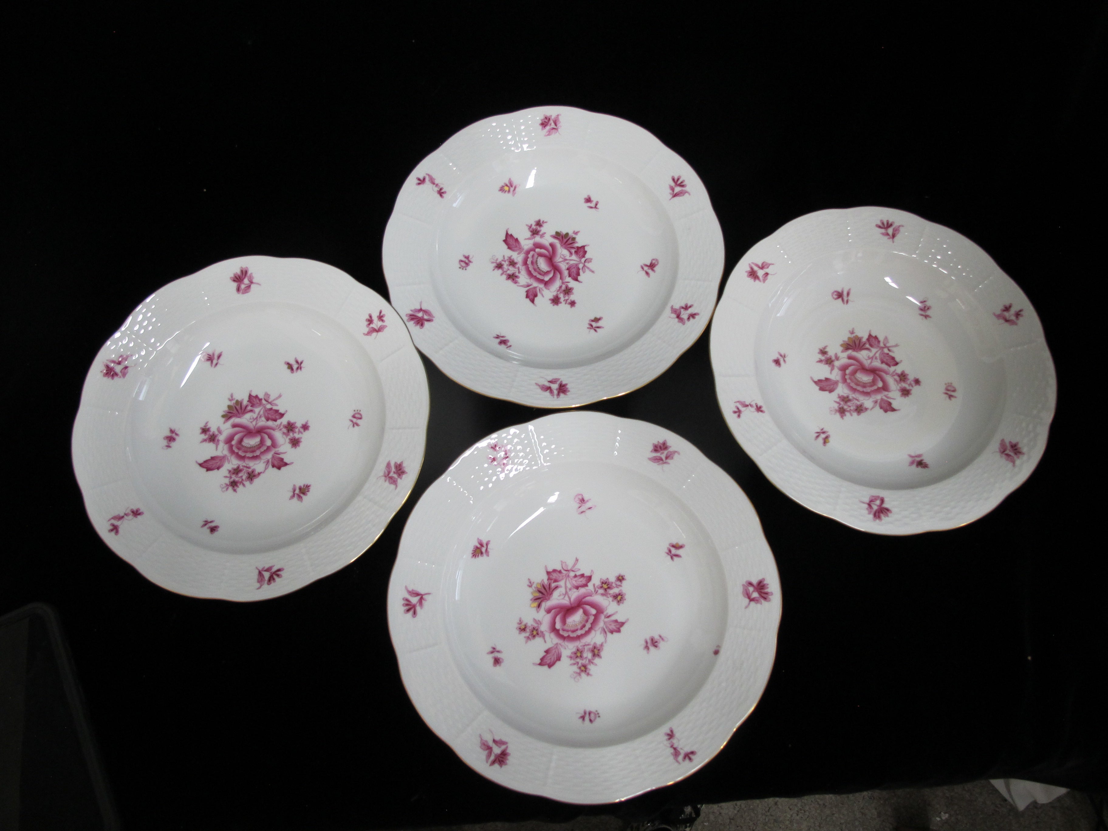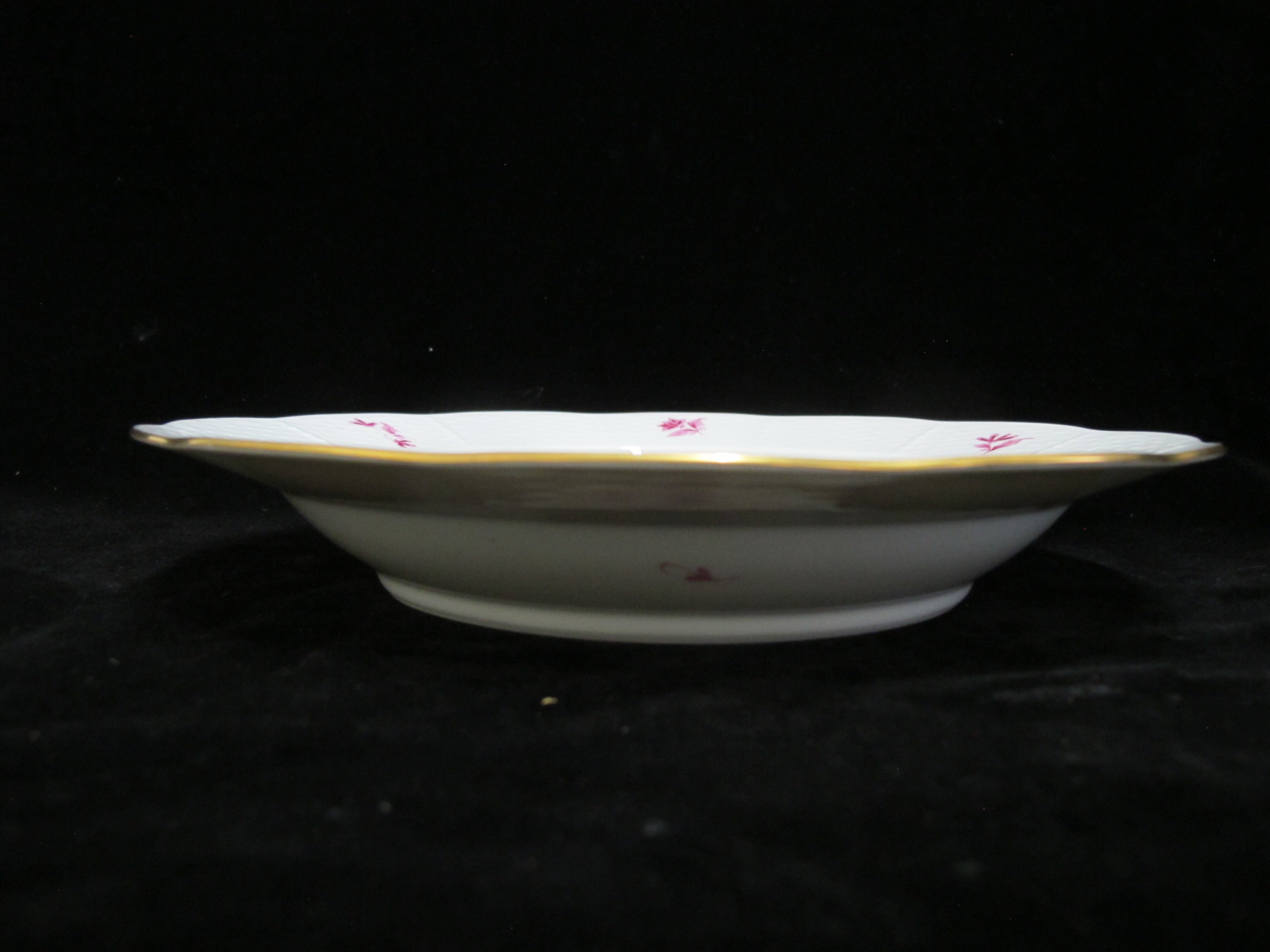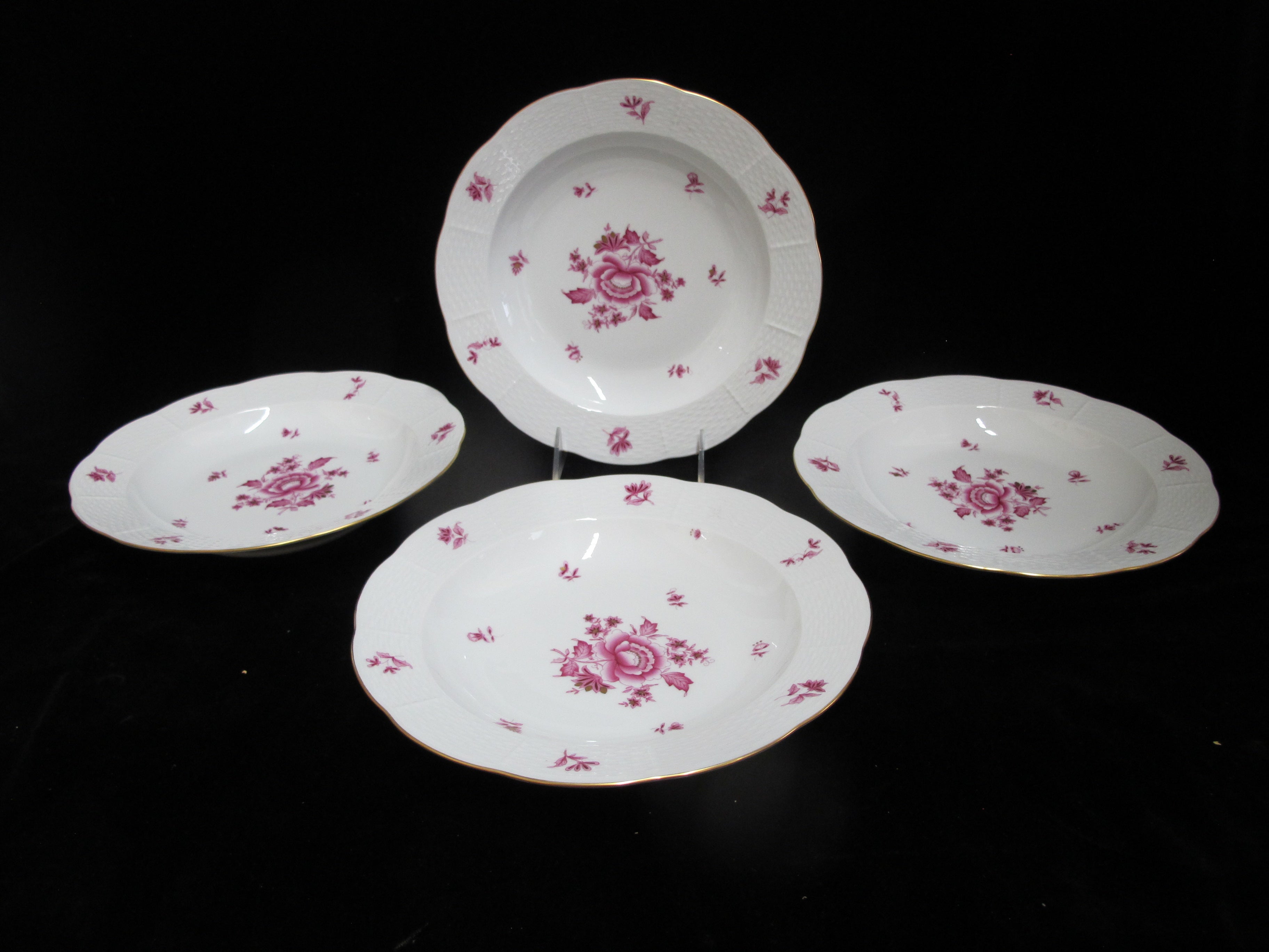 Herend Hungary porcelain rimmed soup bowl set of 4 in pink raspberry Nanking or NBP pattern. Hand painted pink flowers with gold accents. Large rim, shallow bowl. Each measures approximately 9 1/2" x 1 1/2" tall. All are in excellent condition, no chips, cracks, or repairs.