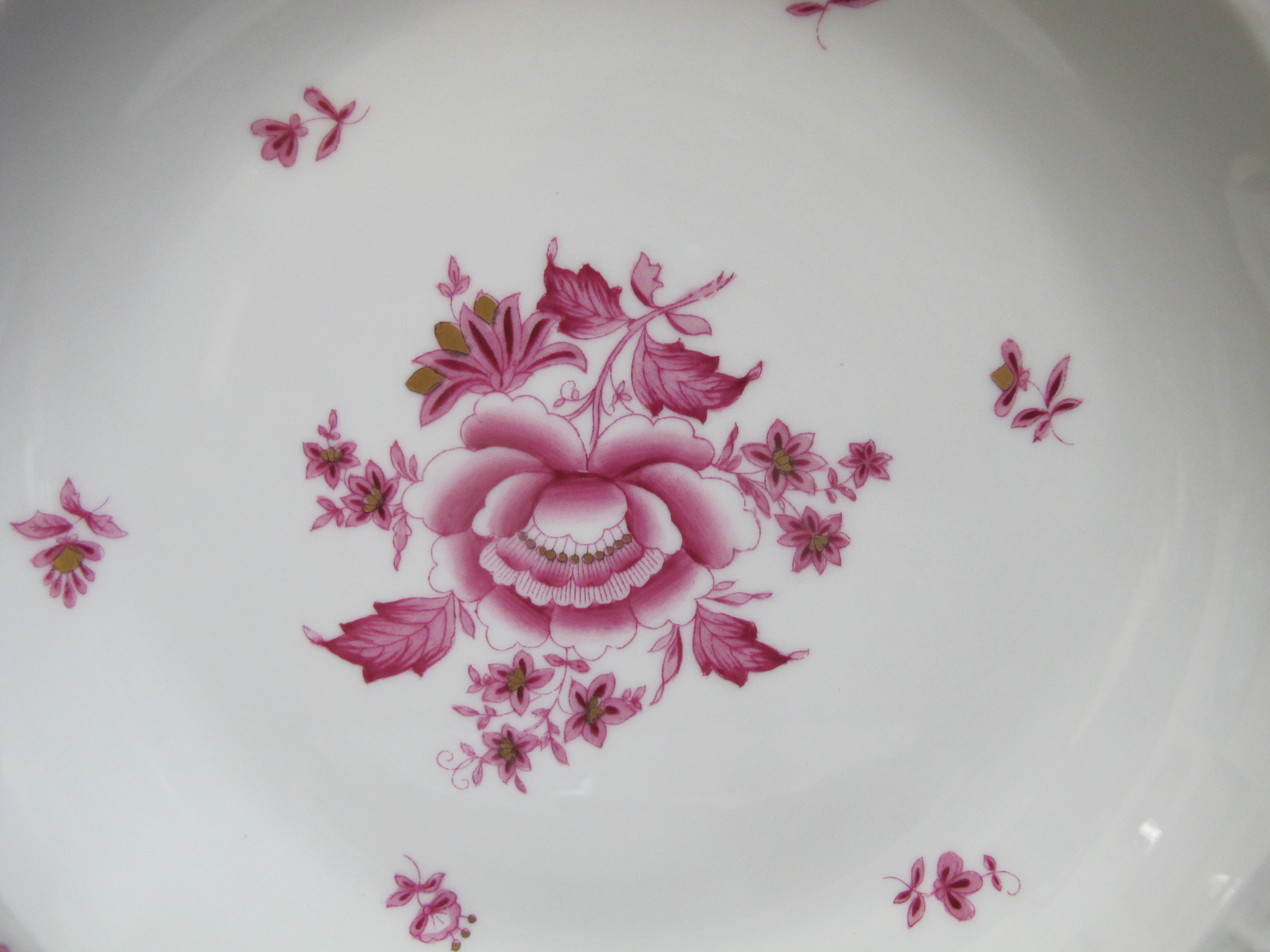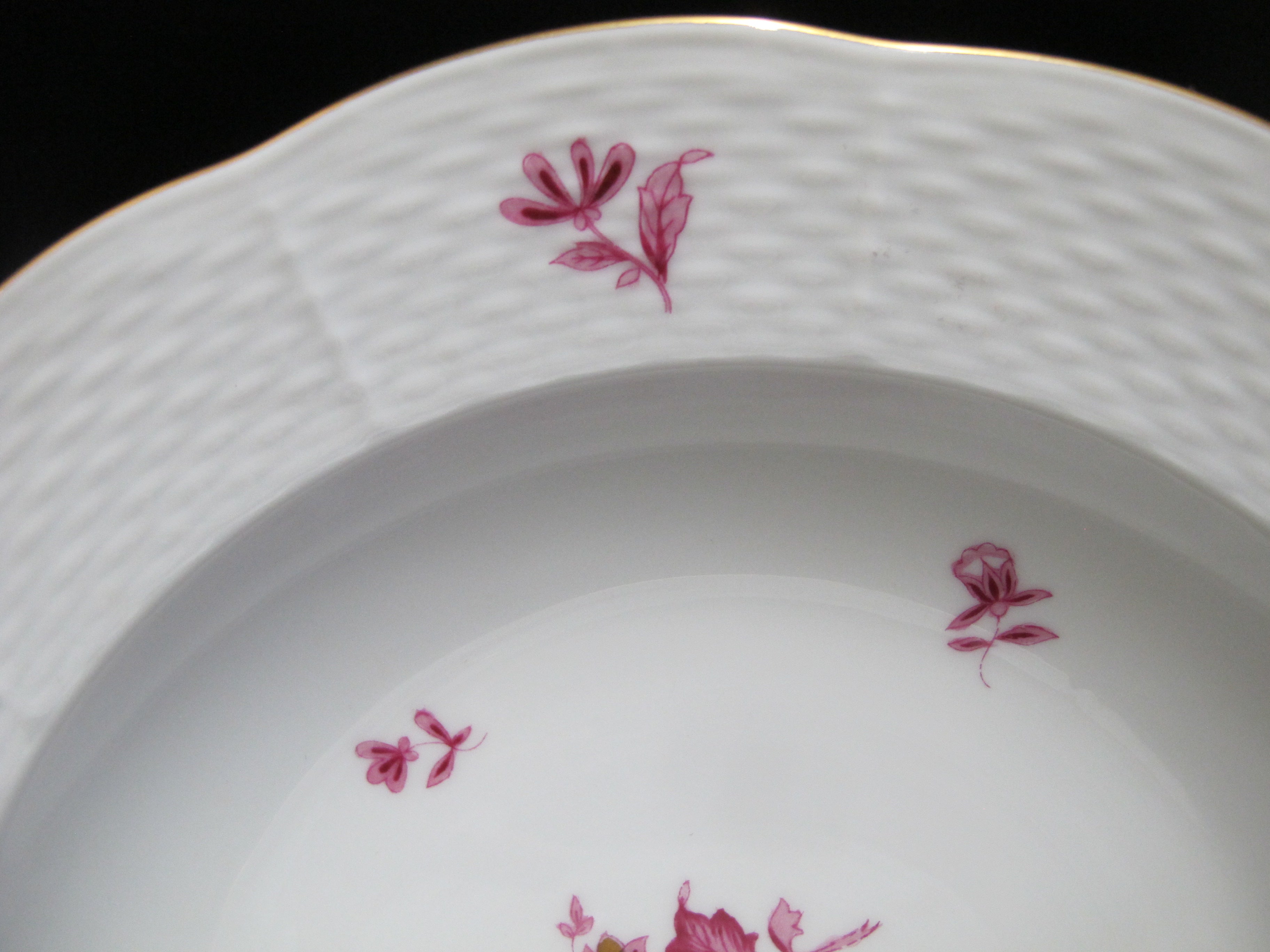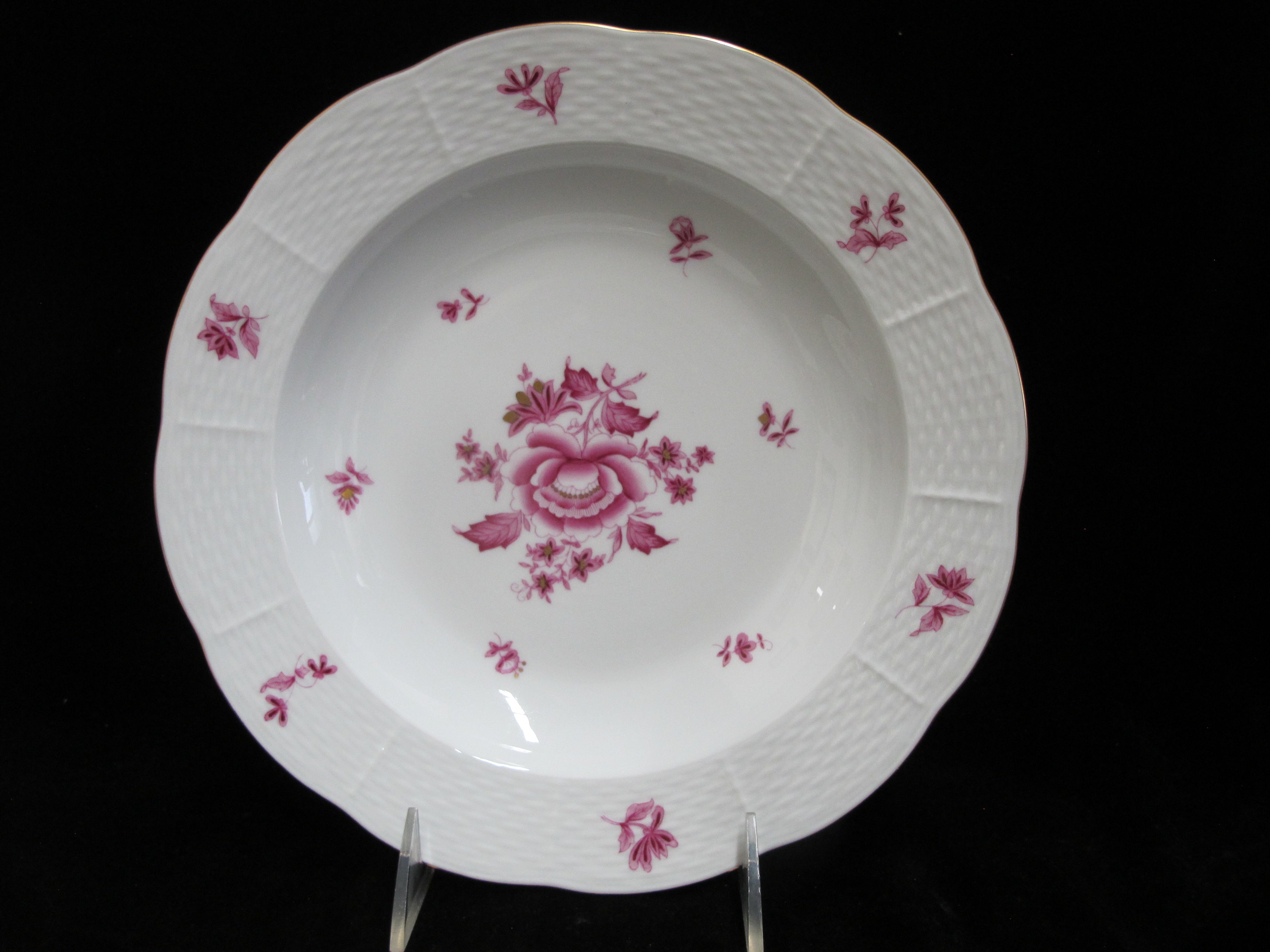 Herend Hungary porcelain rimmed soup bowl set of 4 in pink raspberry Nanking or NBP pattern. Hand painted pink flowers with gold accents. Large rim, shallow bowl. Each measures approximately 9 1/2" x 1 1/2" tall. All are in excellent condition, no chips, cracks, or repairs.