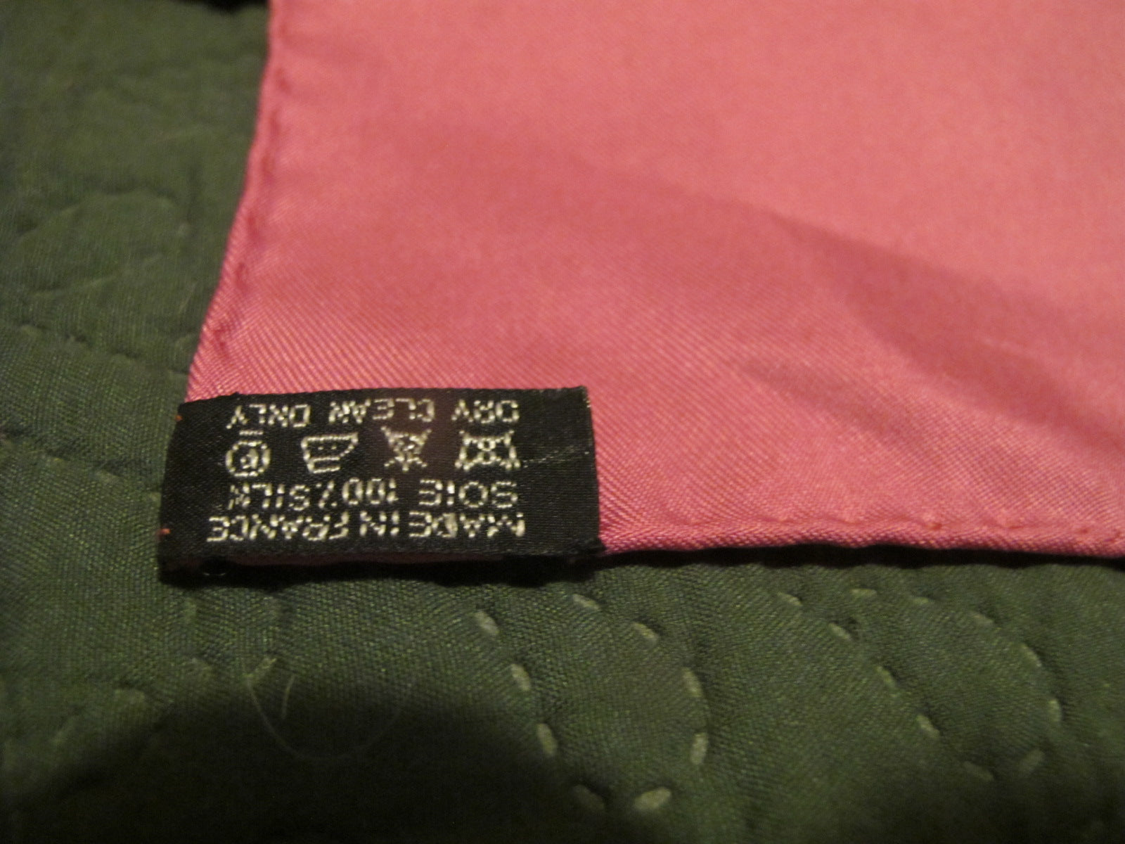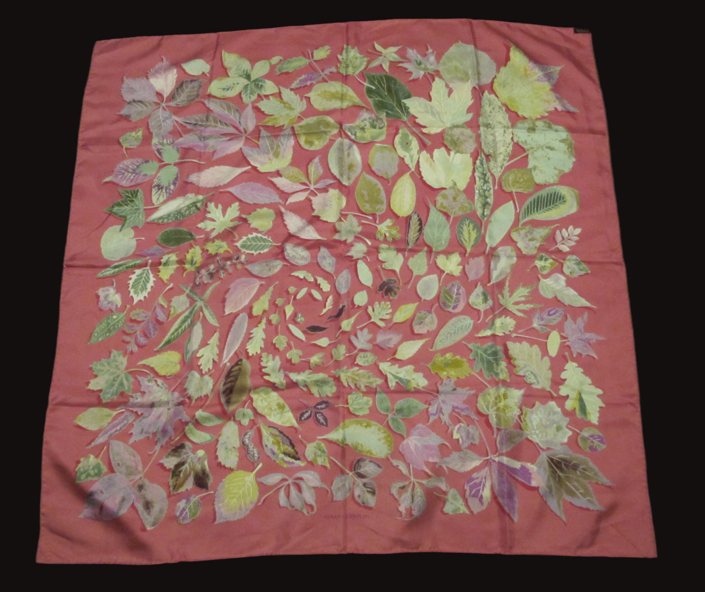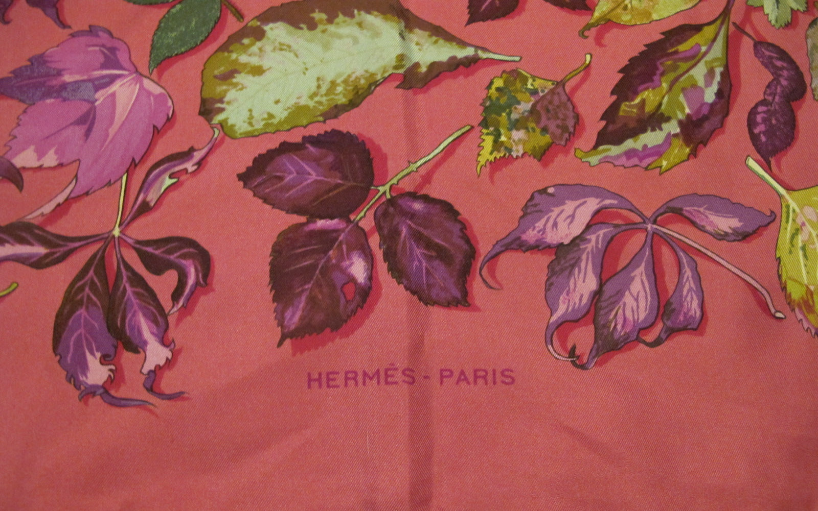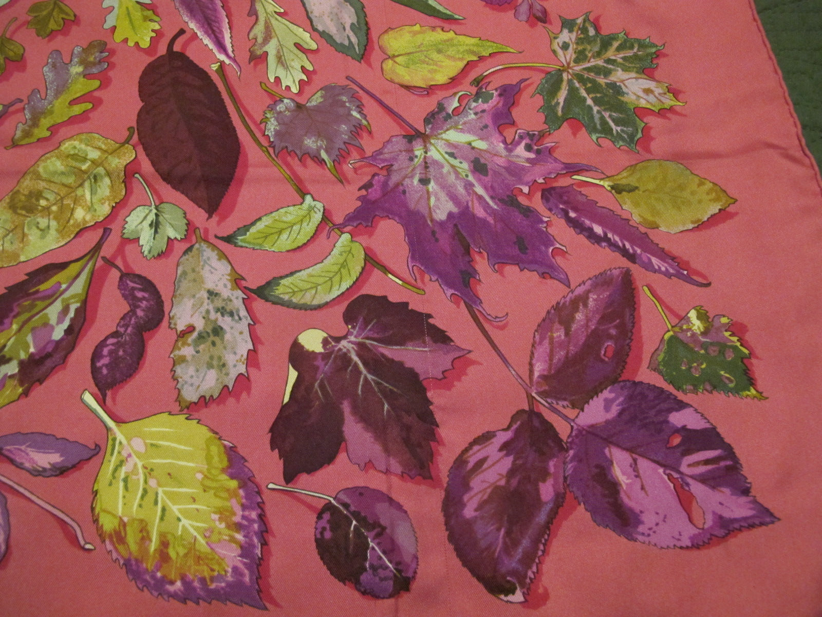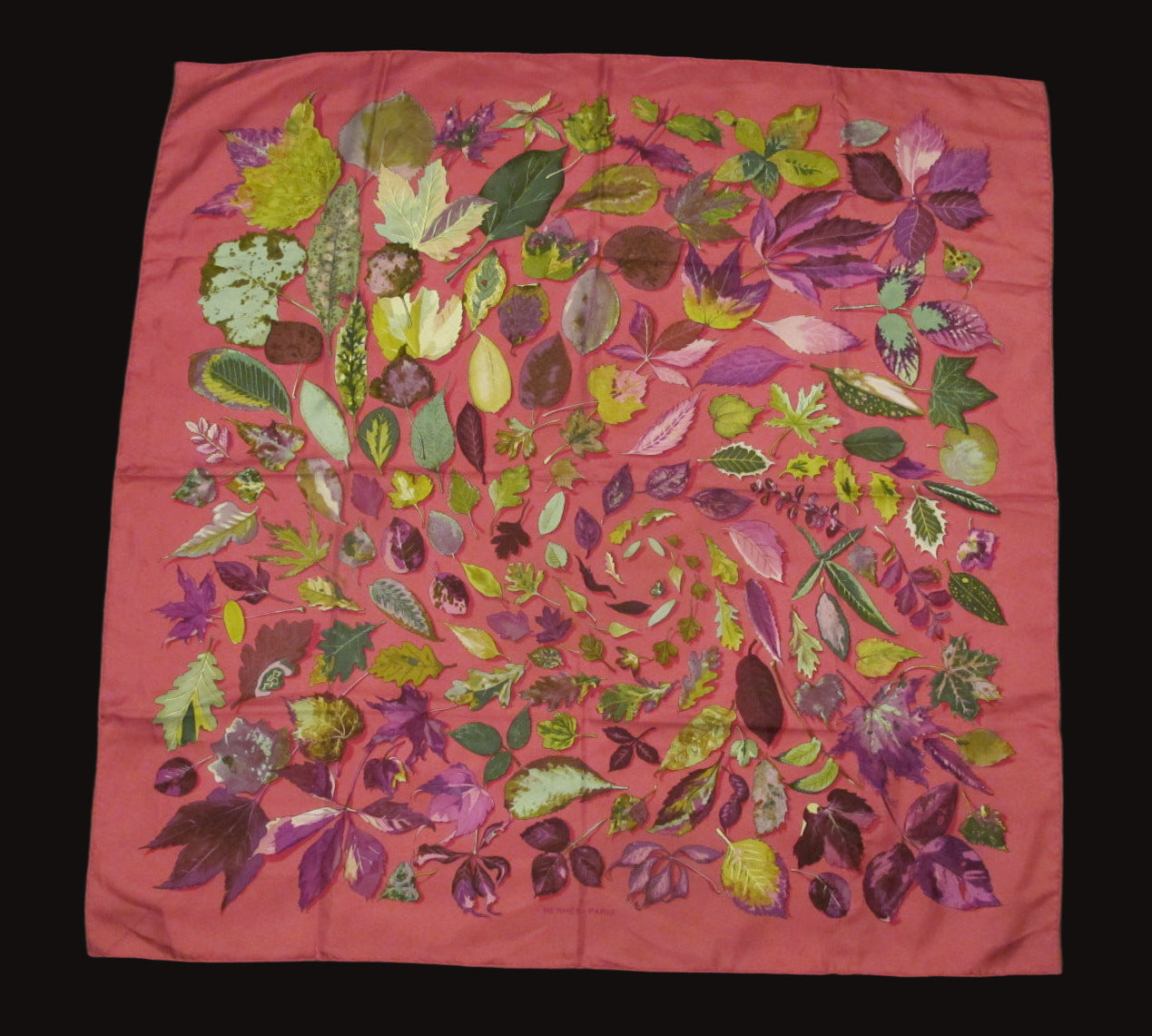 Vintage Hermes France Carre 90 graphic designer scarf, ''Tourbillons' or fallen leaves. Pink silk with multi-color leaves. Designed by Christiane Vauzelles in 1968. Carre 90, Measures approximately 35" x 35". Excellent preowned condition, creases from storage. Thin snag near one corner, as photographed in second to last photo. No other snags, stains, or holes.