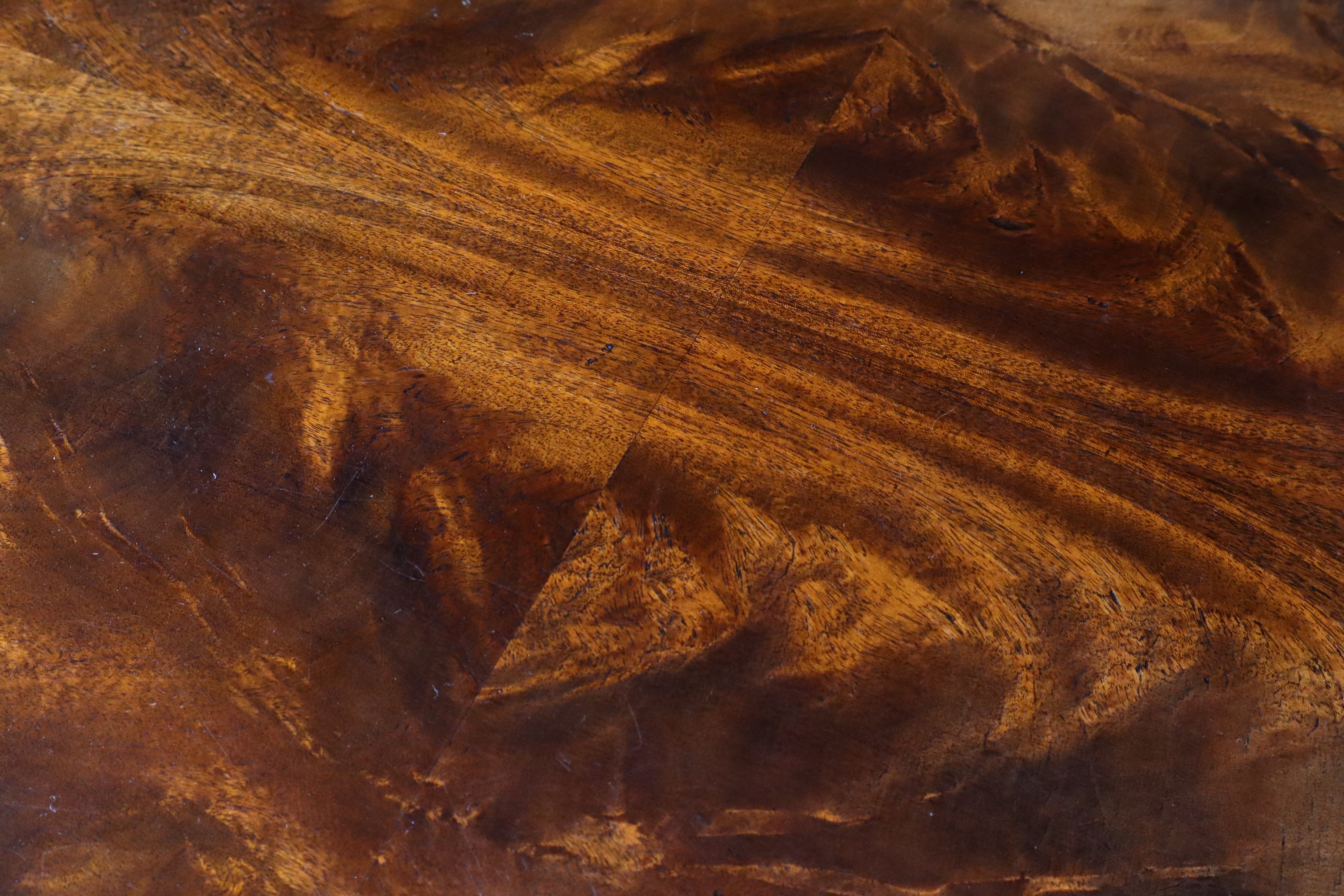 Gorgeous mahogany center table with gorgeous mirrored wood grain on the top surface. The legs of the table are a sturdy yet regal style that all connect at the bottom with one large flat claw foot base. Made for entry ways or window nooks.