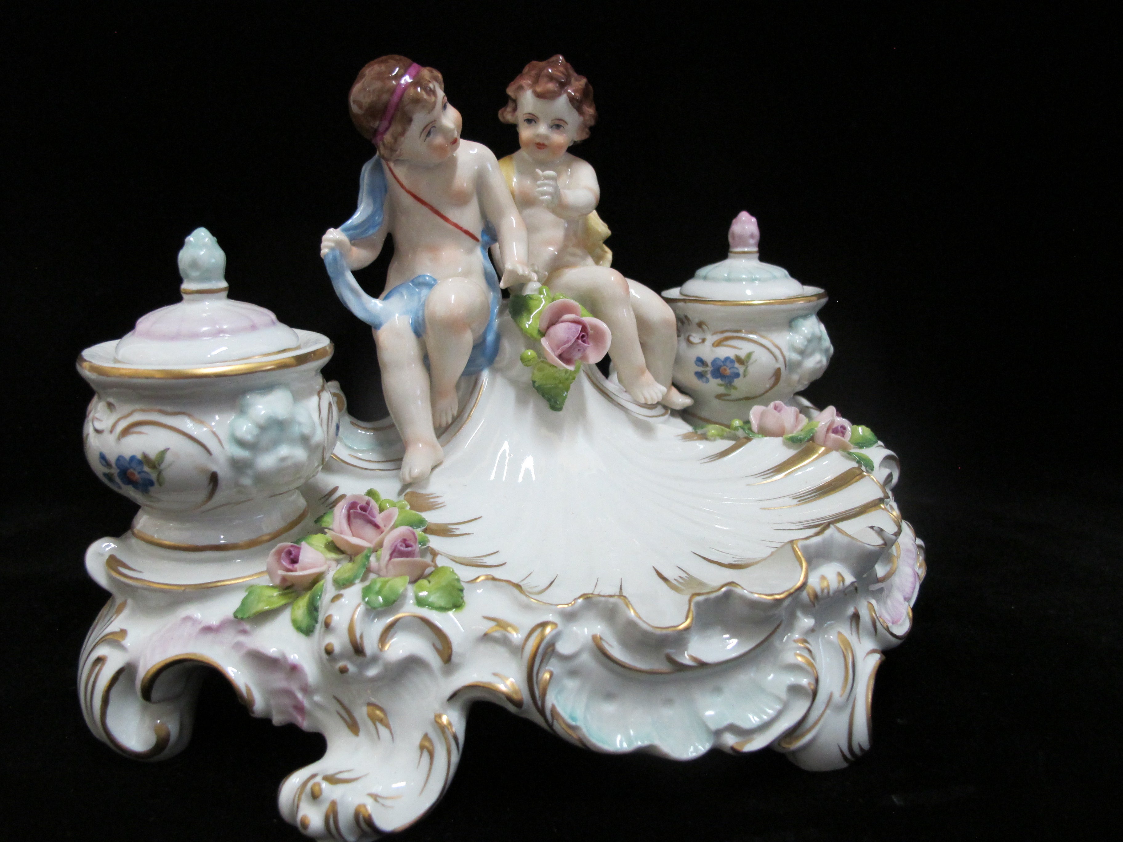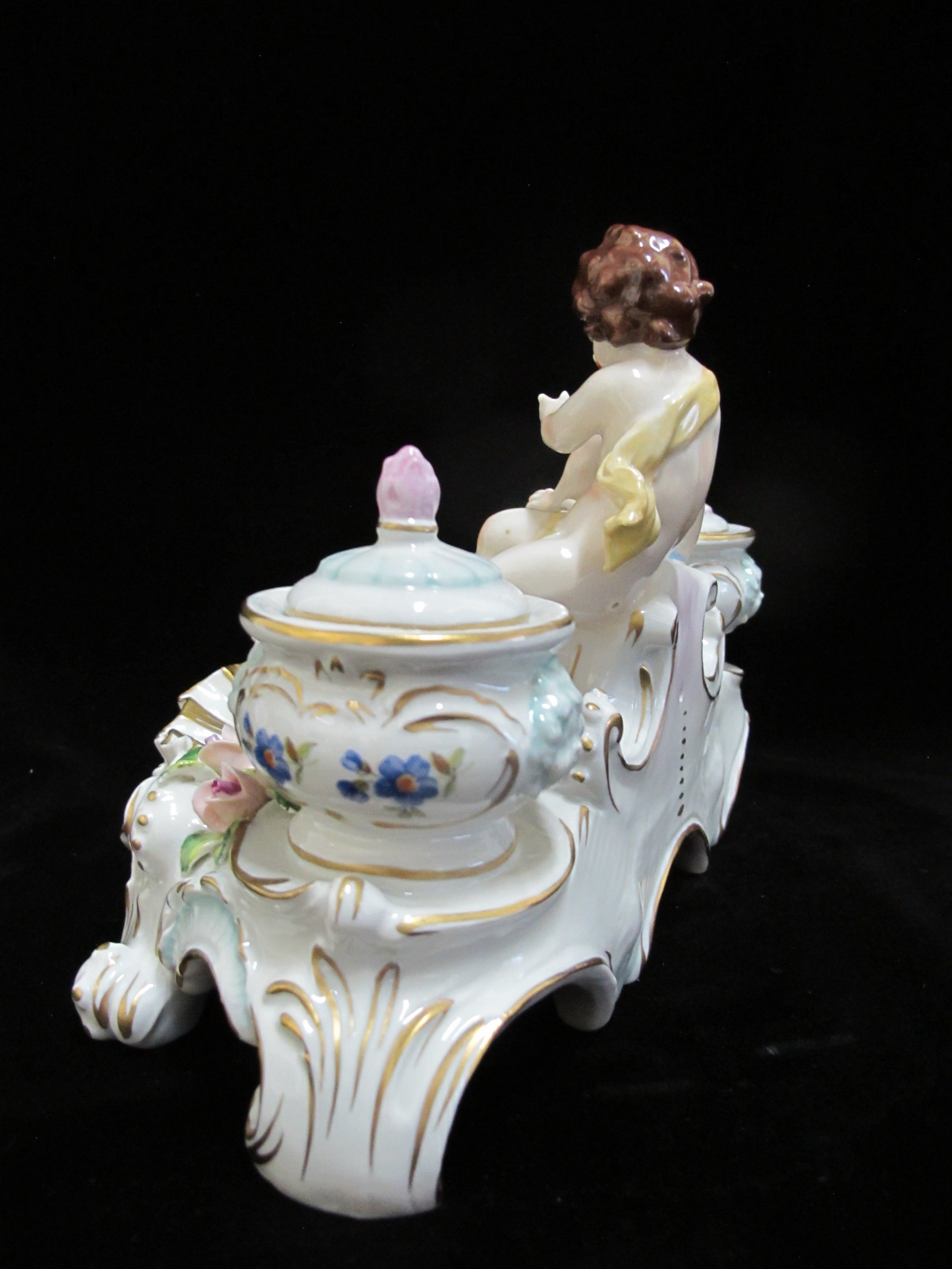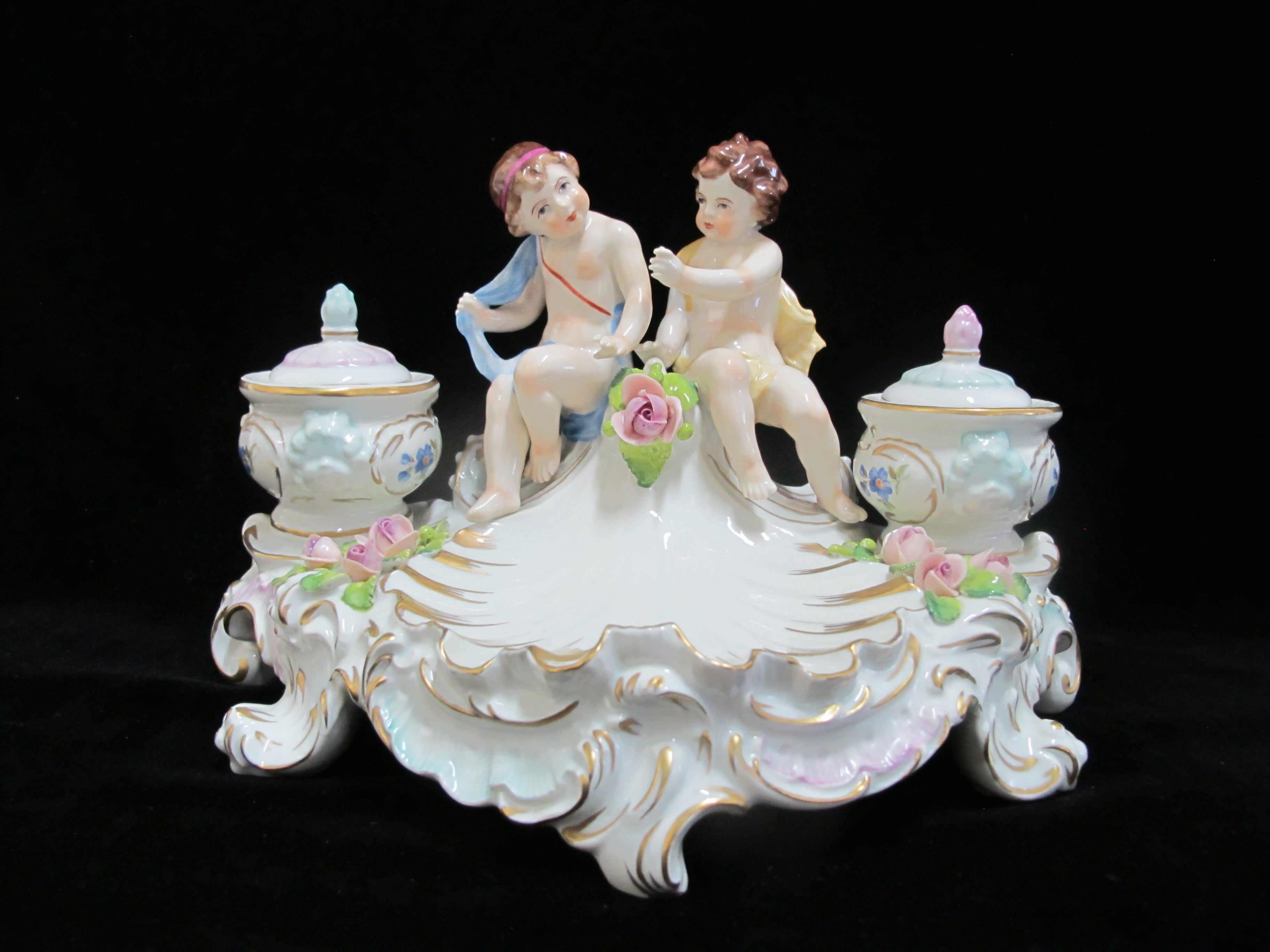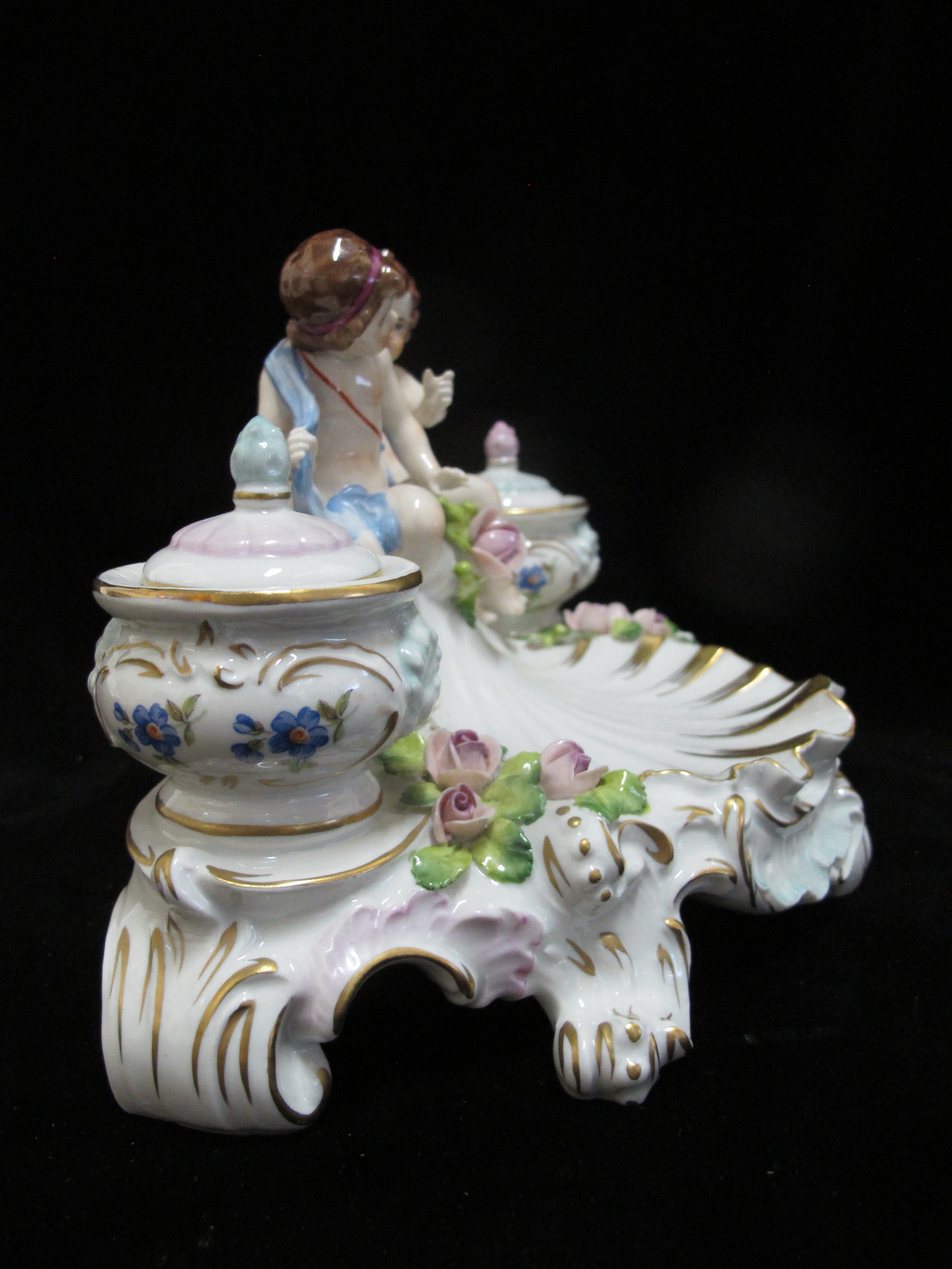Vintage Sitzendorf figural inkwell or inkstand with 2 removable inserts. This elaborately detailed piece is crafted from Sitzendorf porcelain, known for its delicate and high-quality craftsmanship, particularly evident in this figurine.
