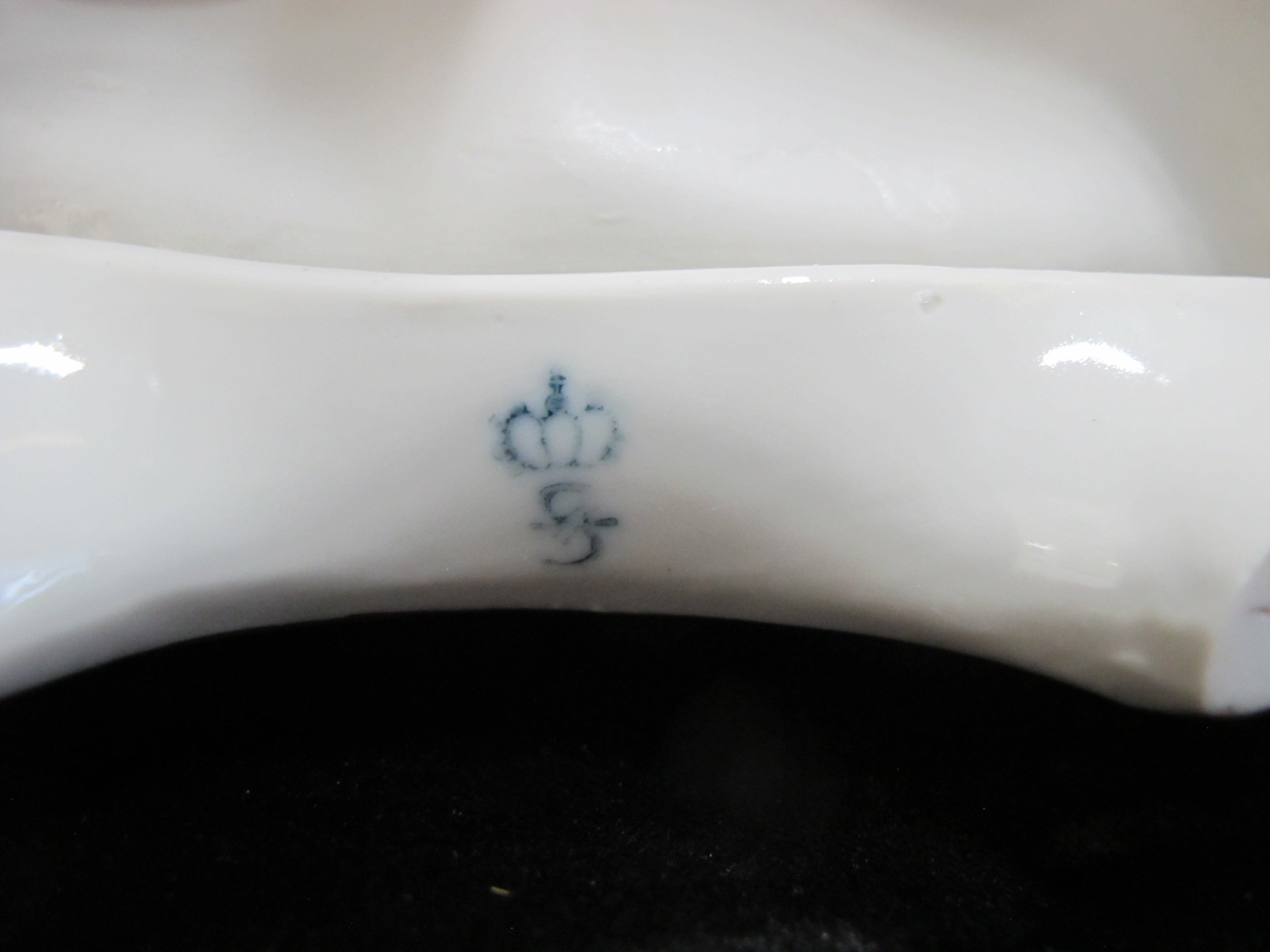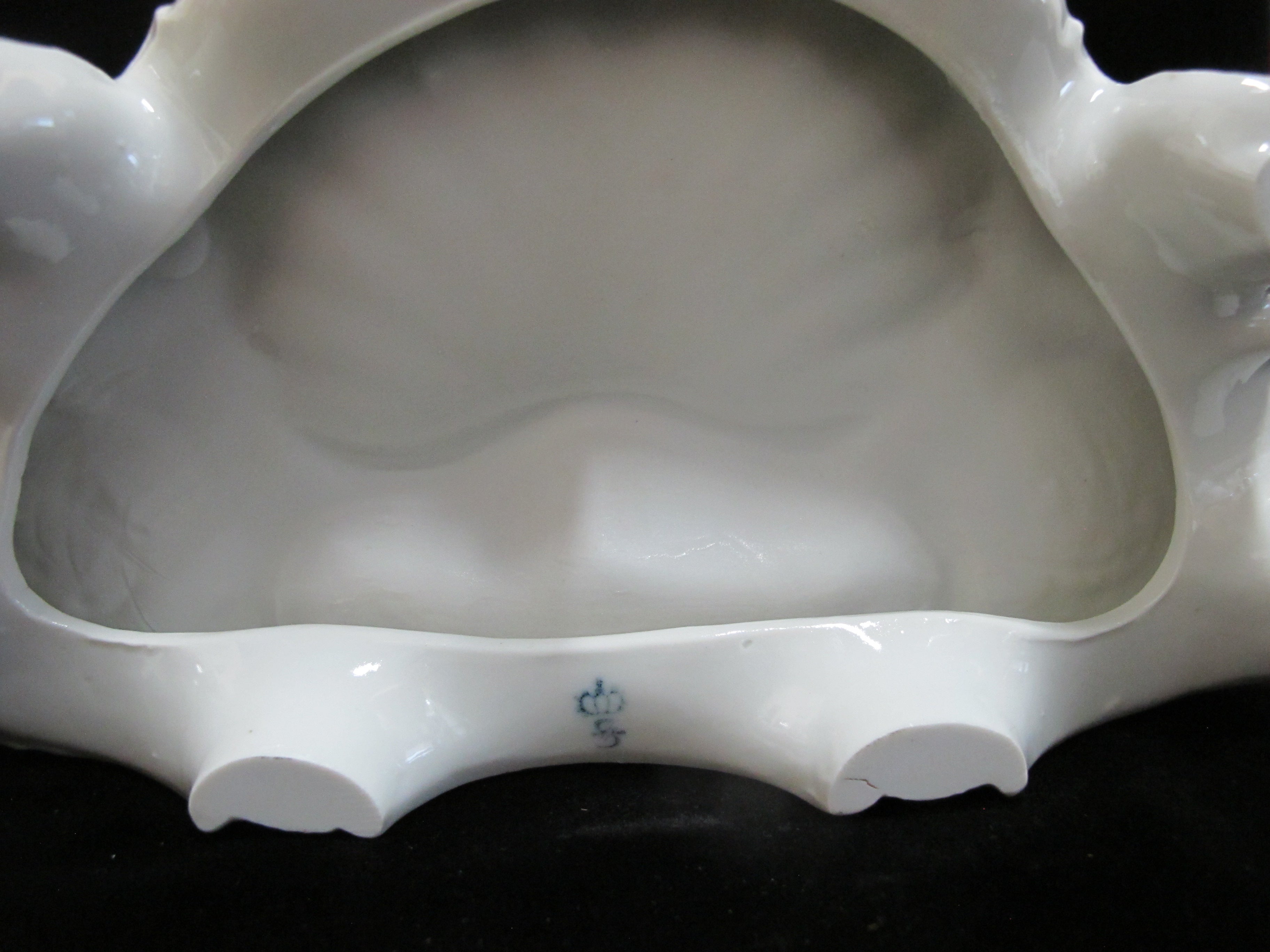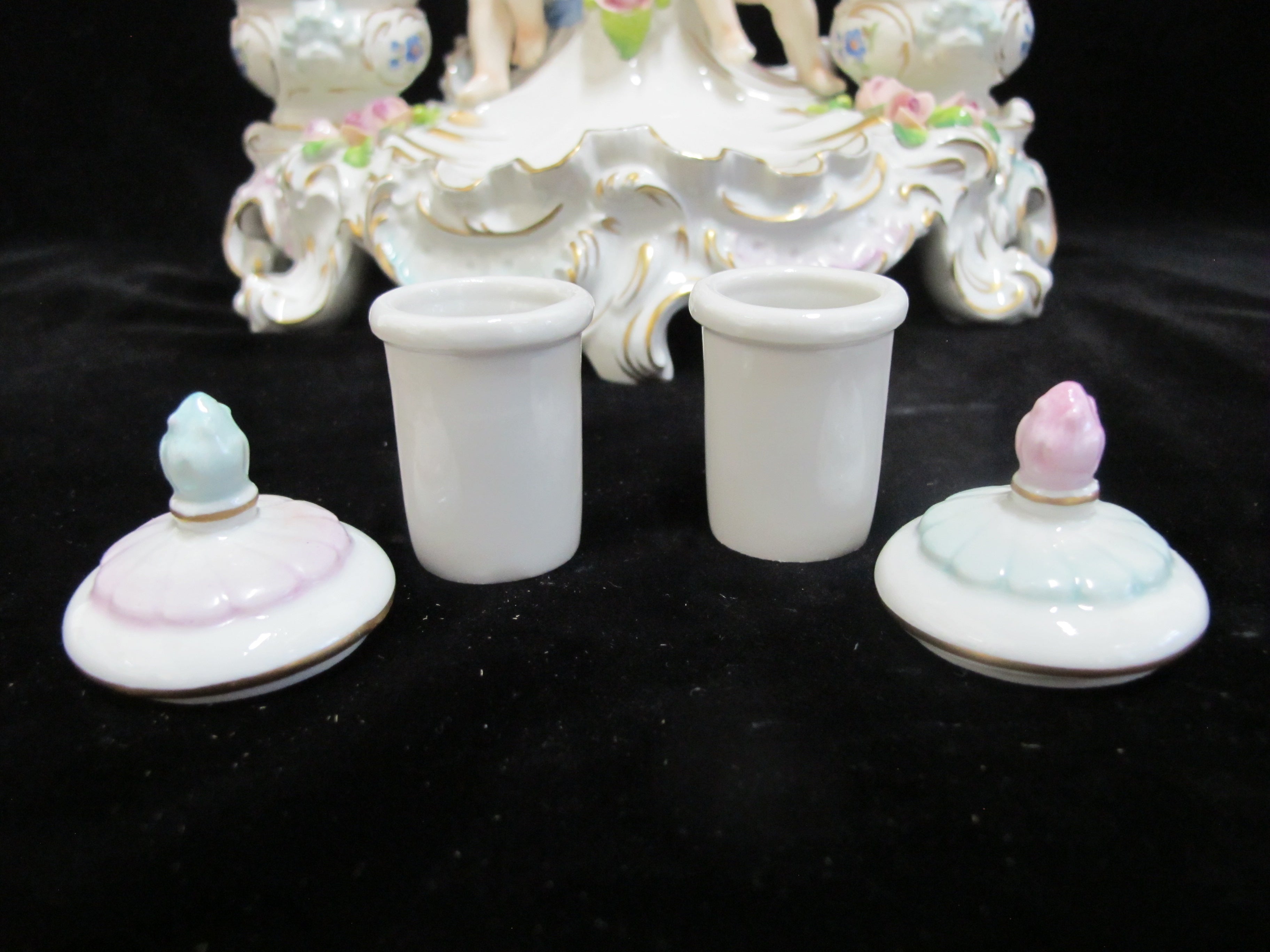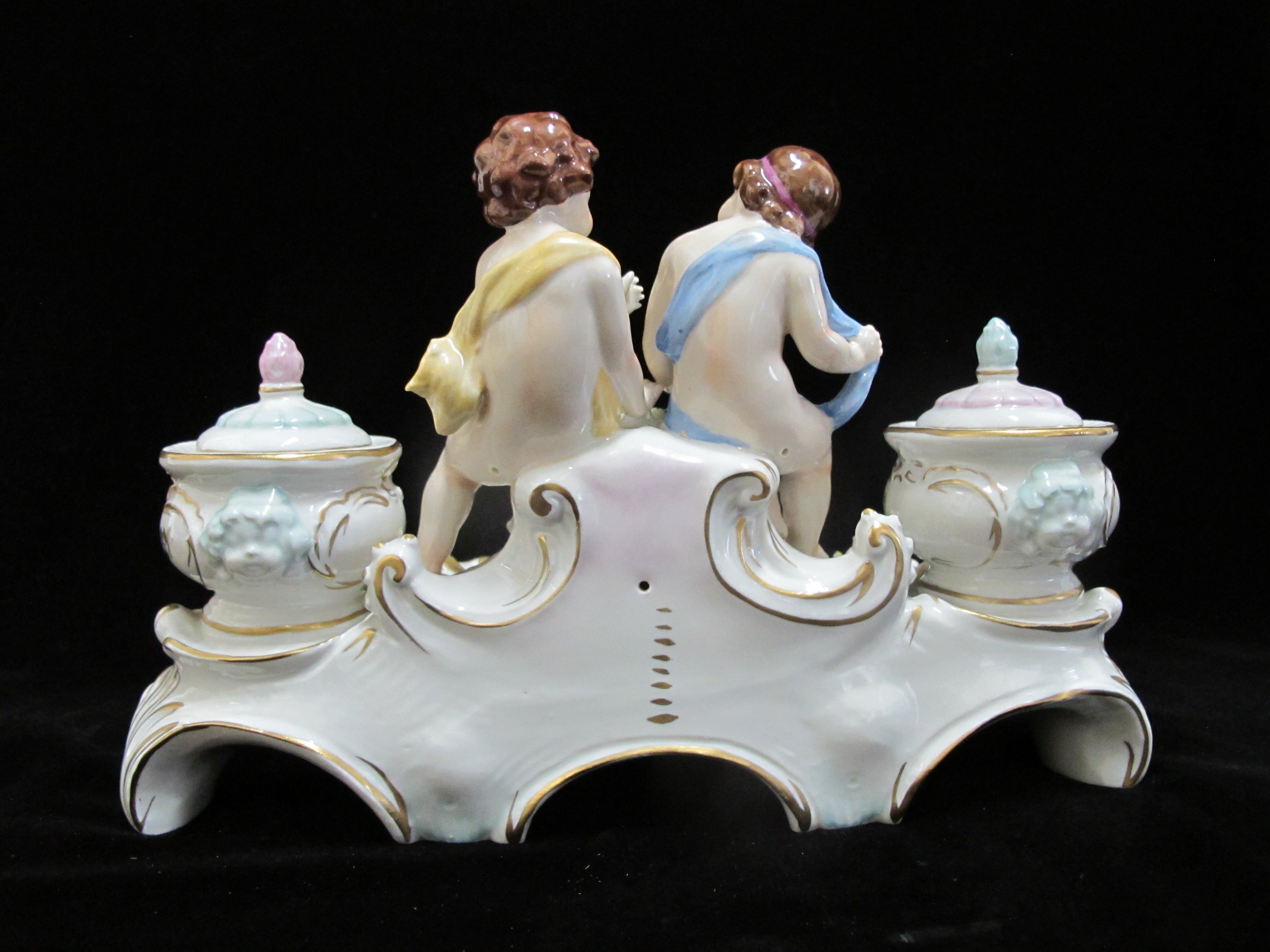 Vintage Sitzendorf figural inkwell or inkstand with 2 removable inserts. This elaborately detailed piece is crafted from Sitzendorf porcelain, known for its delicate and high-quality craftsmanship, particularly evident in this figurine.