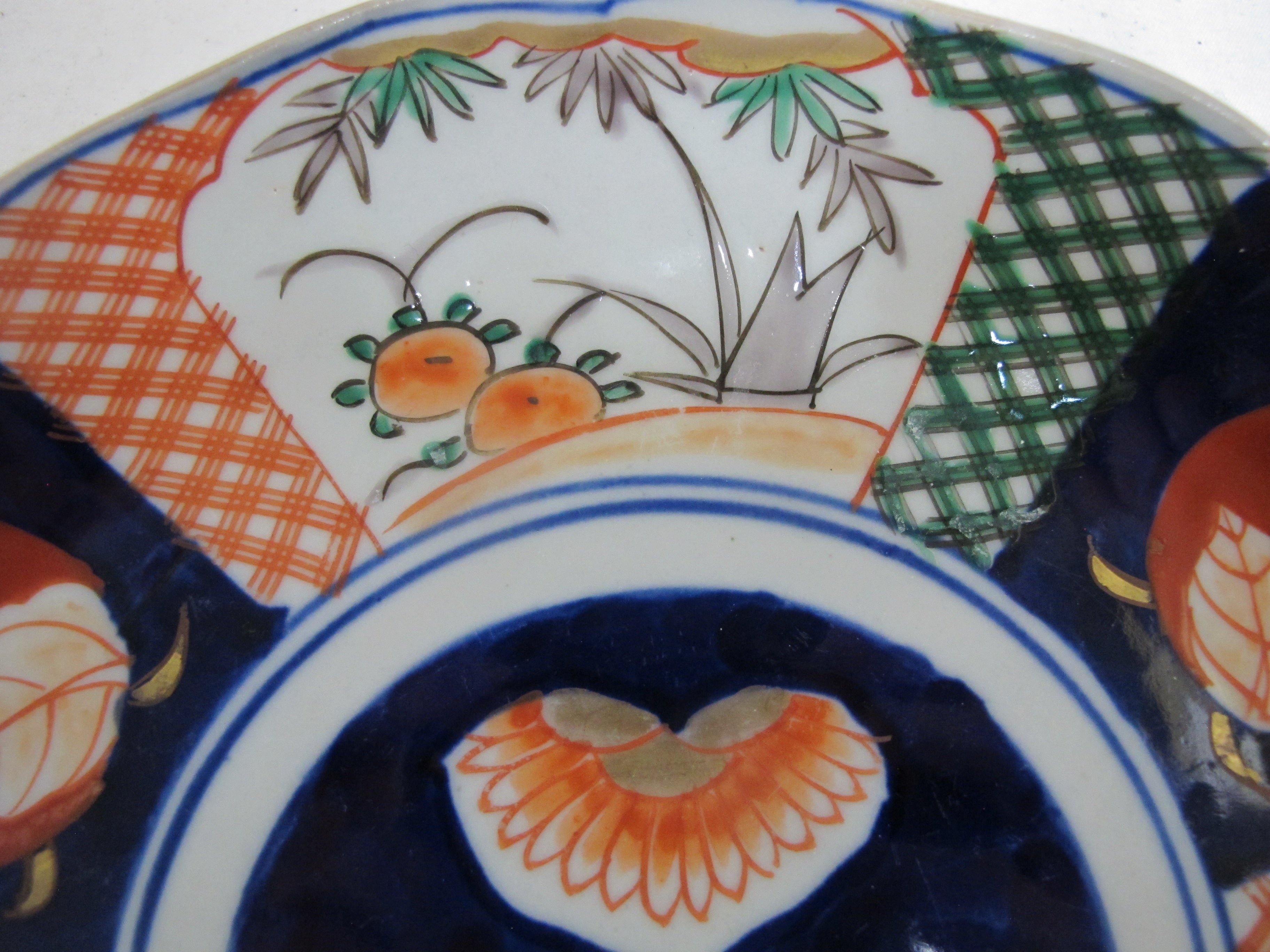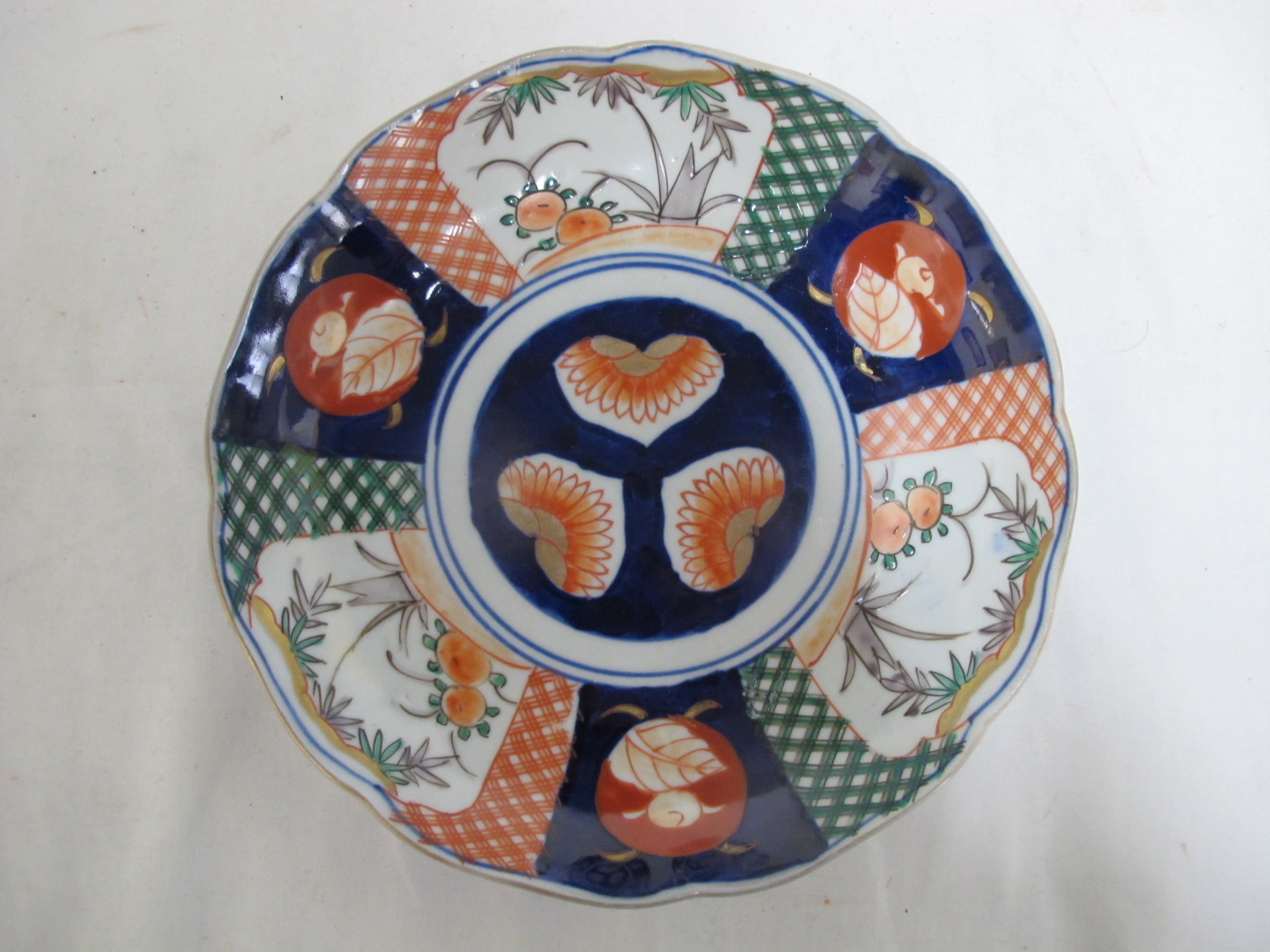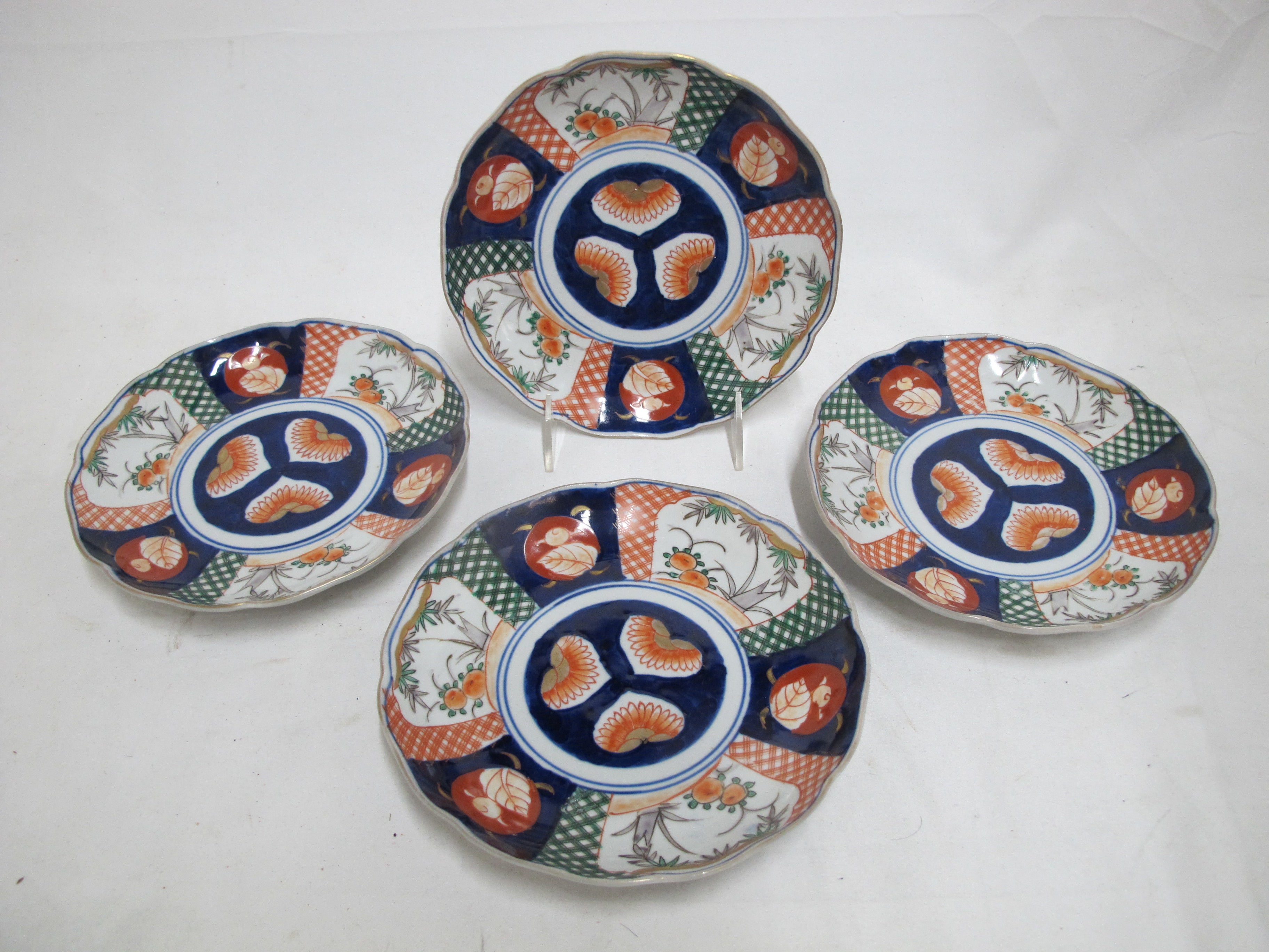 Lovely et of 4 Japanese Porcelain Imari plates. Bold tones of red, green, and blue with gold gilt accents showing a design of fruit and foiliage.