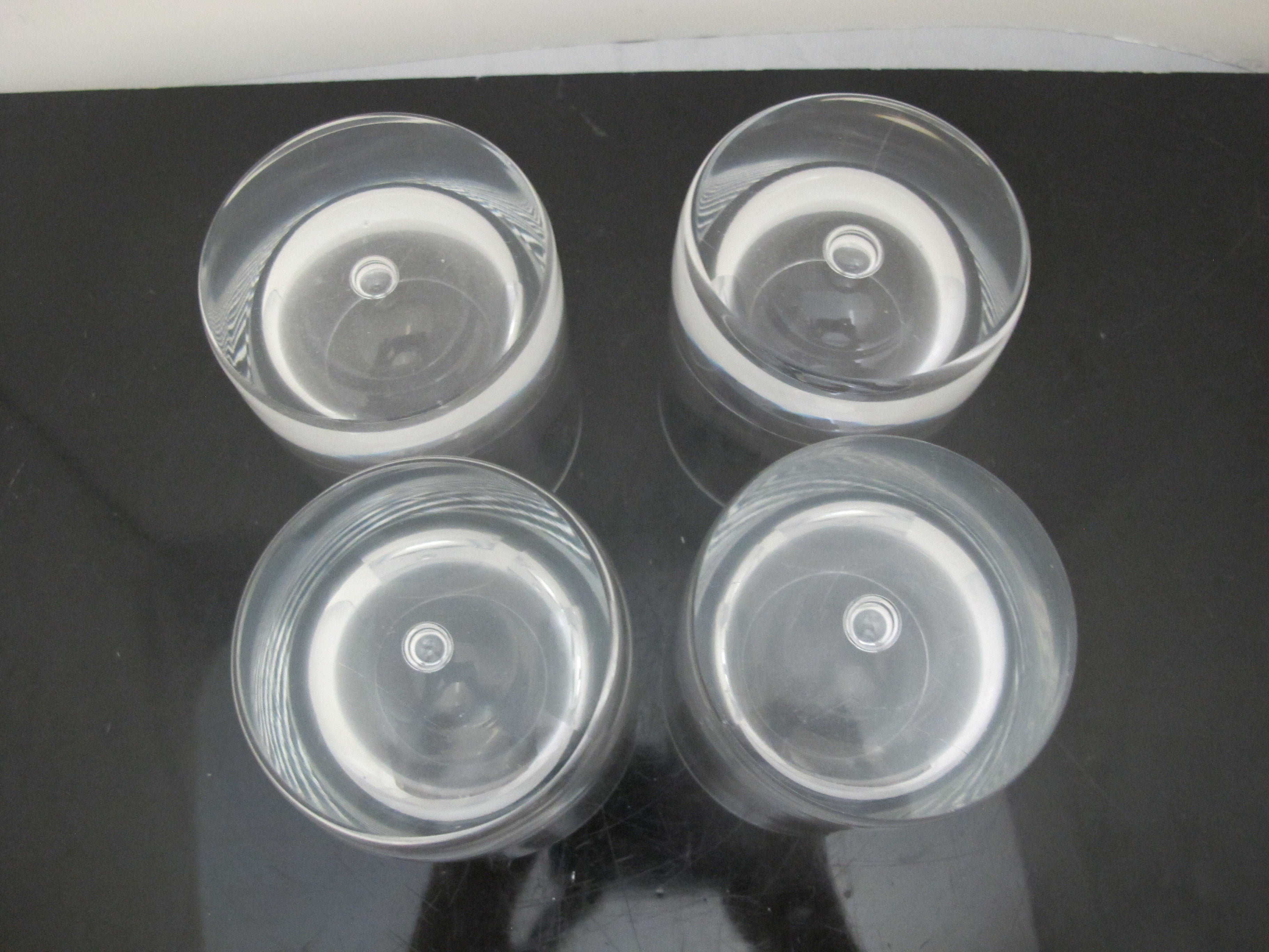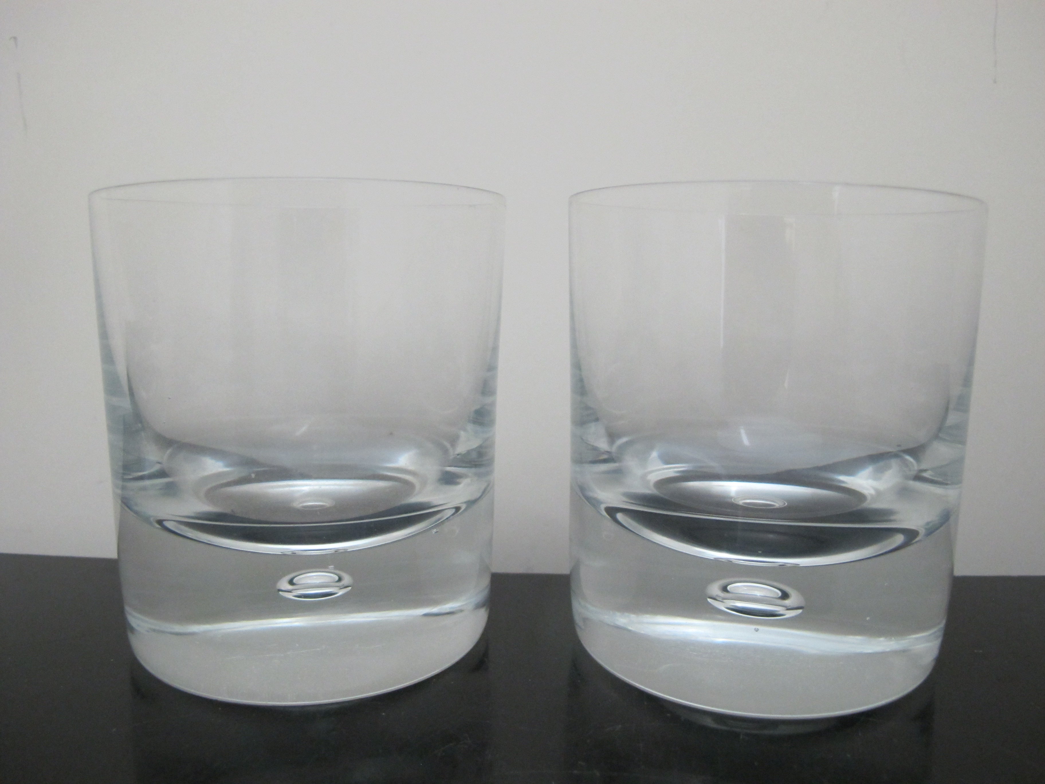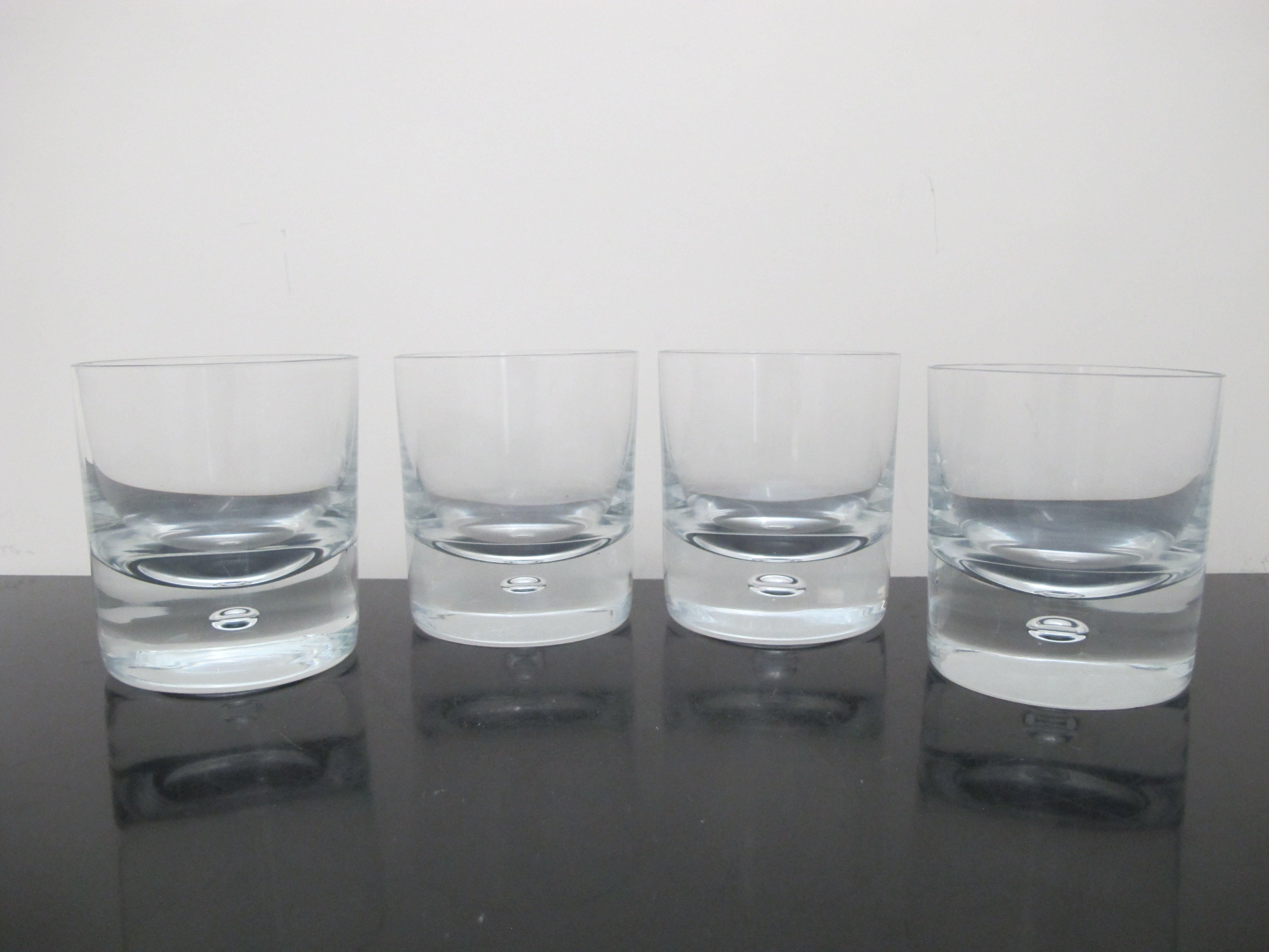 Sleek Kosta Boda, mid century modern style 'Pippi' old fashioned glass set of 4. Clear glass with single suspended air bubble. Each measures 3 5/8" tall x 3 1/8". All are in excellent condition, no chips, cracks, or repairs.