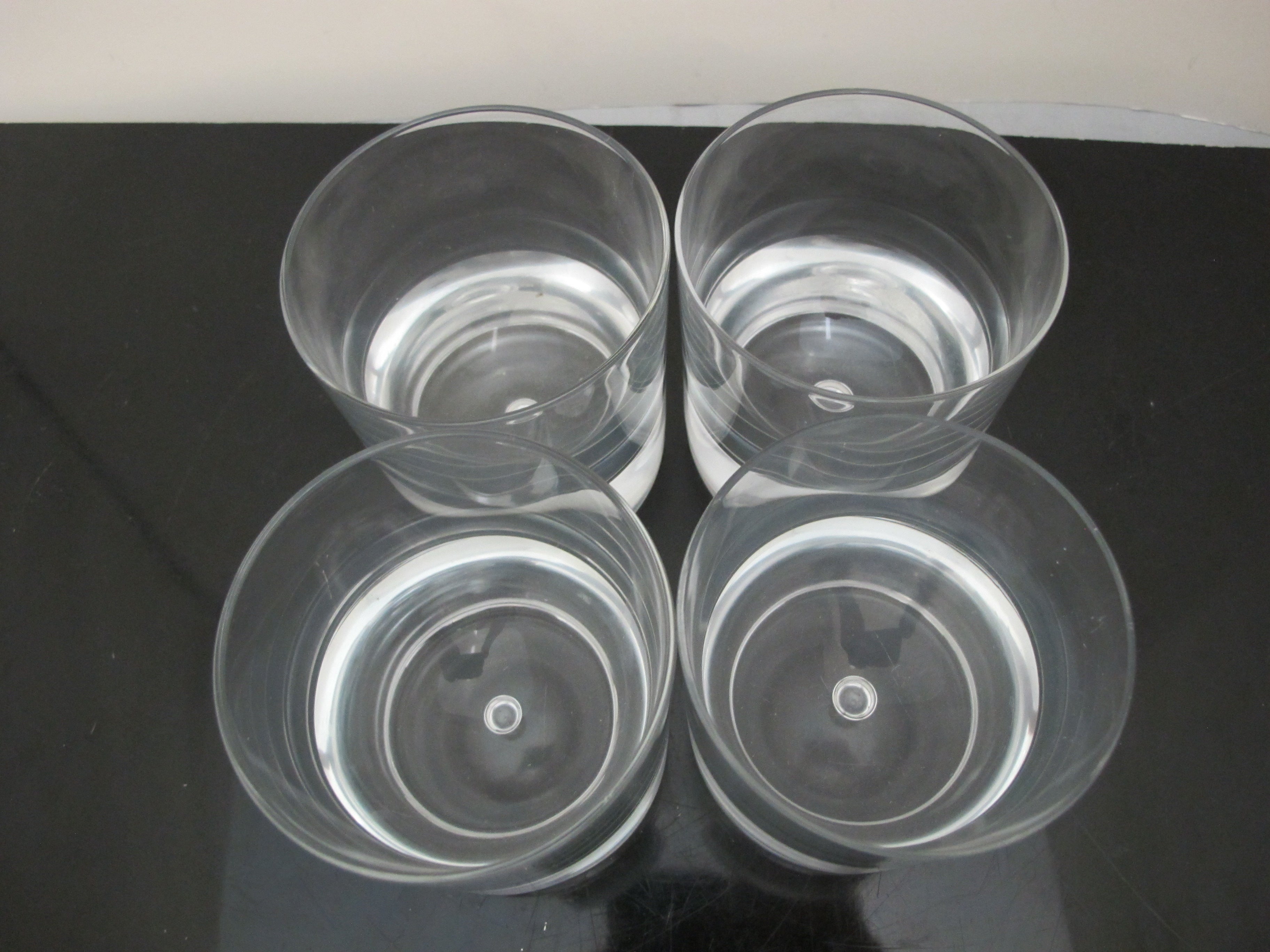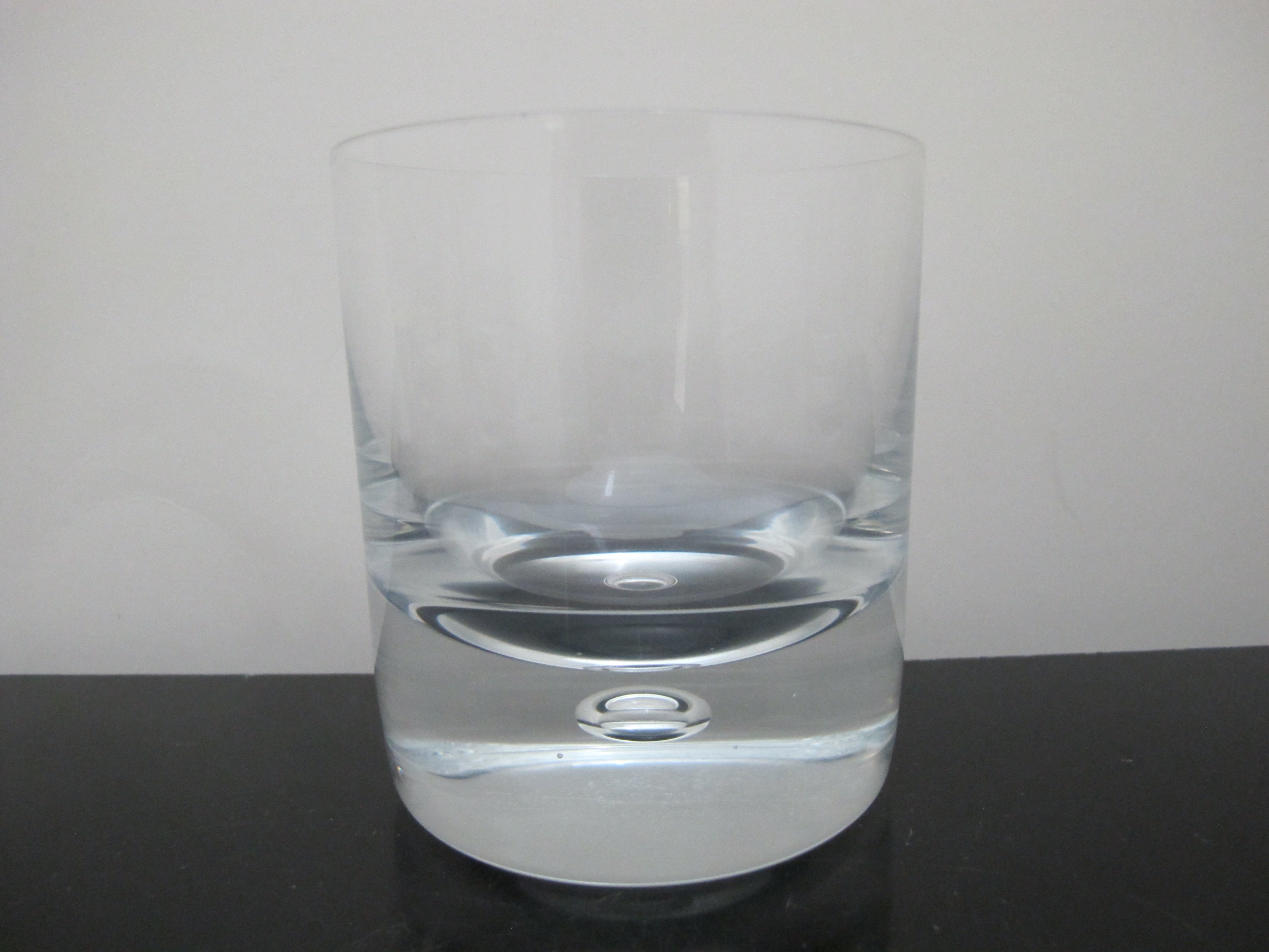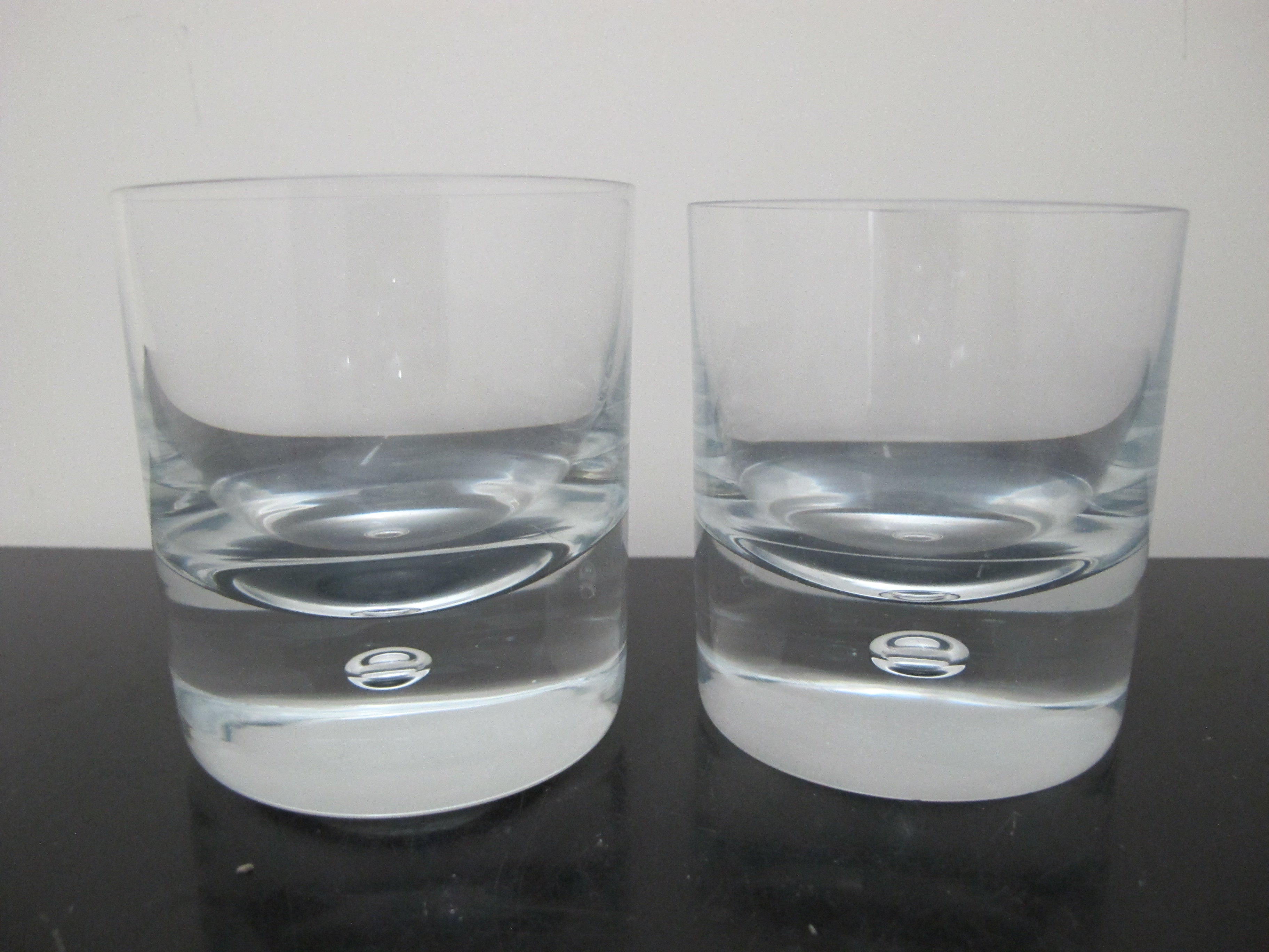 Sleek Kosta Boda, mid century modern style 'Pippi' old fashioned glass set of 4. Clear glass with single suspended air bubble. Each measures 3 5/8" tall x 3 1/8". All are in excellent condition, no chips, cracks, or repairs.