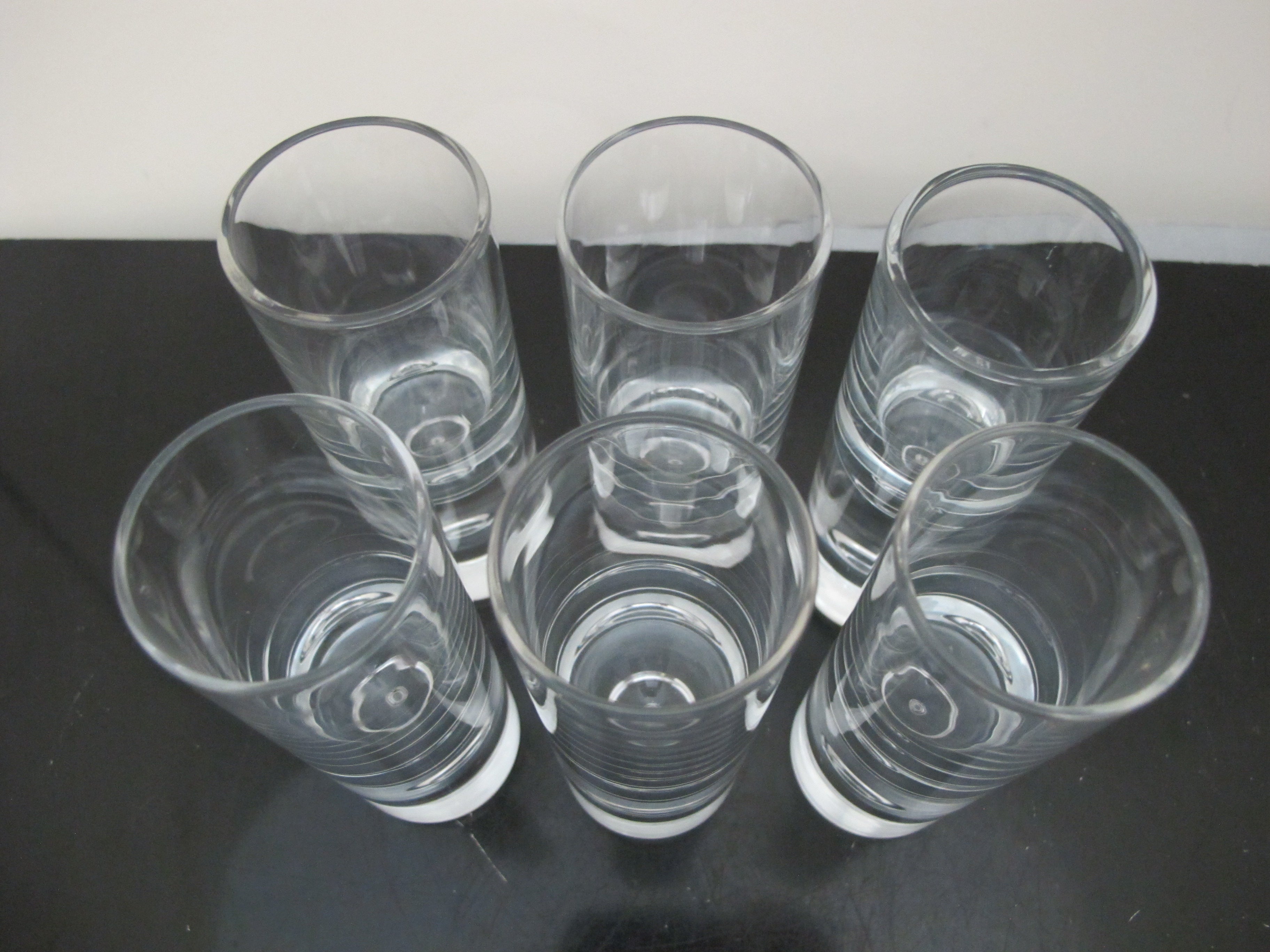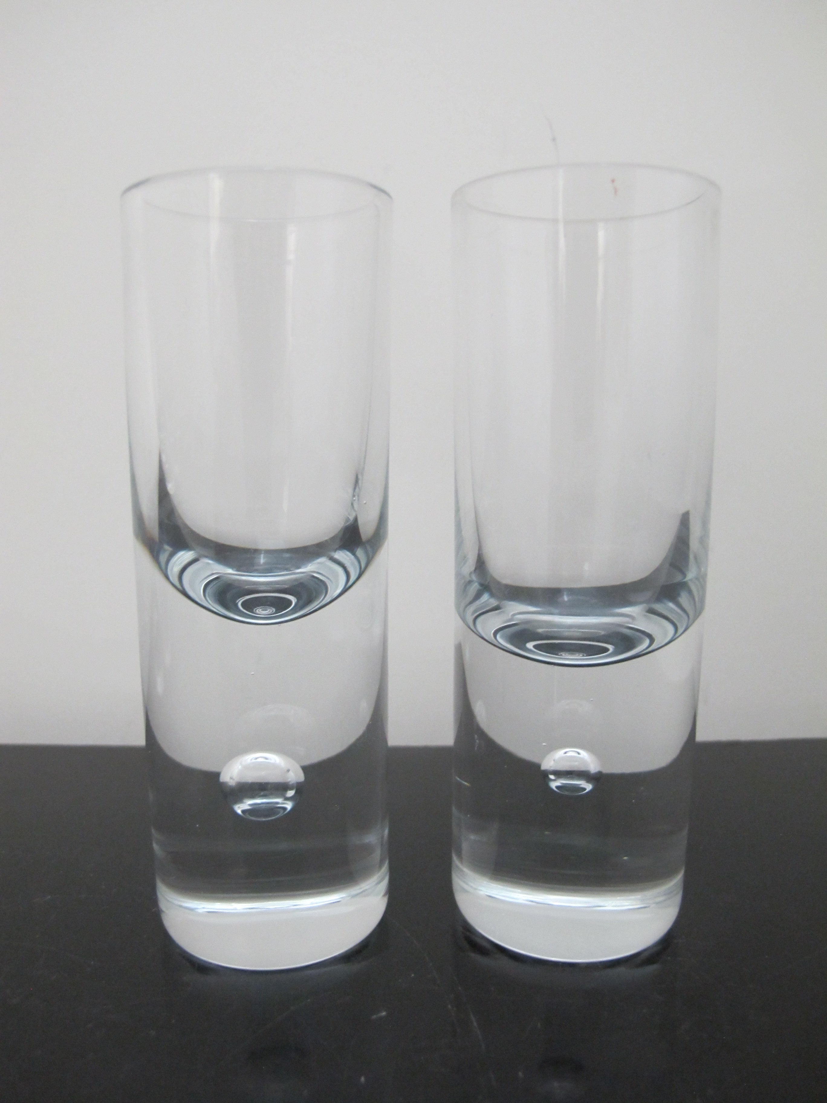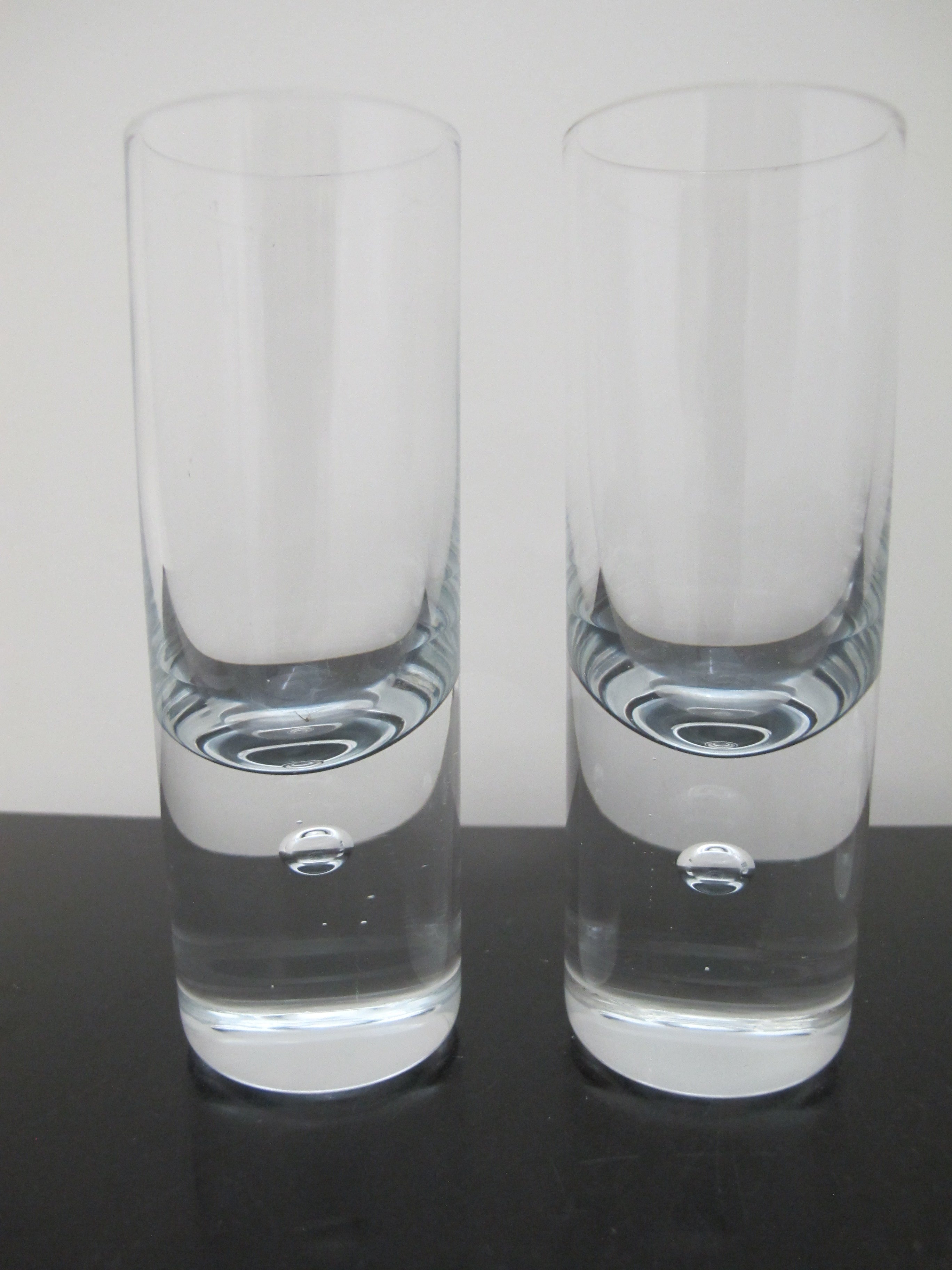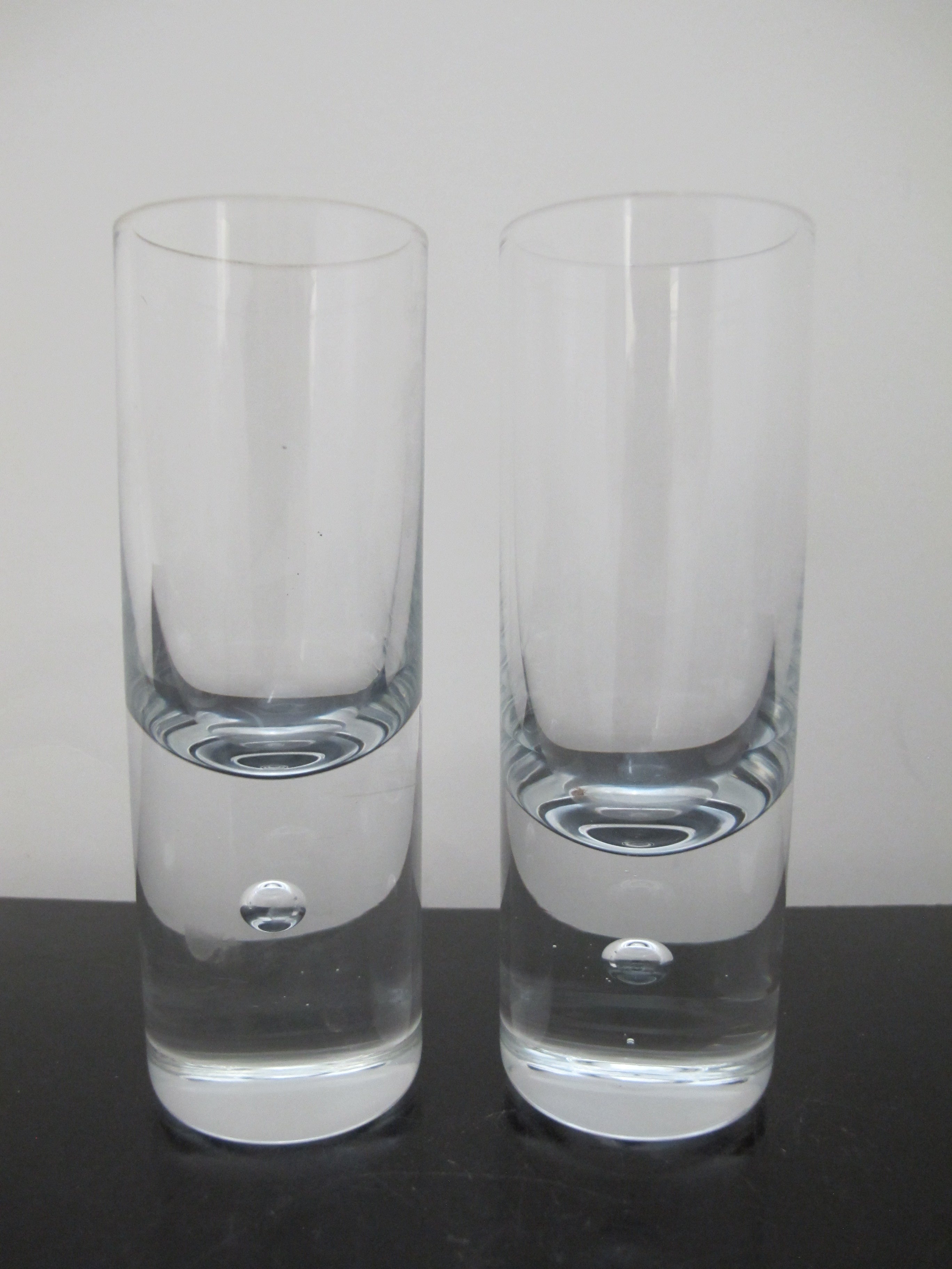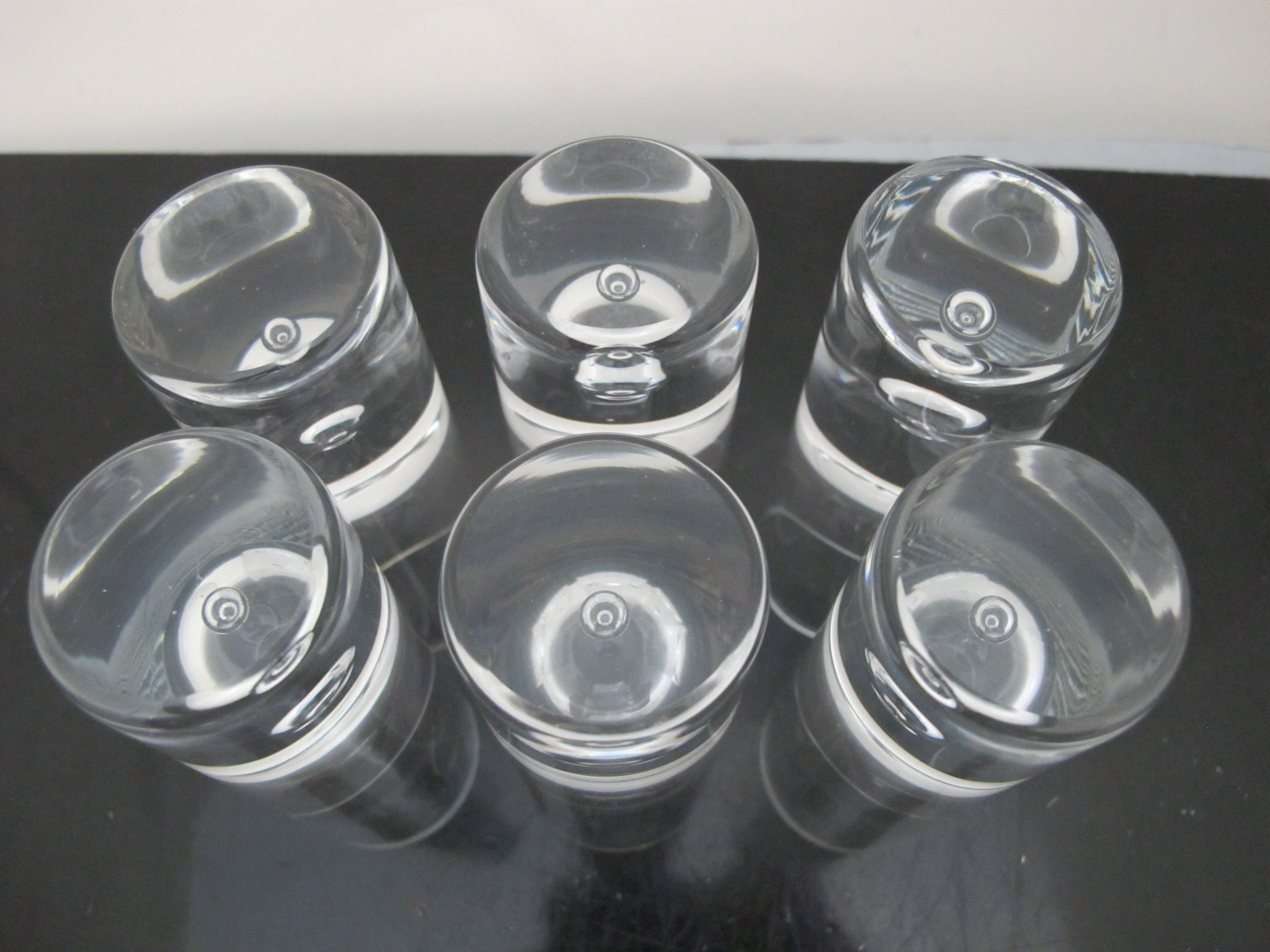 Sleek Kosta Boda, mid century modern style 'Pippi' sherry glass set of 6. Clear glass with single suspended air bubble. Each measures 4 3/4" tall x 1 1/2". All are in excellent condition, no chips, cracks, or repairs.