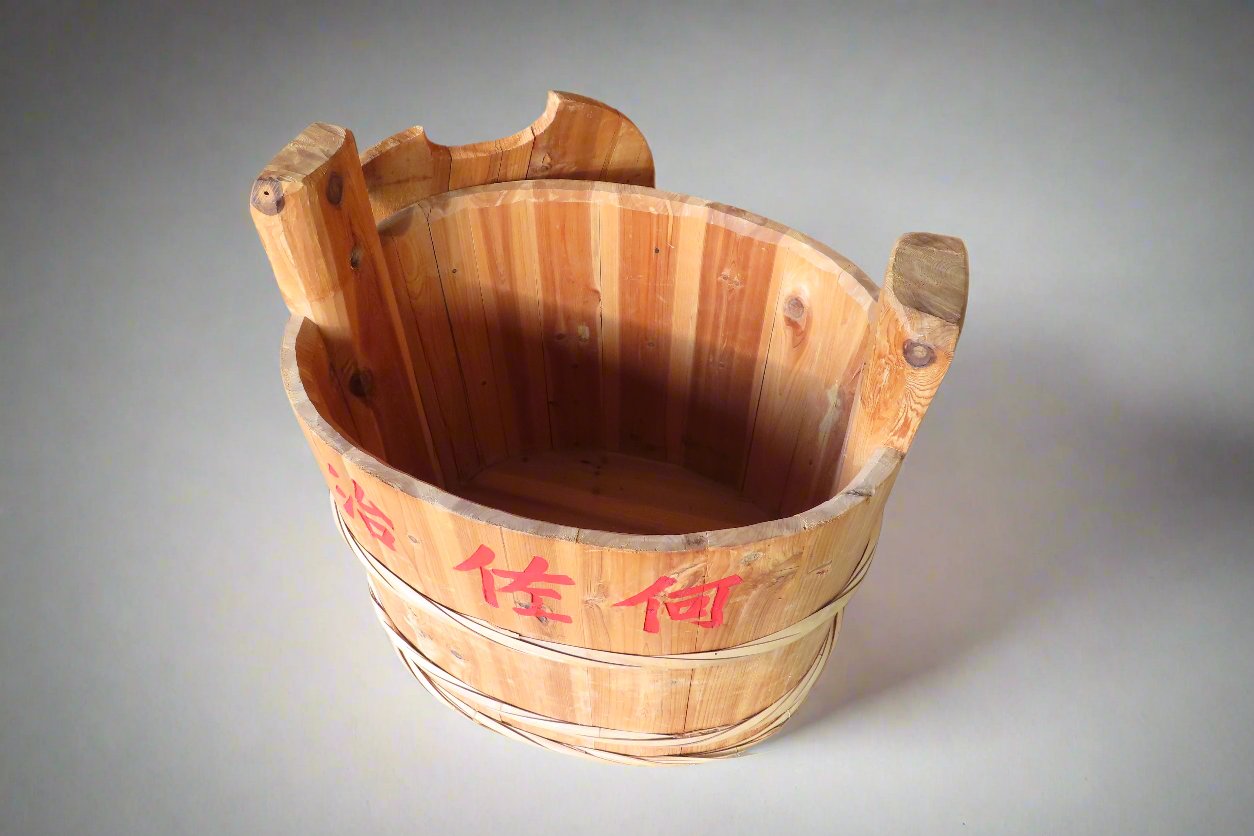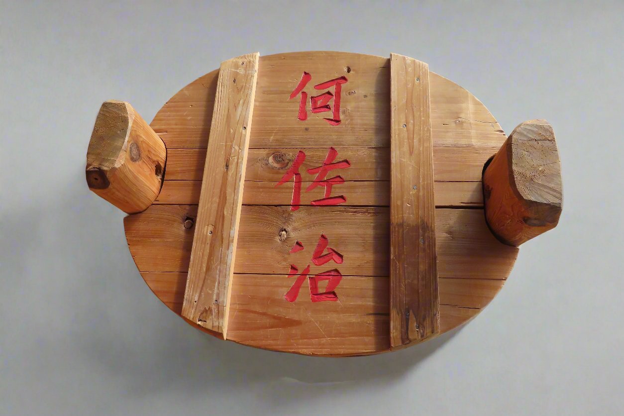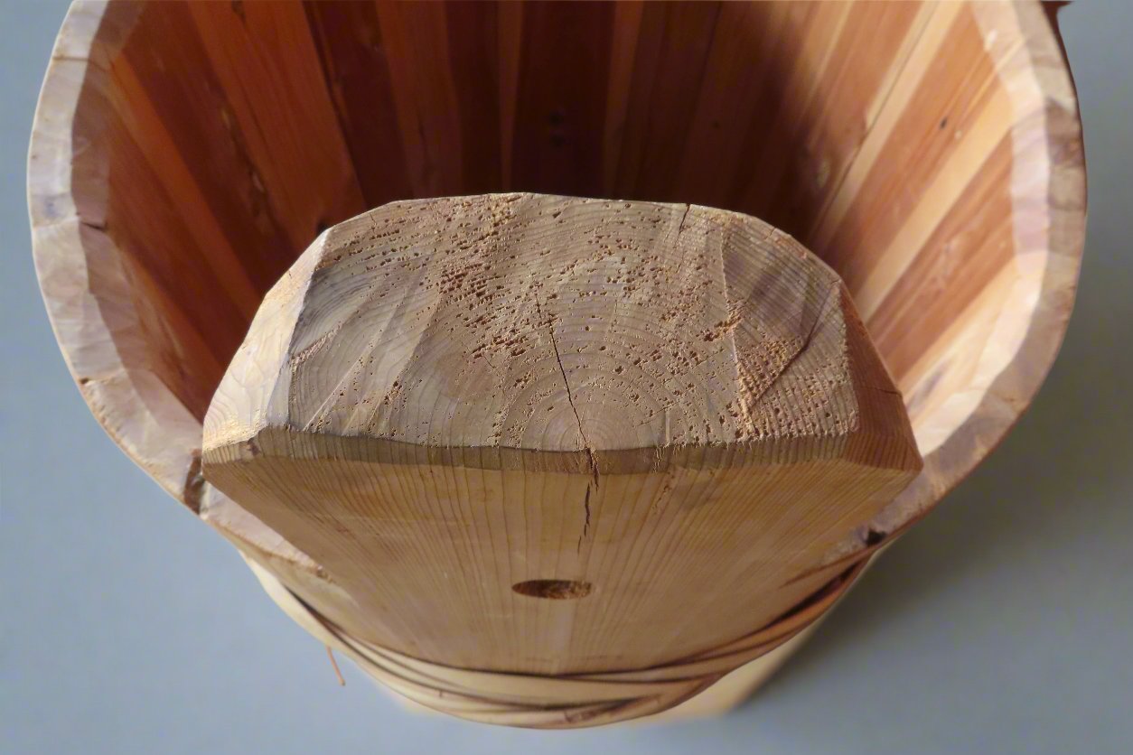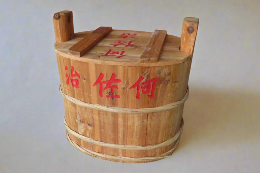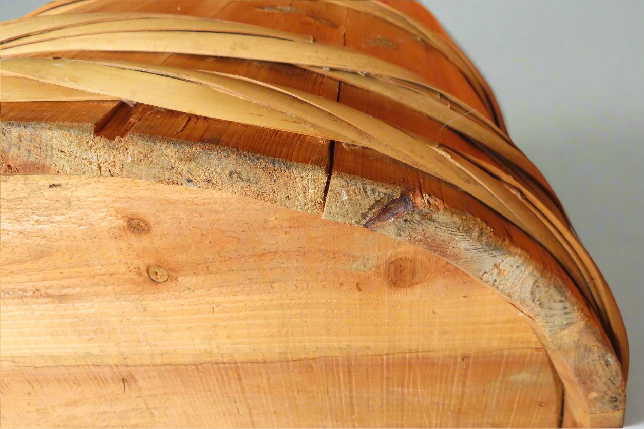 Large Japanese cedar Tarozake barrel originally used for the infusion of cedar flavor into either sake or rice whiskey. Tarozake is a type of sake famous for its cedar flavor infused from barrels made from Japanese cedar (Yoshino Sugi). It is highly coveted as a luxury item, few companies today still make their sake/whiskey the traditional way of using a cedar barrel to obtain the strong flavor. Japanese cedar was chosen for food/drink production over other choices due to the beneficial bacteria that live in the barrels over time. This same quality is what makes cedar chests so useful against moths and pests while storing fabrics. It's natural aroma acts as an efficient form of bug repellant all while giving off a pleasant, non-toxic smell. This antique barrel has not been used to hold liquid in quite sometime, as a result it has dried out, breaking the seal and making it useless when it comes to infusing alcohol. But since cedar is resilient and known for withstanding harsh environments and time, it's still a perfect item for storing those winter quilts all while being a unique statement piece in whatever room its in.