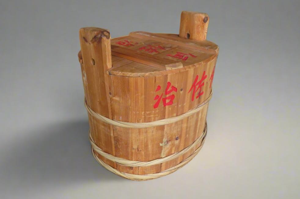 We have not been able to successfully translate the red characters carved onto the sides and lid of the barrel.
