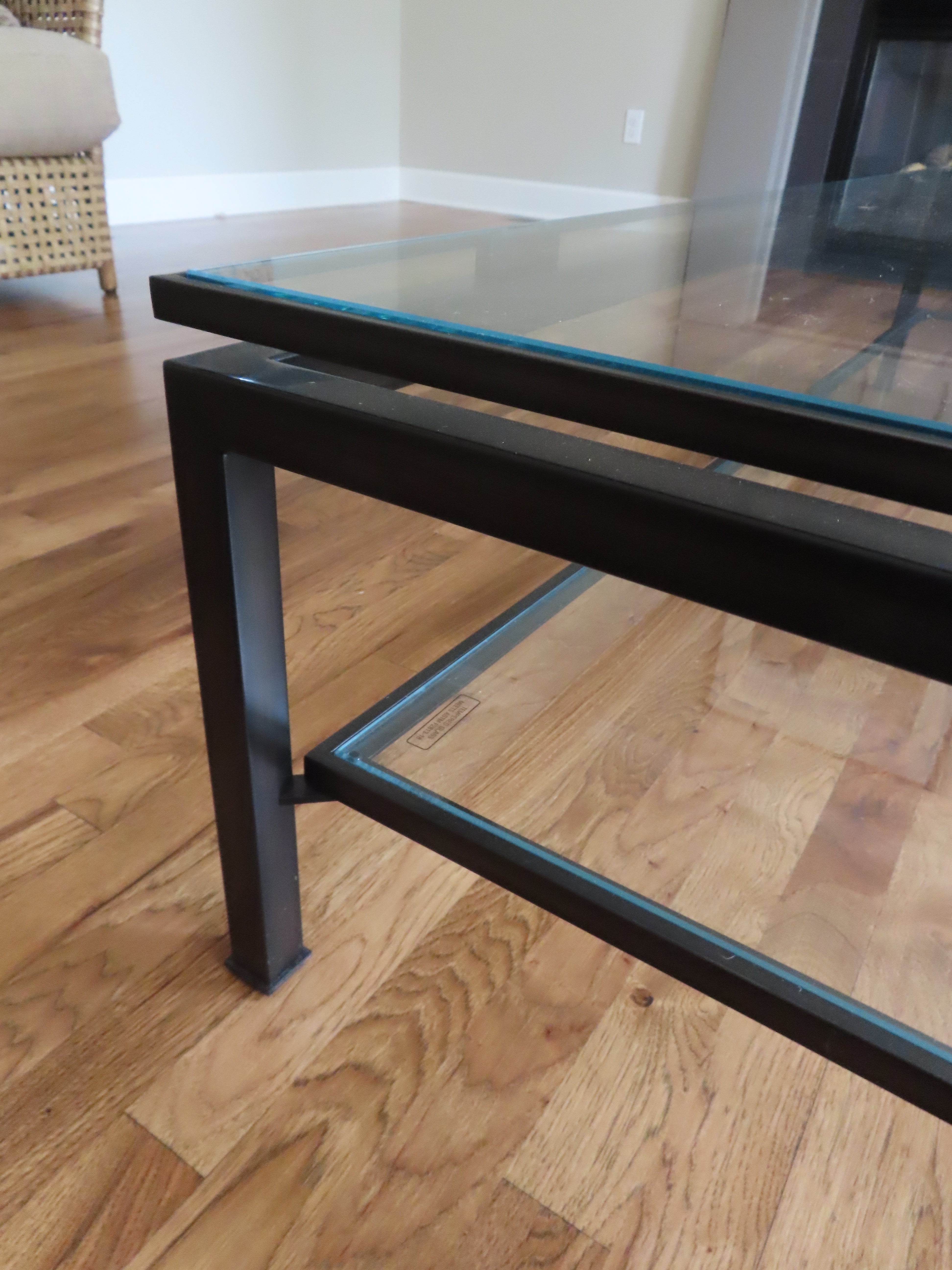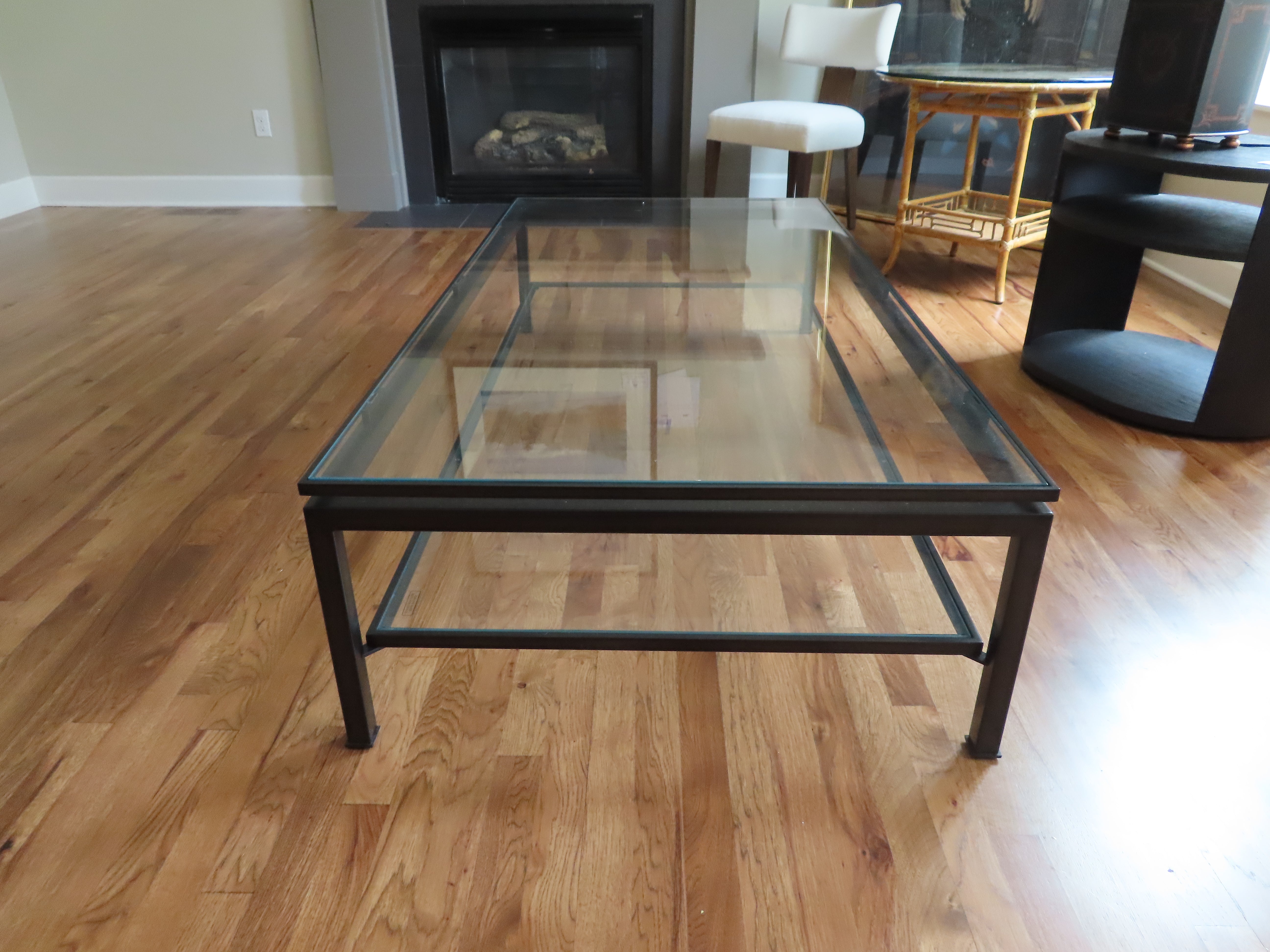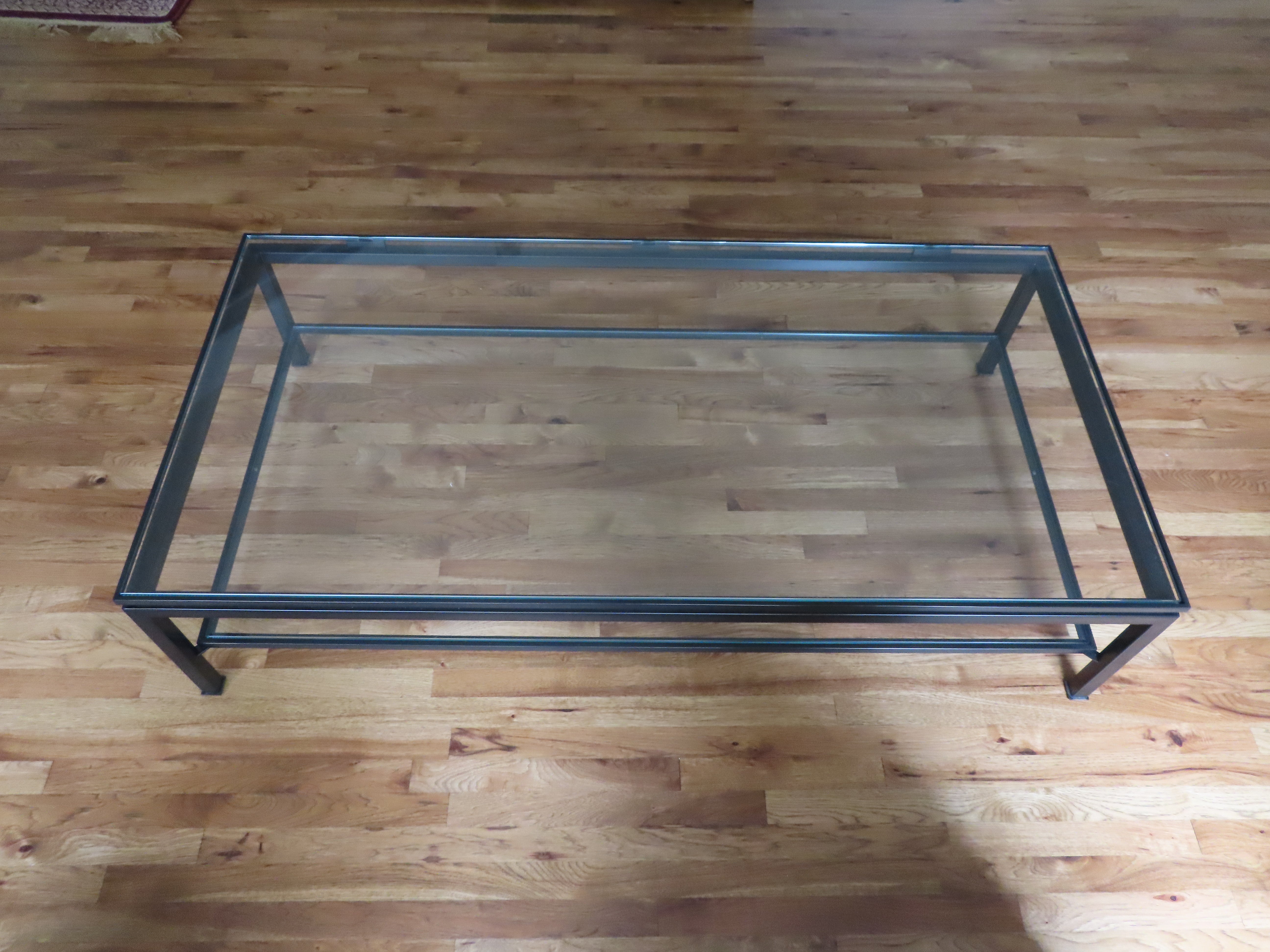 Beautiful Restoration Hardware Marceau coffee table, brushed dark metal and glass top and glass shelf. Very simple, classy and modern design. Would fit seamlessly in any living room. Has a large surface area for more interior designing space.