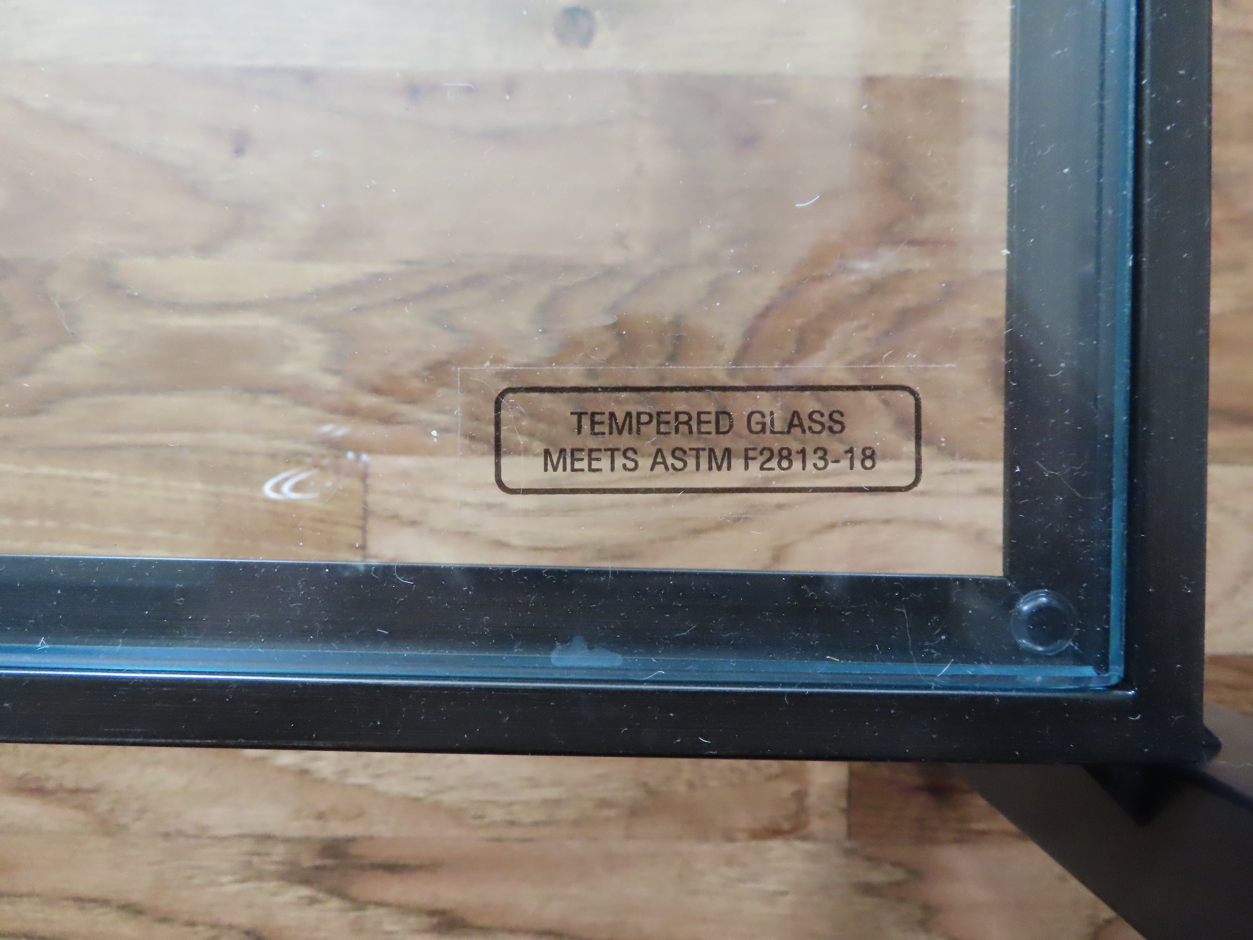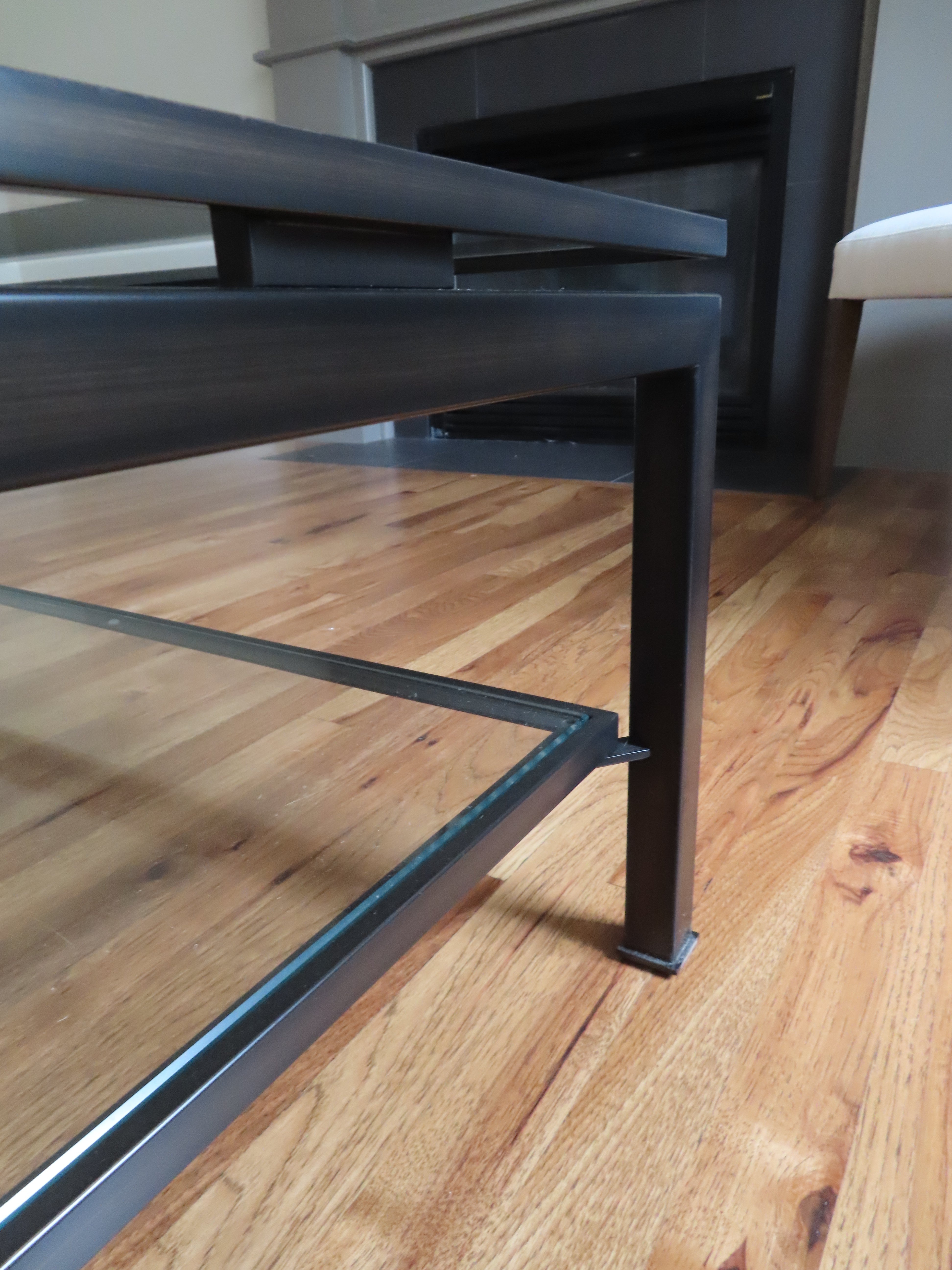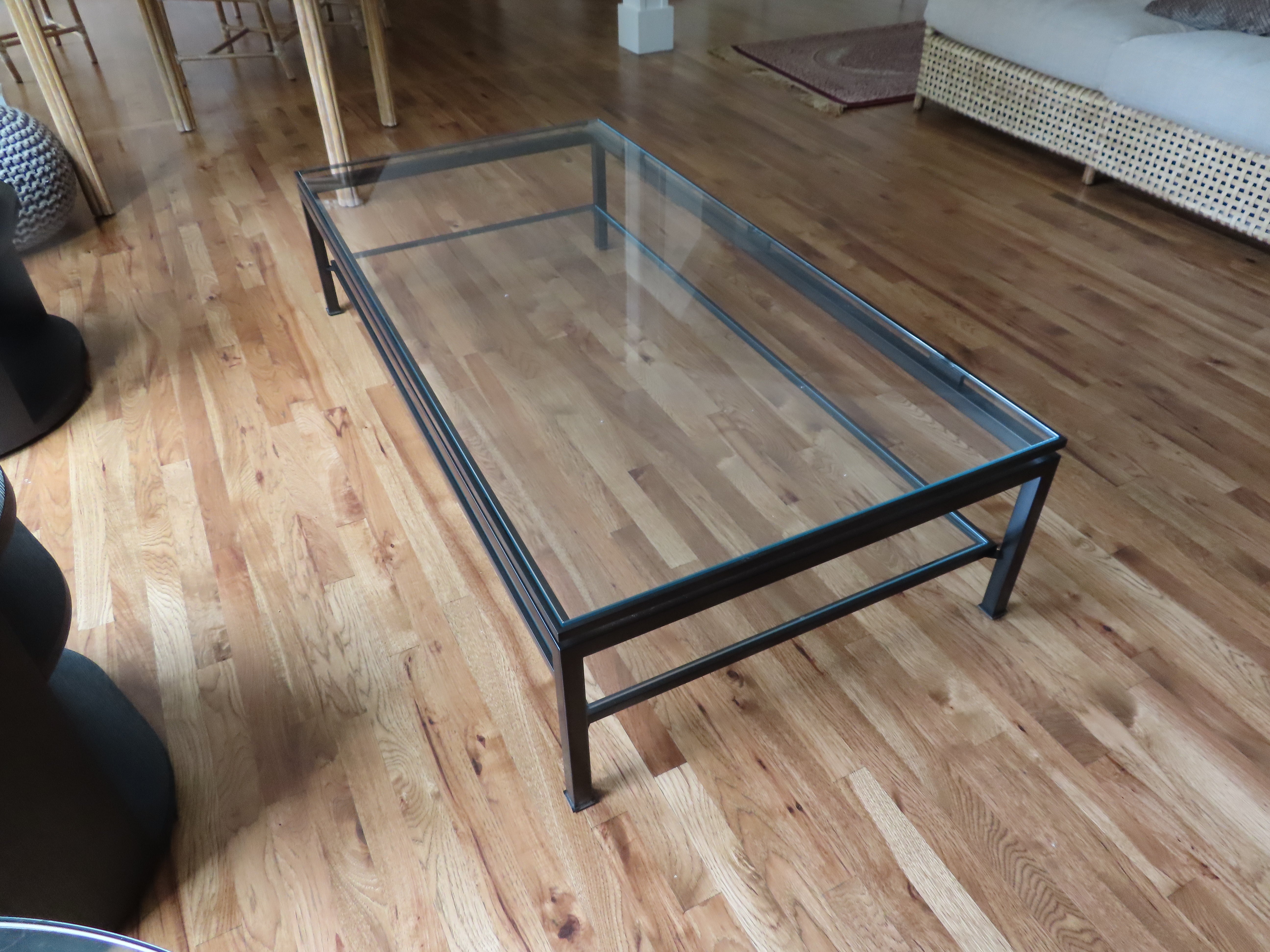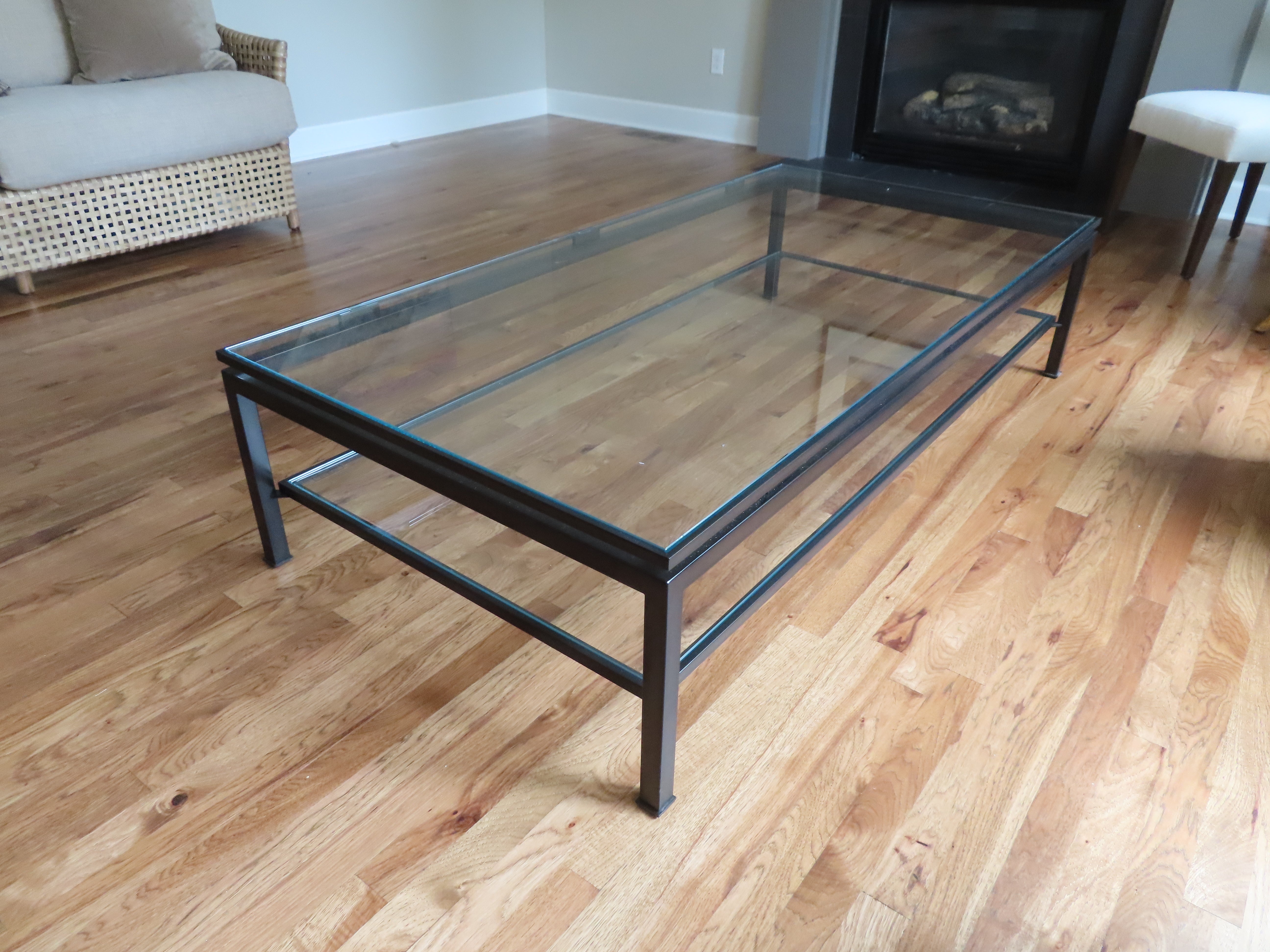 Beautiful Restoration Hardware Marceau coffee table, brushed dark metal and glass top and glass shelf. Very simple, classy and modern design. Would fit seamlessly in any living room. Has a large surface area for more interior designing space.