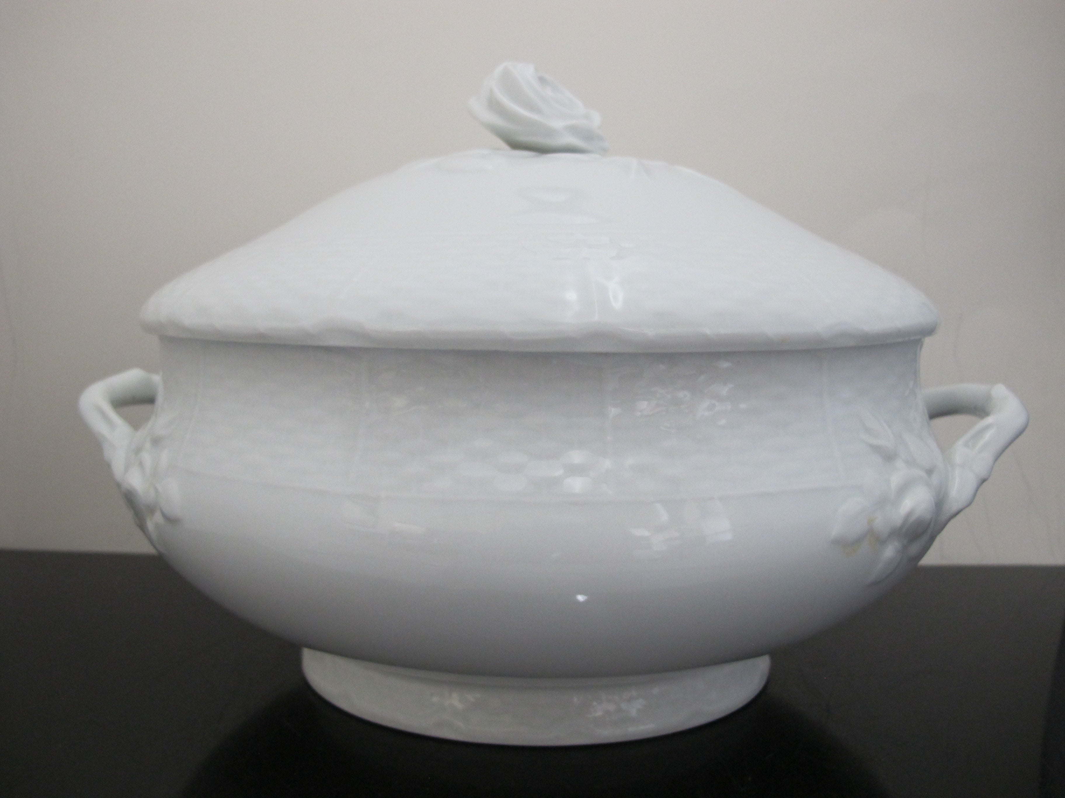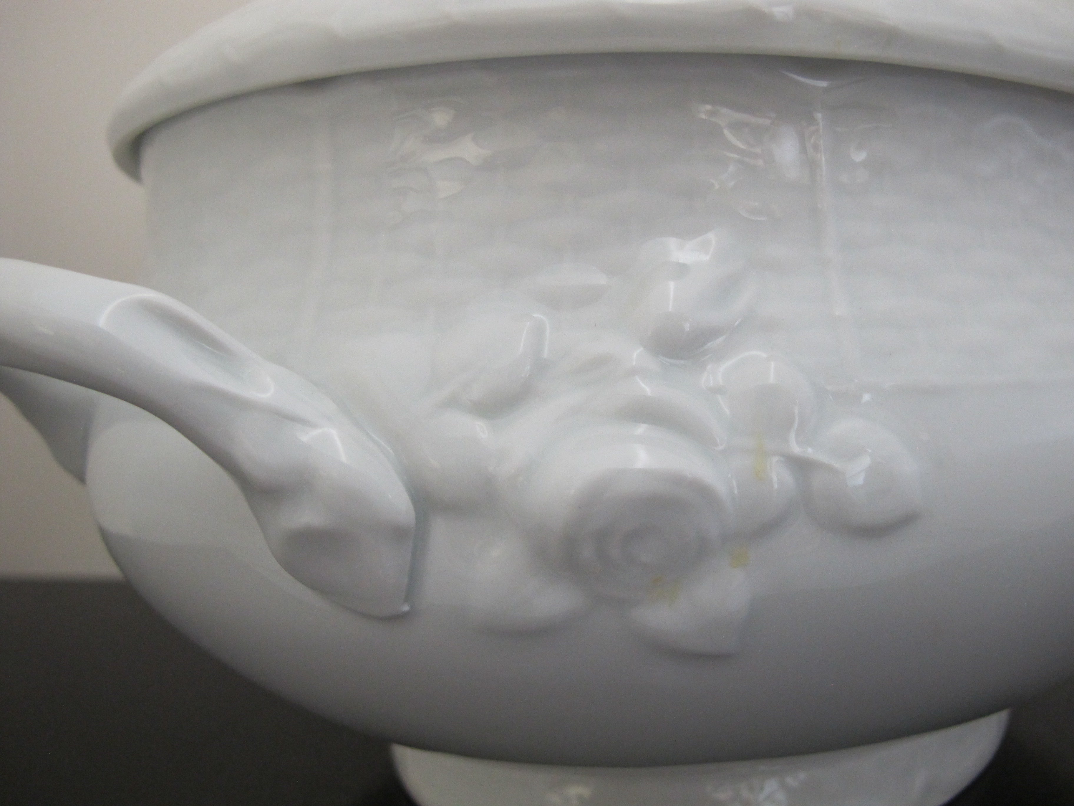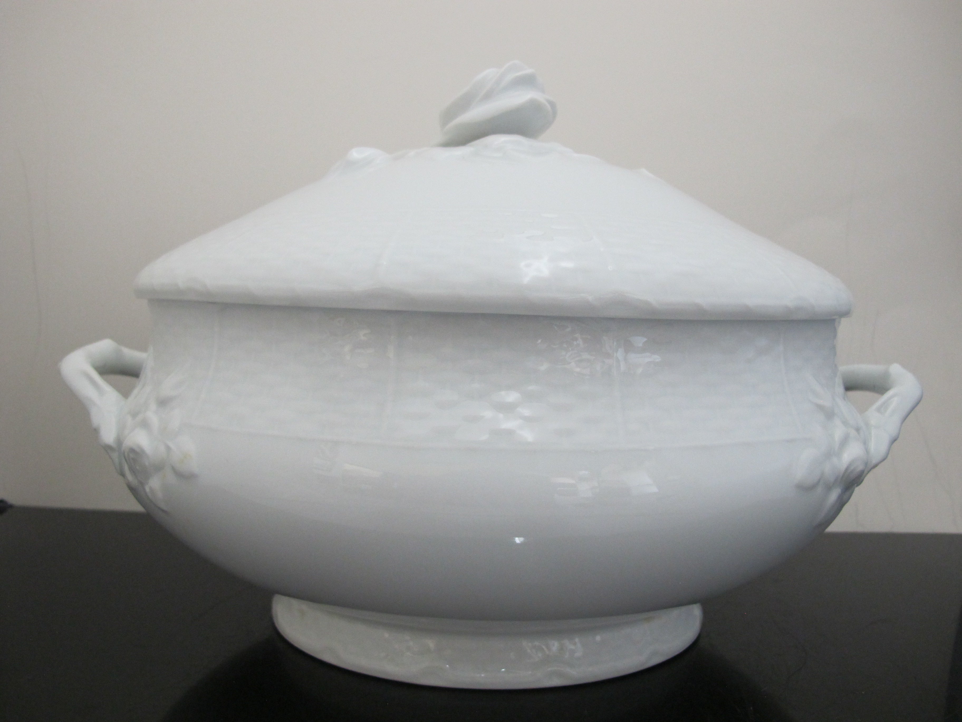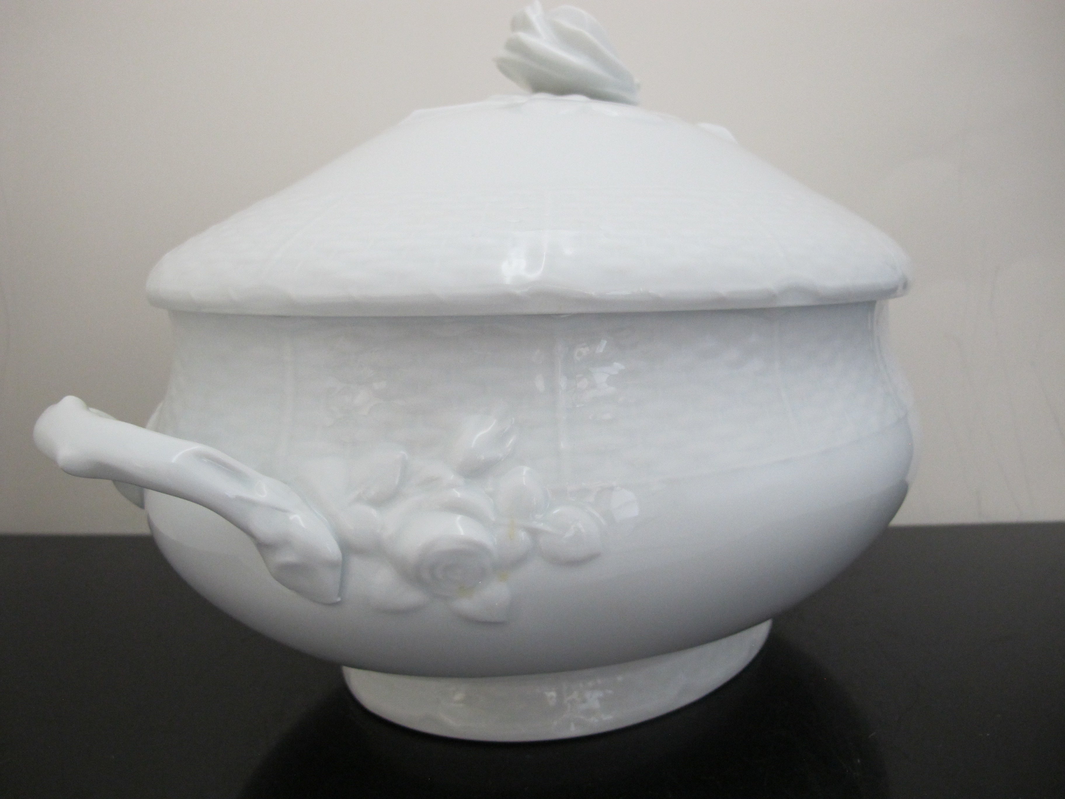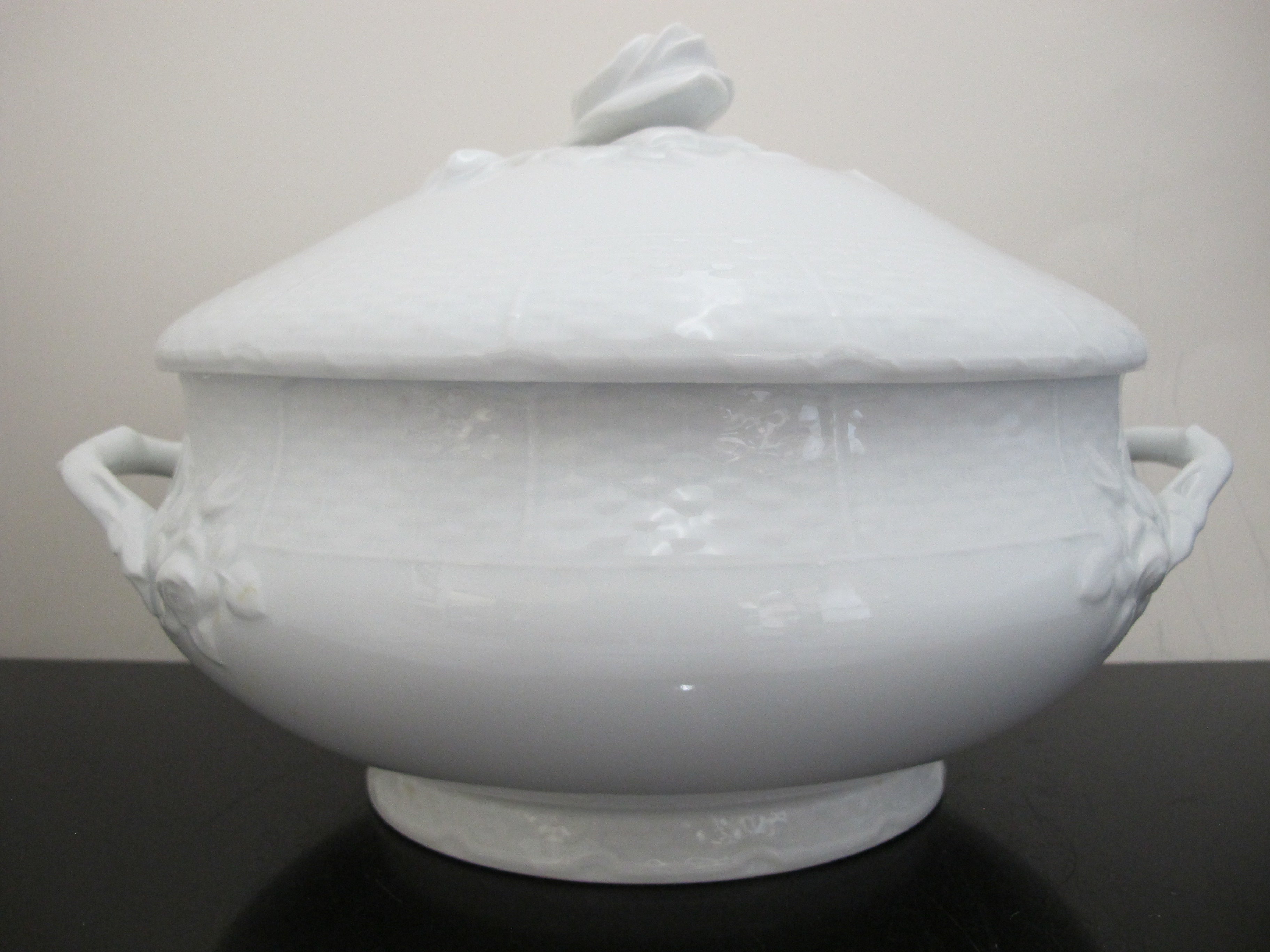 Classic and lovely Limoges A Raynaud Osier pattern large tureen with lid. Crisp white showing basket weave texture and rose design with large rose finial. Measures 12" x 7" x 8 1/2" tall. Excellent condition, no chips, cracks, or repairs.