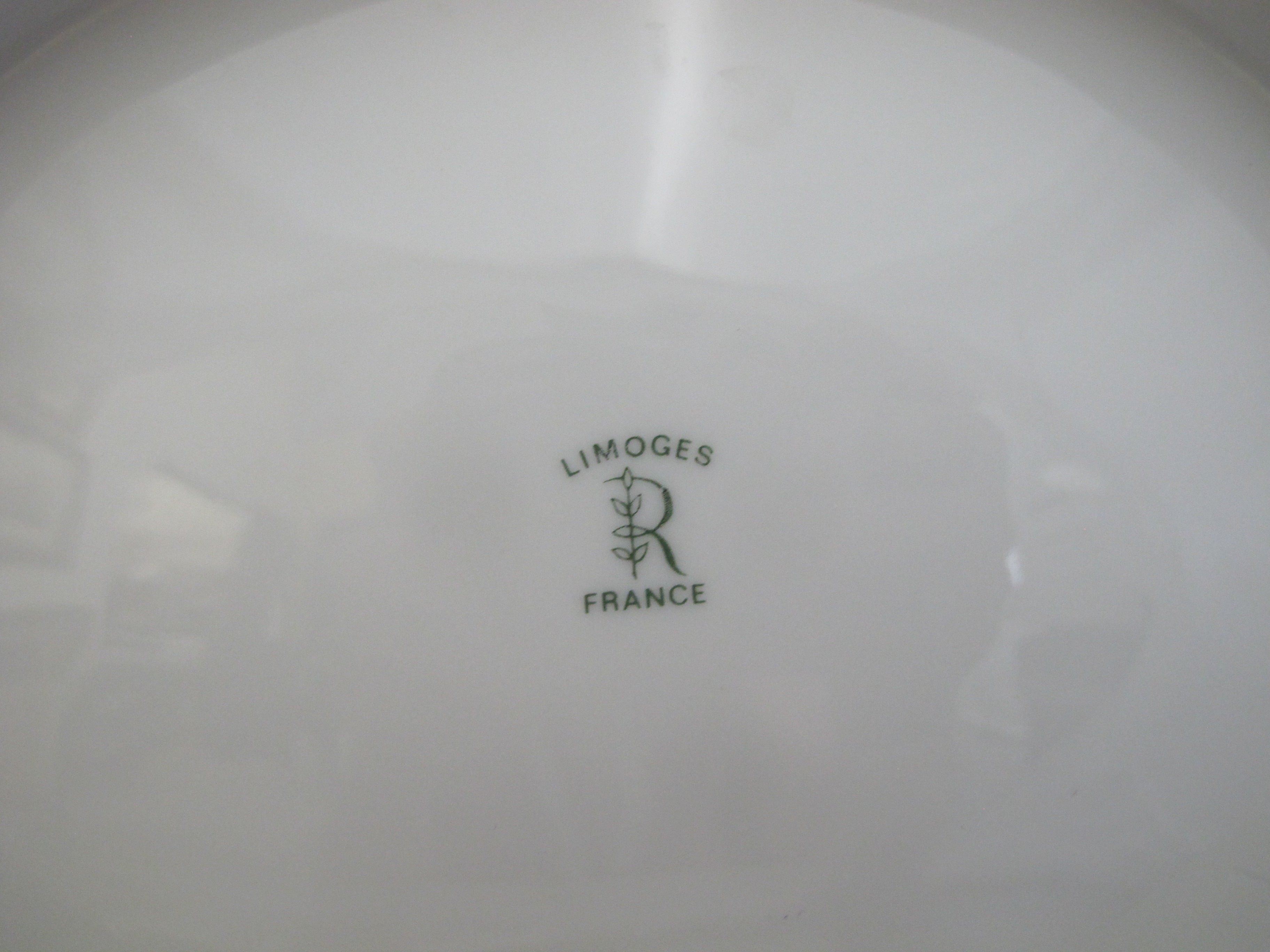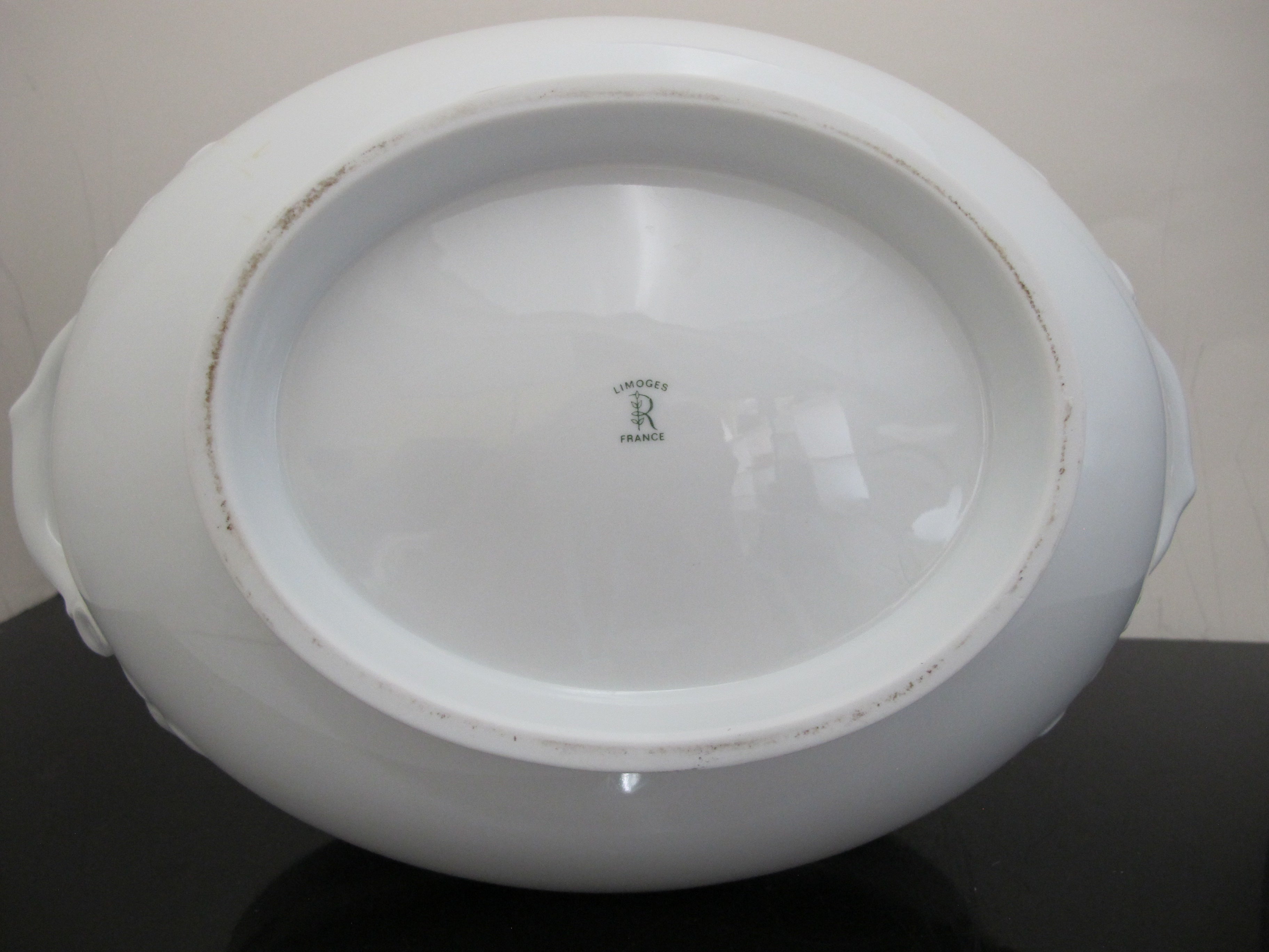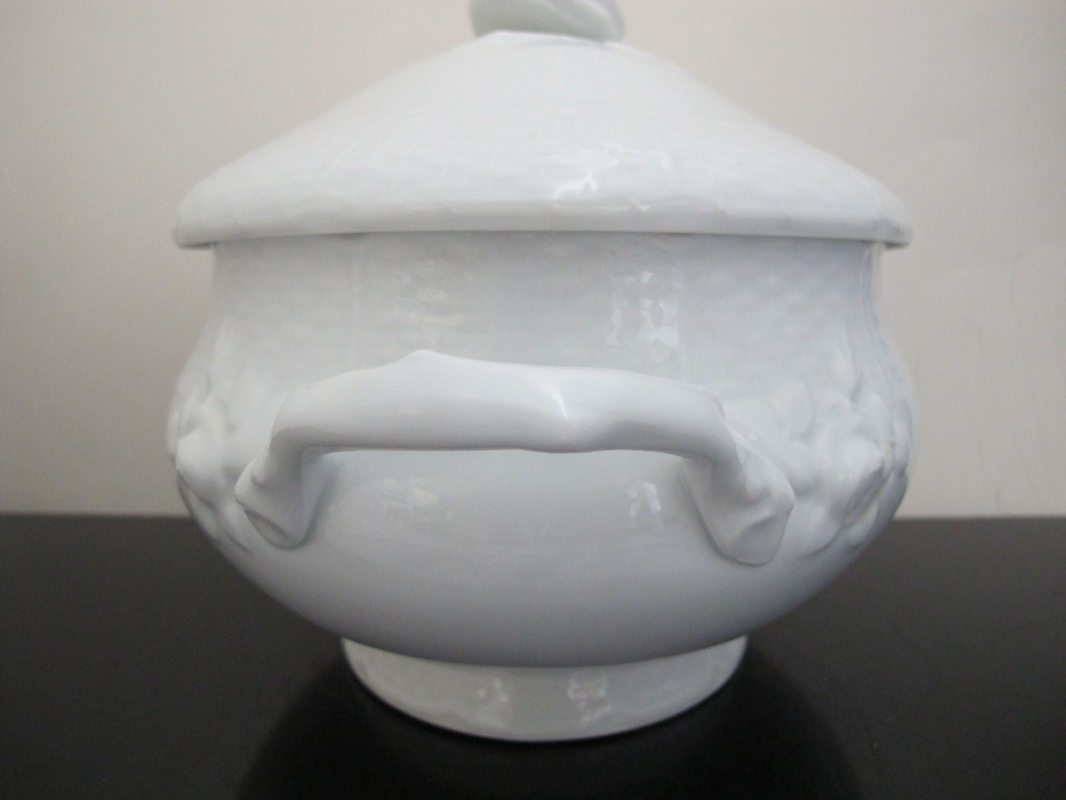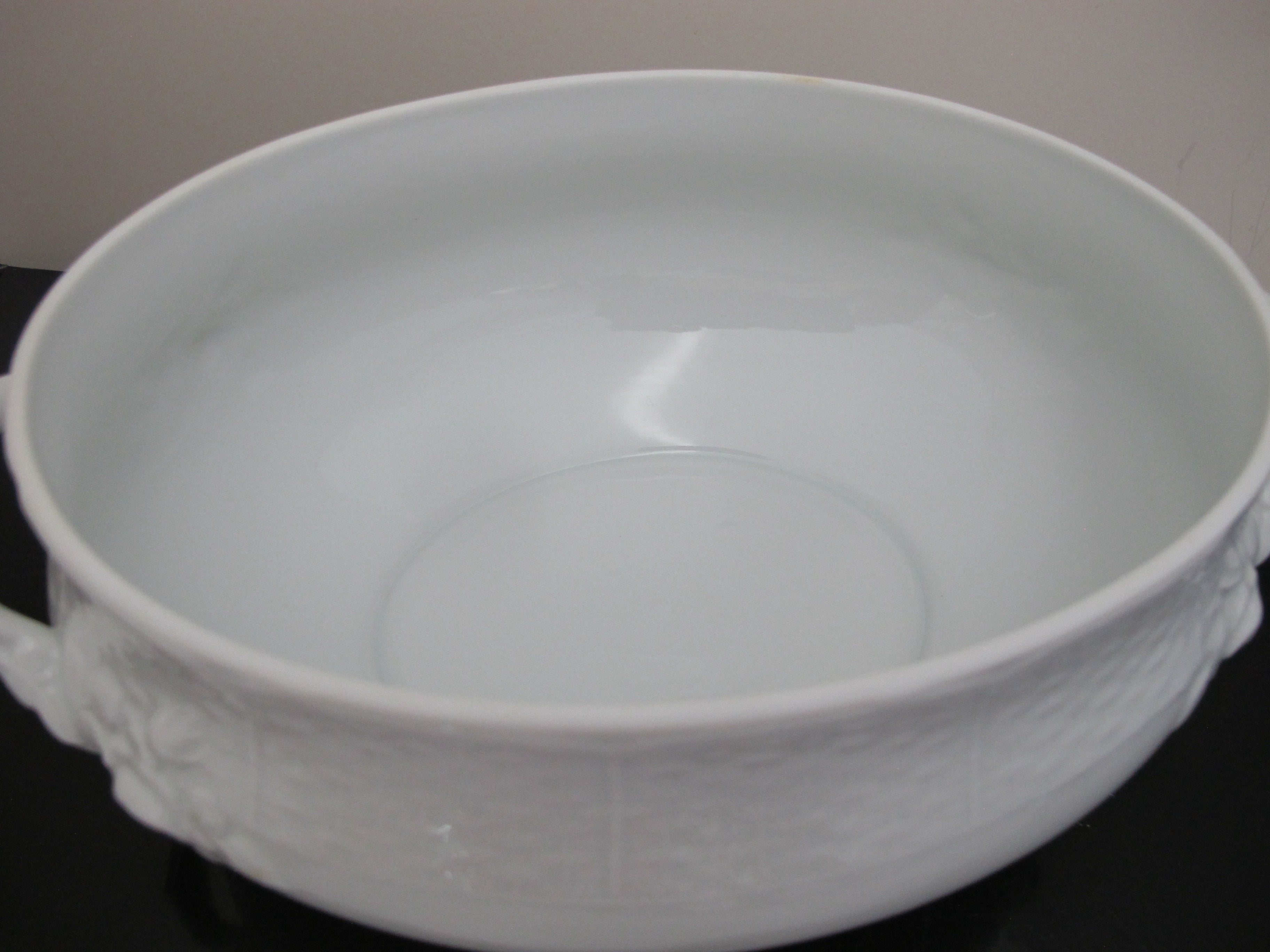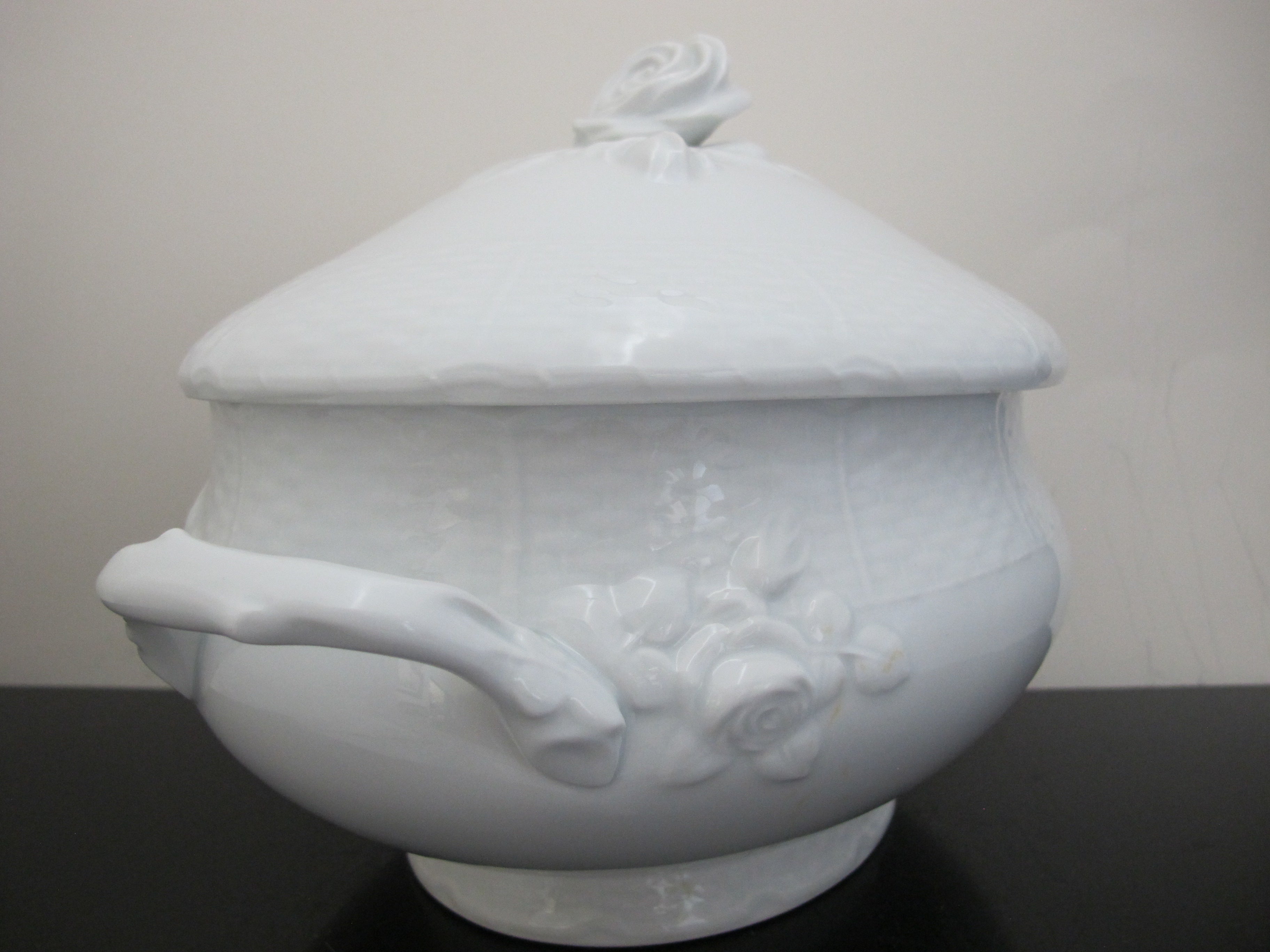 Classic and lovely Limoges A Raynaud Osier pattern large tureen with lid. Crisp white showing basket weave texture and rose design with large rose finial. Measures 12" x 7" x 8 1/2" tall. Excellent condition, no chips, cracks, or repairs.