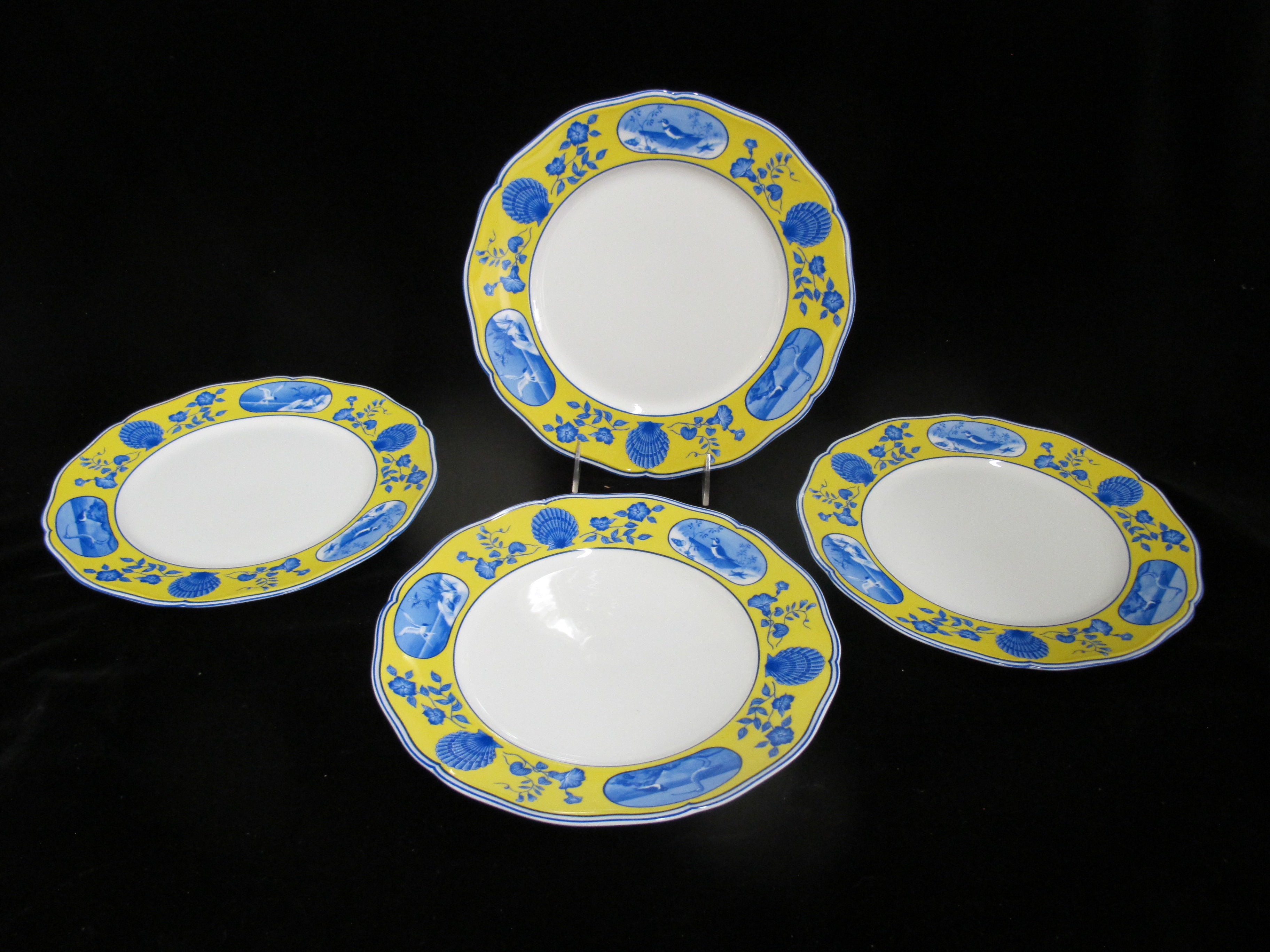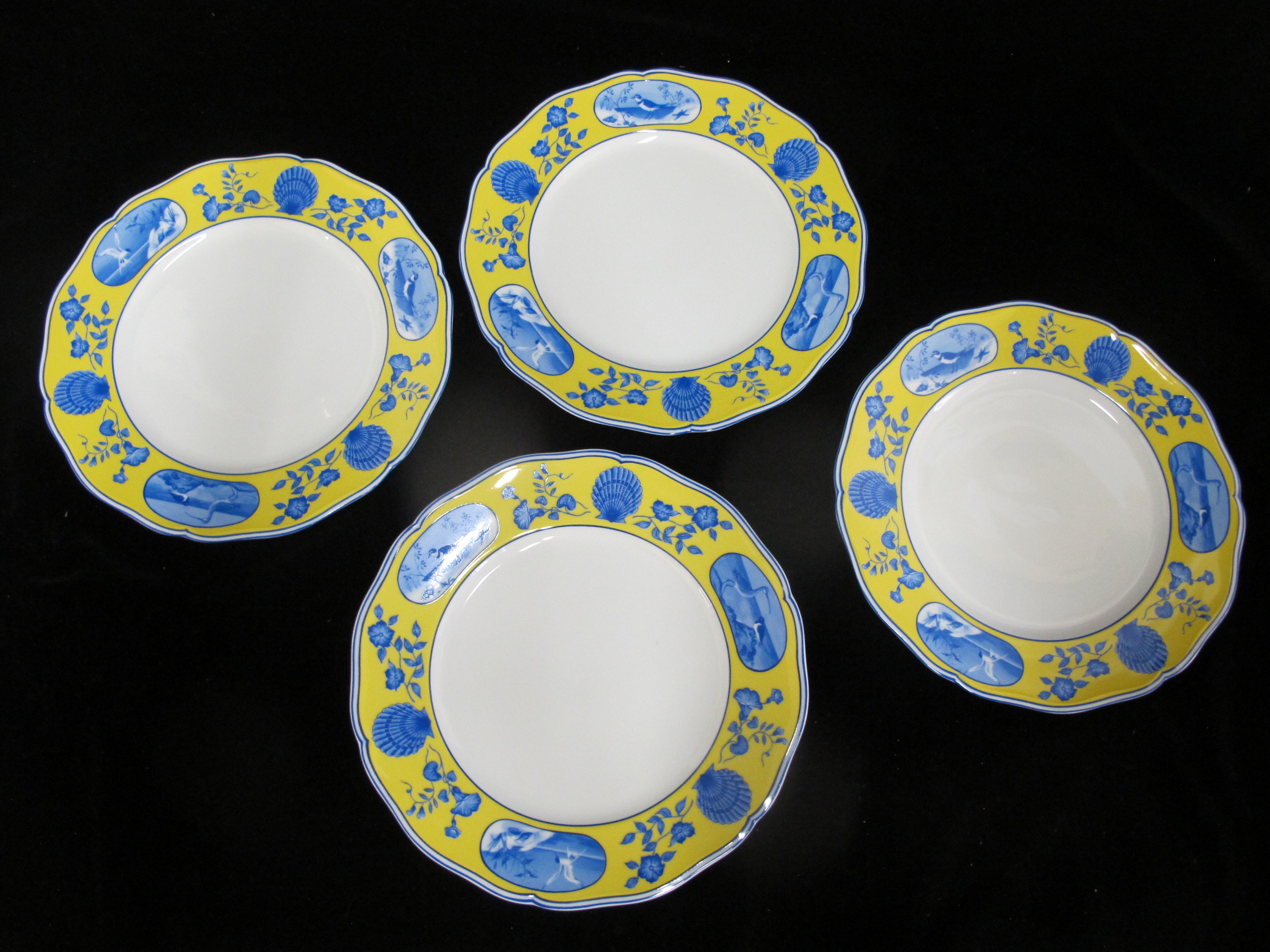 Lynn Chase Costa Azzurra 1988 pattern dinner plate set of 4. Ceramic in white with yellow highlighted border showing a whimsical seashell and creature design. Perfect plate set for the beach house. All are in excellent condition, no chips, cracks, or repairs.