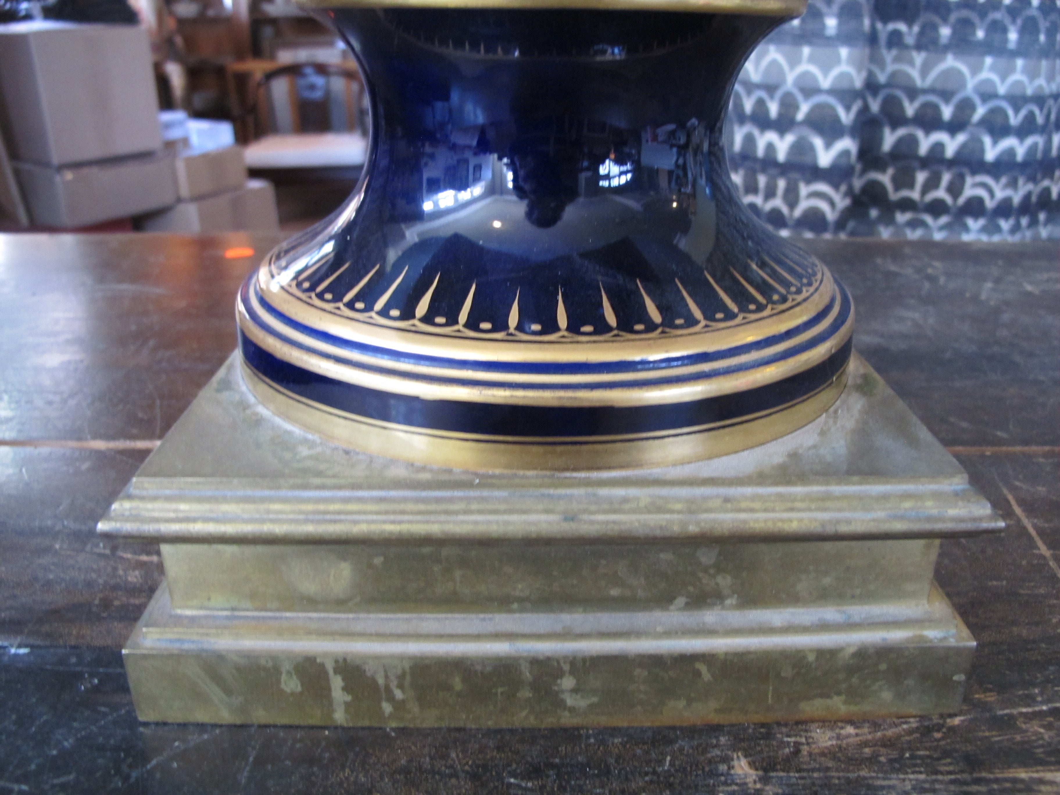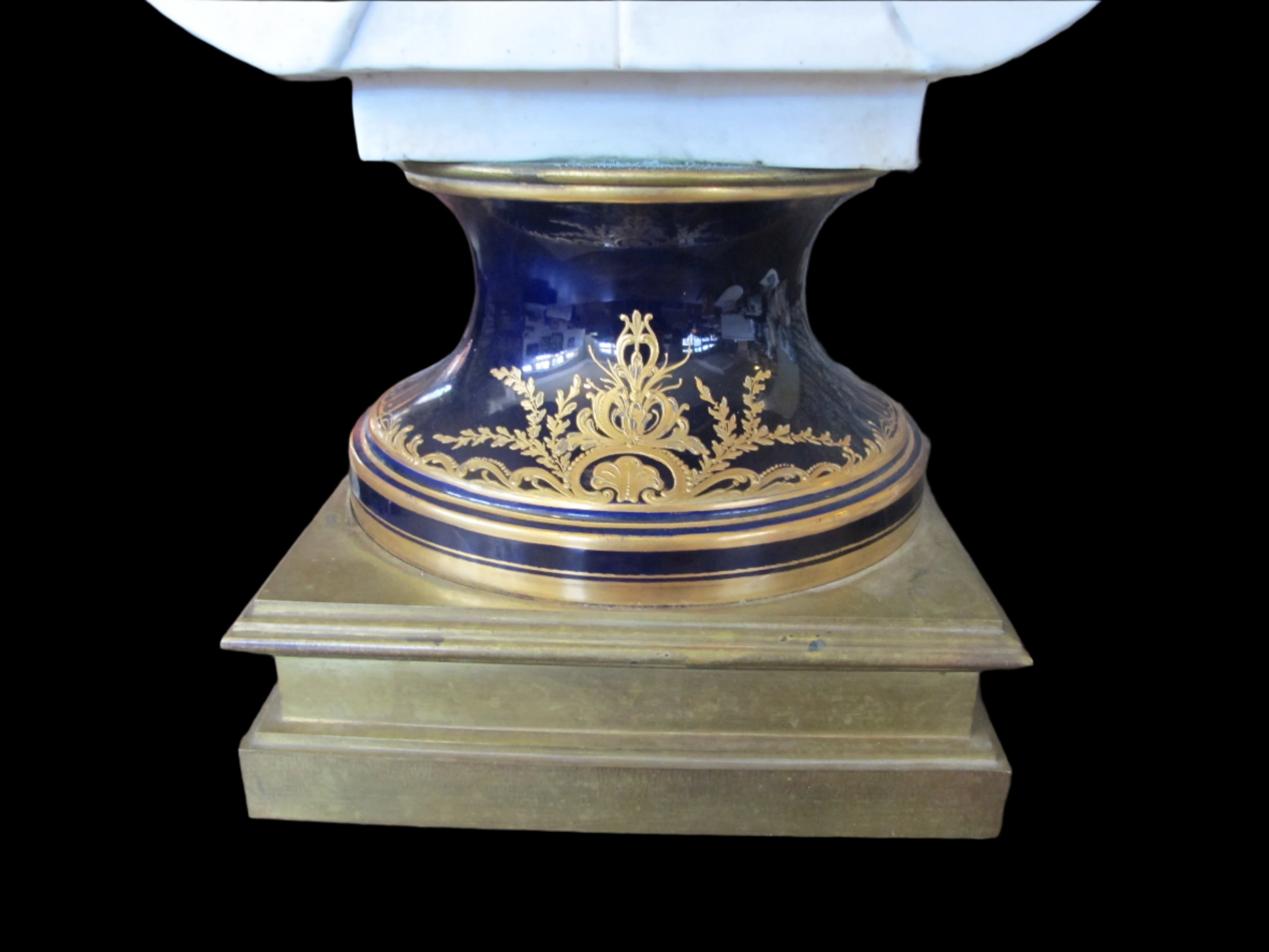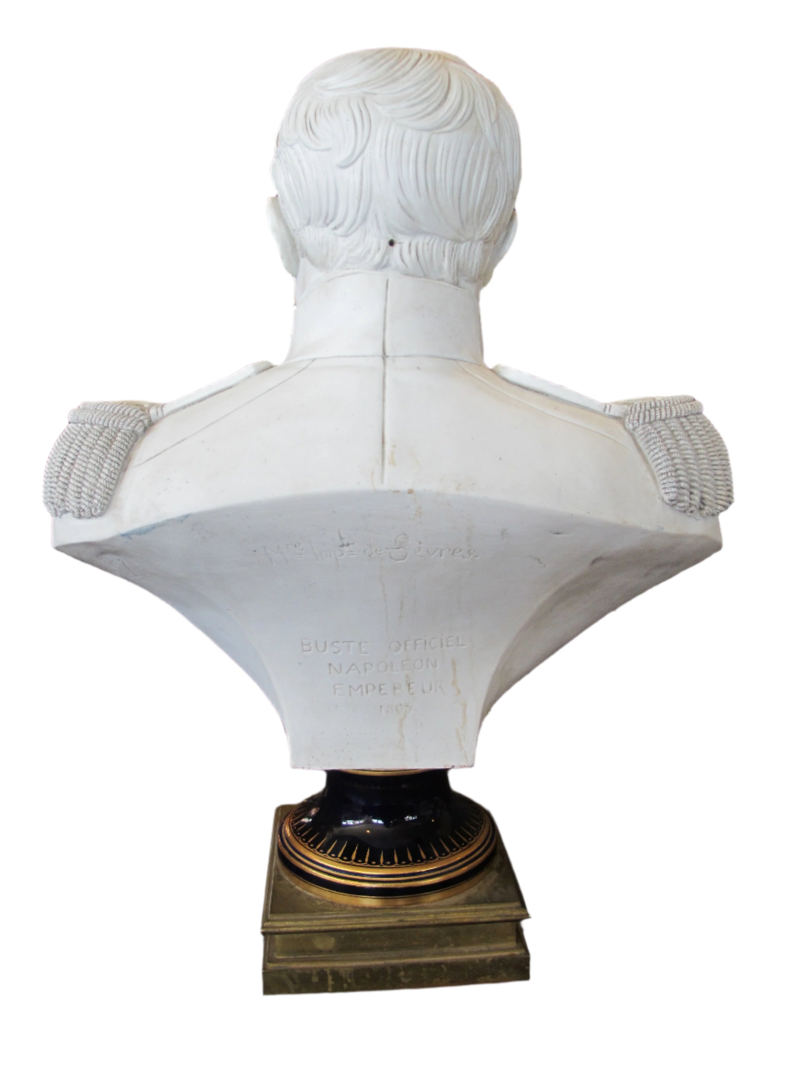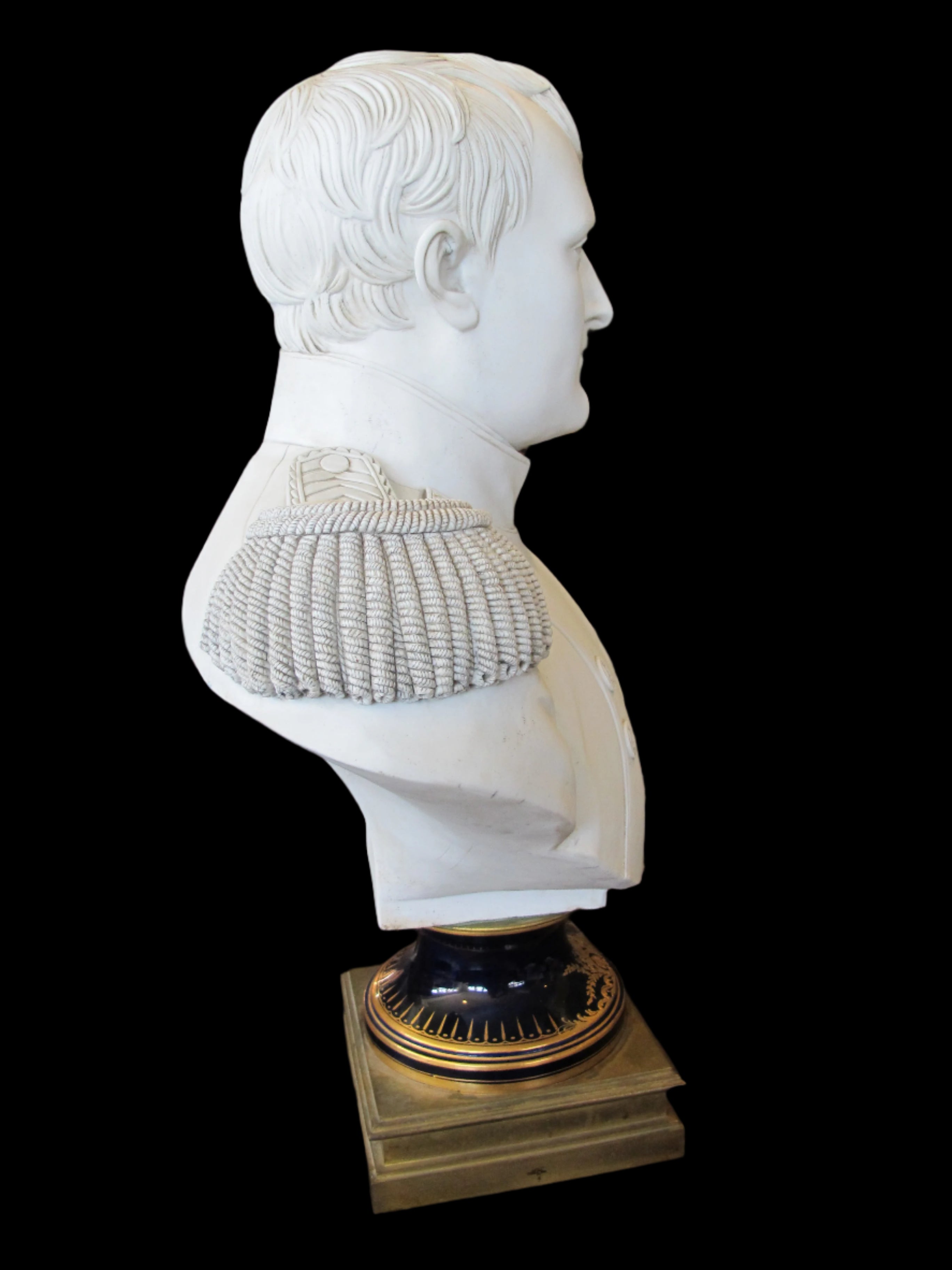 Very fine Sevres Bust official, of emperor Napoleon Bonaparte 1805, as marked at back of bust, see photograph. Incredibly detailed white bisque porcelain set on cobalt blue porcelain with gilt accent and heavy brass or bronze base. Measures 24" tall x 19" x 10". Excellent condition. Signed 'Chaudelair' under left art.