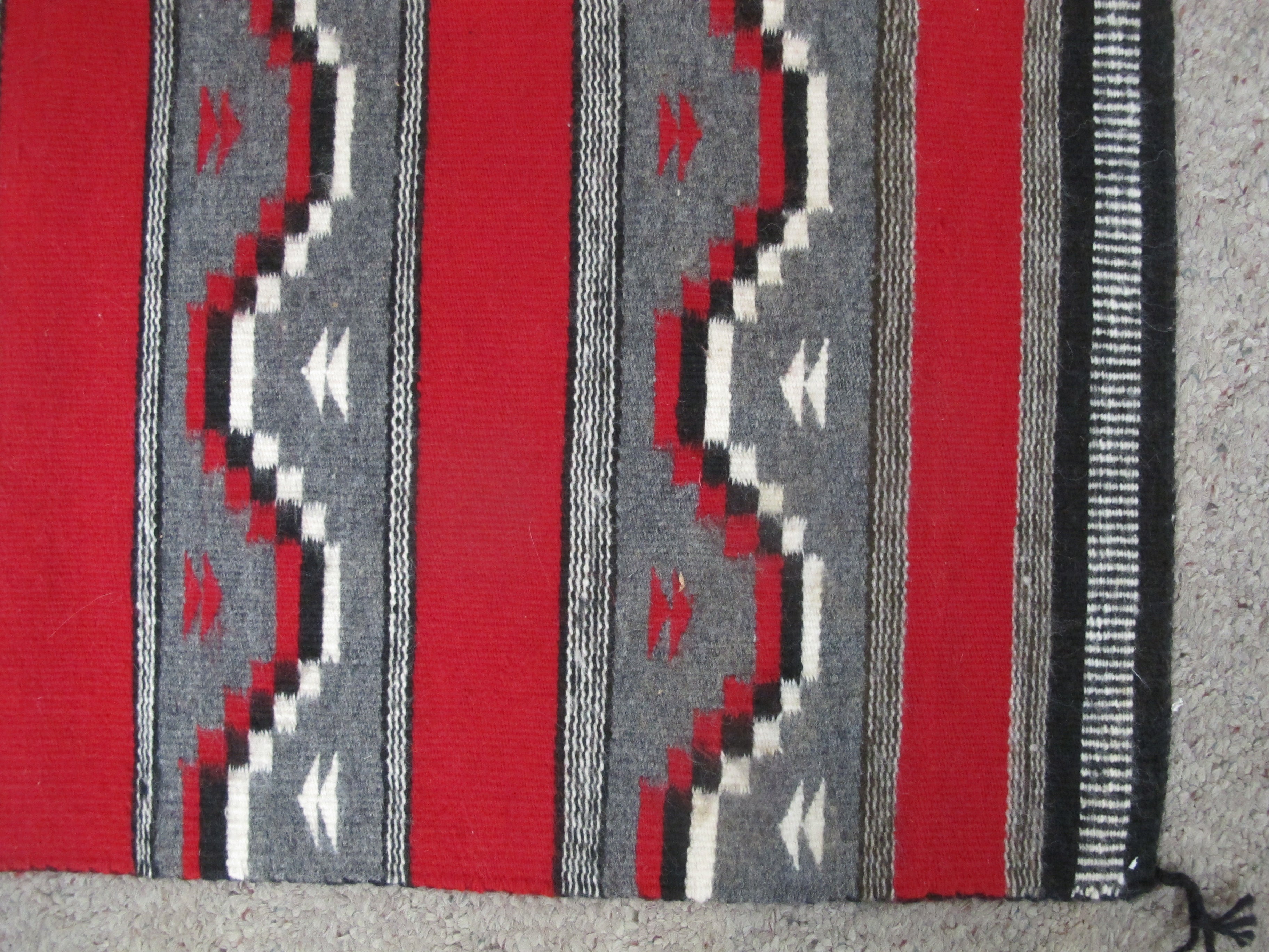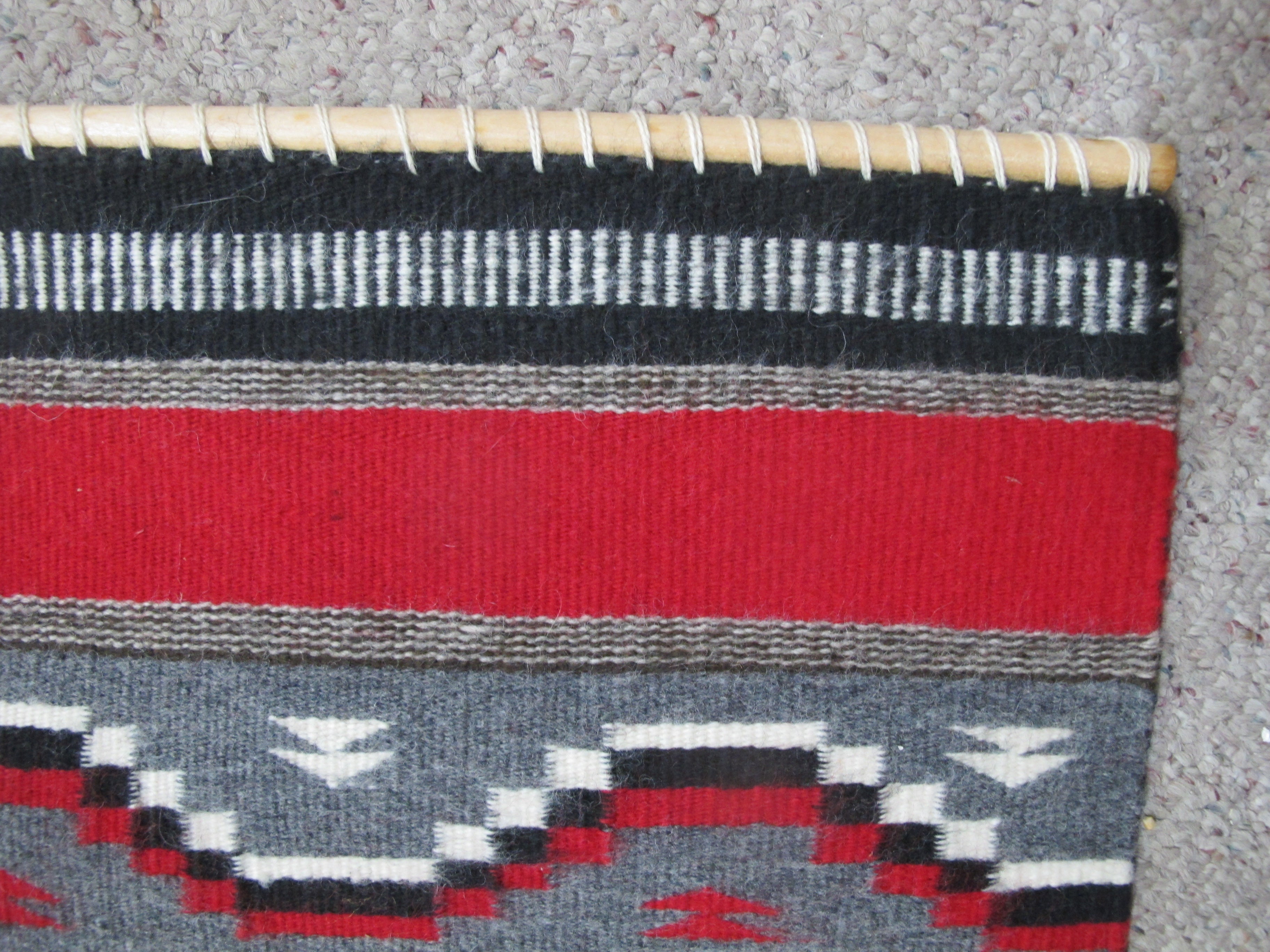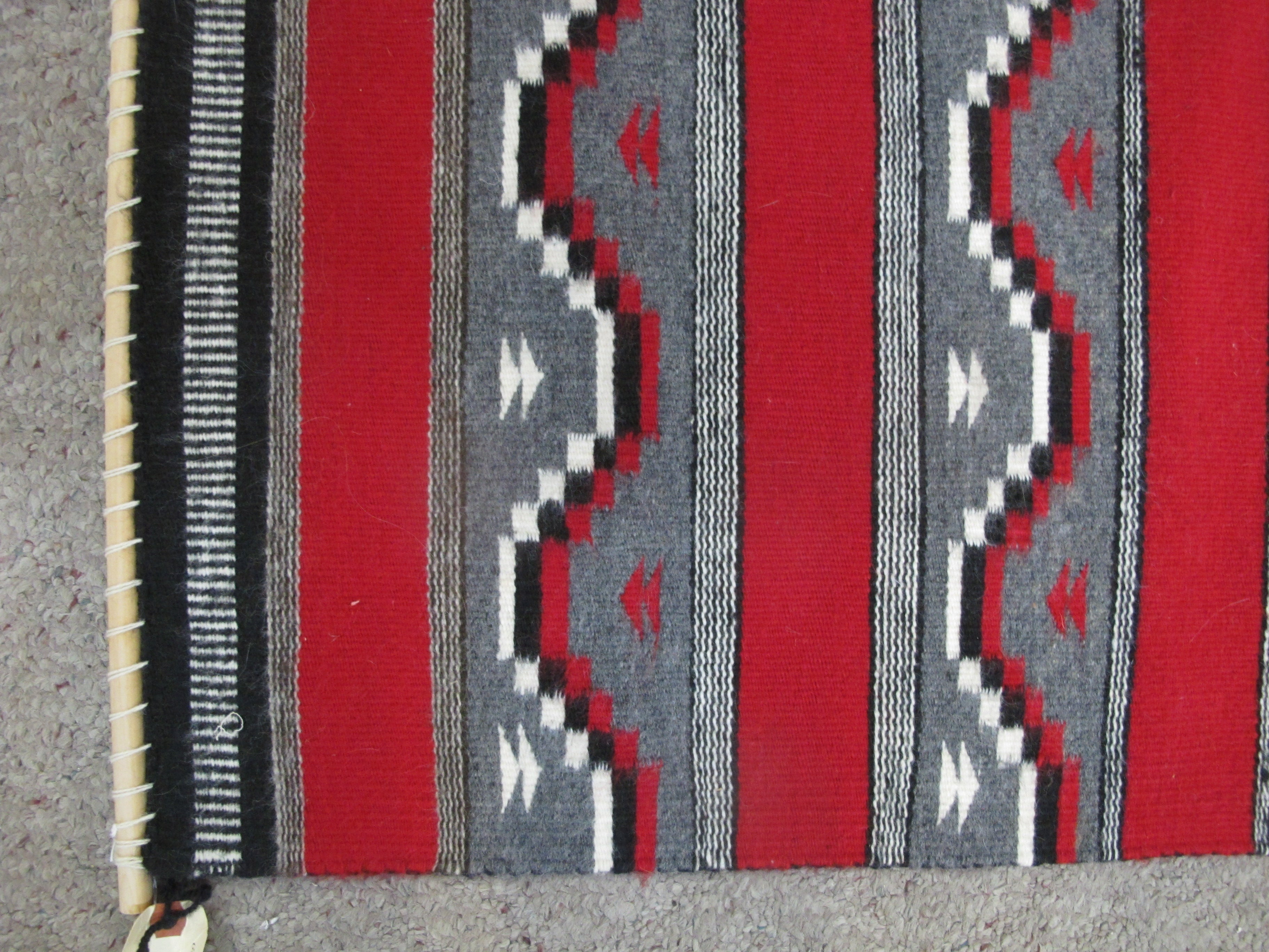 Beautiful Navajo SW Native rug or tapestry, hand woven by artisan, Rose Jones. Woven wool in bright red and gray geometric design. Wrapped around wood stick at top for hanging, could easily be removed. Measures 24" x 34". Excellent condition, no stains or holes.