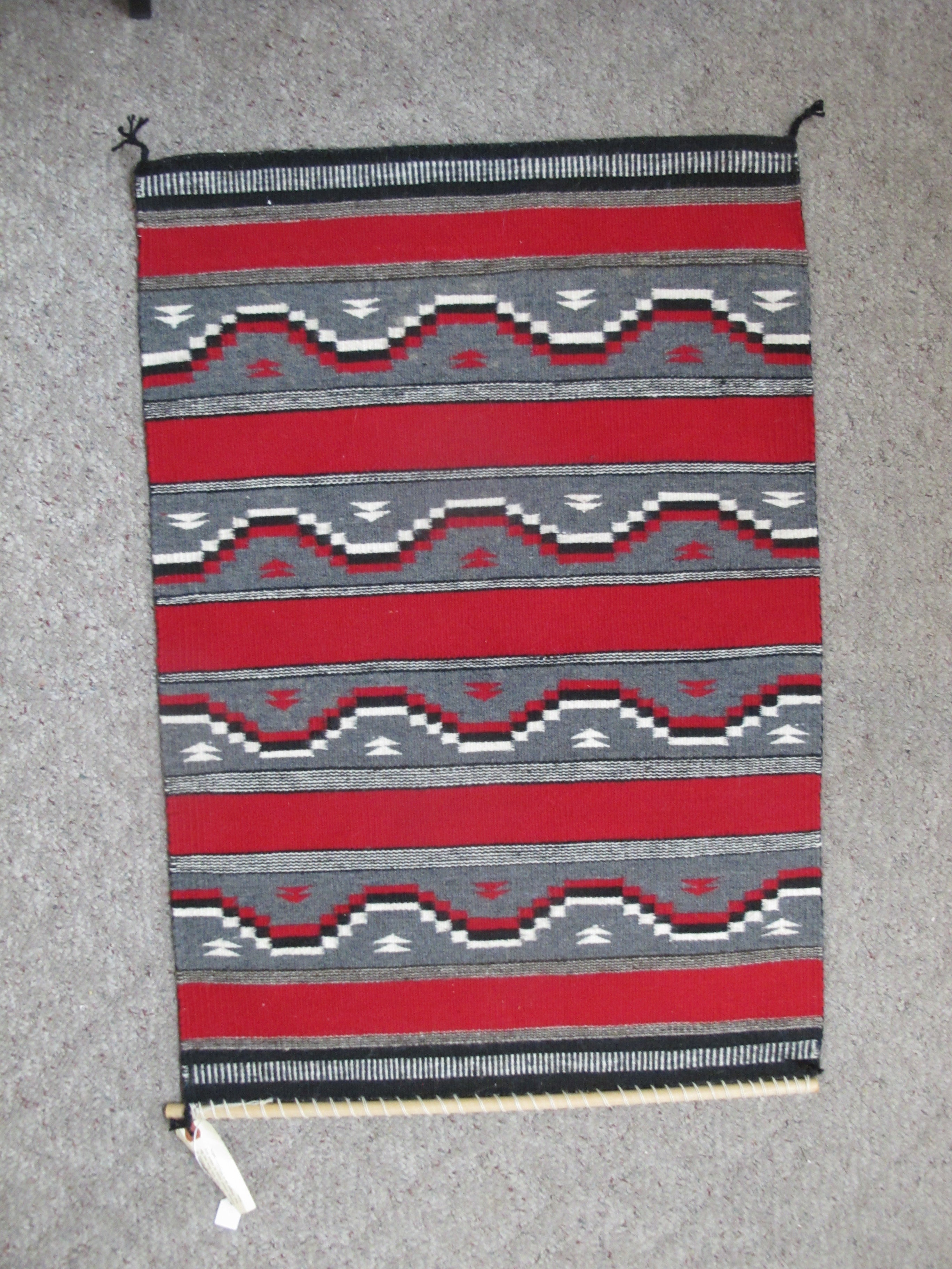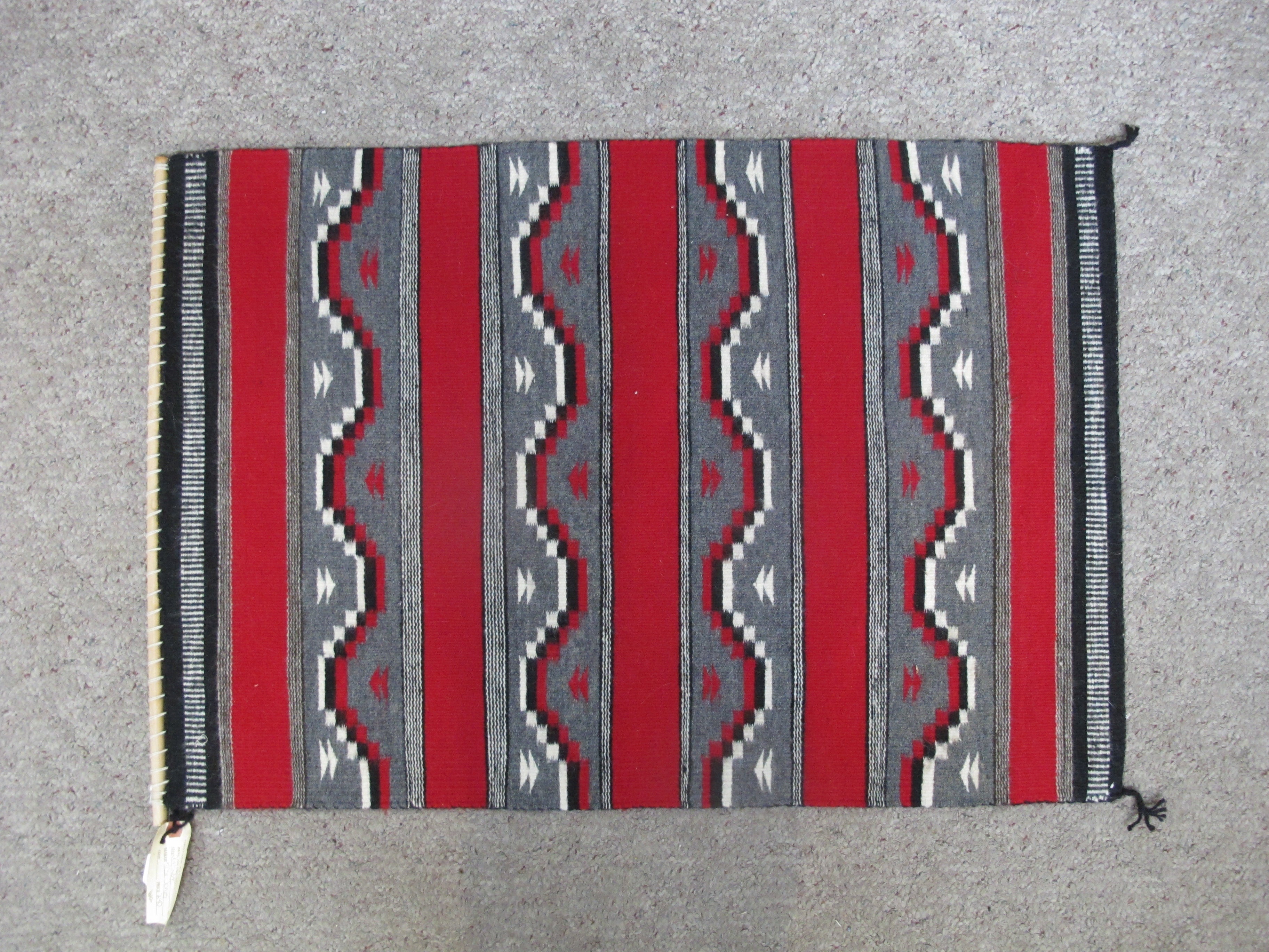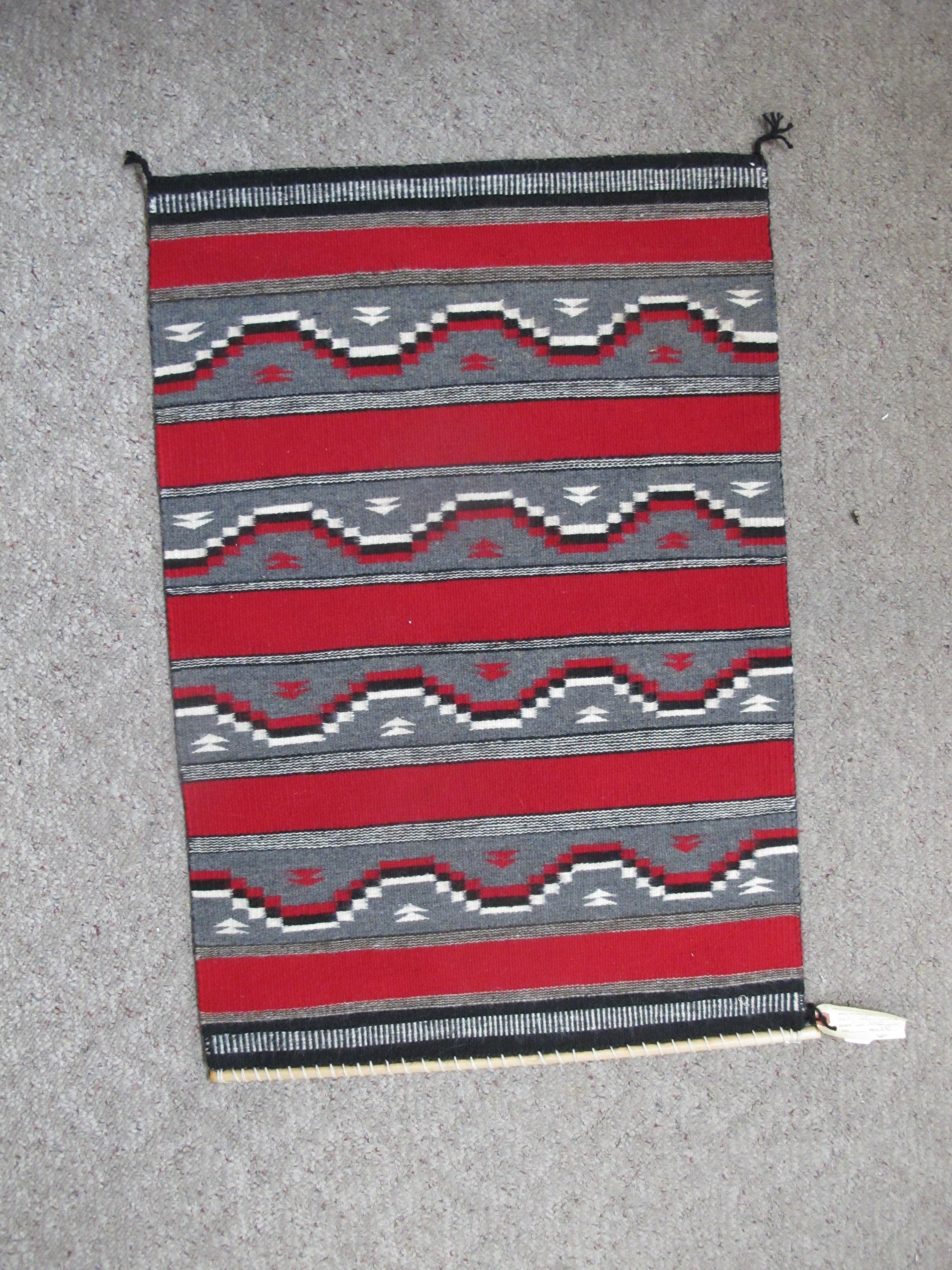 Beautiful Navajo SW Native rug or tapestry, hand woven by artisan, Rose Jones. Woven wool in bright red and gray geometric design. Wrapped around wood stick at top for hanging, could easily be removed. Measures 24" x 34". Excellent condition, no stains or holes.