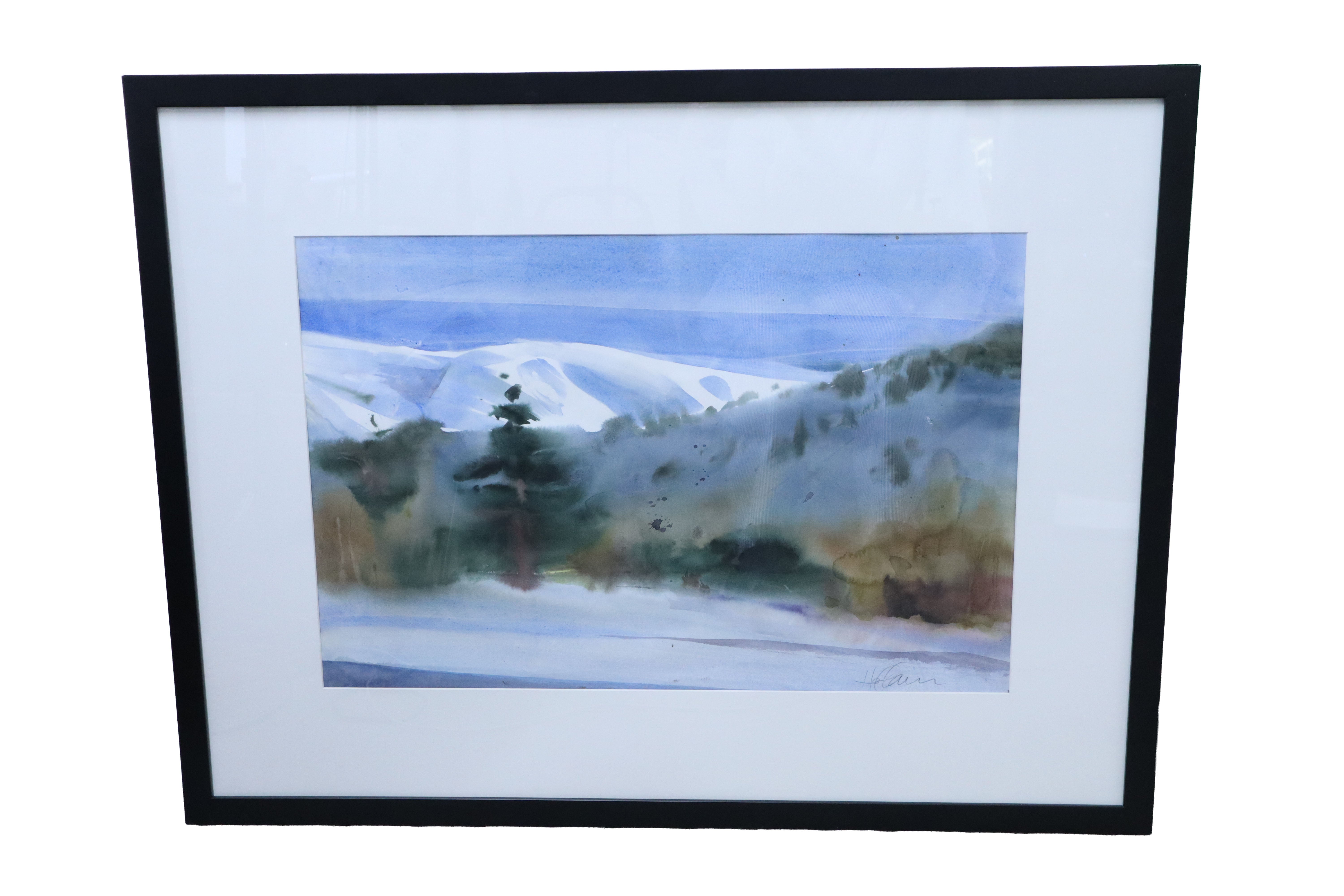 Beautiful original watercolor 'Up River", on paper by Tom Hoffmann. Signed in the lower right hand corner in pencil. Bought from the Fountainhead Gallery for $2,750. Watercolor depicts a natural winter landscape with snow covered mountains in the background and a forested grove in the middle ground. It has a calming feeling throughout the paper.