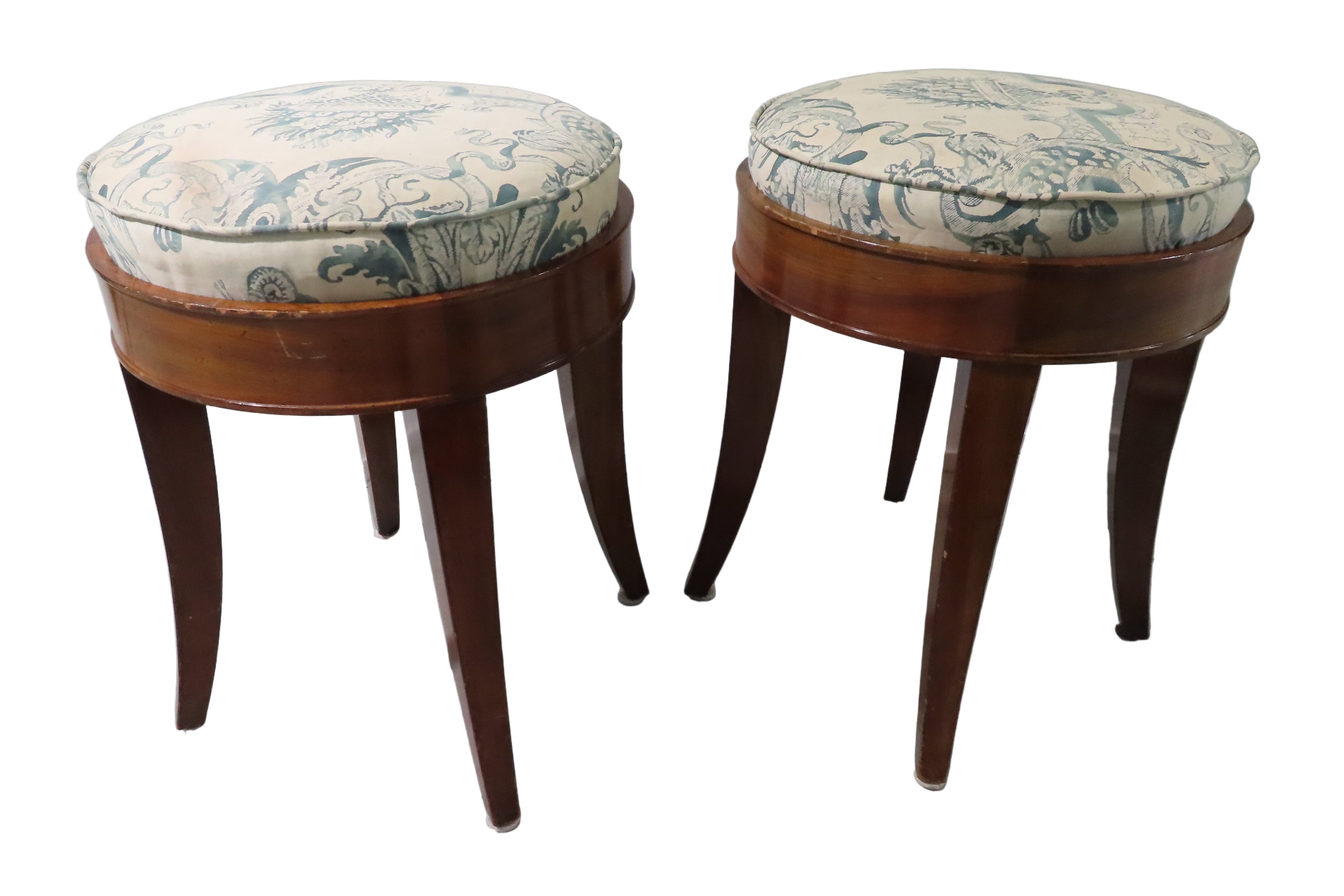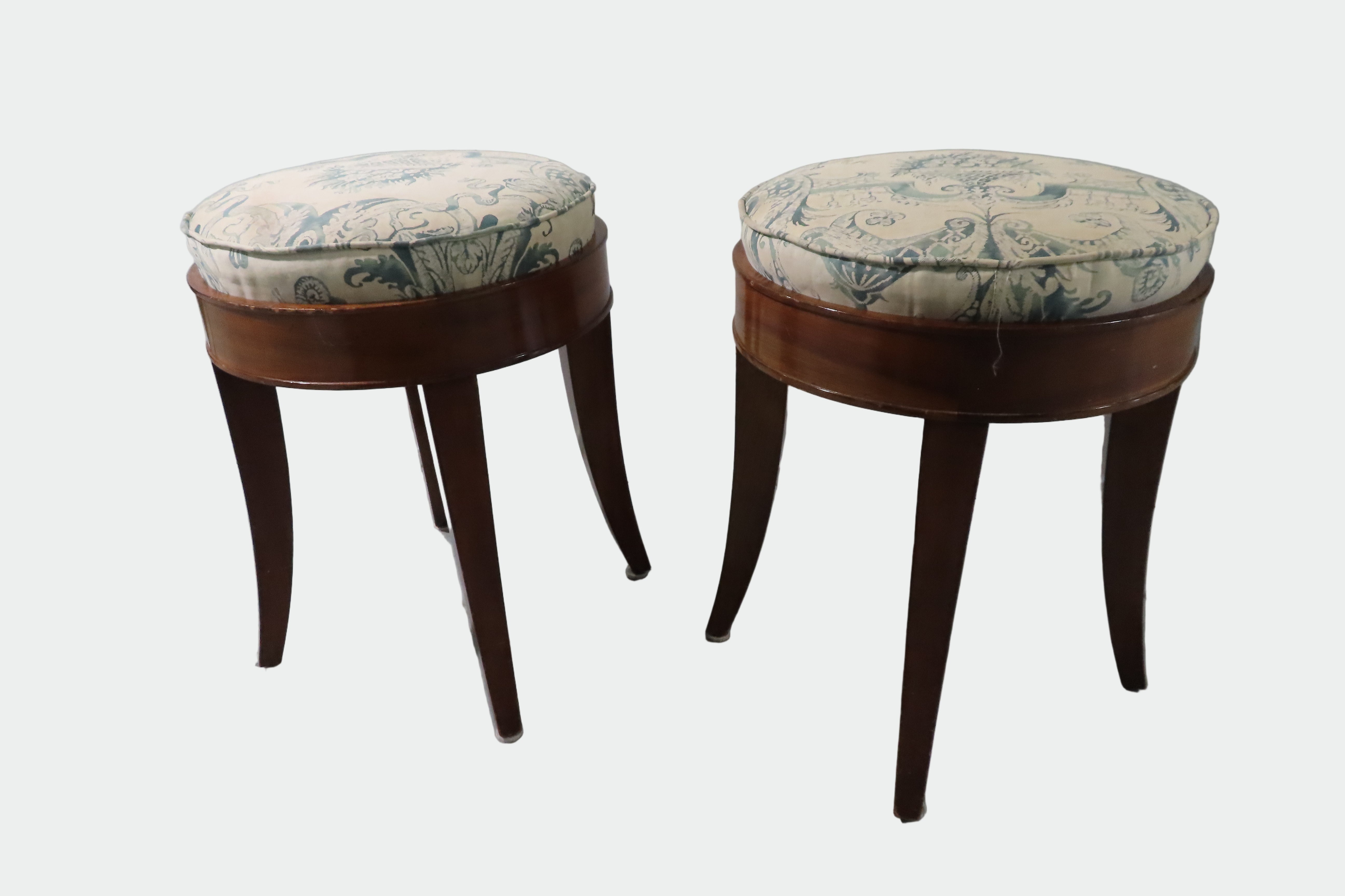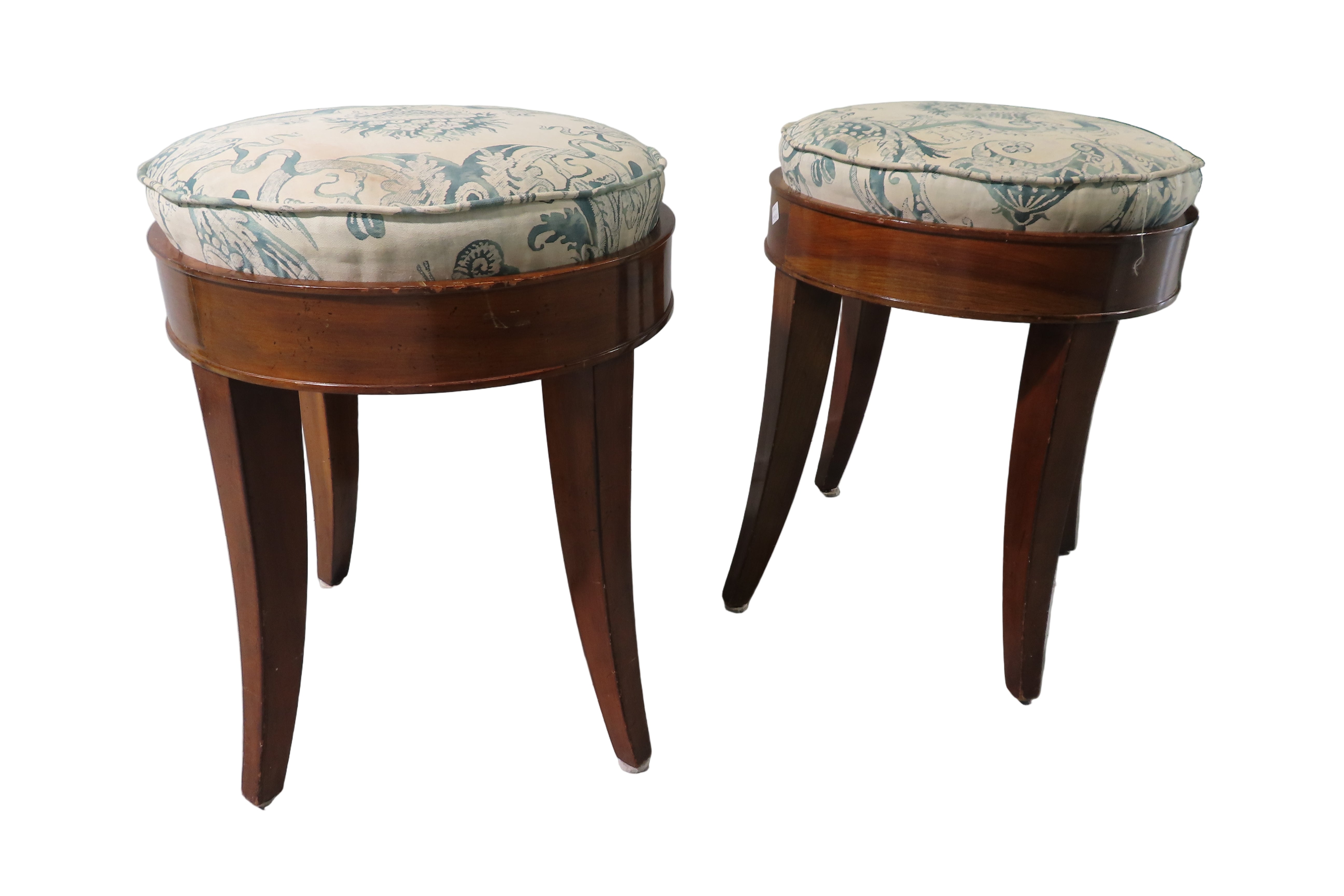Pair of super cute custom made dark wood stools. These stools were made out of dark wood and are pretty short, they're the type of stool you would use in front of a vanity desk or by a low counter. The seats are upholstered with a classic blue and white fabric and are easily removed.