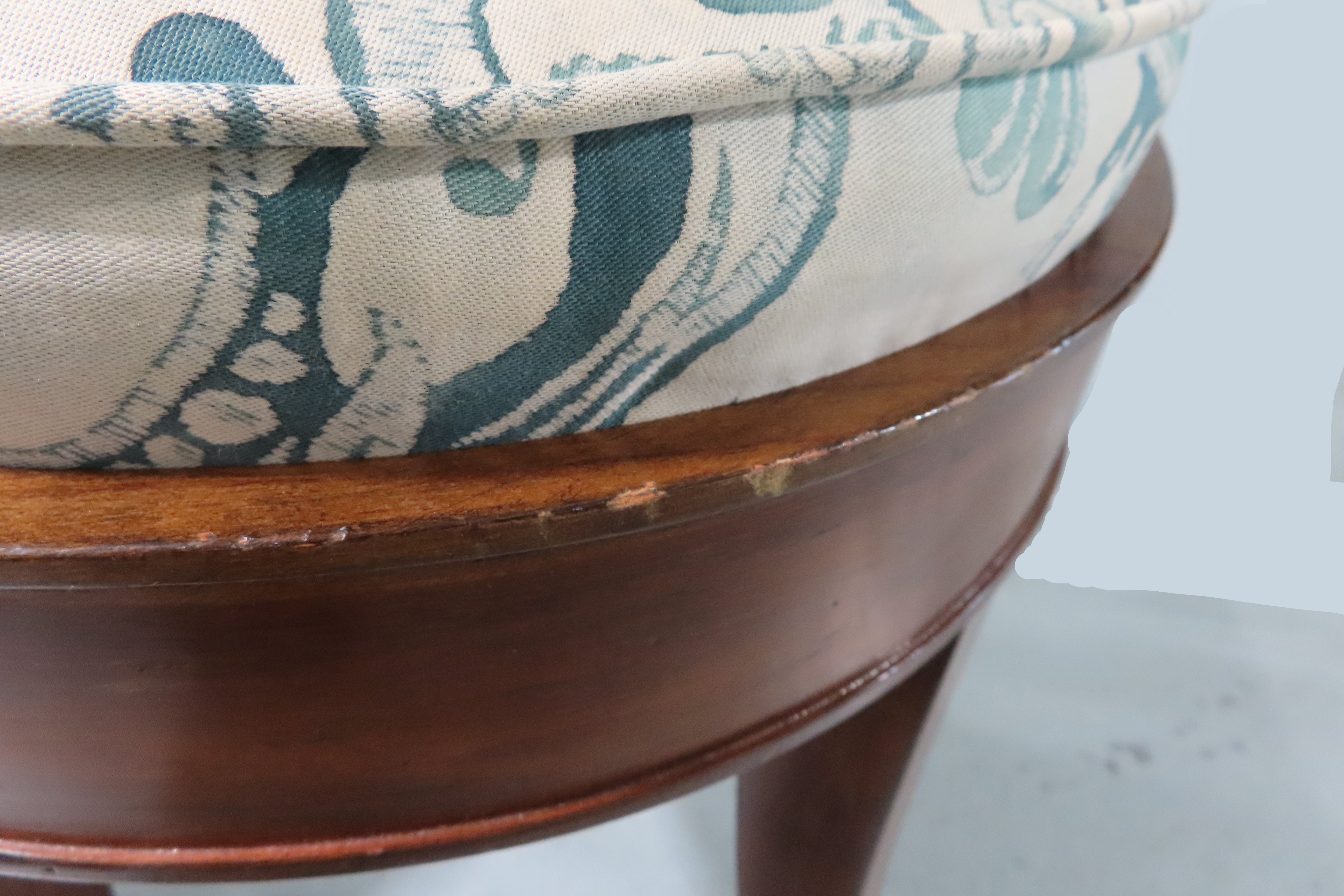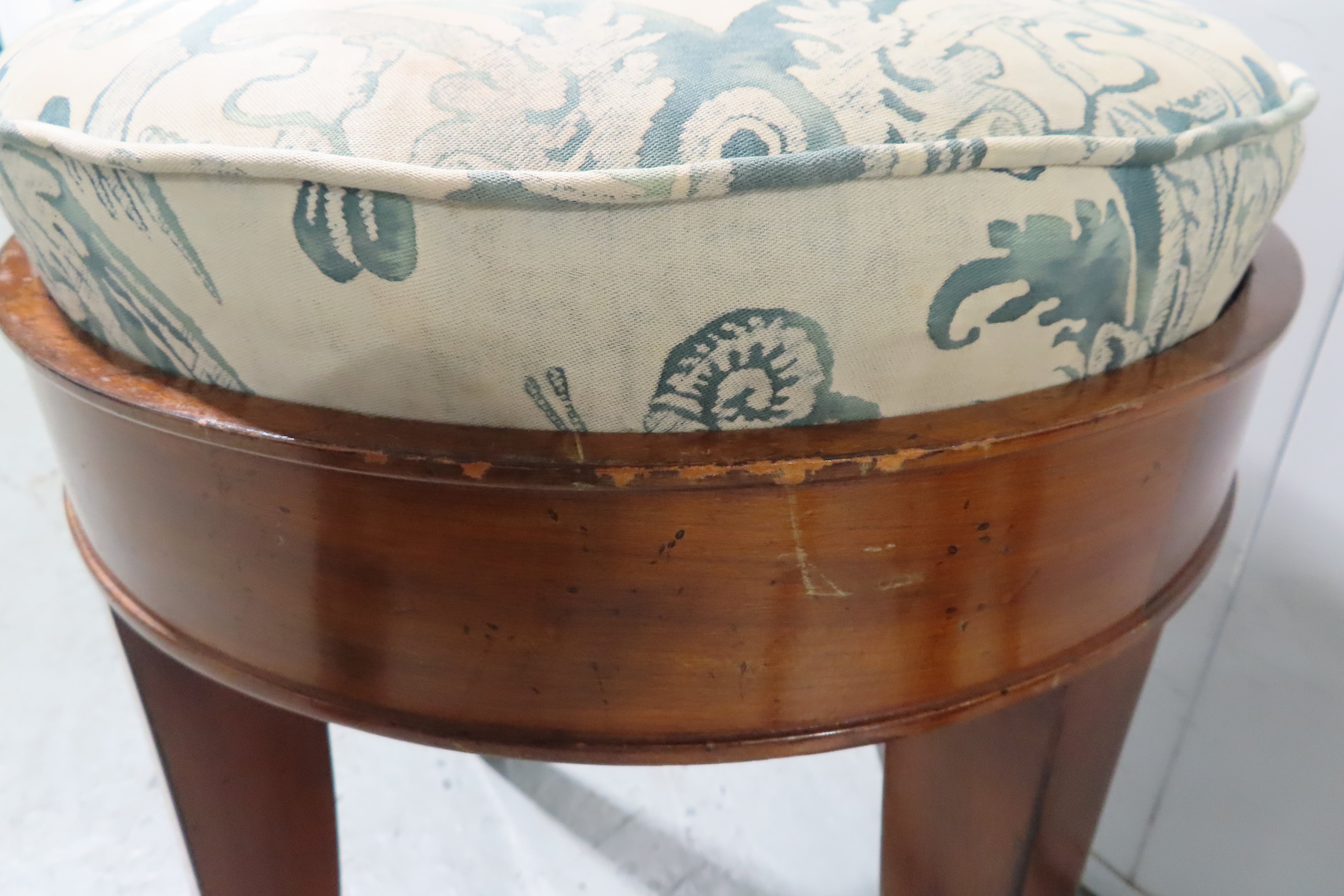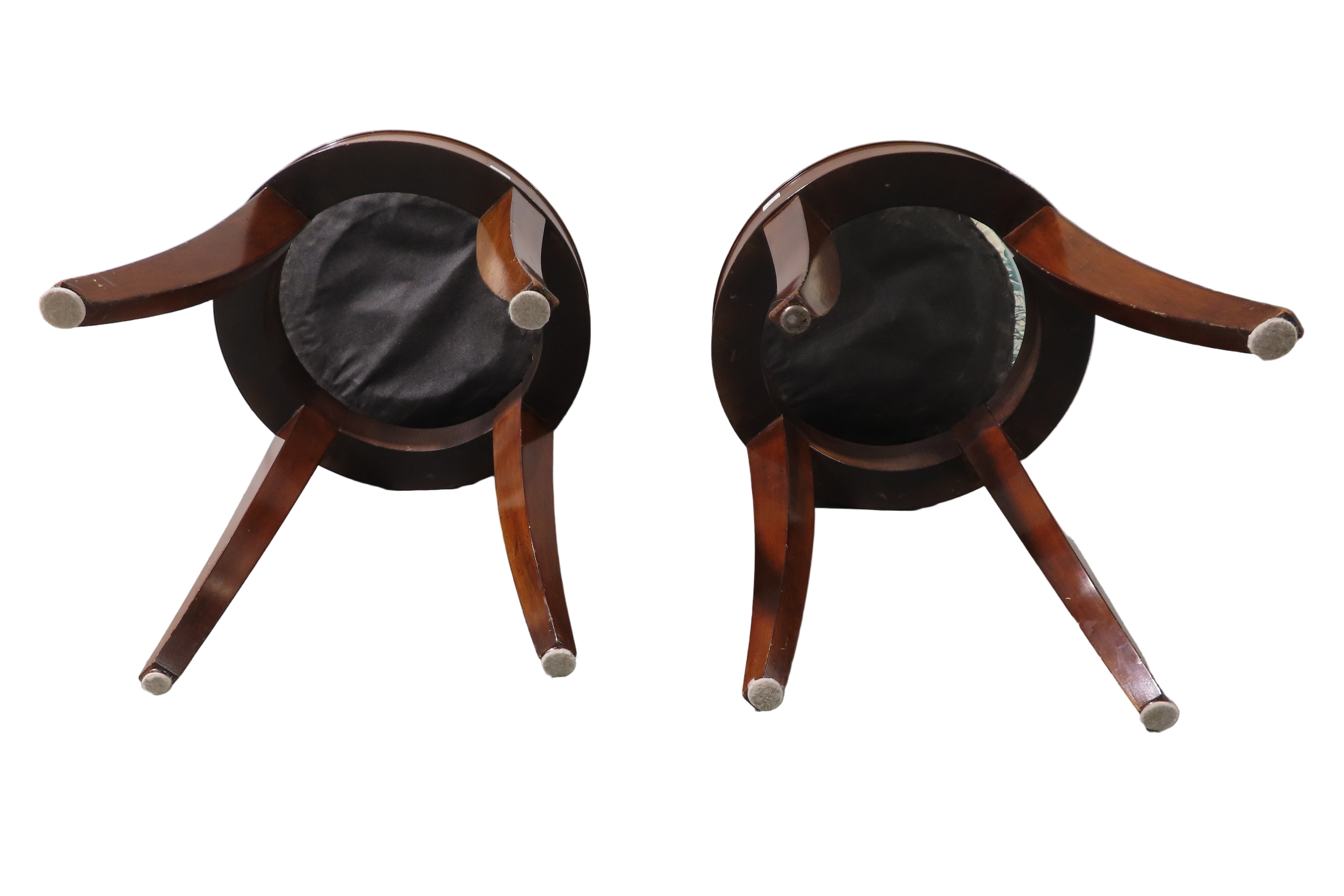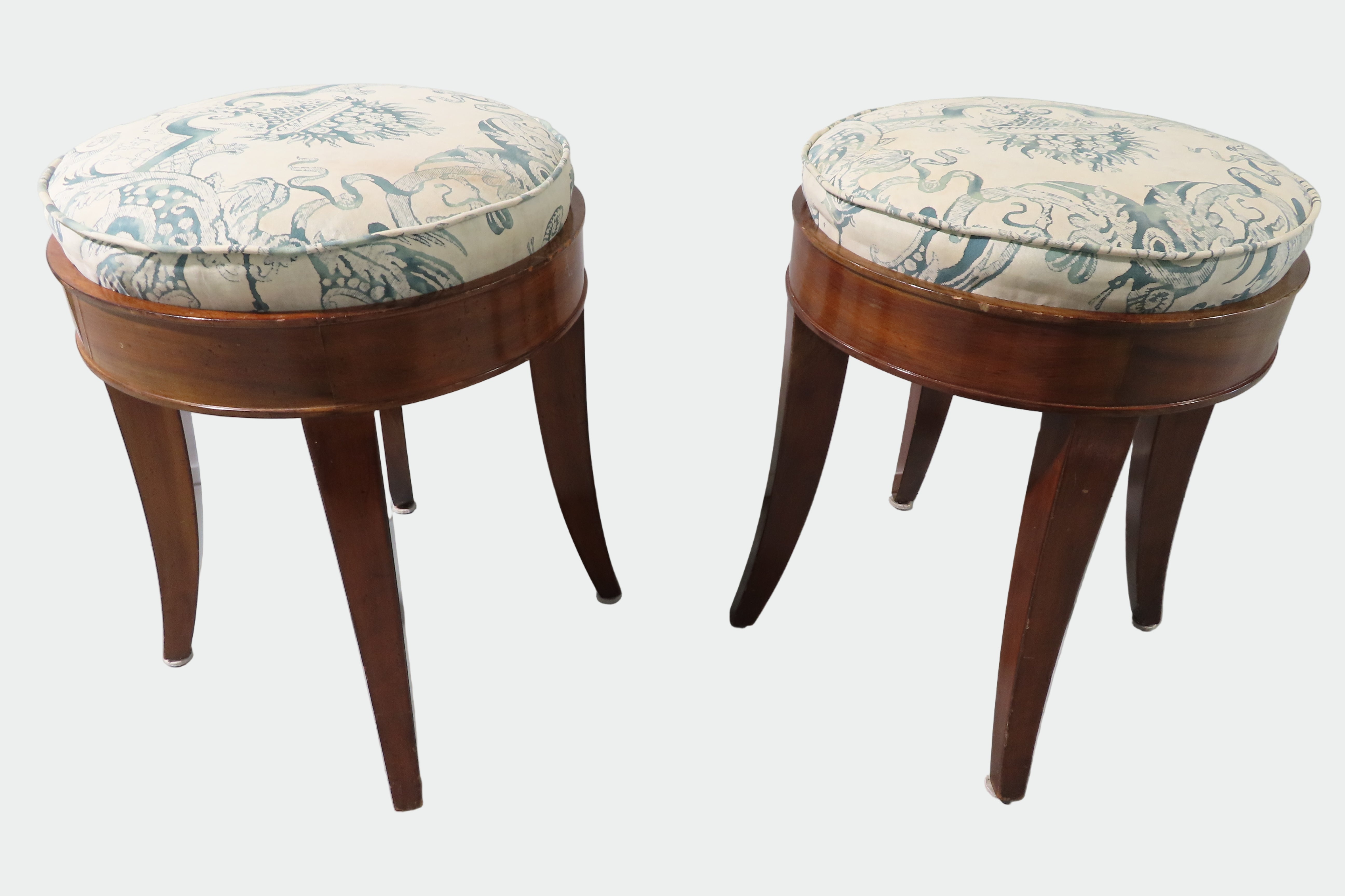 Pair of super cute custom made dark wood stools. These stools were made out of dark wood and are pretty short, they're the type of stool you would use in front of a vanity desk or by a low counter. The seats are upholstered with a classic blue and white fabric and are easily removed.