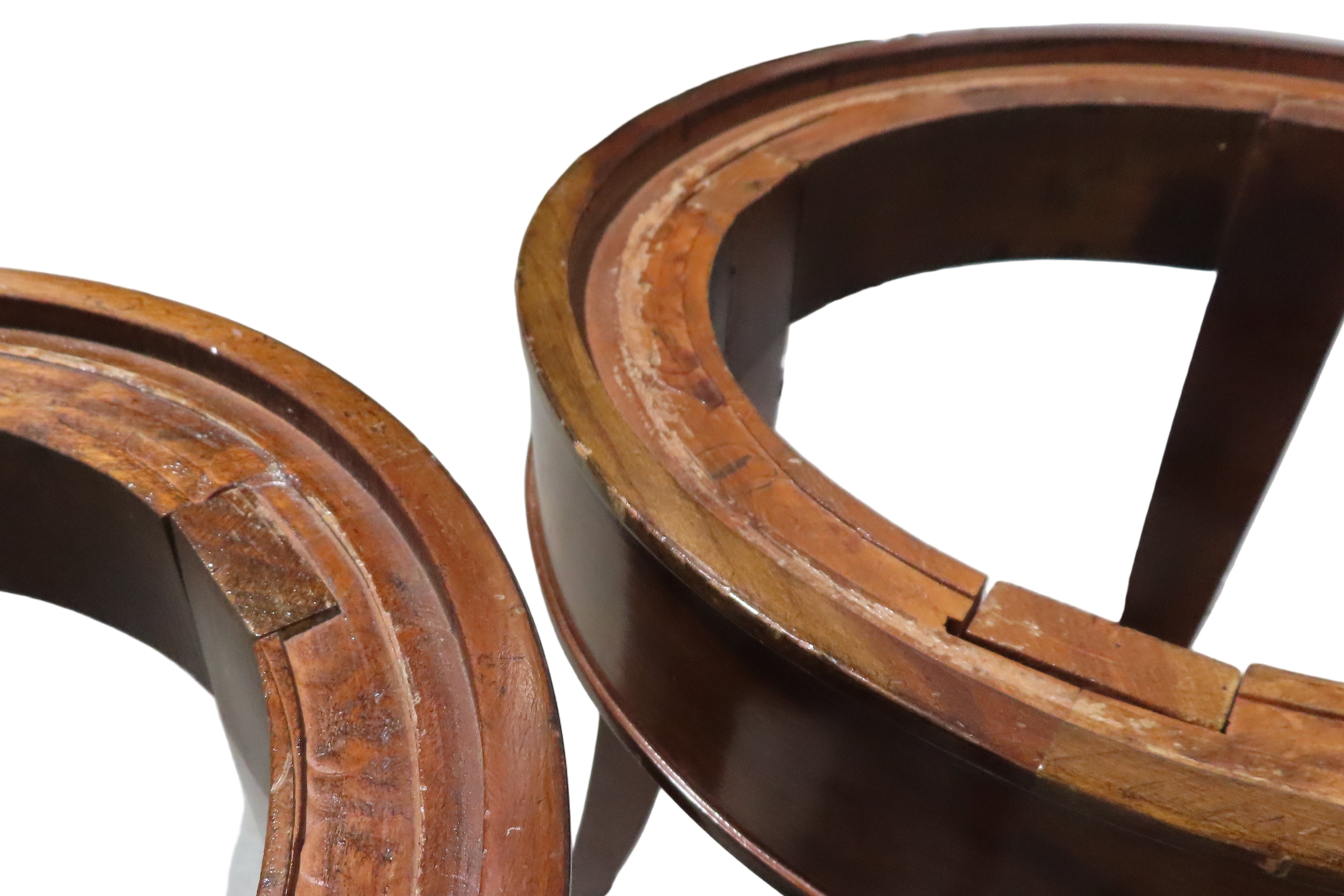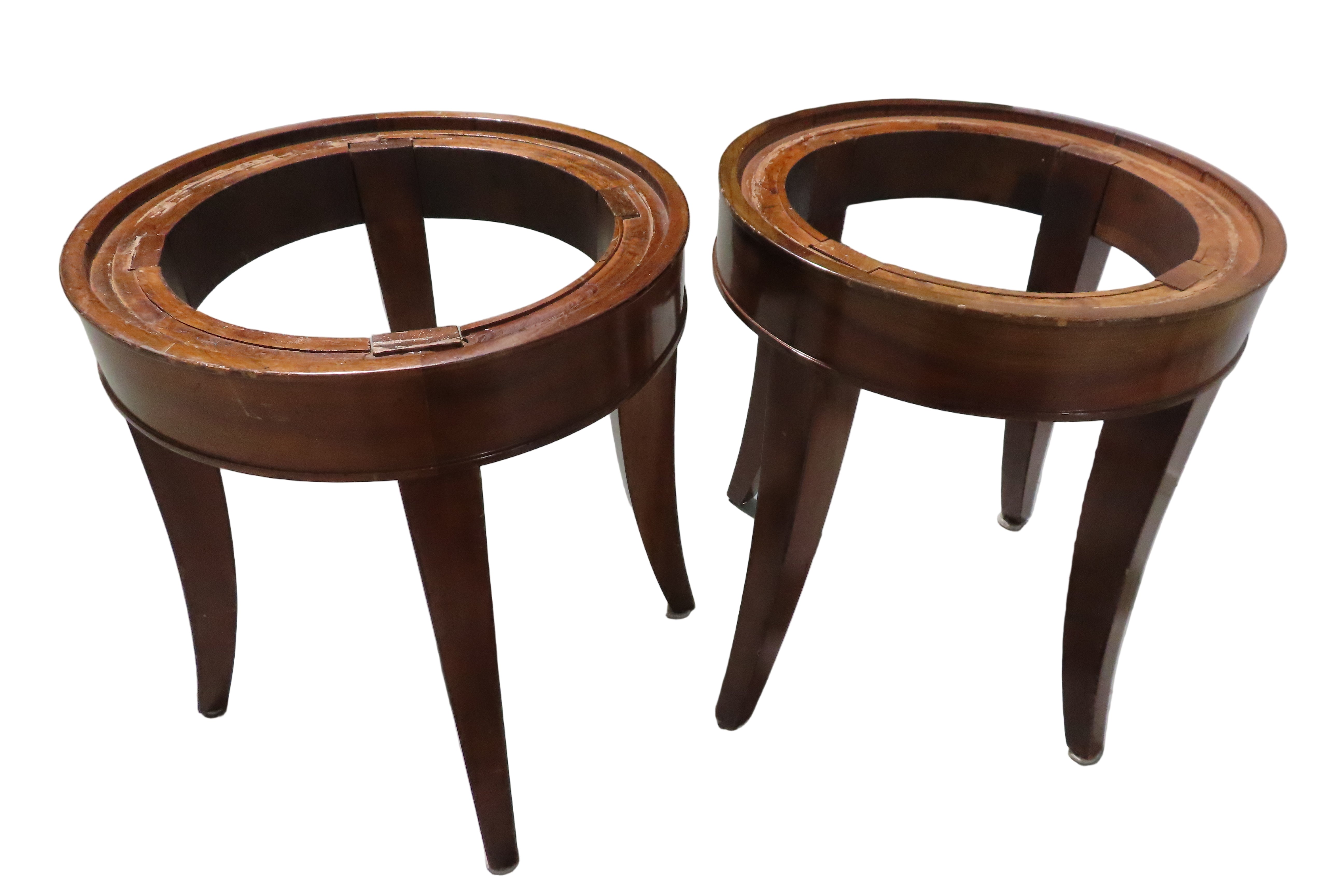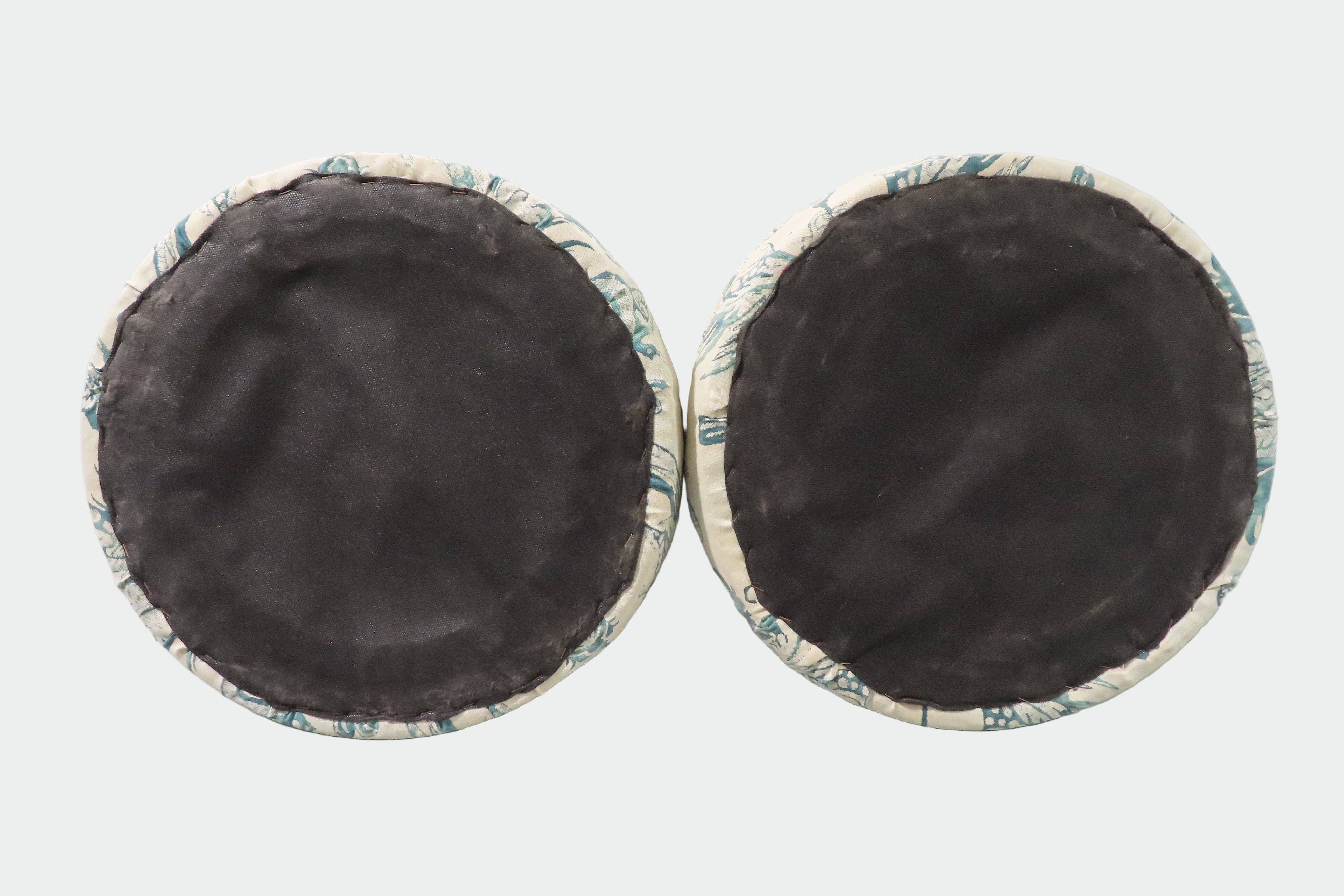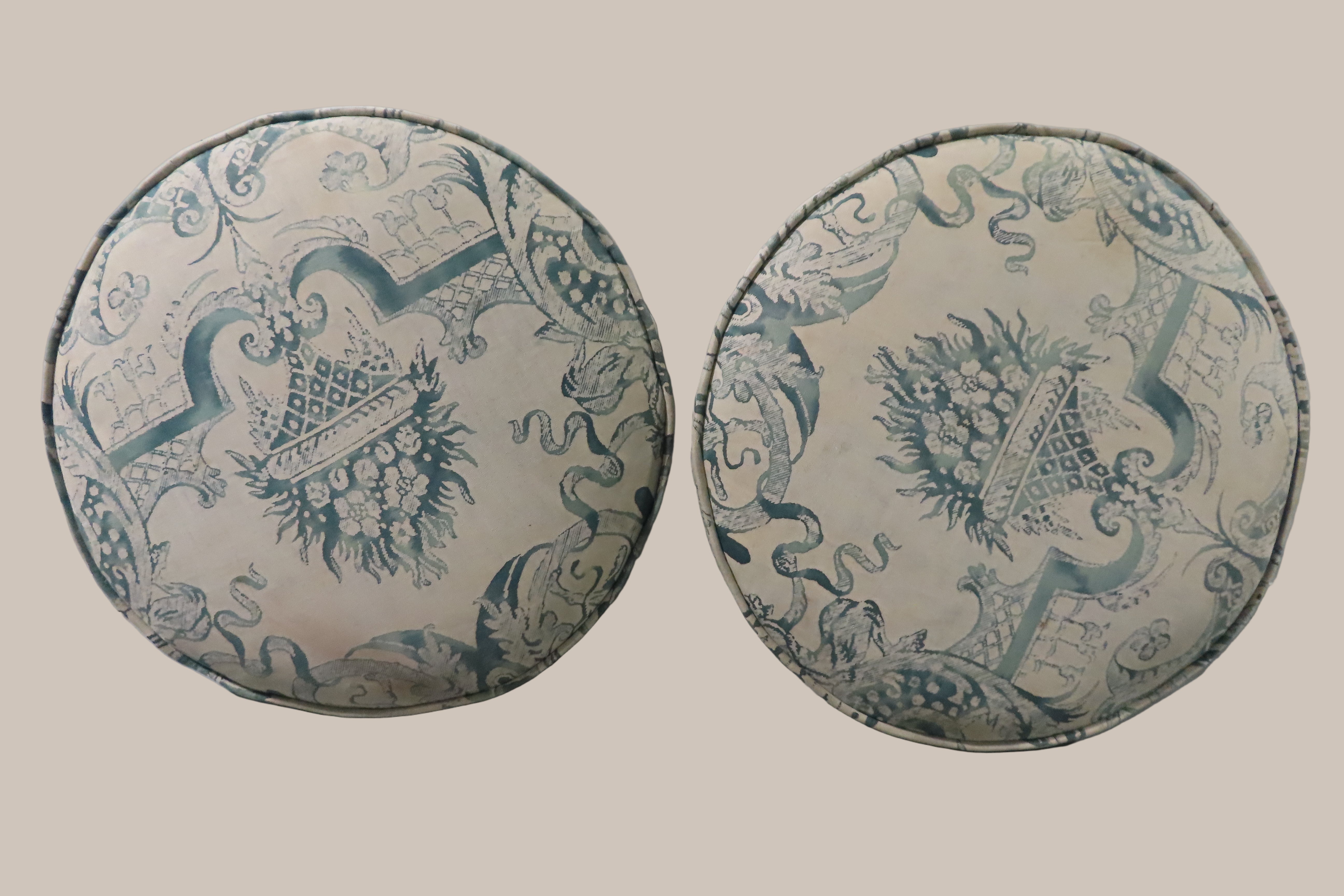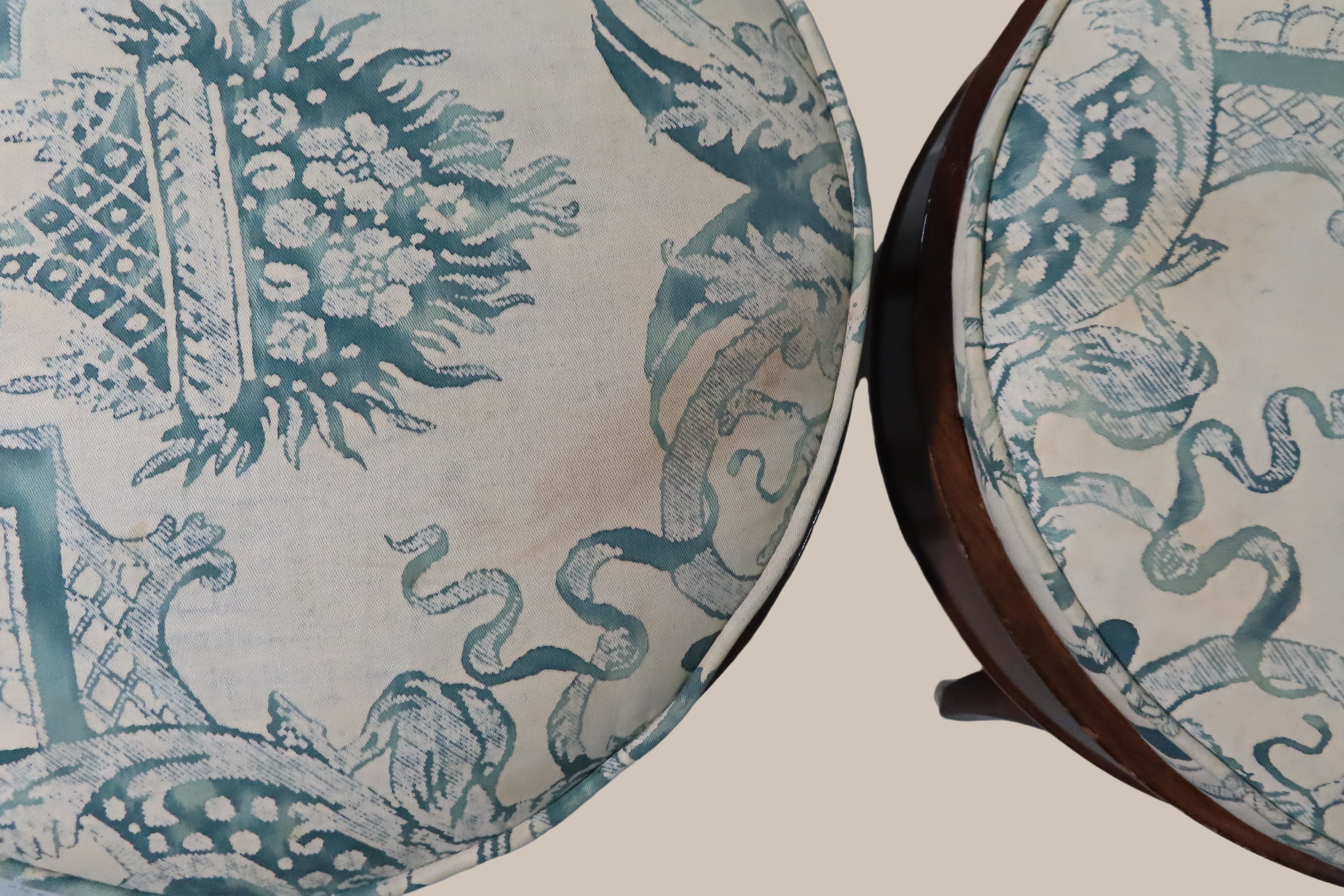 Pair of Custom Dark Wood Short Stools with Removable White & Blue Upholstery