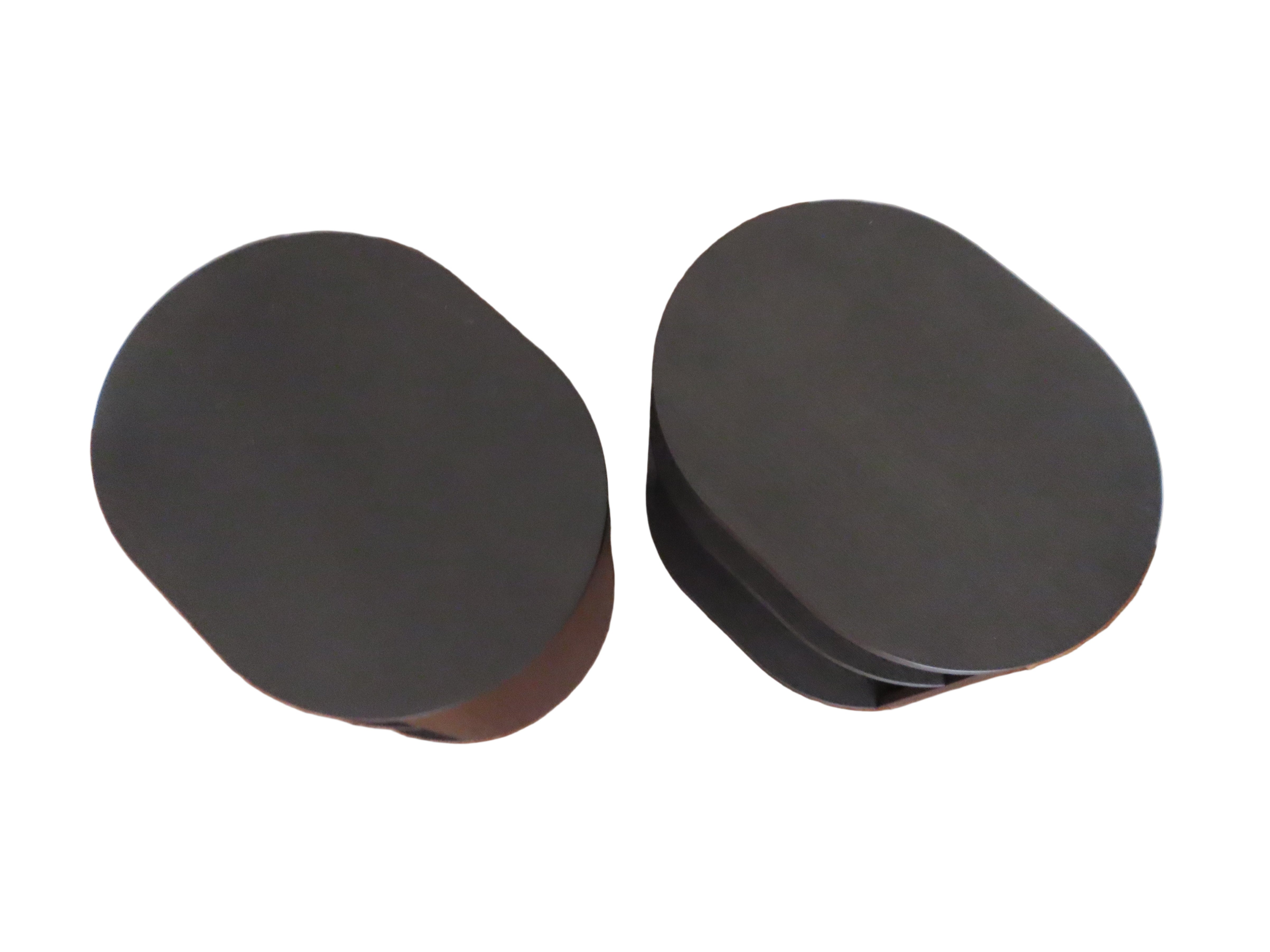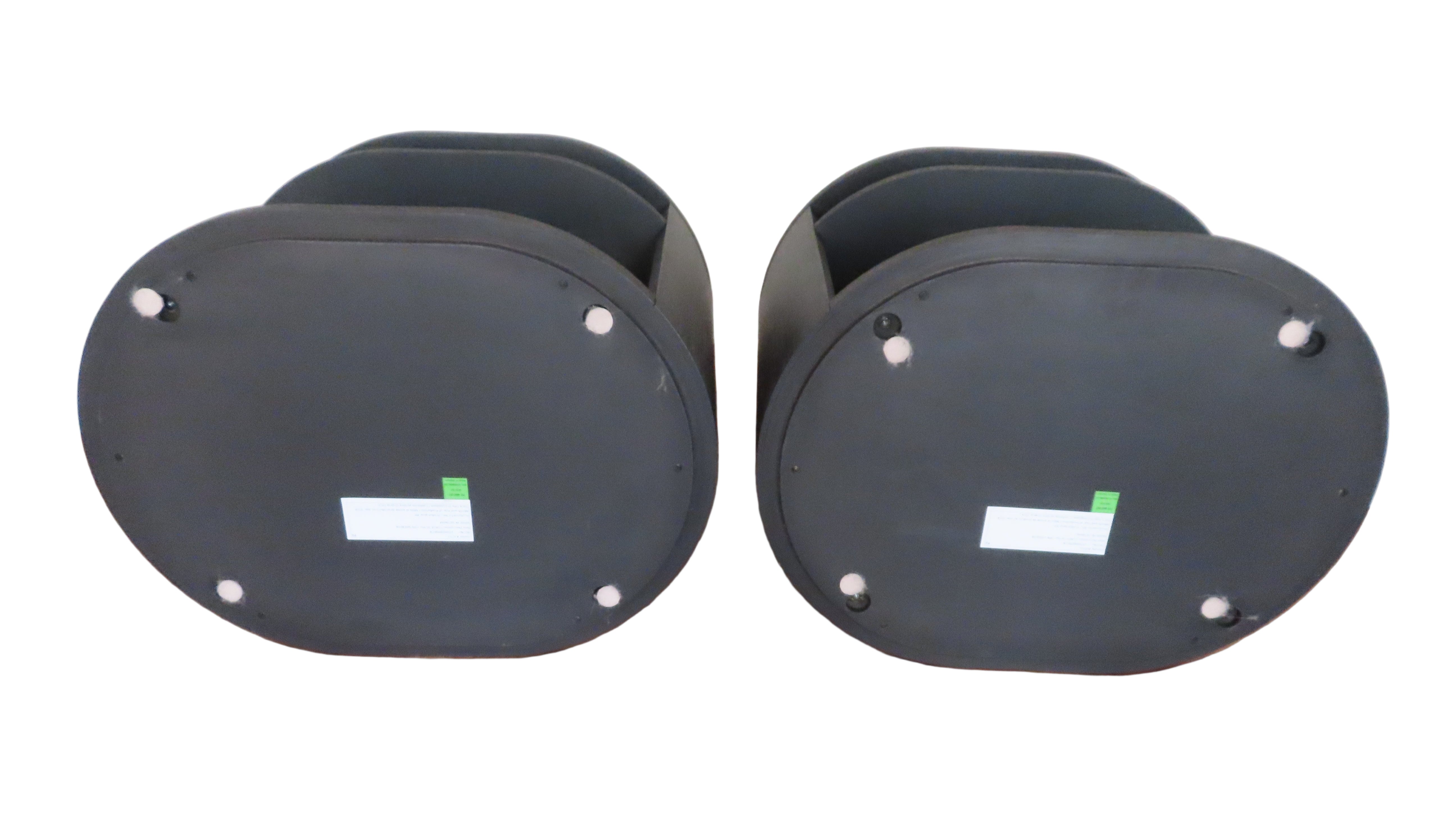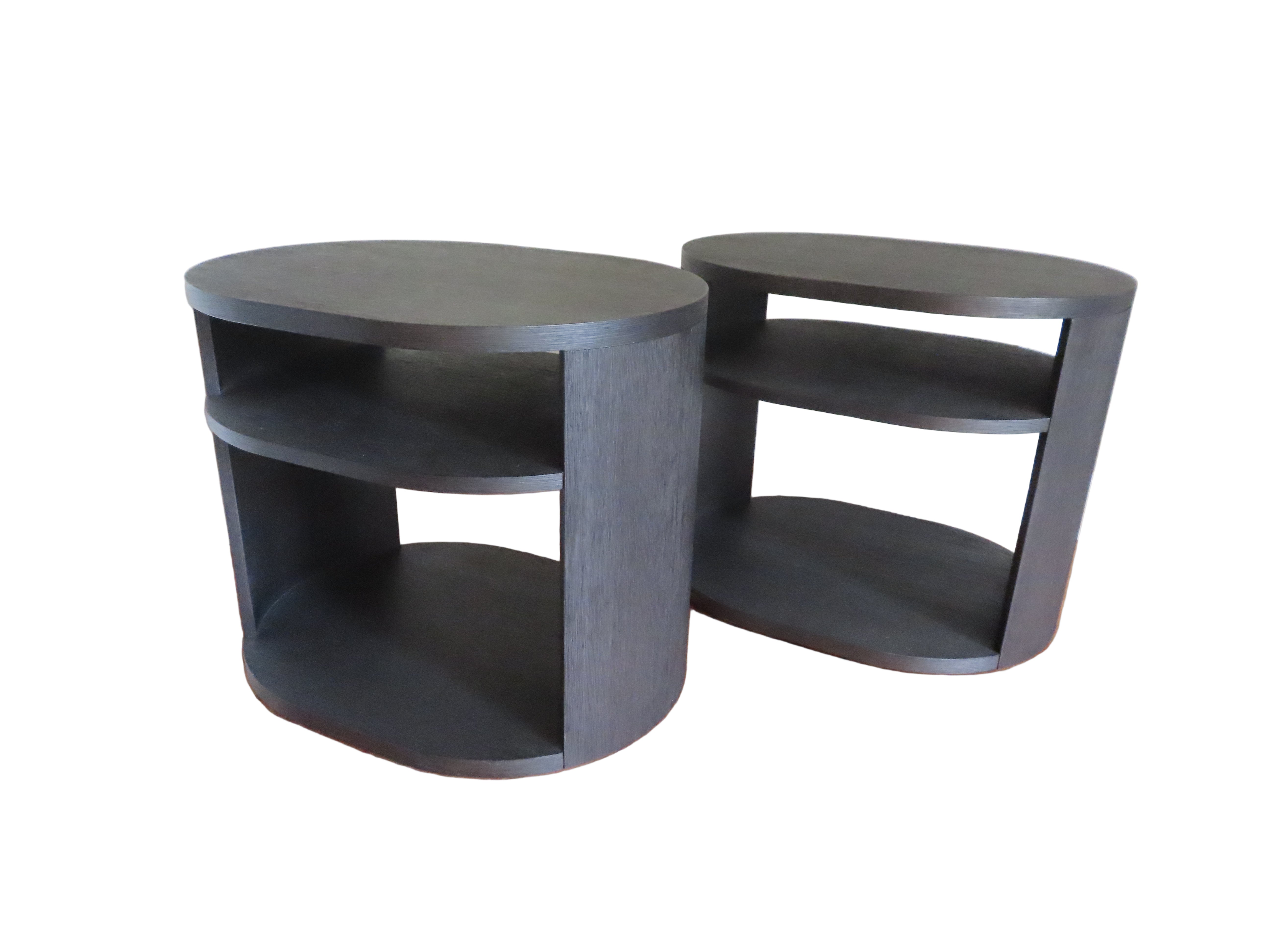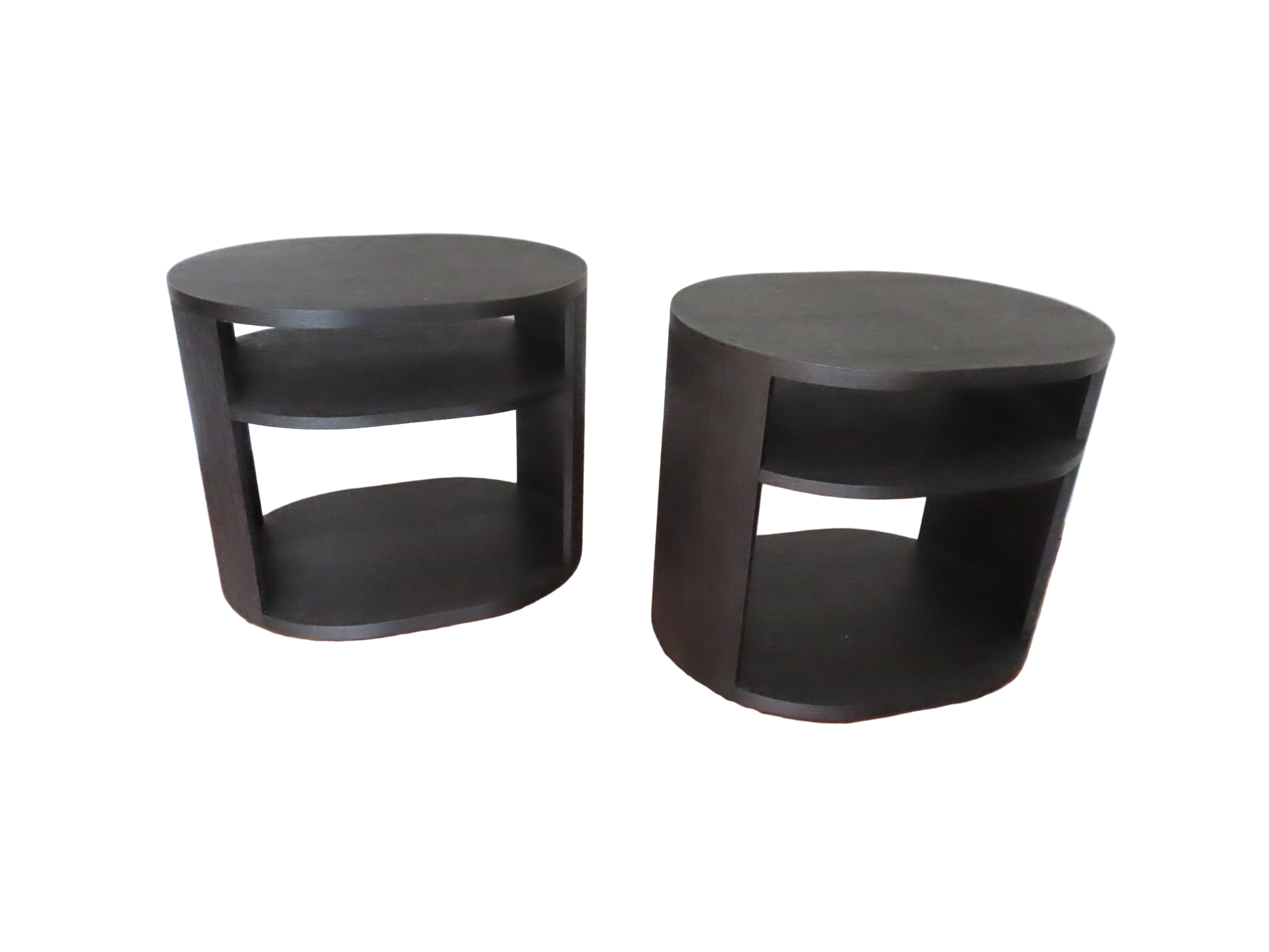 Modern pair of black oak side tables with open backs for easy cord organization. Oval shaped, with a shelf included.
