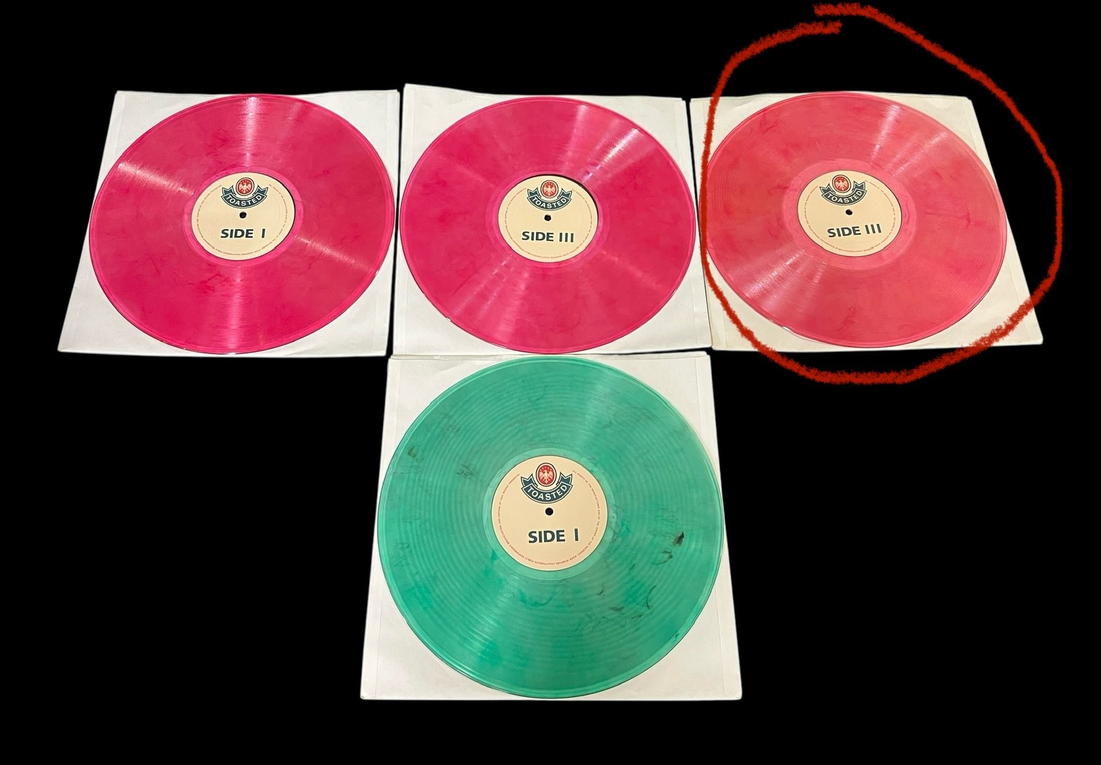 One of the records is bowl warped. I circled the specific record in red marker. The rest of the records are mint free from scratches and warps. Please zoom in on each photo taken.