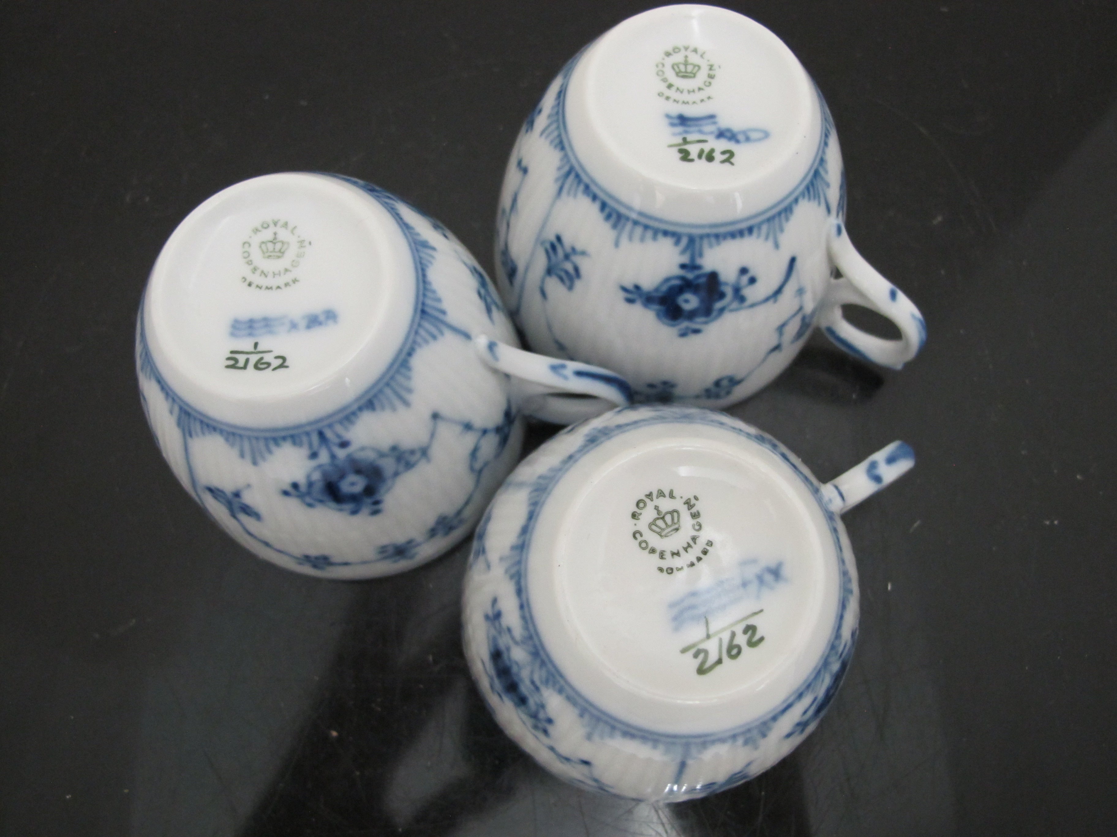 Vintage Royal Copenhagen Denmark, set of 3 plain blue fluted cups and saucers (6 pieces total), 2162. Each measures 3 3/4" x 3" x 2 1/2" tall. Excellent condition, no chips, cracks, or repairs. Hallmarks at base.