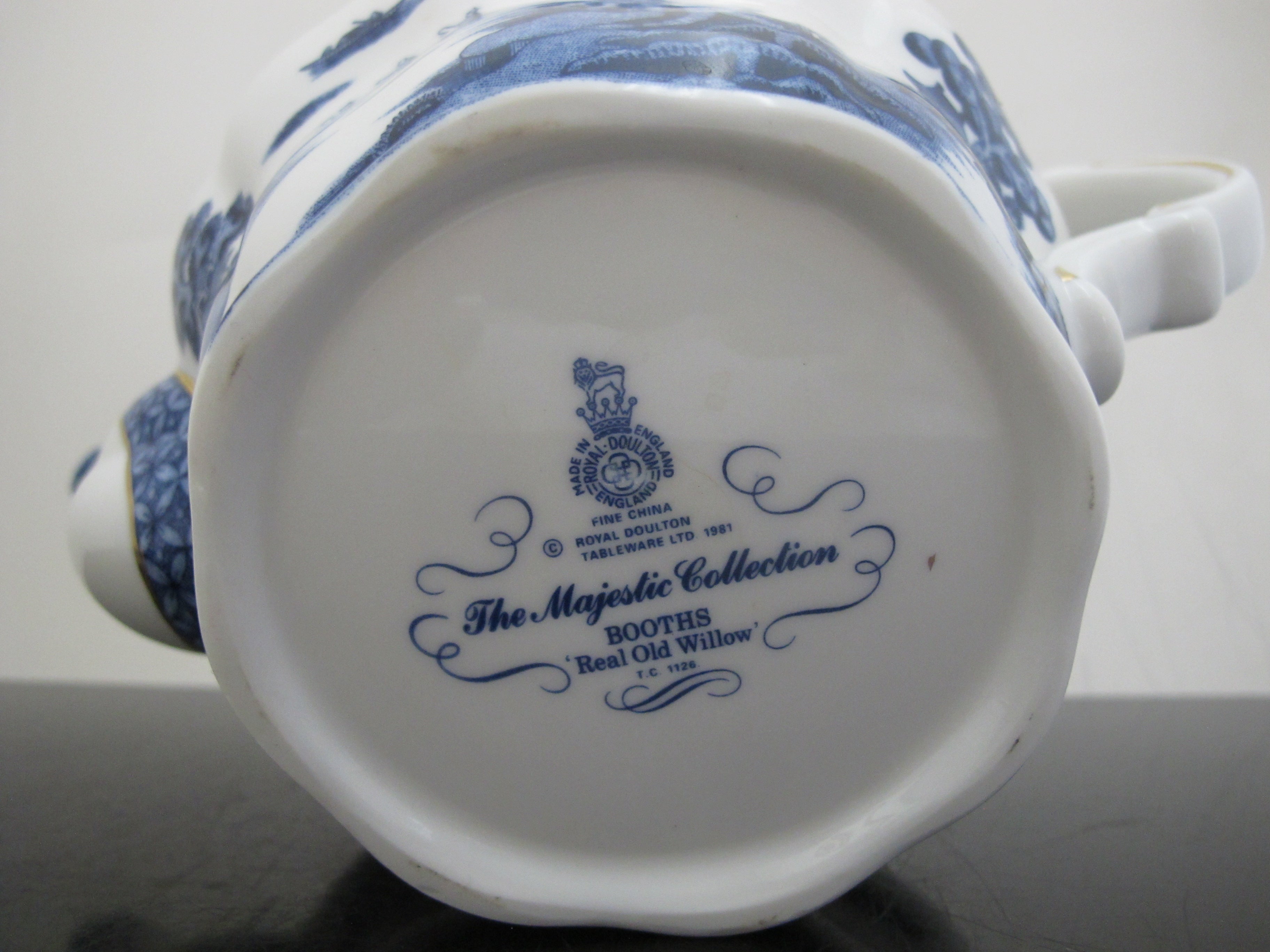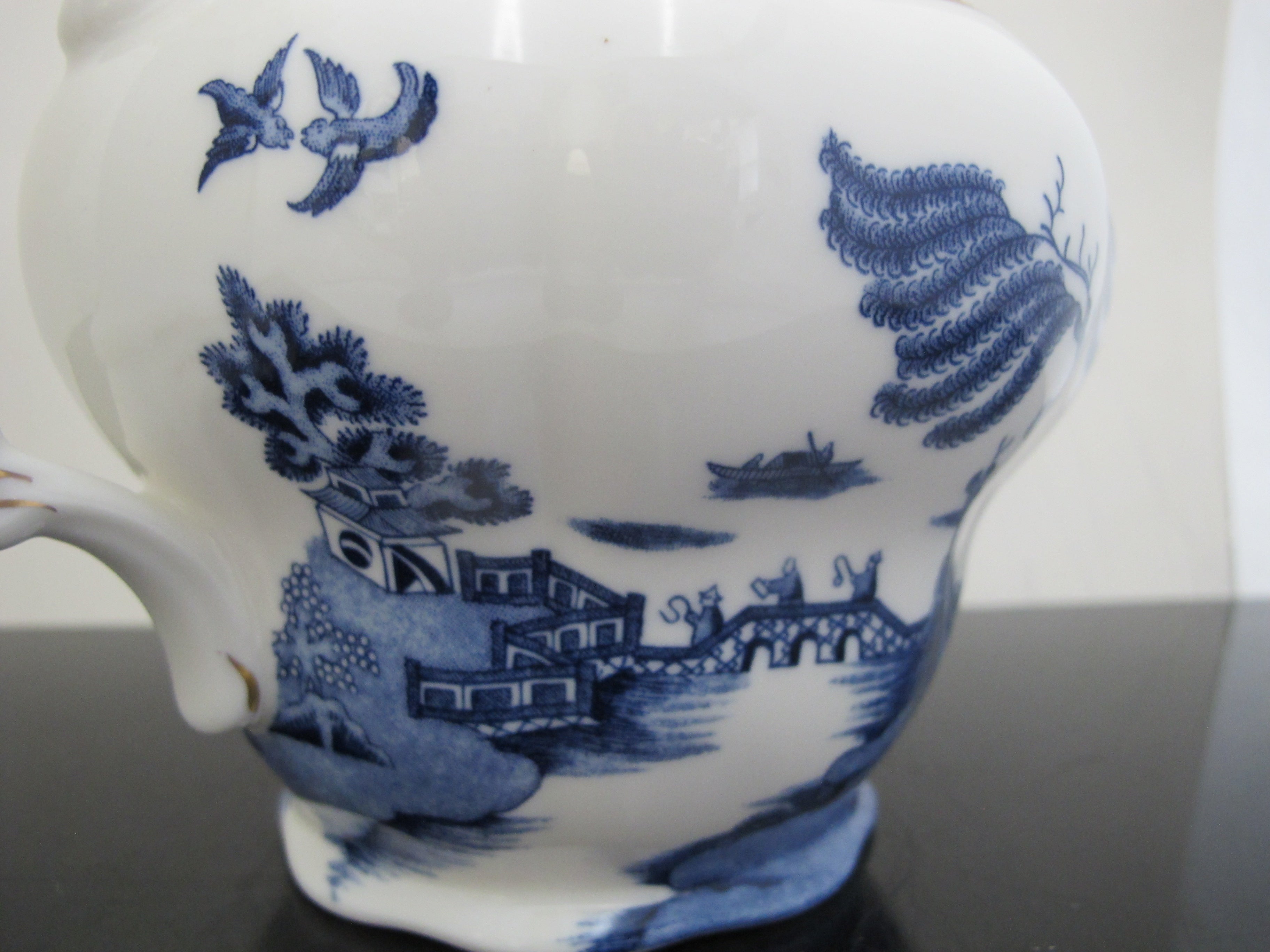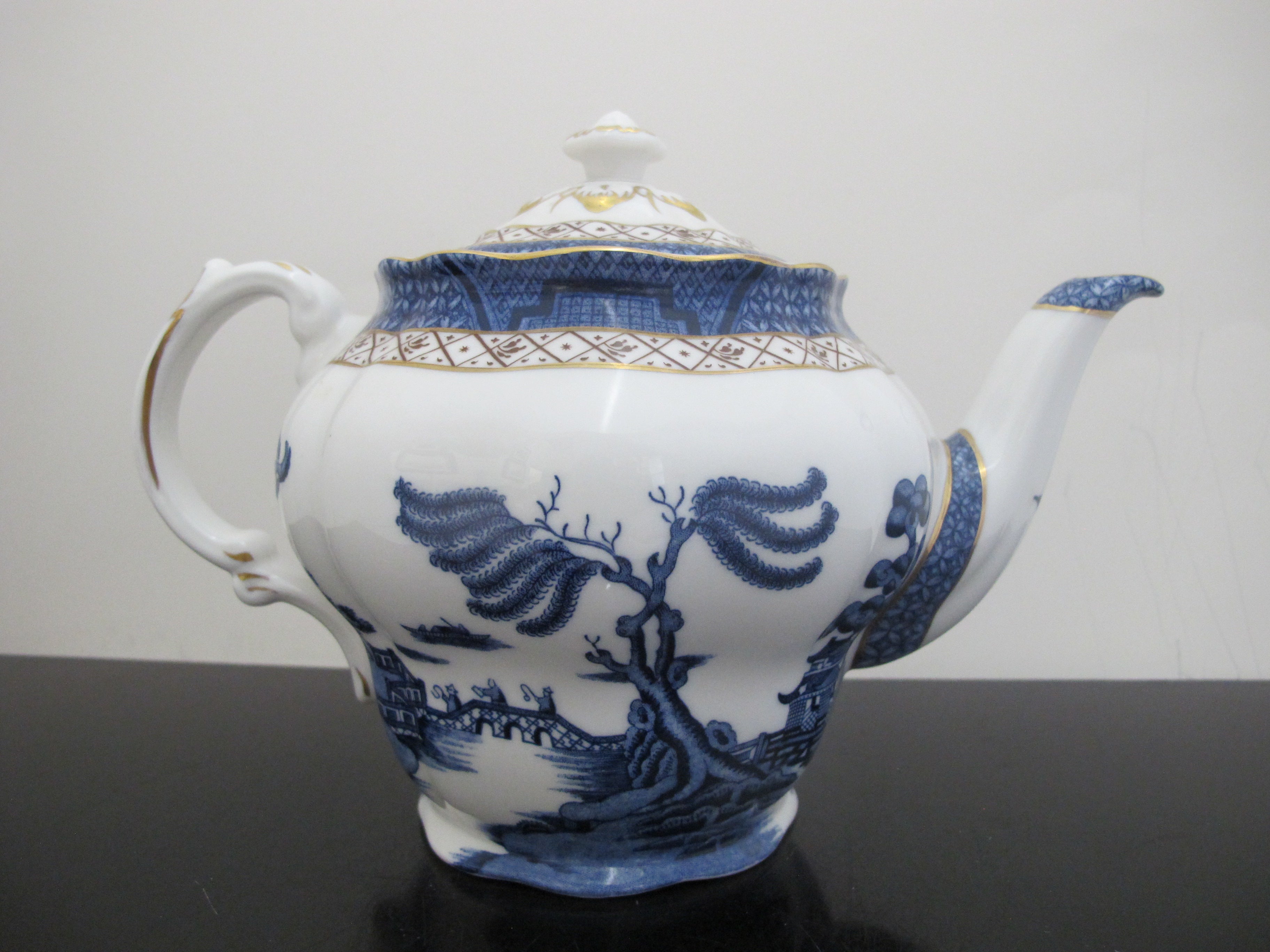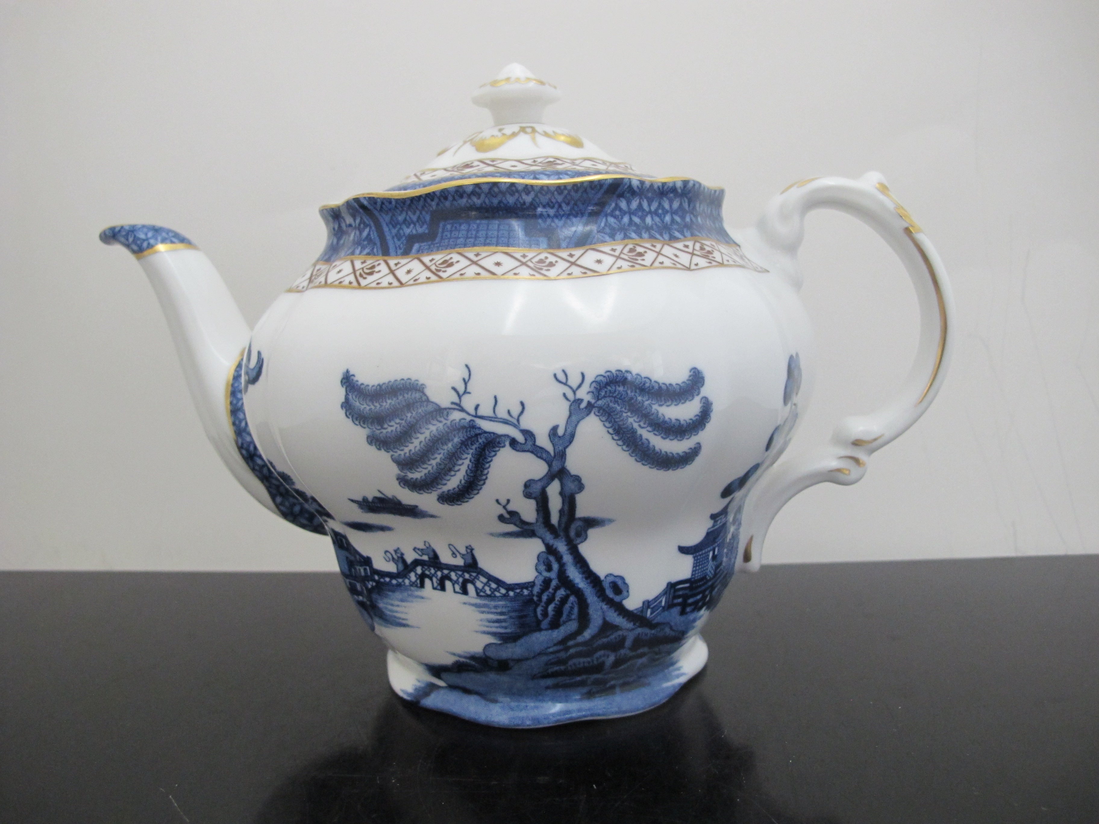 Elegant fine China Booths 'Real Old Willow' teapot from the Majestic Collection. Ornate blue village and landscape design with gold accents. Made in England. Measures 5 1/2" x 9 1/2" x 7" tall. Excellent condition, no chips, cracks, or repairs.