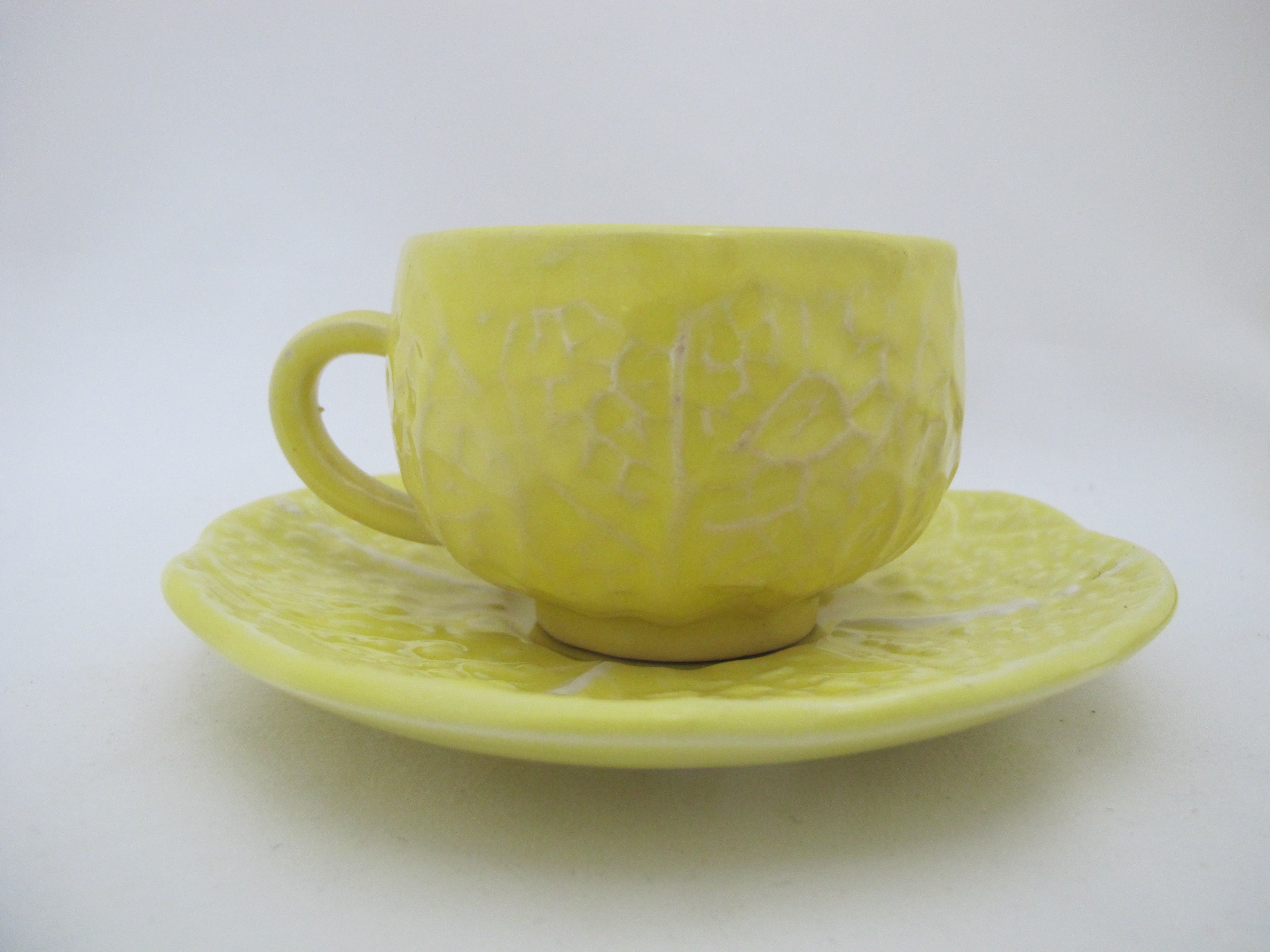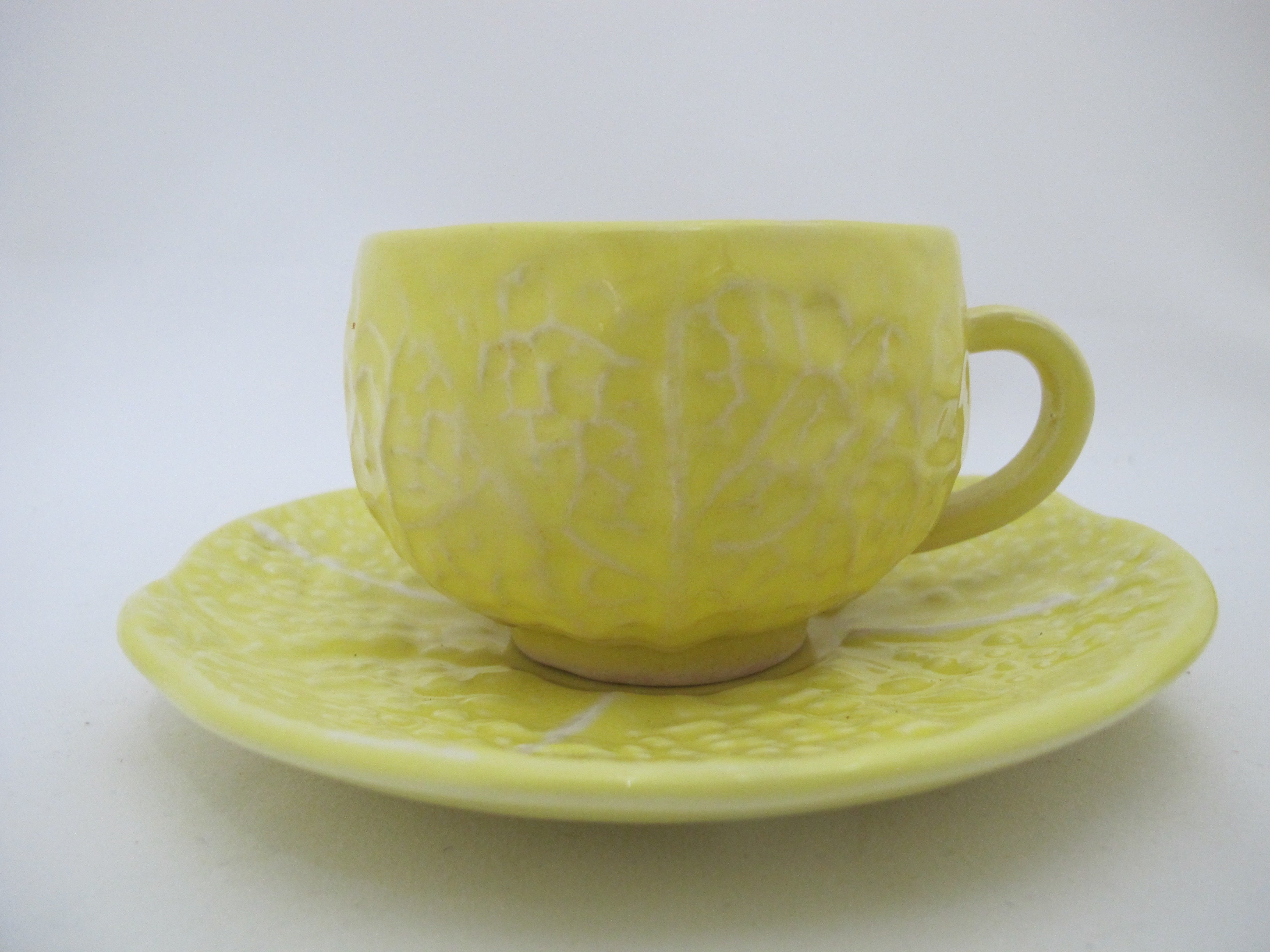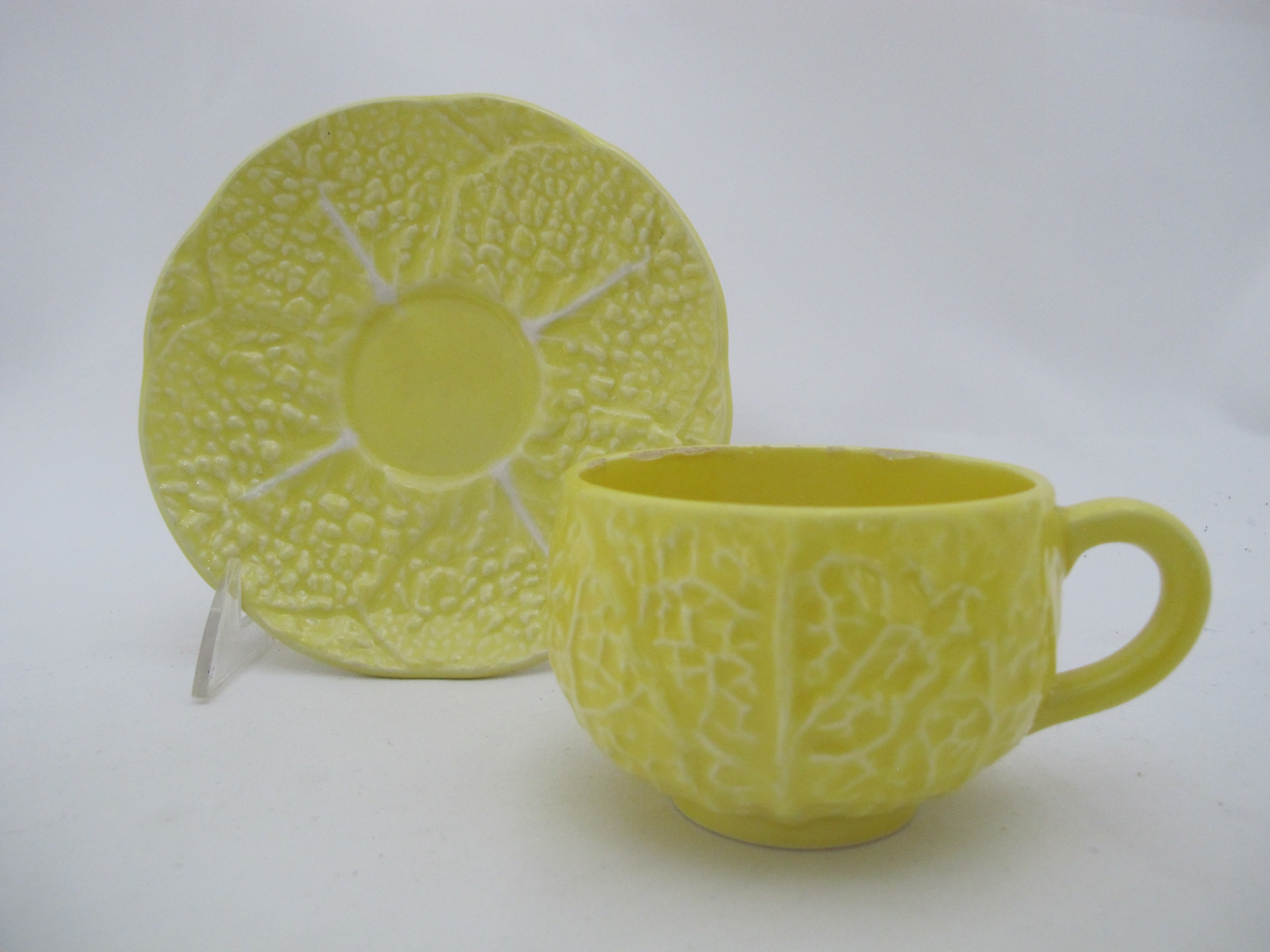 Secla, Made in Portugal, fun set of mid century majolica cabbage leaf cups and saucers. Brightly hand painted in yellow, each cup measures 4 3/4" x 3 1/2" x 2 1/2" tall, saucer measures 6". Very good condition, the inner lip of one cup has some wear to glaze, as photographed. No major chips, cracks, or repairs, minor crazing.