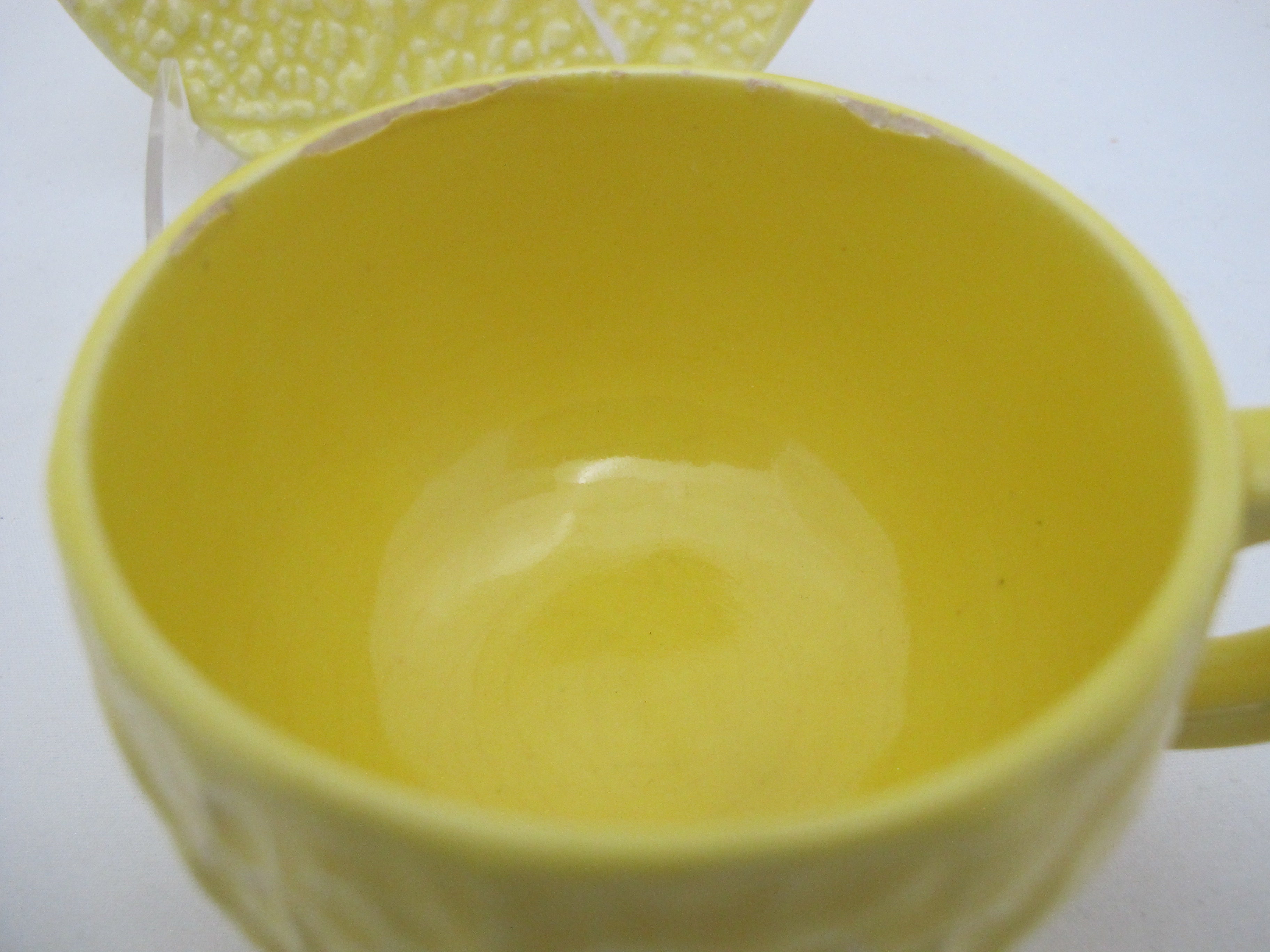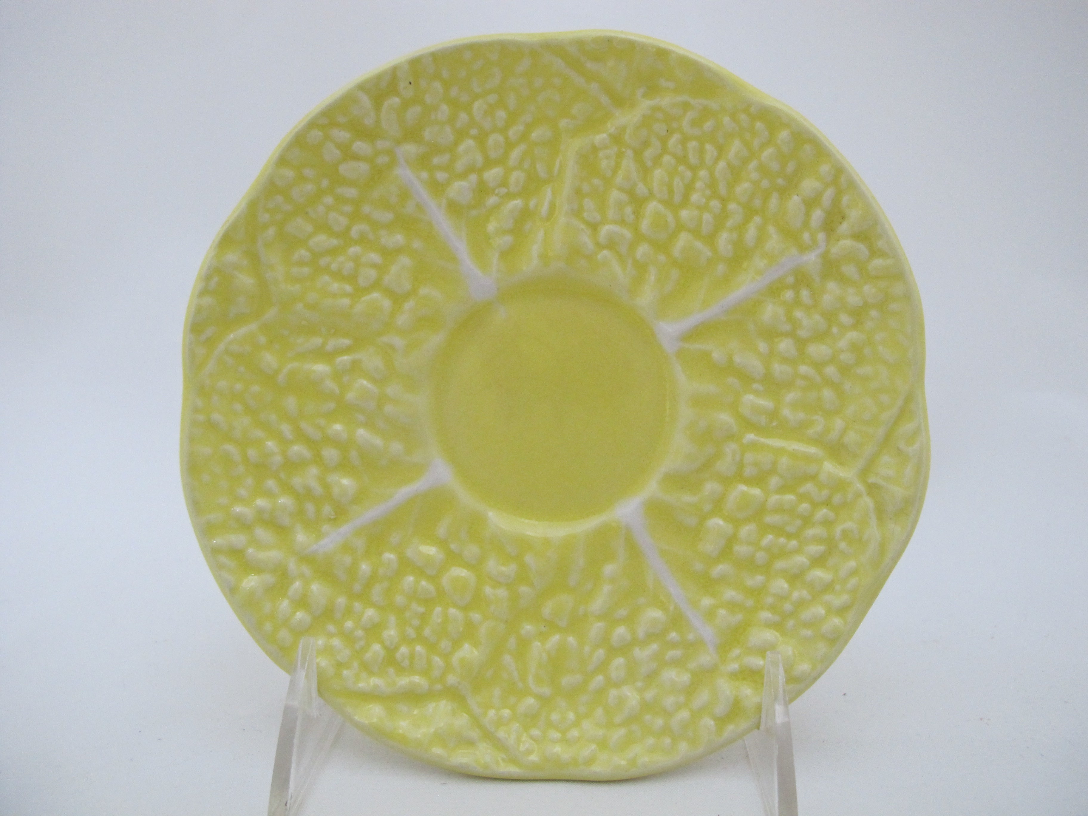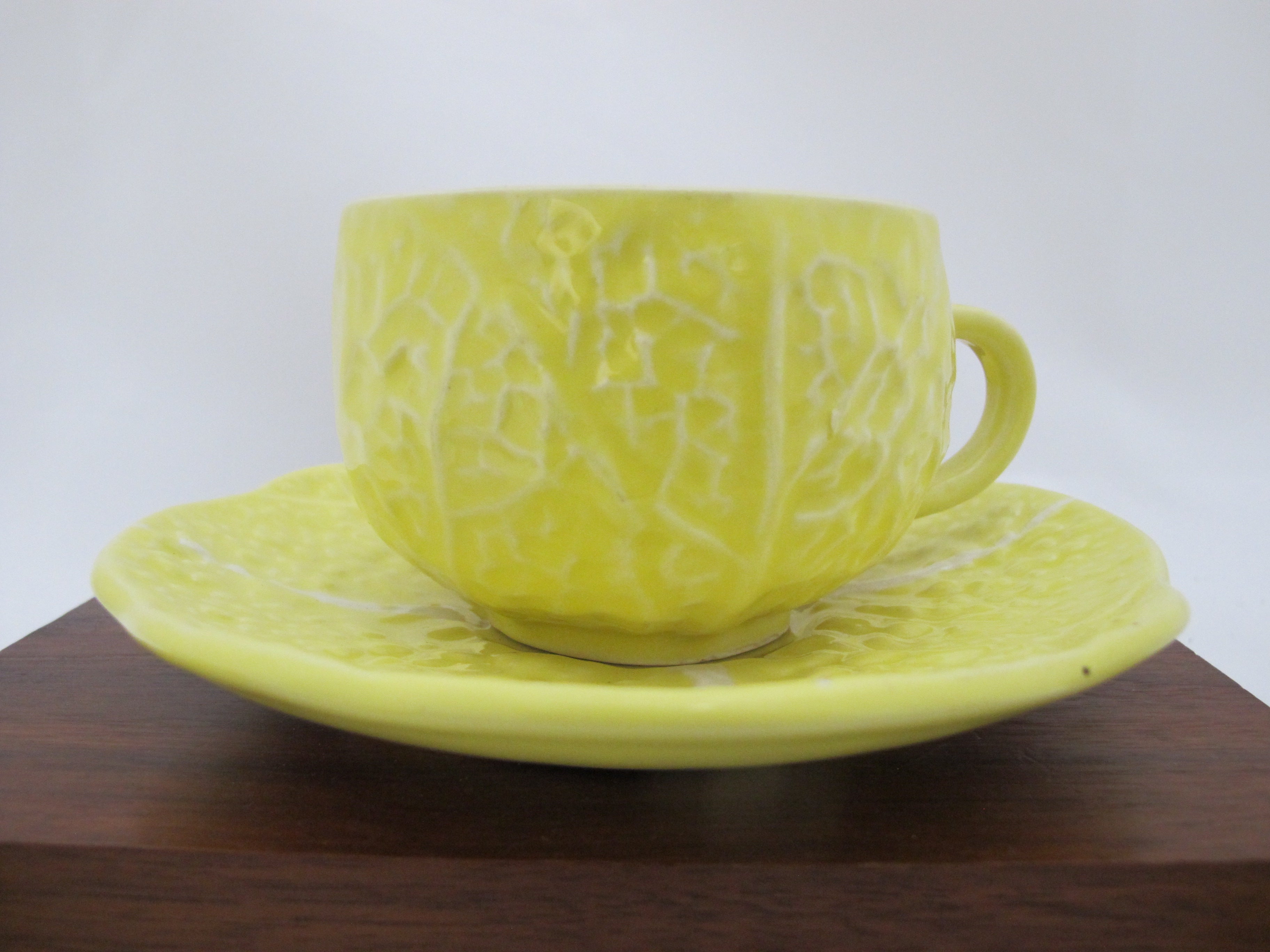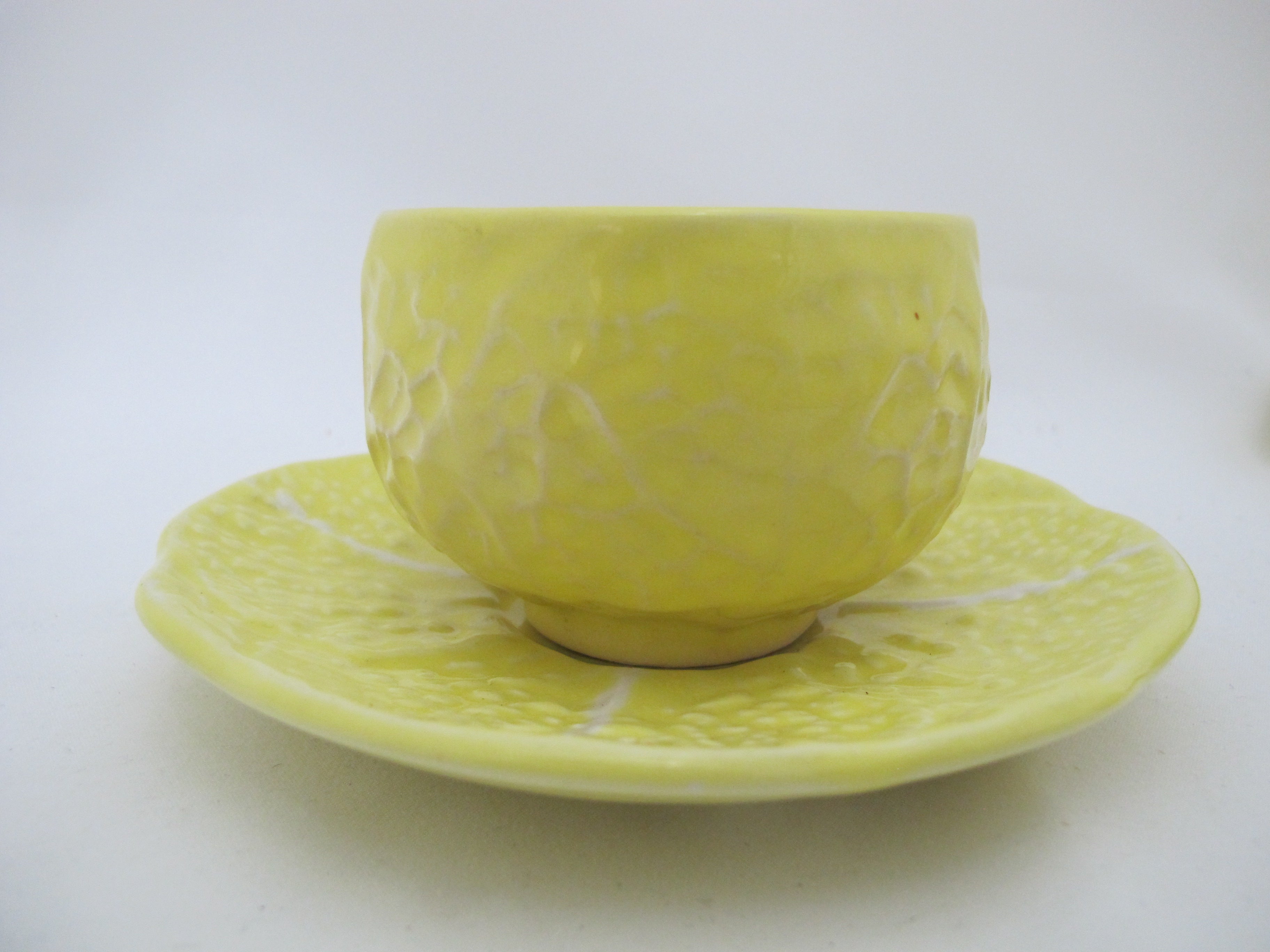 Secla, Made in Portugal, fun set of mid century majolica cabbage leaf cups and saucers. Brightly hand painted in yellow, each cup measures 4 3/4" x 3 1/2" x 2 1/2" tall, saucer measures 6". Very good condition, the inner lip of one cup has some wear to glaze, as photographed. No major chips, cracks, or repairs, minor crazing.
