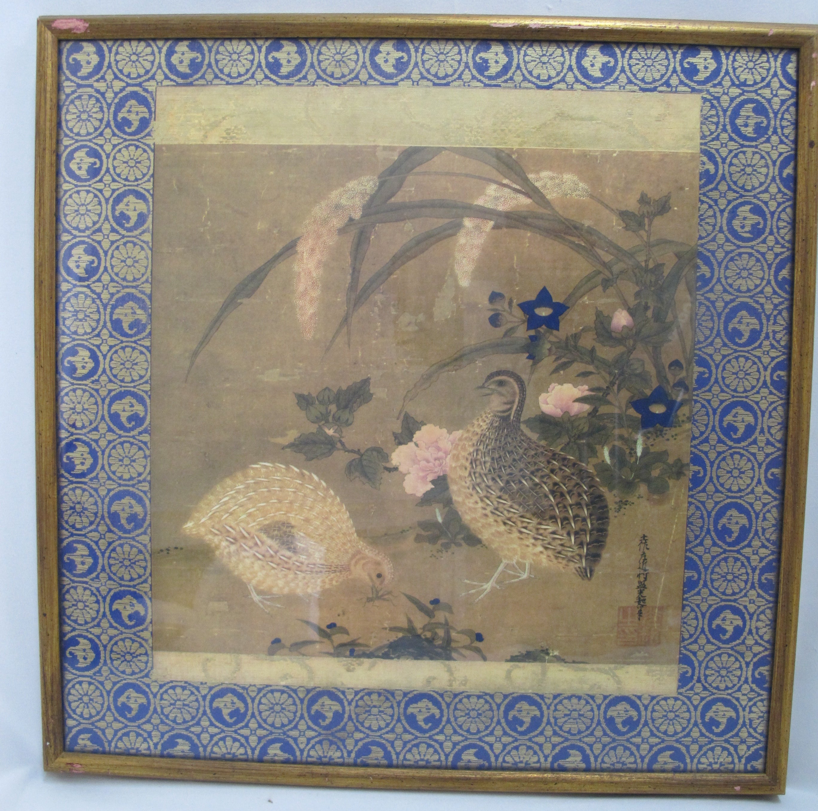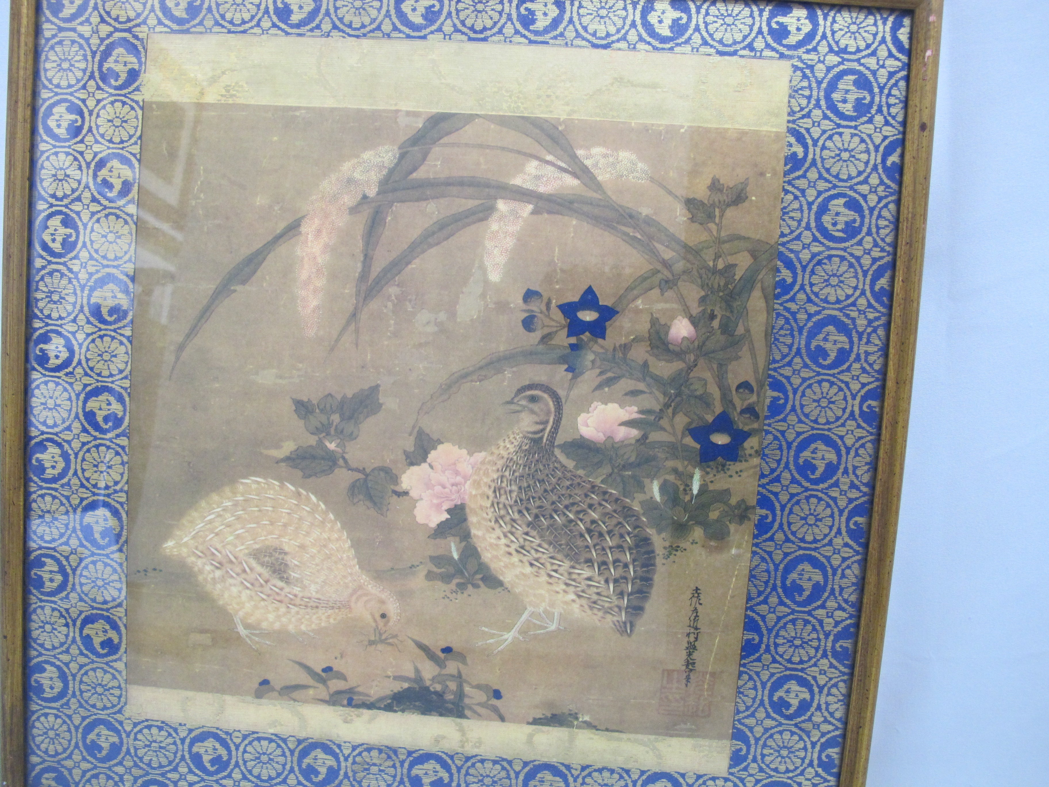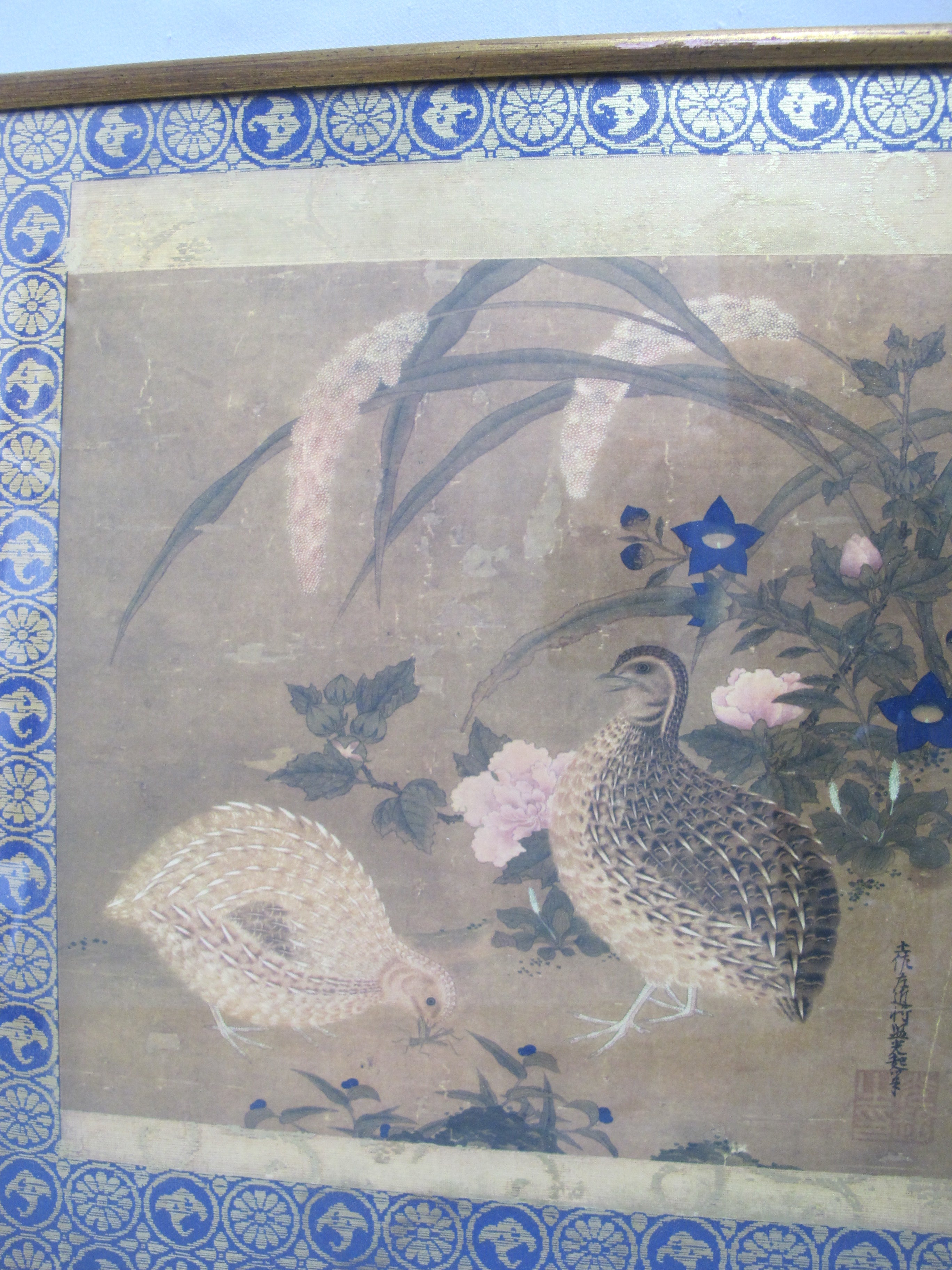 Tosa Mitsuoki (Japanese, 1617 - 1691), "Quail and Autumn Flowers" Ink and Colors on Silk textile, framed under glass. Signed and red seal bottom right-hand corner.