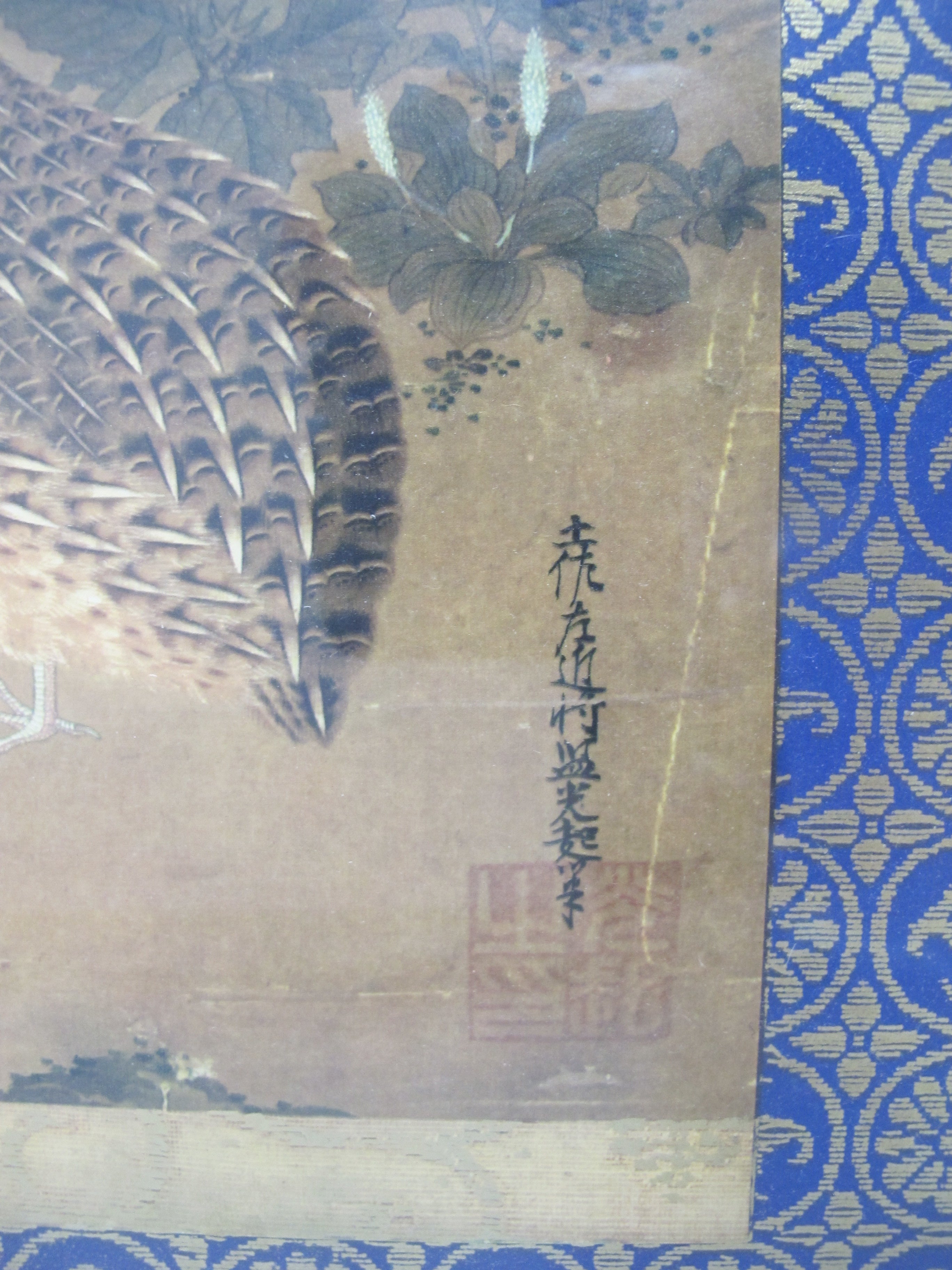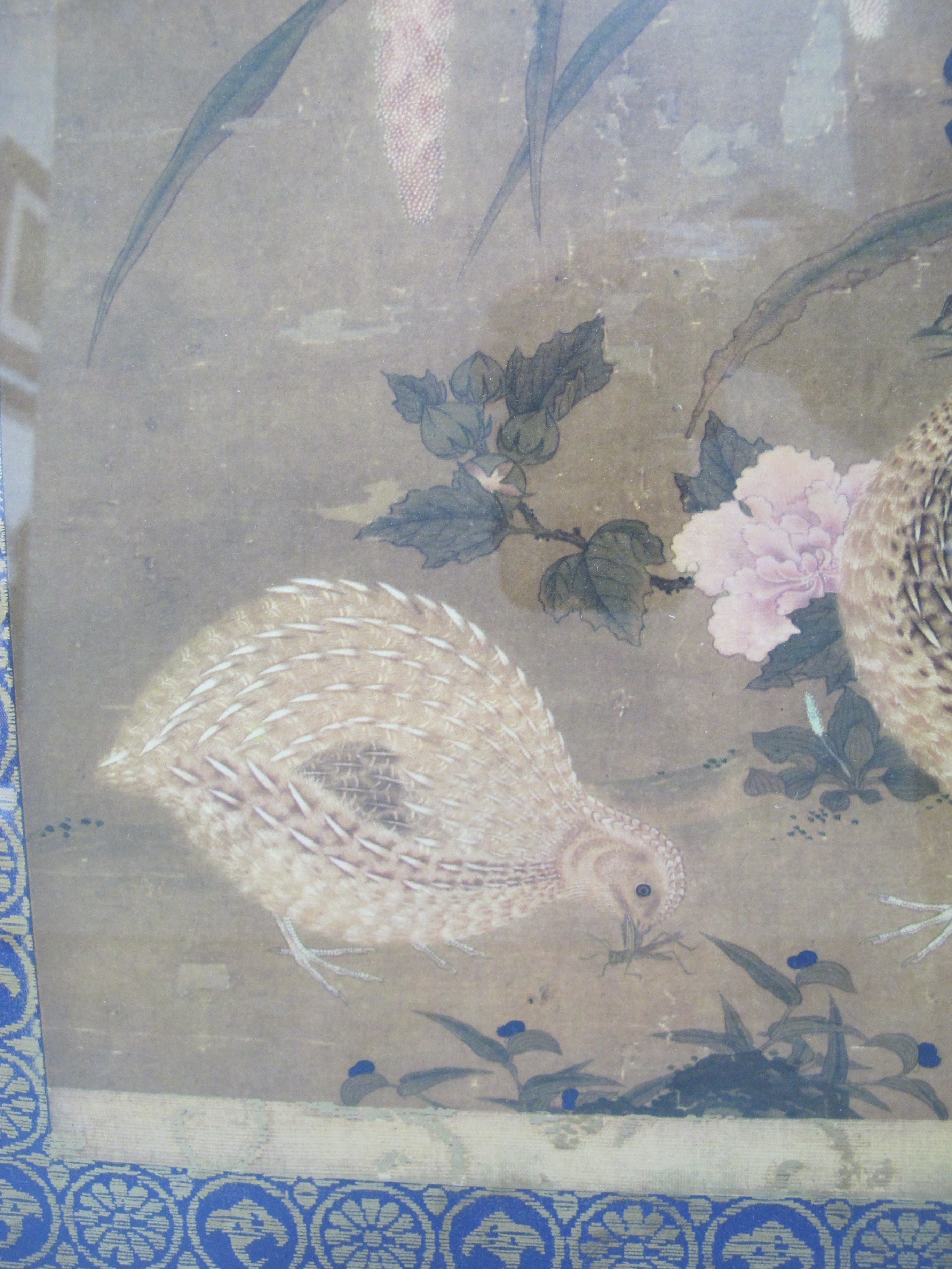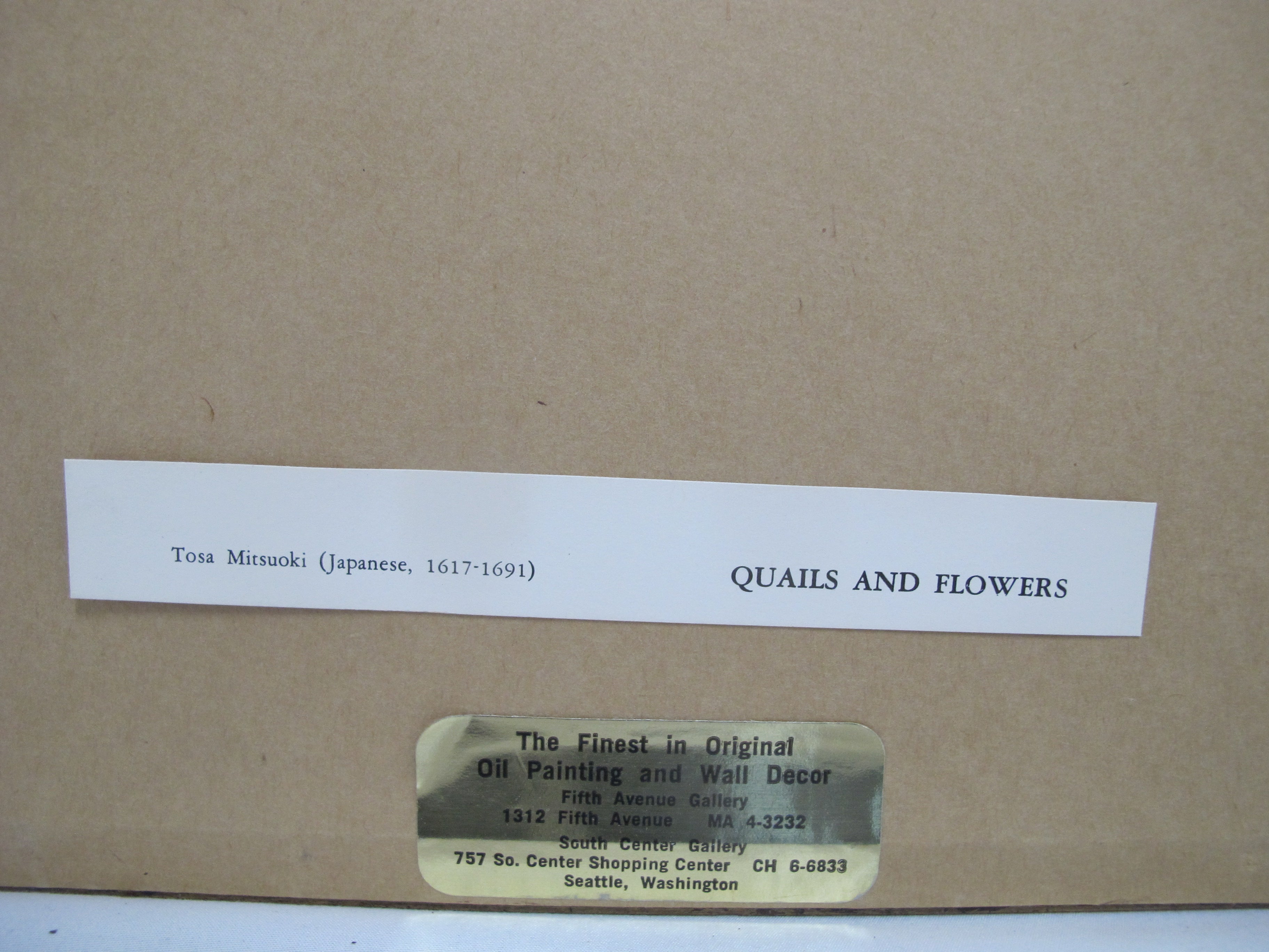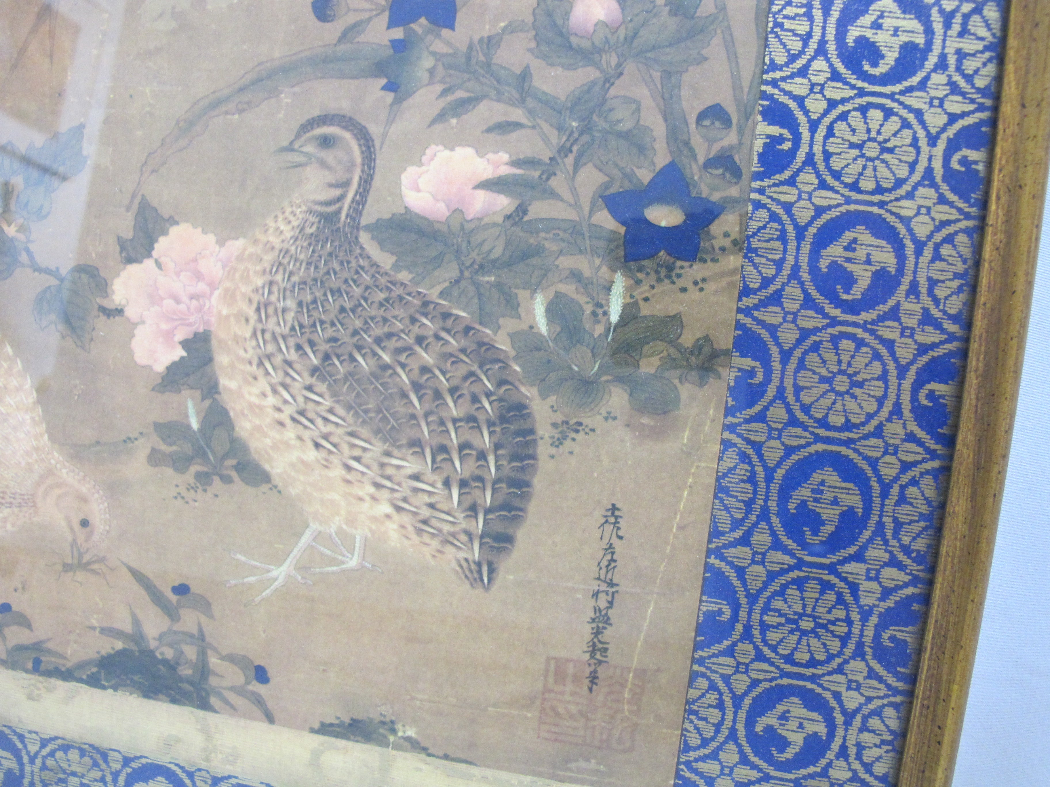 Tosa Mitsuoki (Japanese, 1617 - 1691), "Quail and Autumn Flowers" Ink and Colors on Silk textile, framed under glass. Signed and red seal bottom right-hand corner.