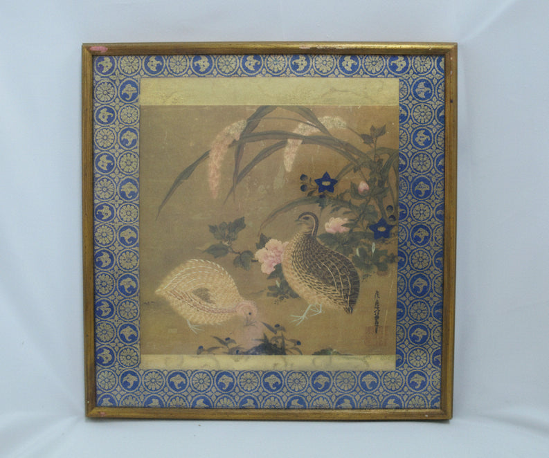 Tosa MITSUOKI Japanese Gilt QUAILS & Autumn FLOWERS on Silk Textile Art Print