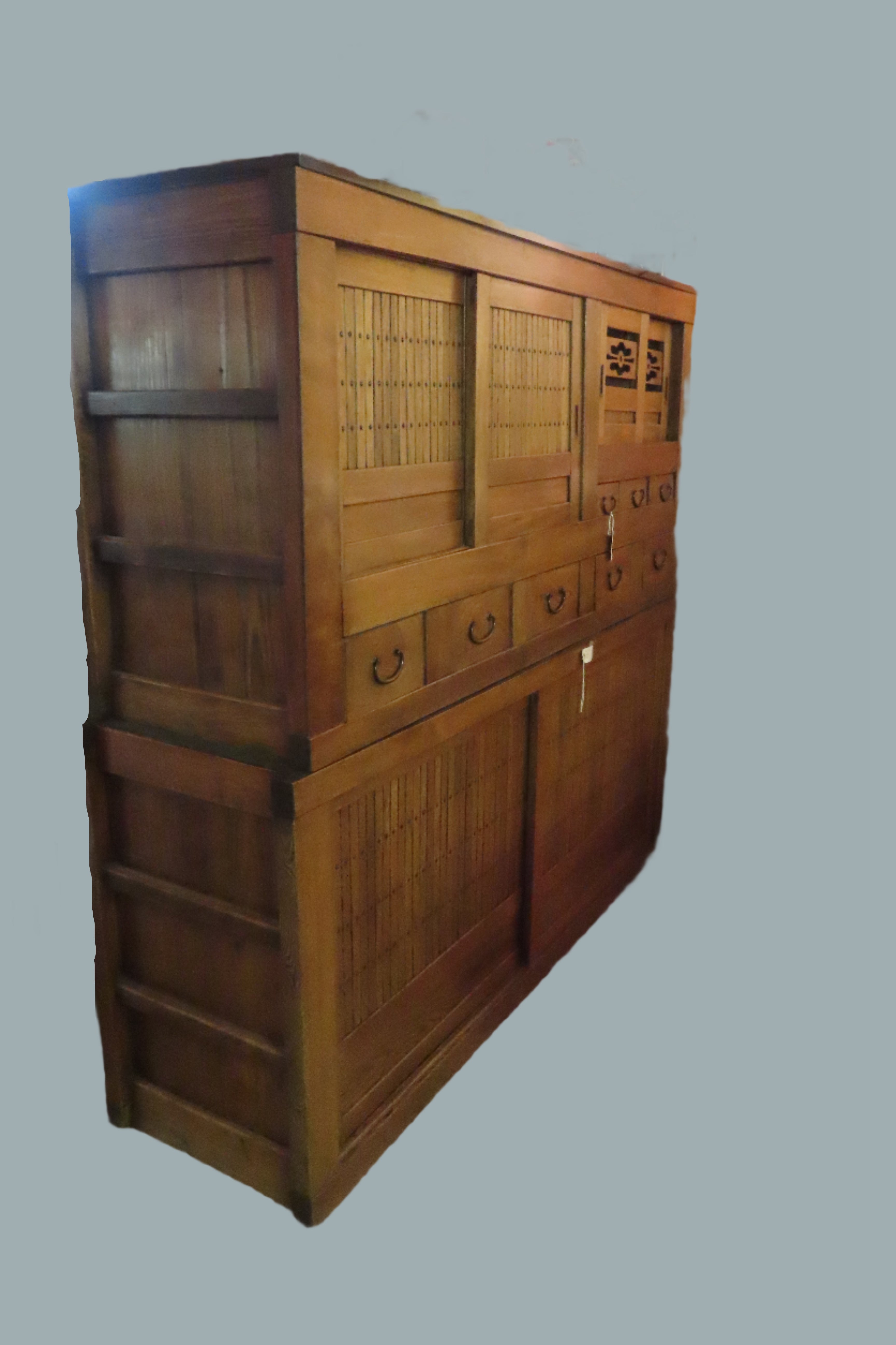 Pair of beautiful antique Japanese kitchen tansus made out of hinoki cypress wood. Can either be stacked or displayed separately. Both tansus come with a large slab of black granite that sits on top. Both pieces have a variety of sliding doors leading to spacious compartments and drawers with organizational inserts. The backs have sections that are cut out to accommodate cords for electronics.