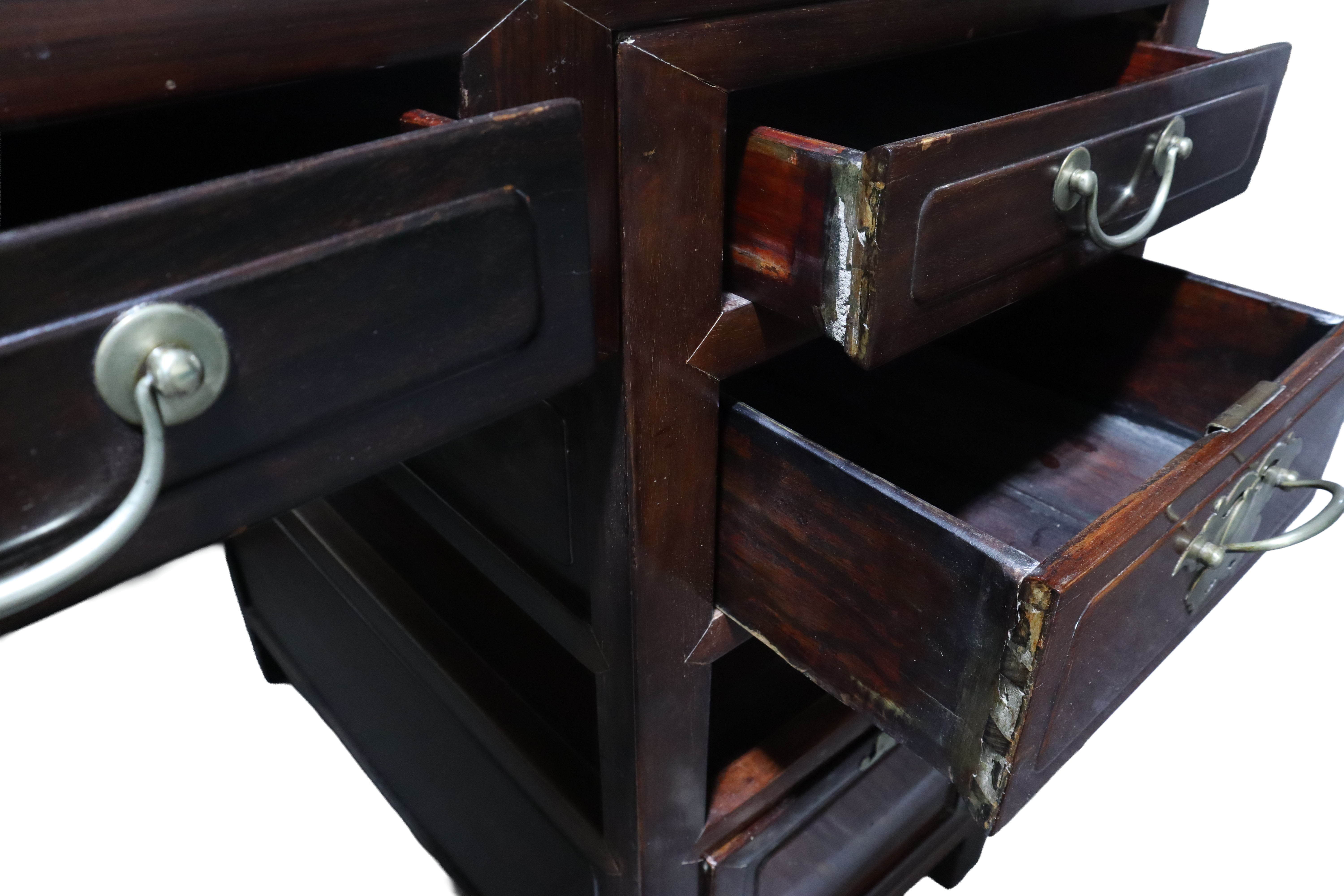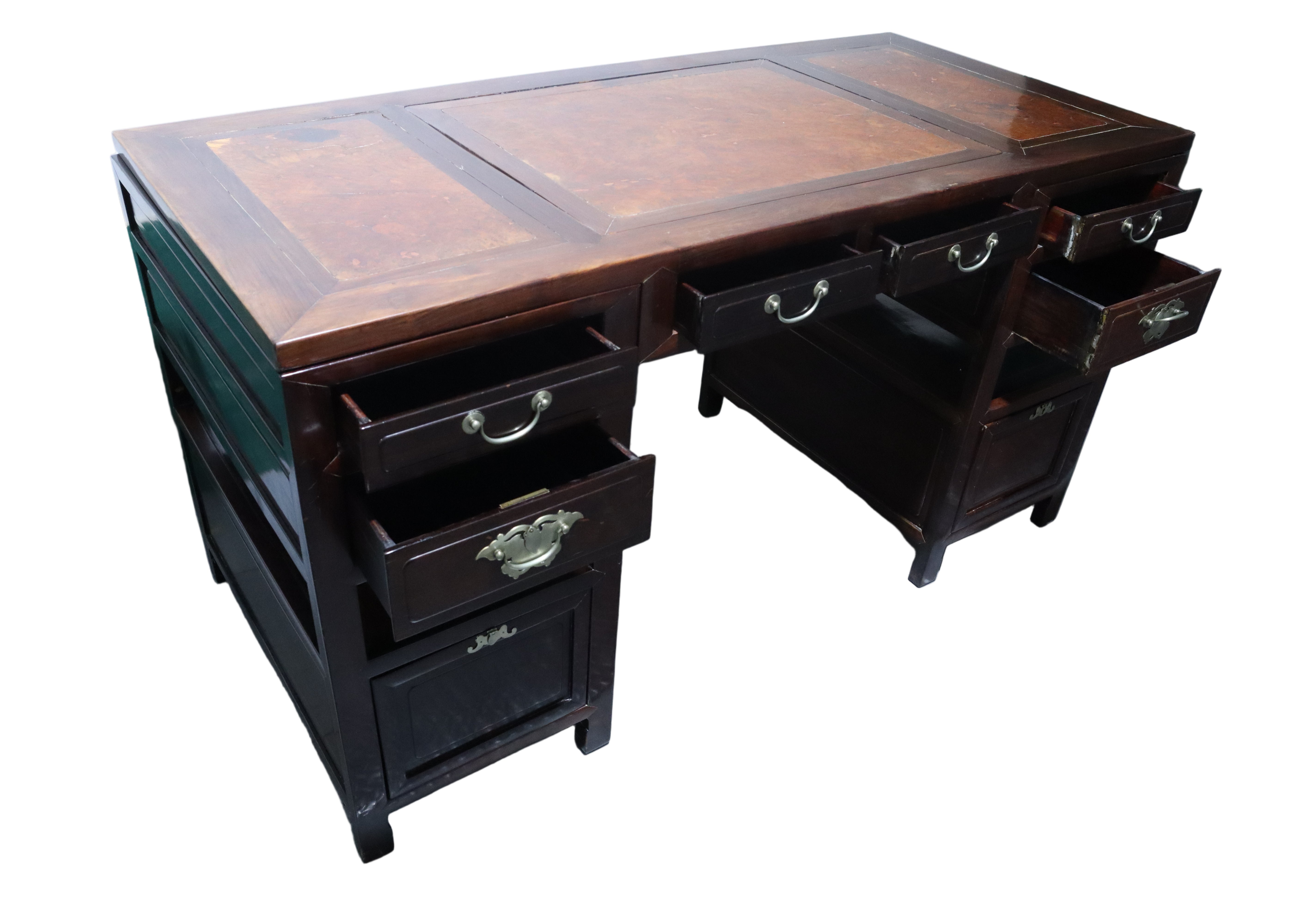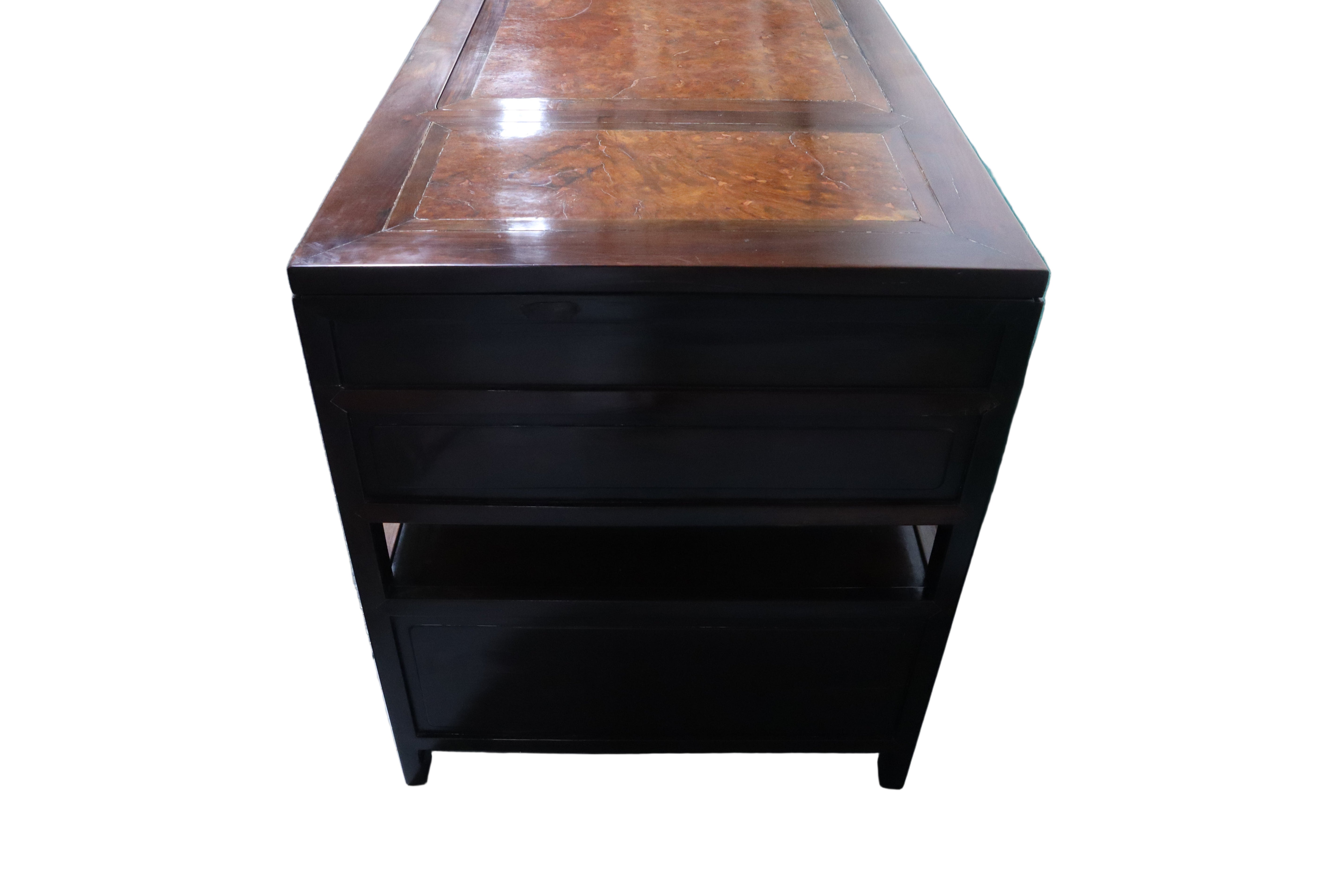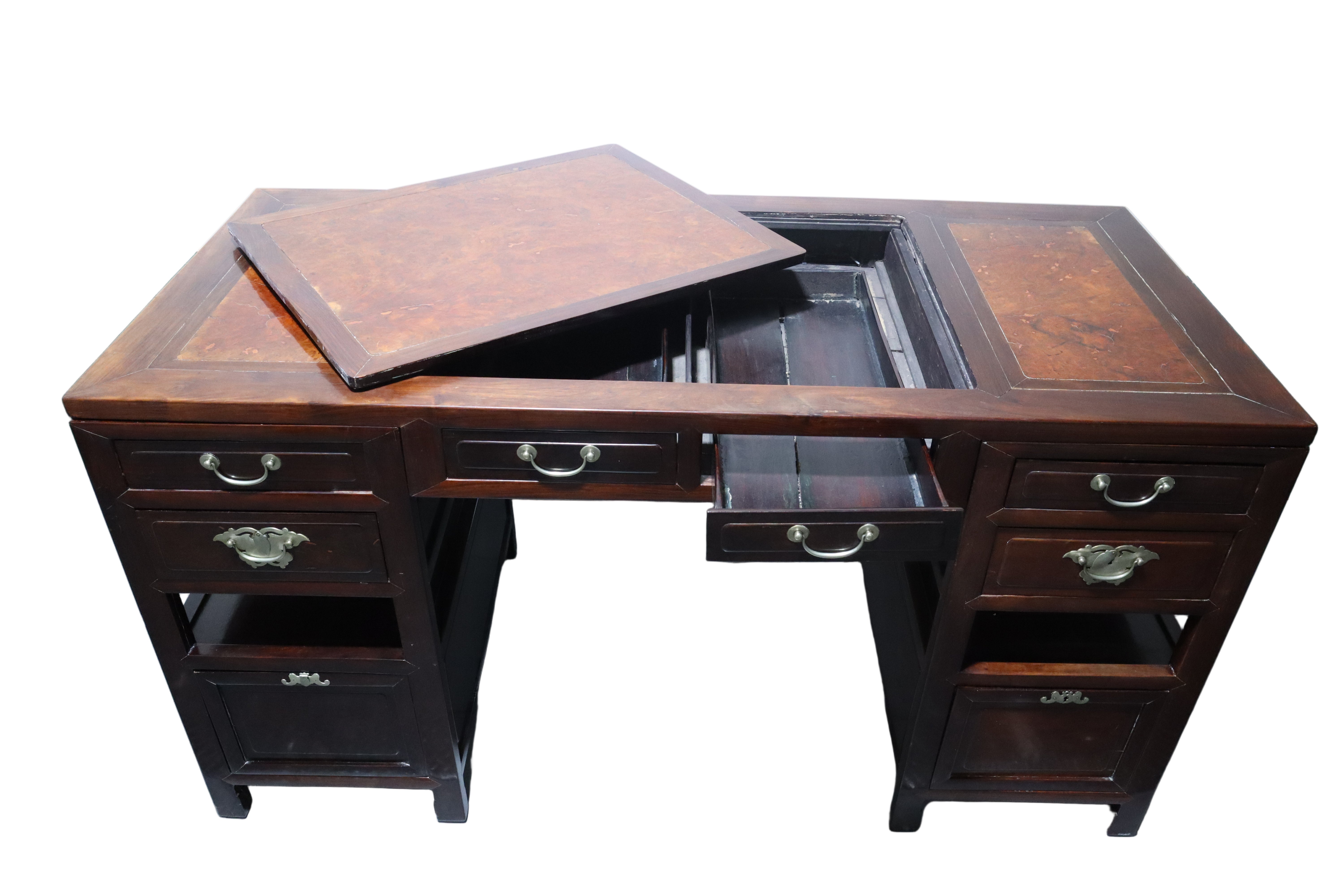 Gorgeous antique Chinese Ming dark wood desk with reddish burl accents on the top face and a matching foot rest. Silver brushed brass hardware drawer pulls. The top of this desk lifts off with the two middle drawers as one cohesive piece, leaving the two banks of drawers as stand alone pieces for easy transportation. The two banks of drawers are symmetrical with two smaller stacked drawers near the top and then continuing down with an open space or shelf area. The bottom half of the banks consist of spacious compartments with doors that latch loosely and can be easily fully removed.