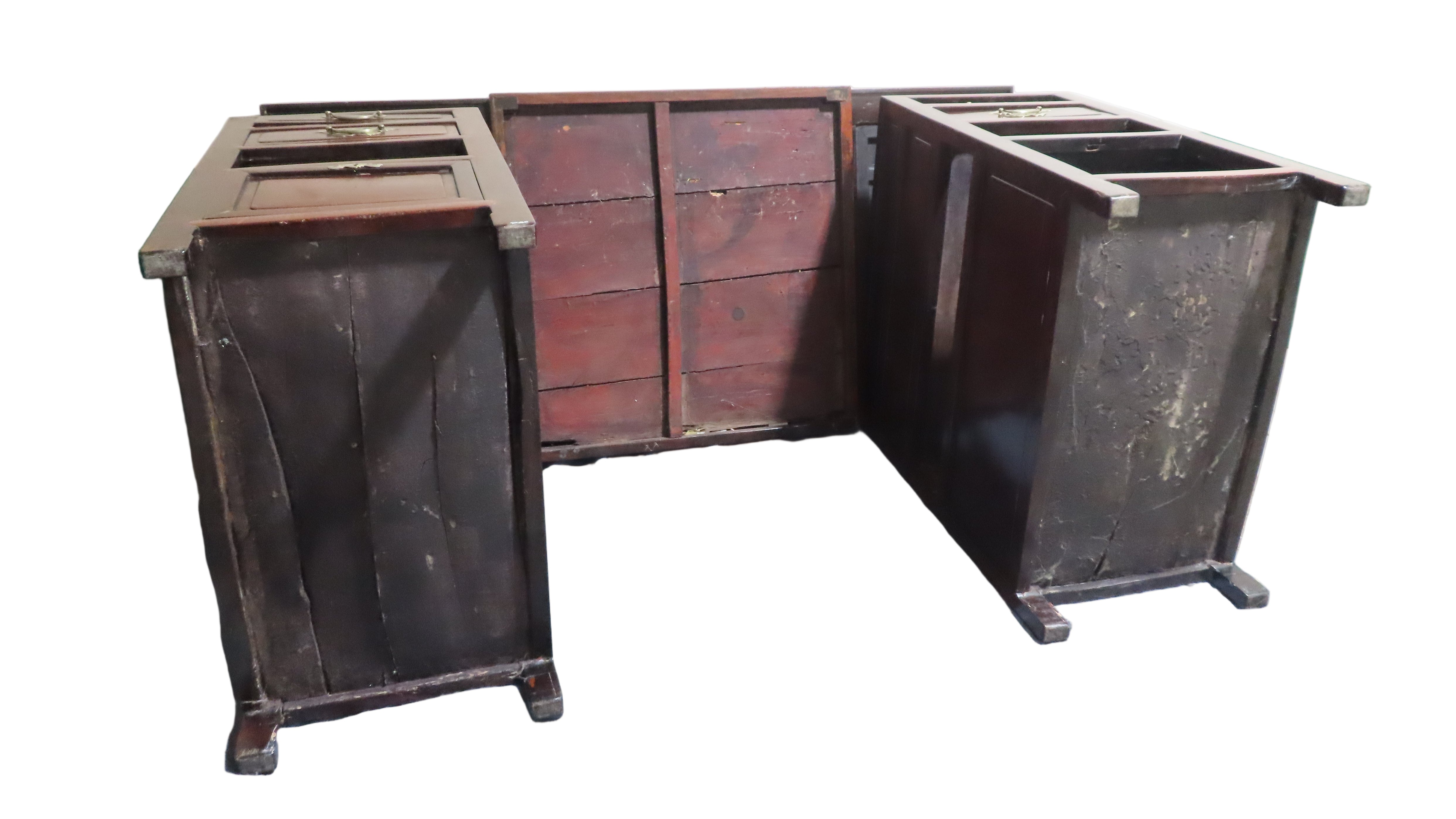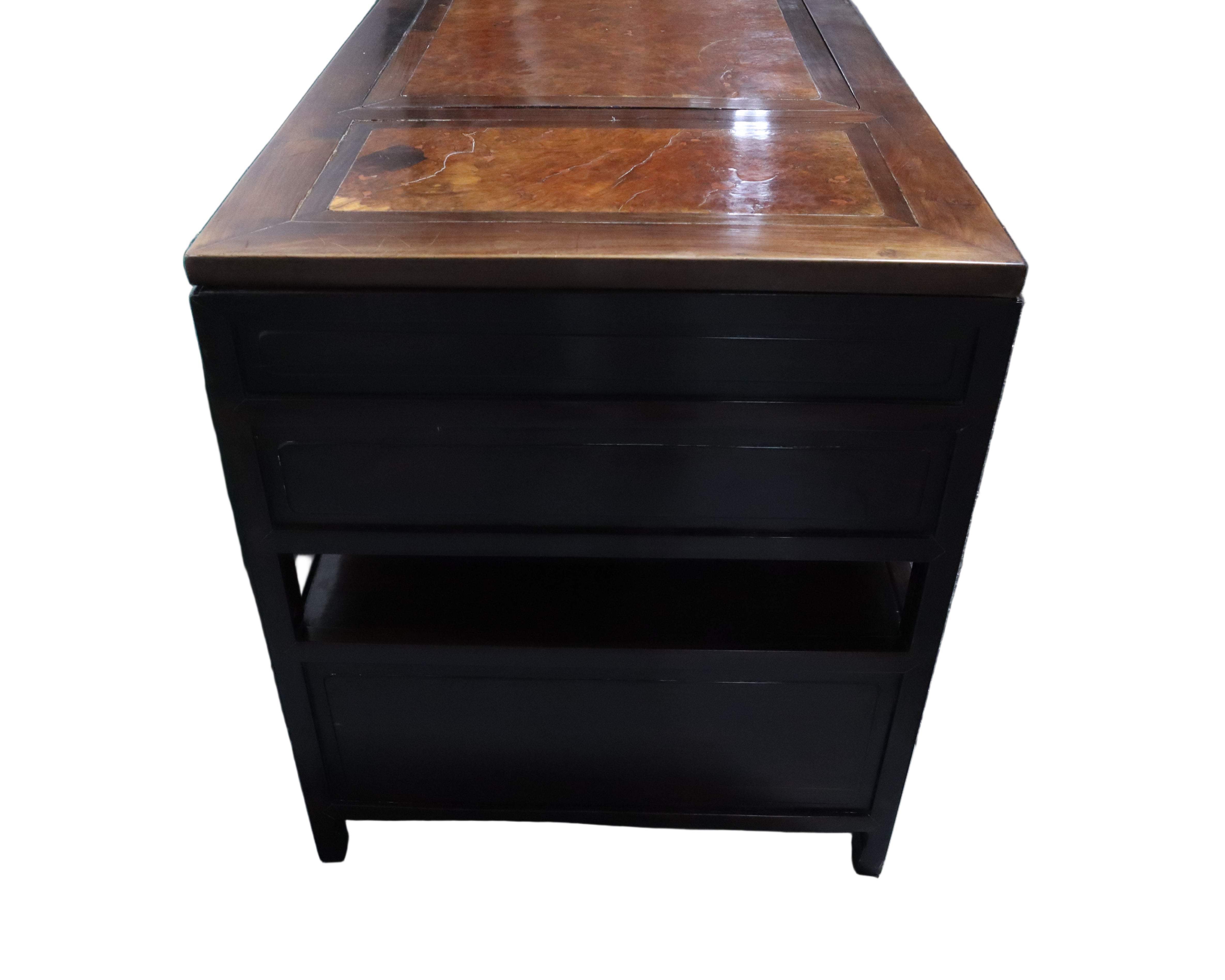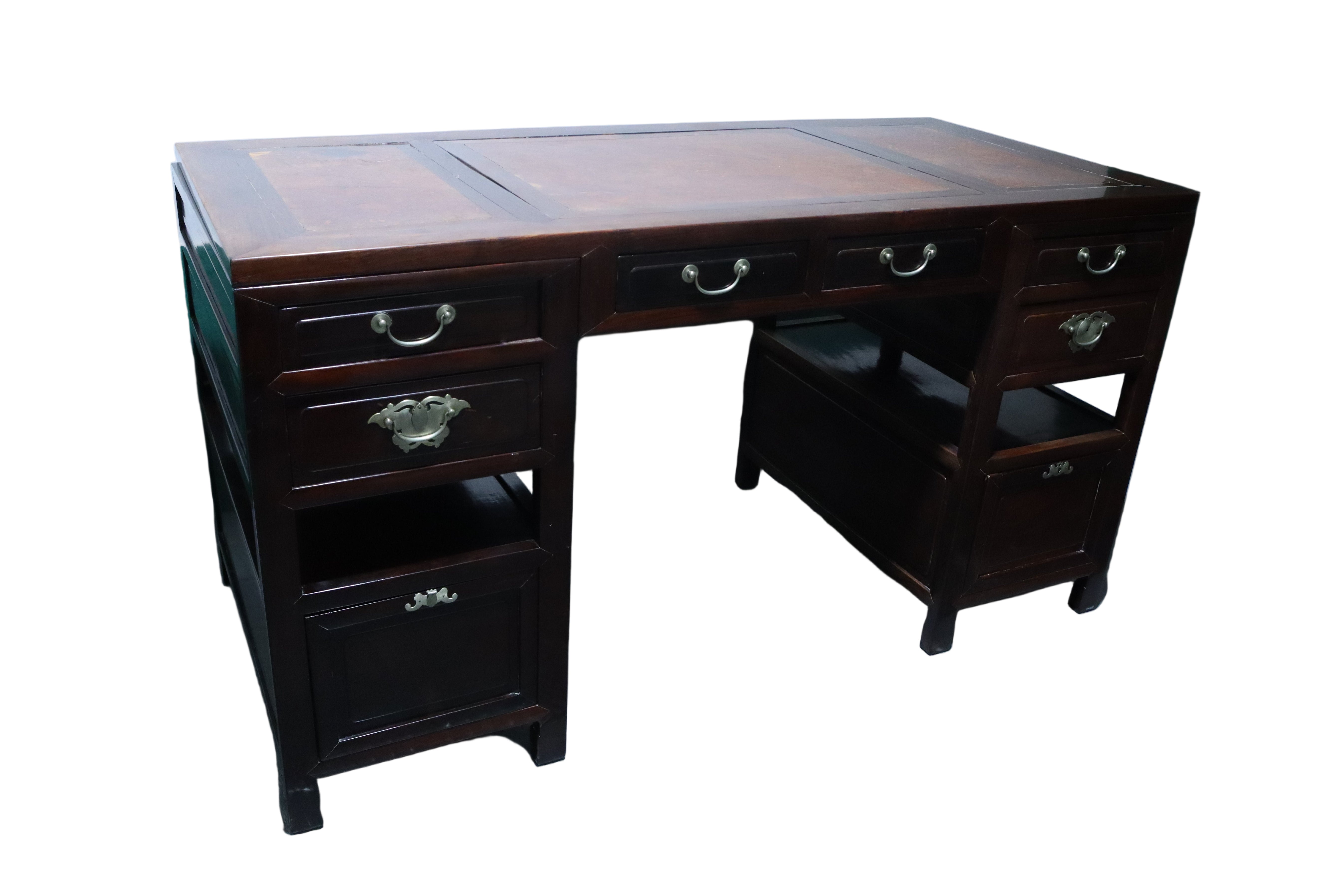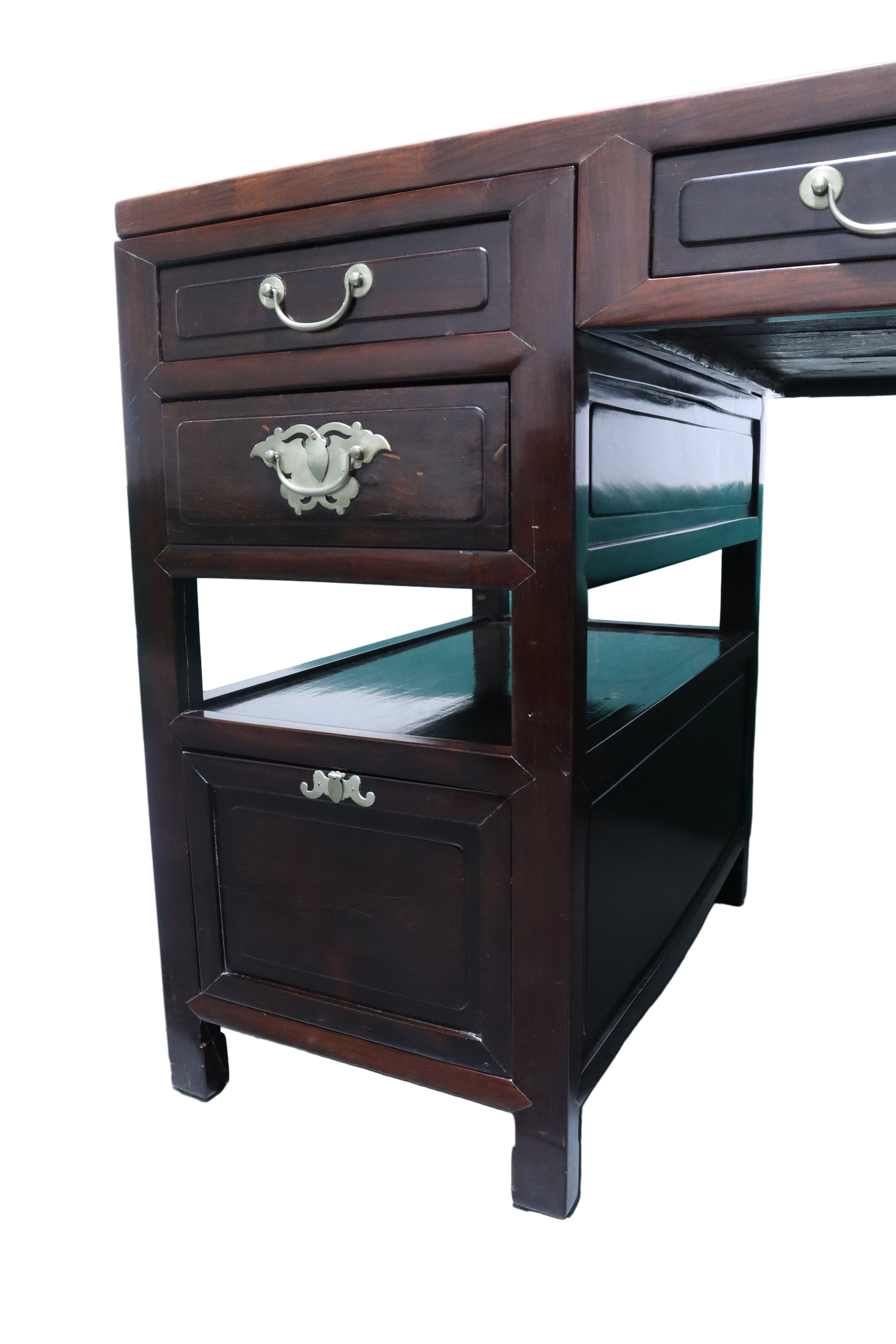 Gorgeous antique Chinese Ming dark wood desk with reddish burl accents on the top face and a matching foot rest. Silver brushed brass hardware drawer pulls. The top of this desk lifts off with the two middle drawers as one cohesive piece, leaving the two banks of drawers as stand alone pieces for easy transportation. The two banks of drawers are symmetrical with two smaller stacked drawers near the top and then continuing down with an open space or shelf area. The bottom half of the banks consist of spacious compartments with doors that latch loosely and can be easily fully removed.