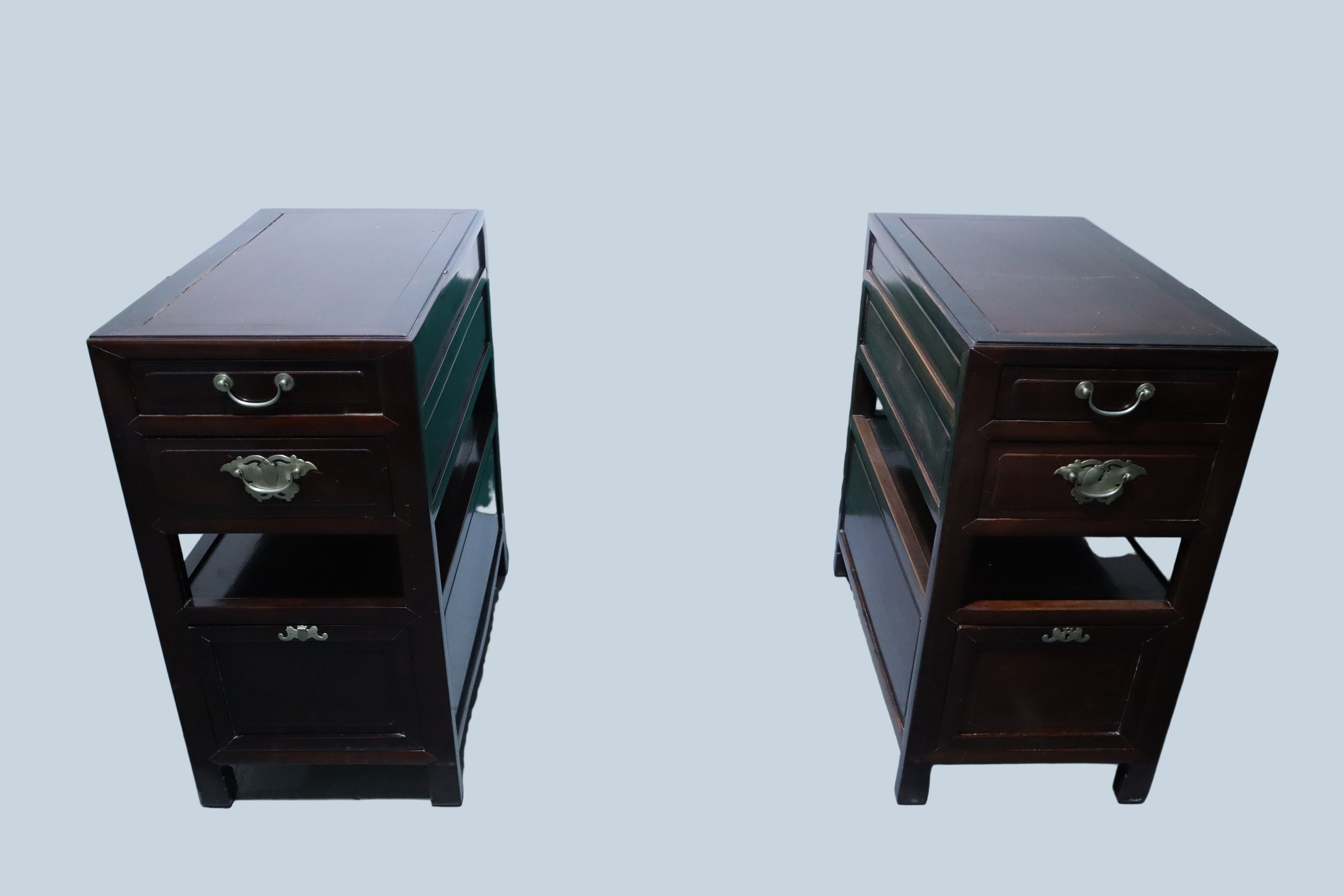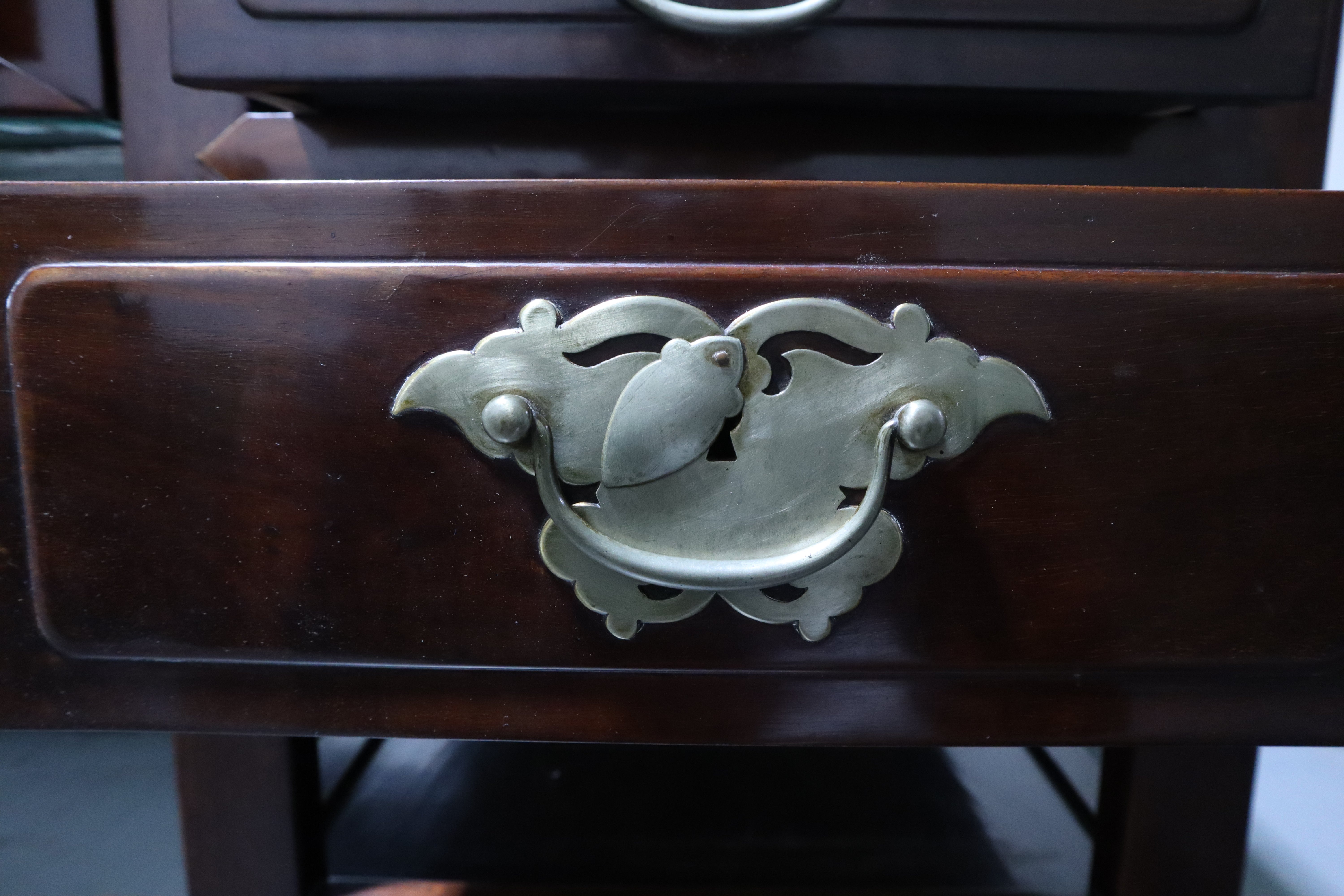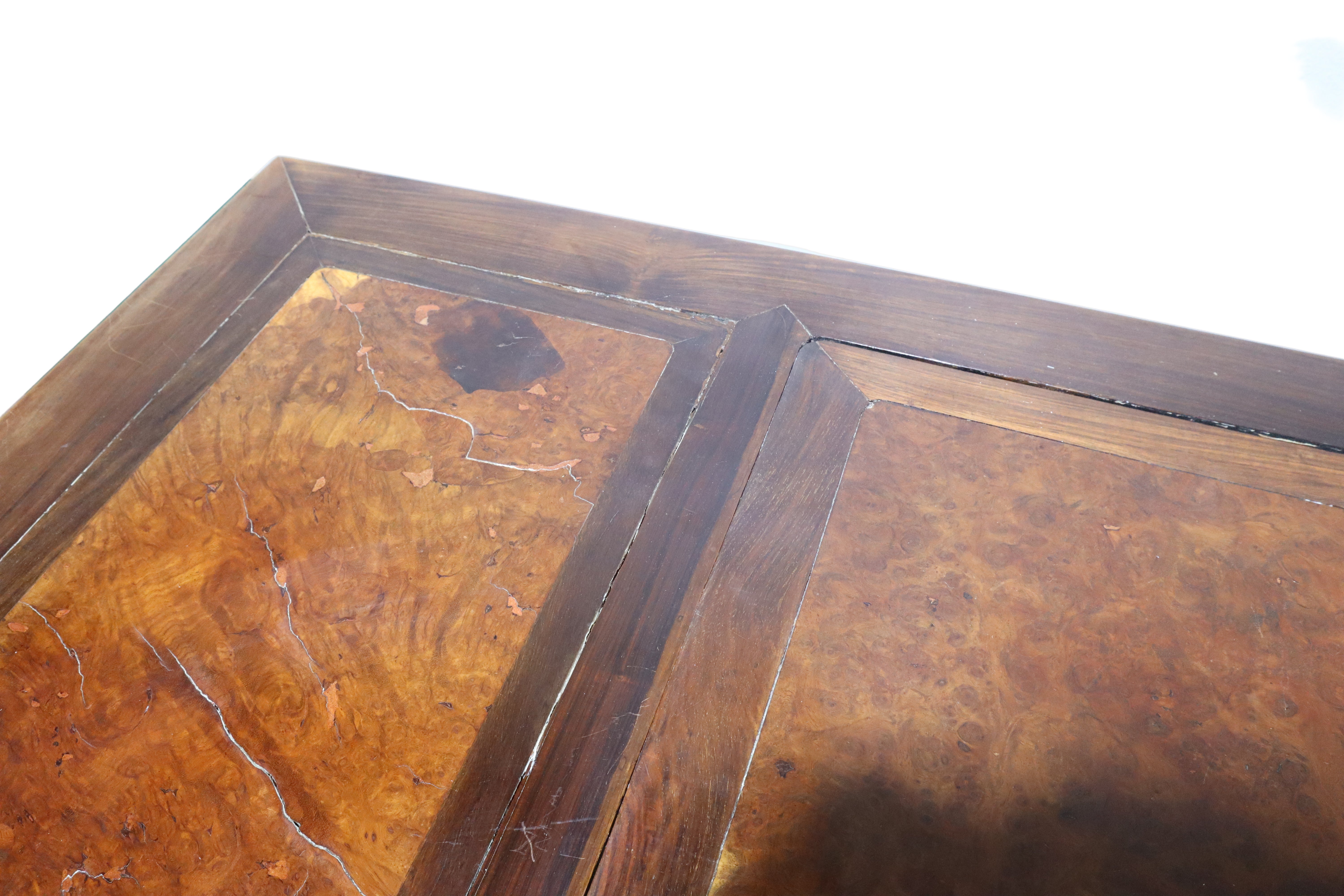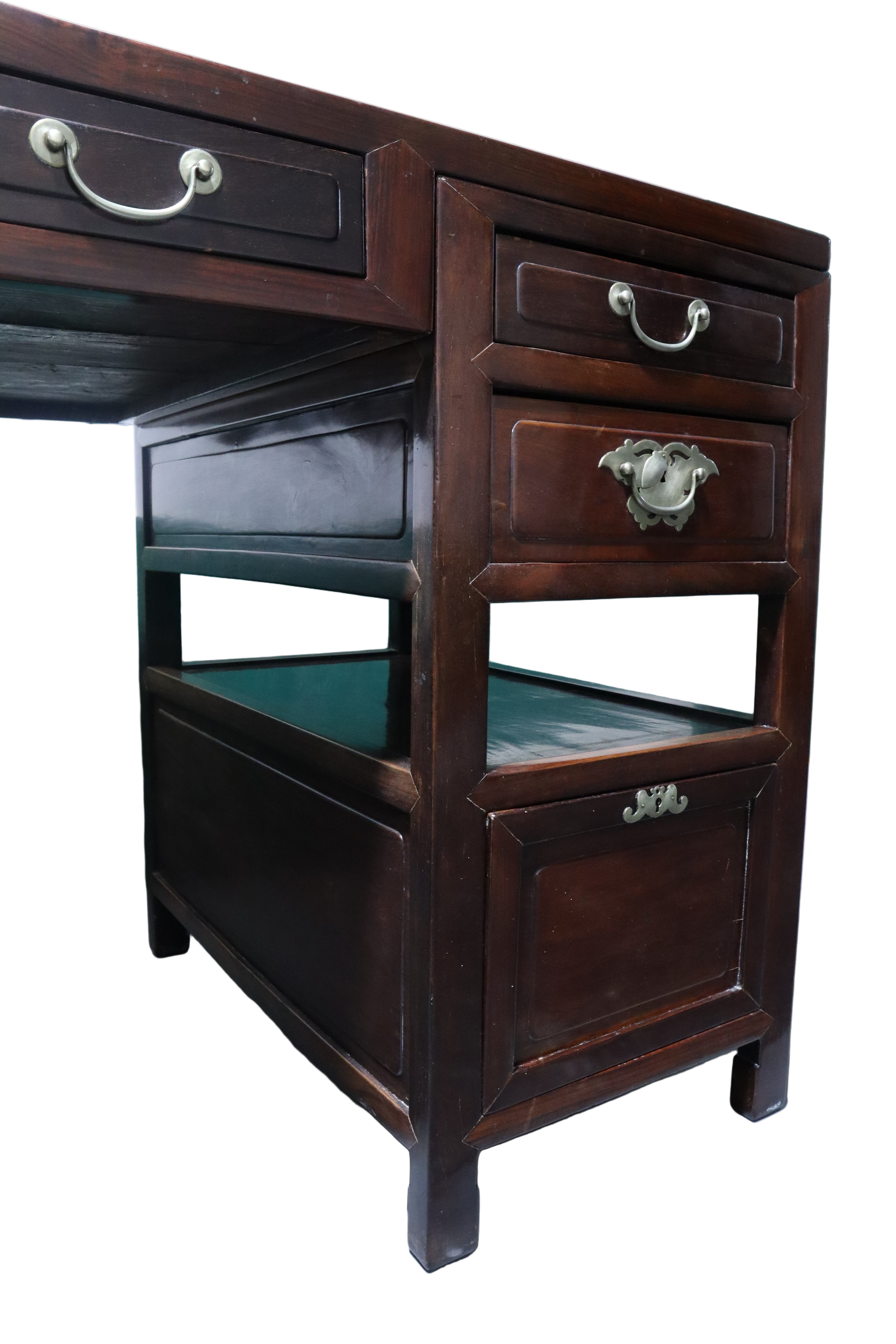 Gorgeous antique Chinese Ming dark wood desk with reddish burl accents on the top face and a matching foot rest. Silver brushed brass hardware drawer pulls. The top of this desk lifts off with the two middle drawers as one cohesive piece, leaving the two banks of drawers as stand alone pieces for easy transportation. The two banks of drawers are symmetrical with two smaller stacked drawers near the top and then continuing down with an open space or shelf area. The bottom half of the banks consist of spacious compartments with doors that latch loosely and can be easily fully removed.