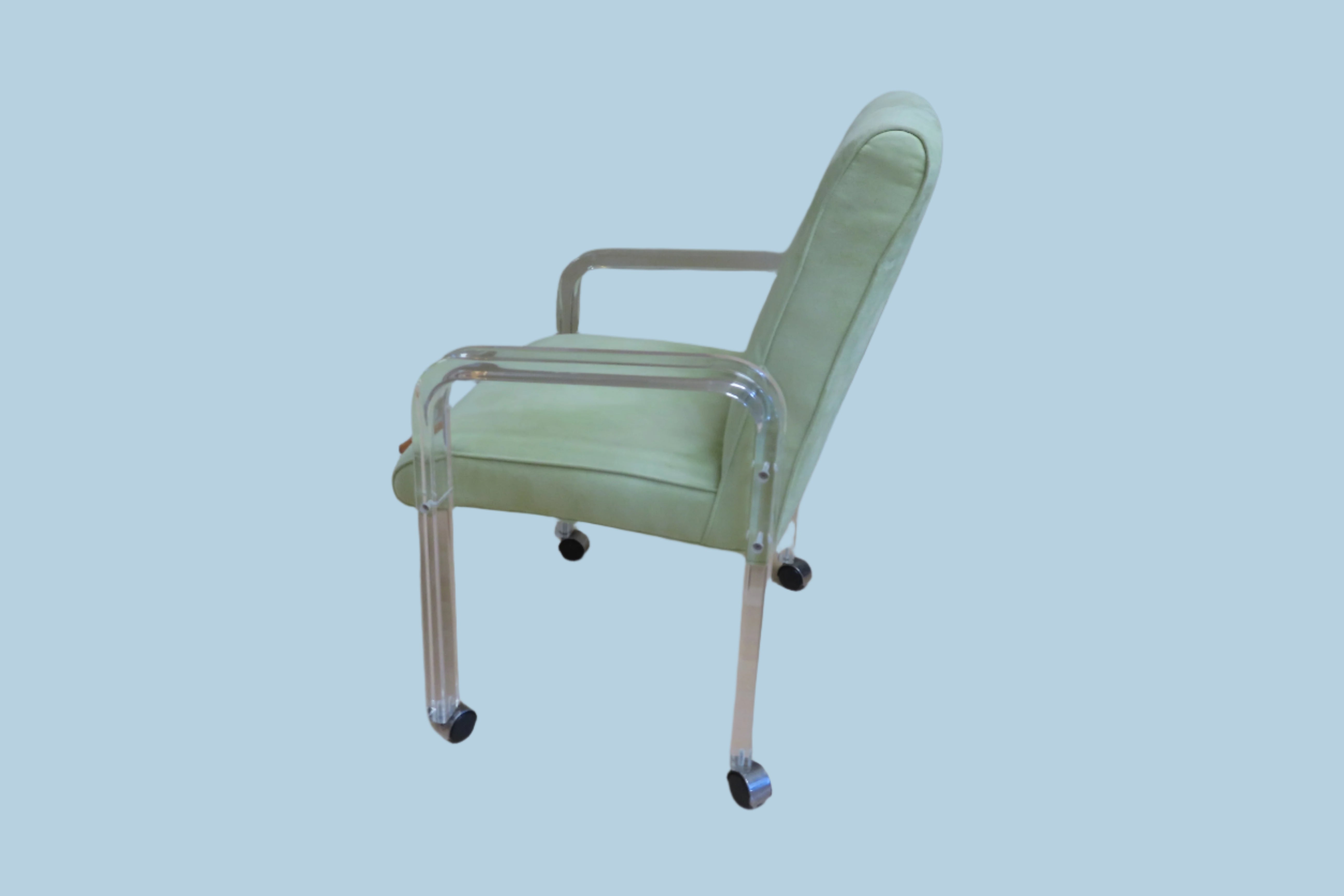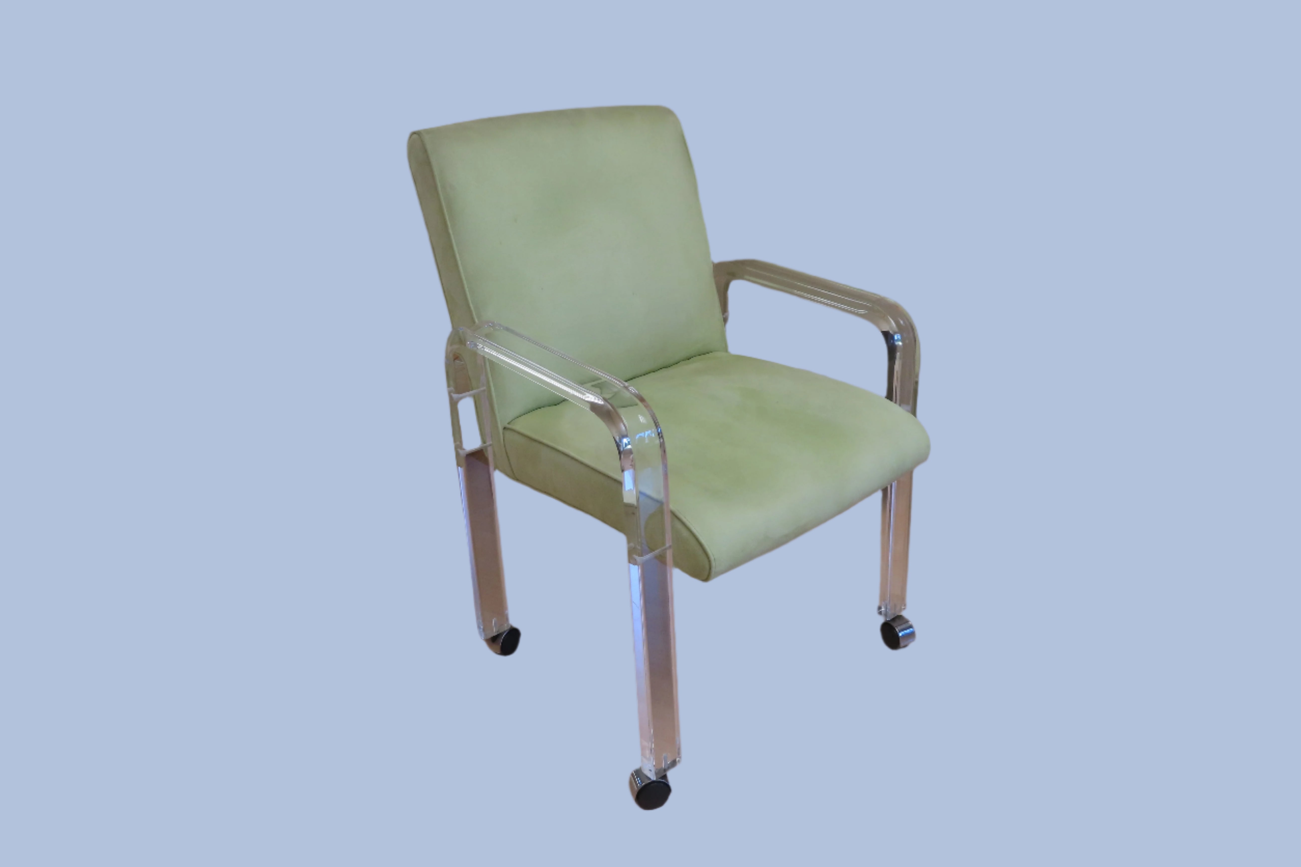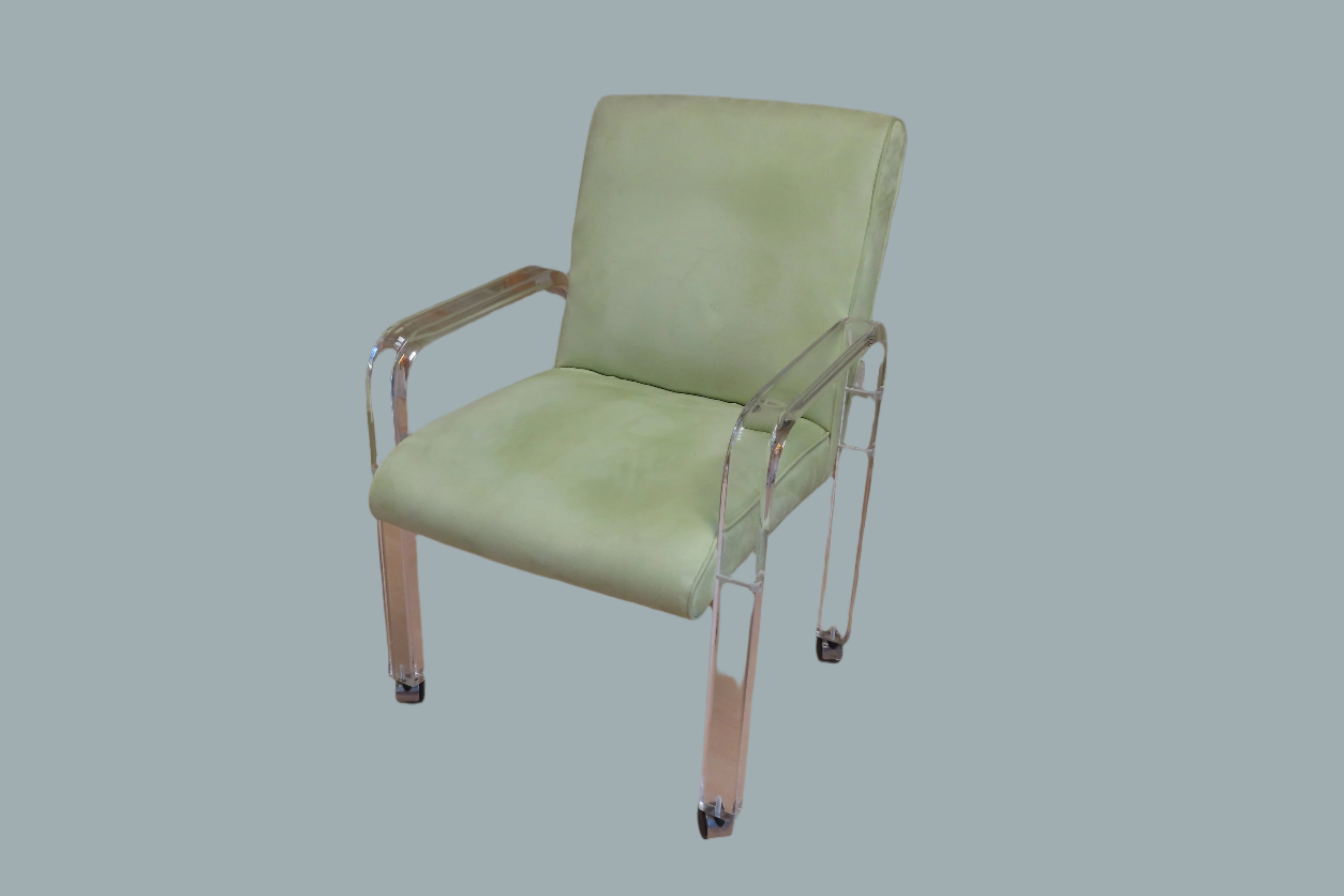 Super fun vintage Haziza chartreuse and Lucite rolling desk chair. Simple and modern design, the Lucite arms fold down and the same piece is also used as the chairs legs. The seat is upholstered with a soft chartreuse fabric. Designed by Haziza, a famous sculptor who has explored and found success in the ultra-modern luxury furniture realm.