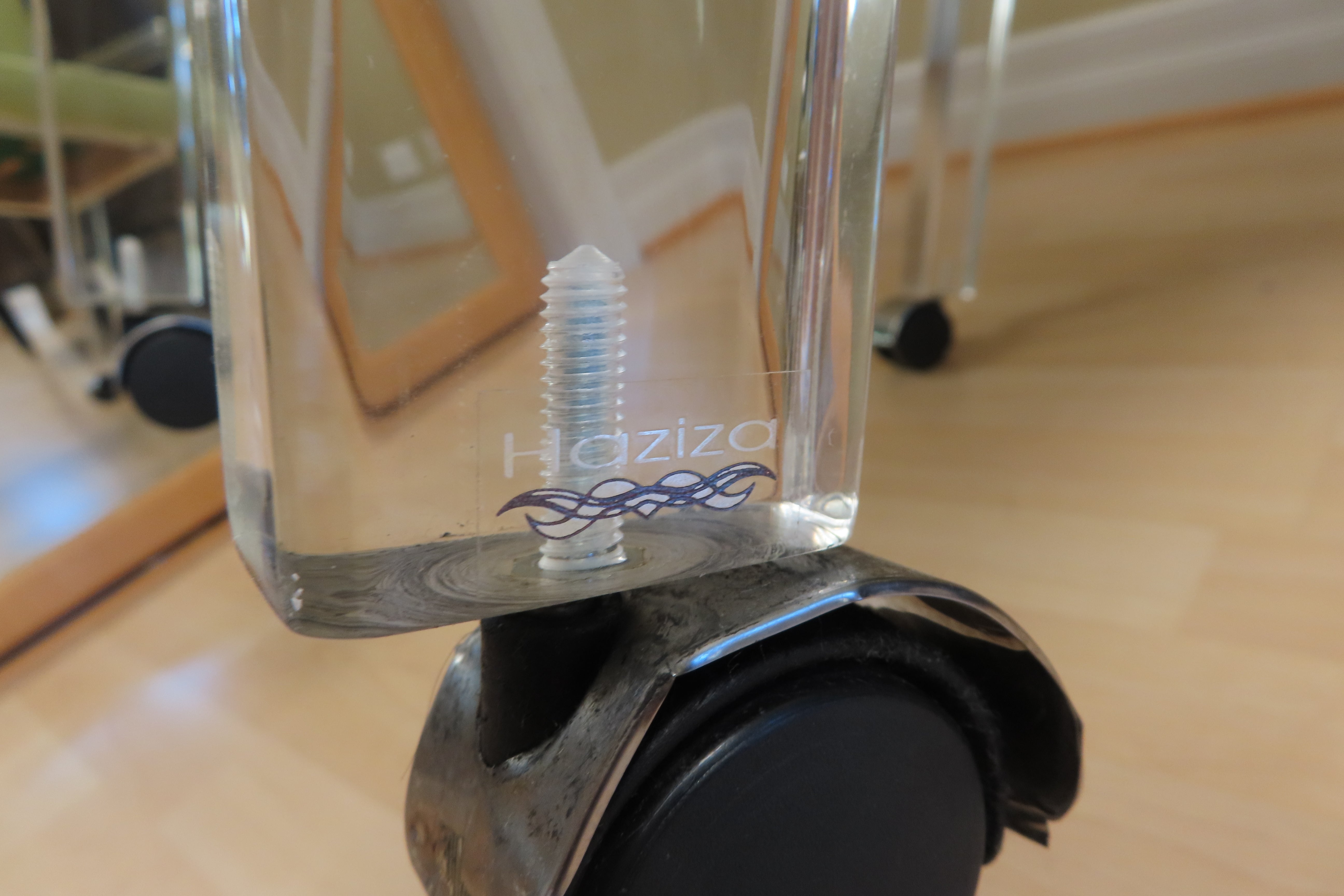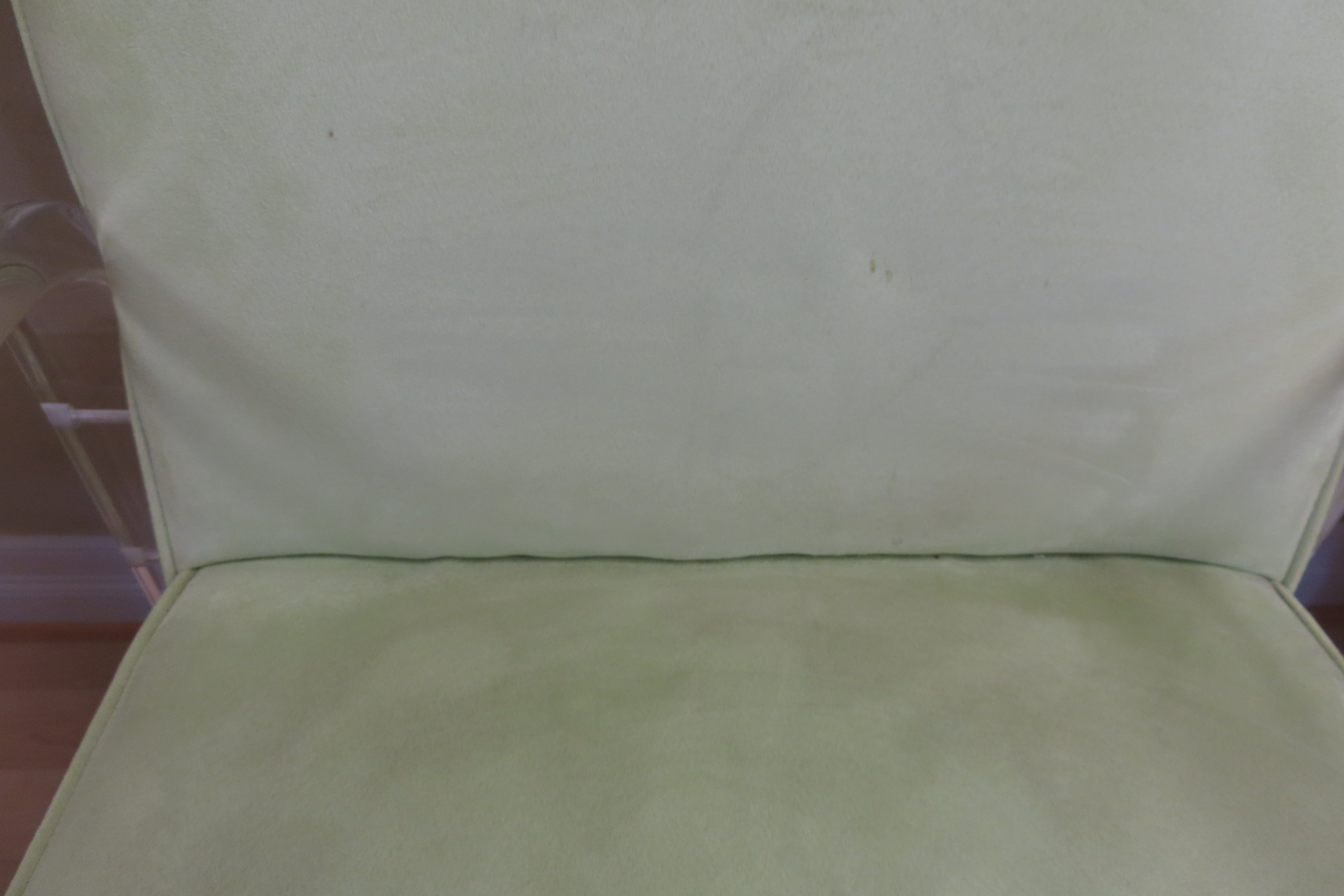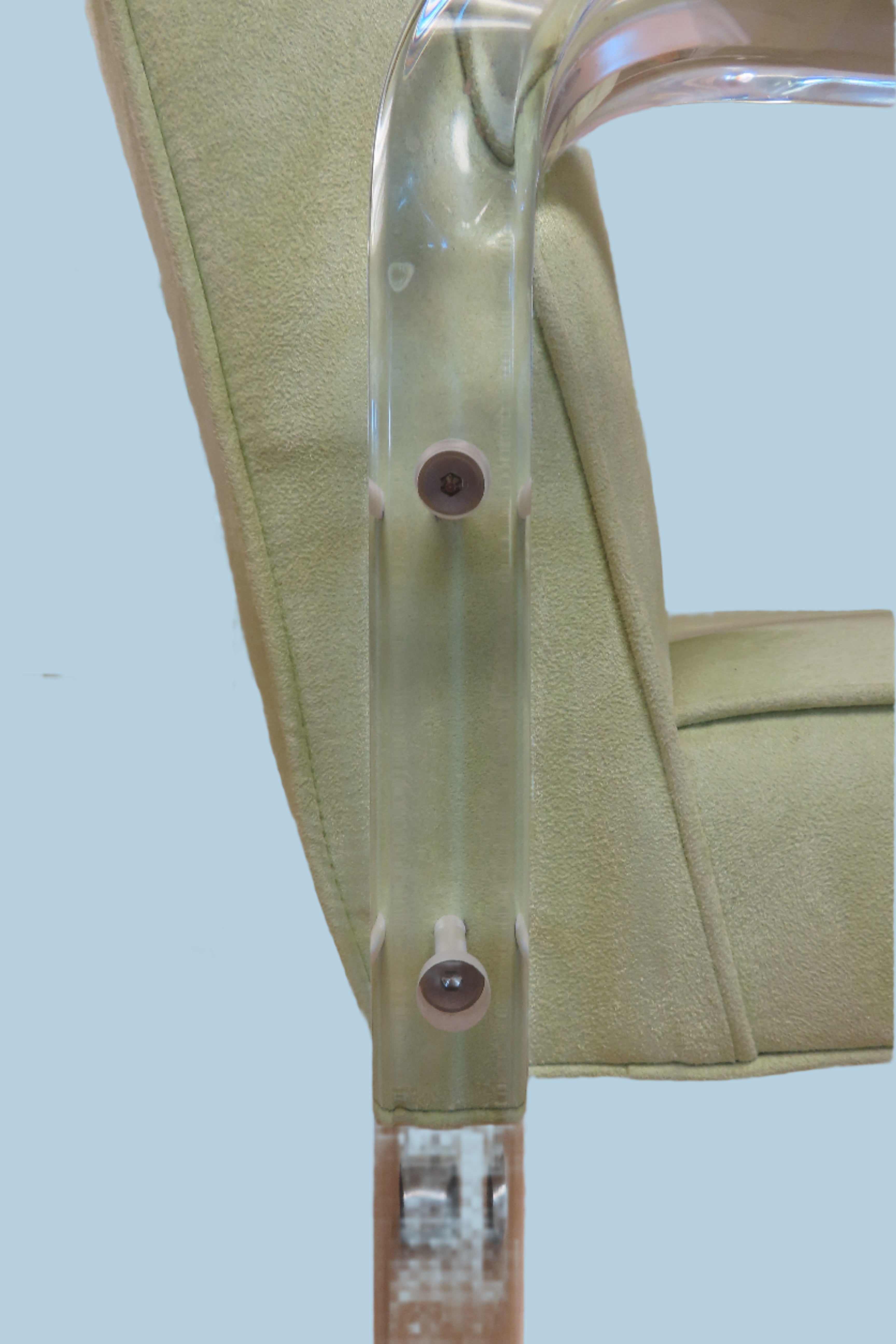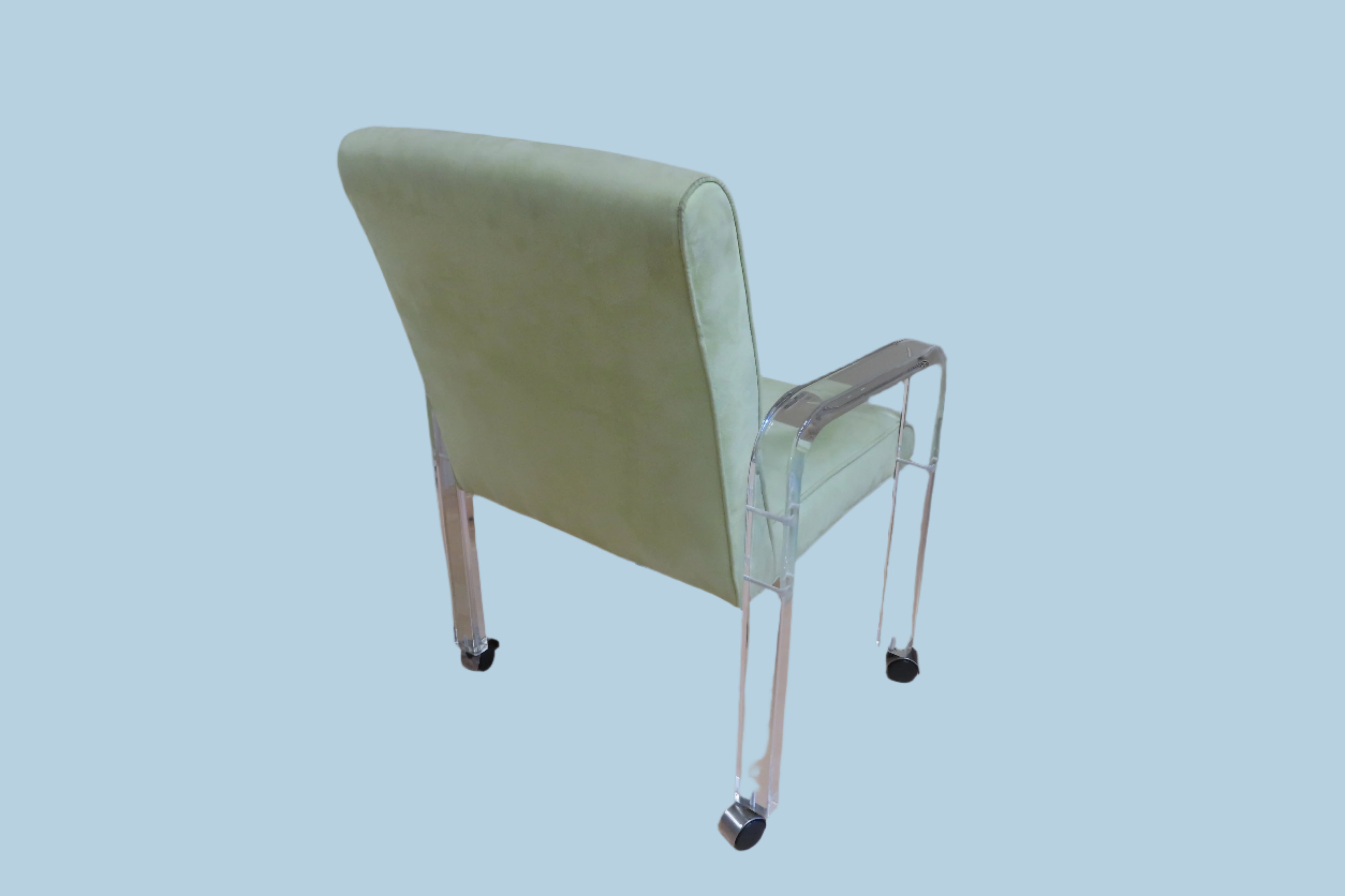 Super fun vintage Haziza chartreuse and Lucite rolling desk chair. Simple and modern design, the Lucite arms fold down and the same piece is also used as the chairs legs. The seat is upholstered with a soft chartreuse fabric. Designed by Haziza, a famous sculptor who has explored and found success in the ultra-modern luxury furniture realm.