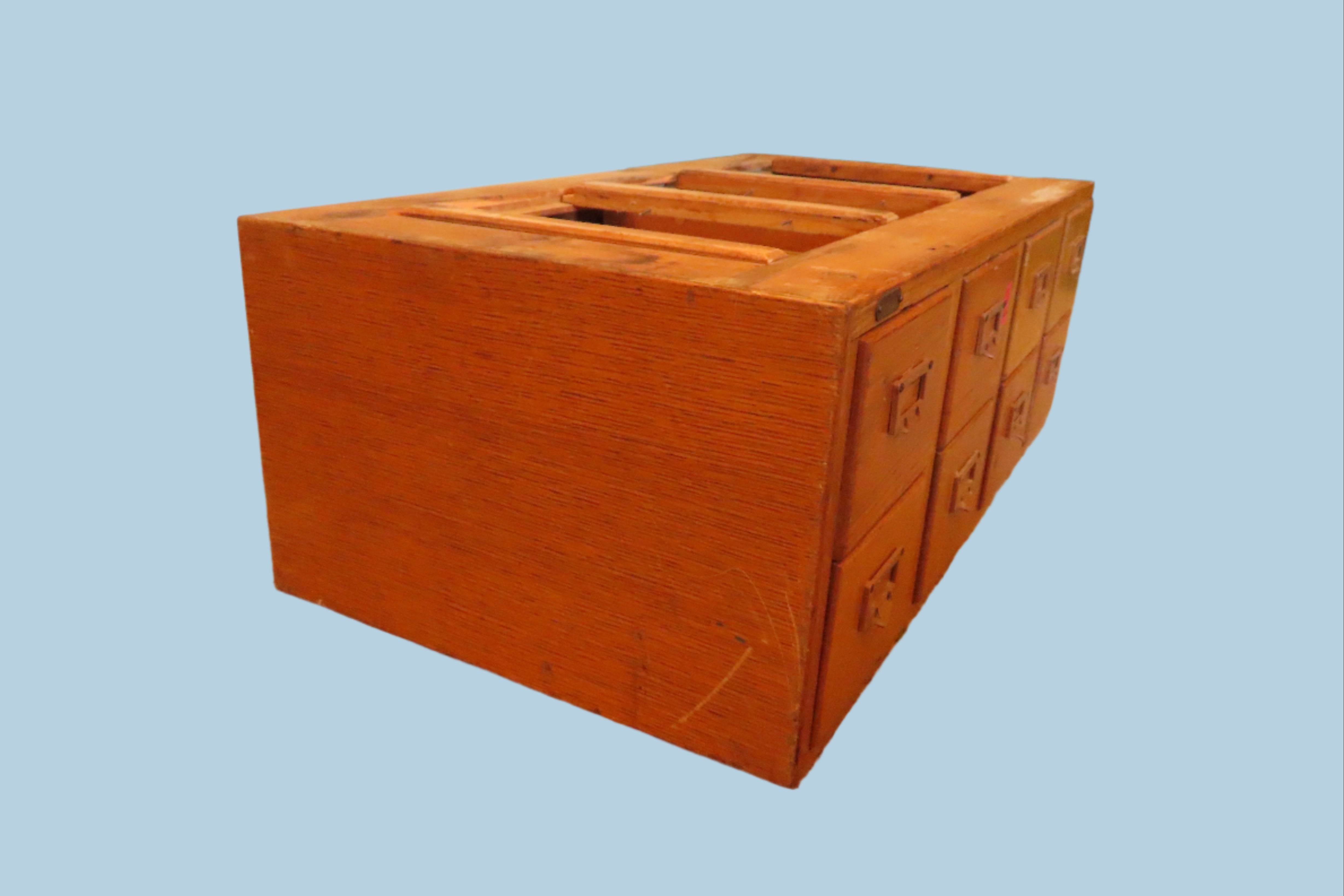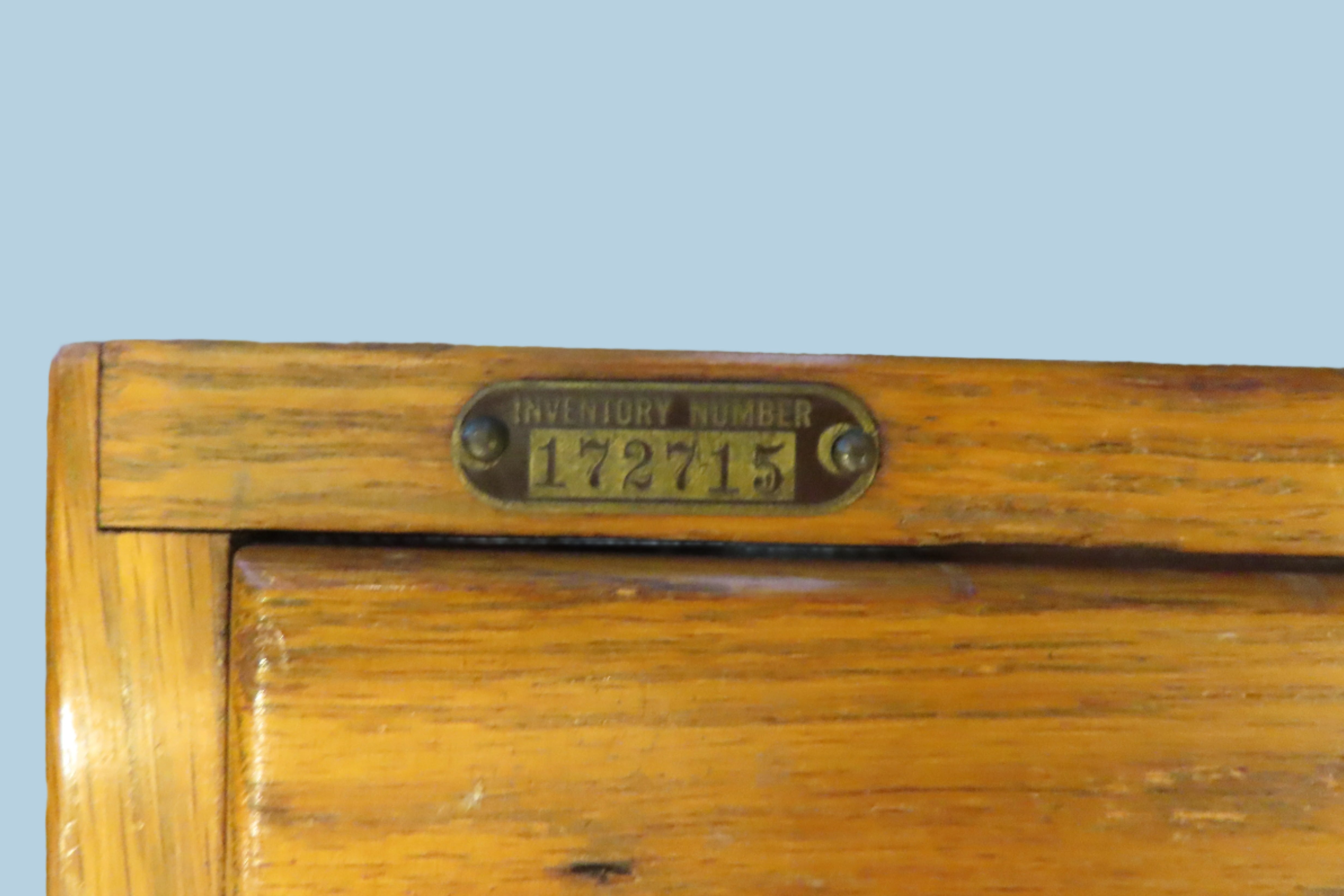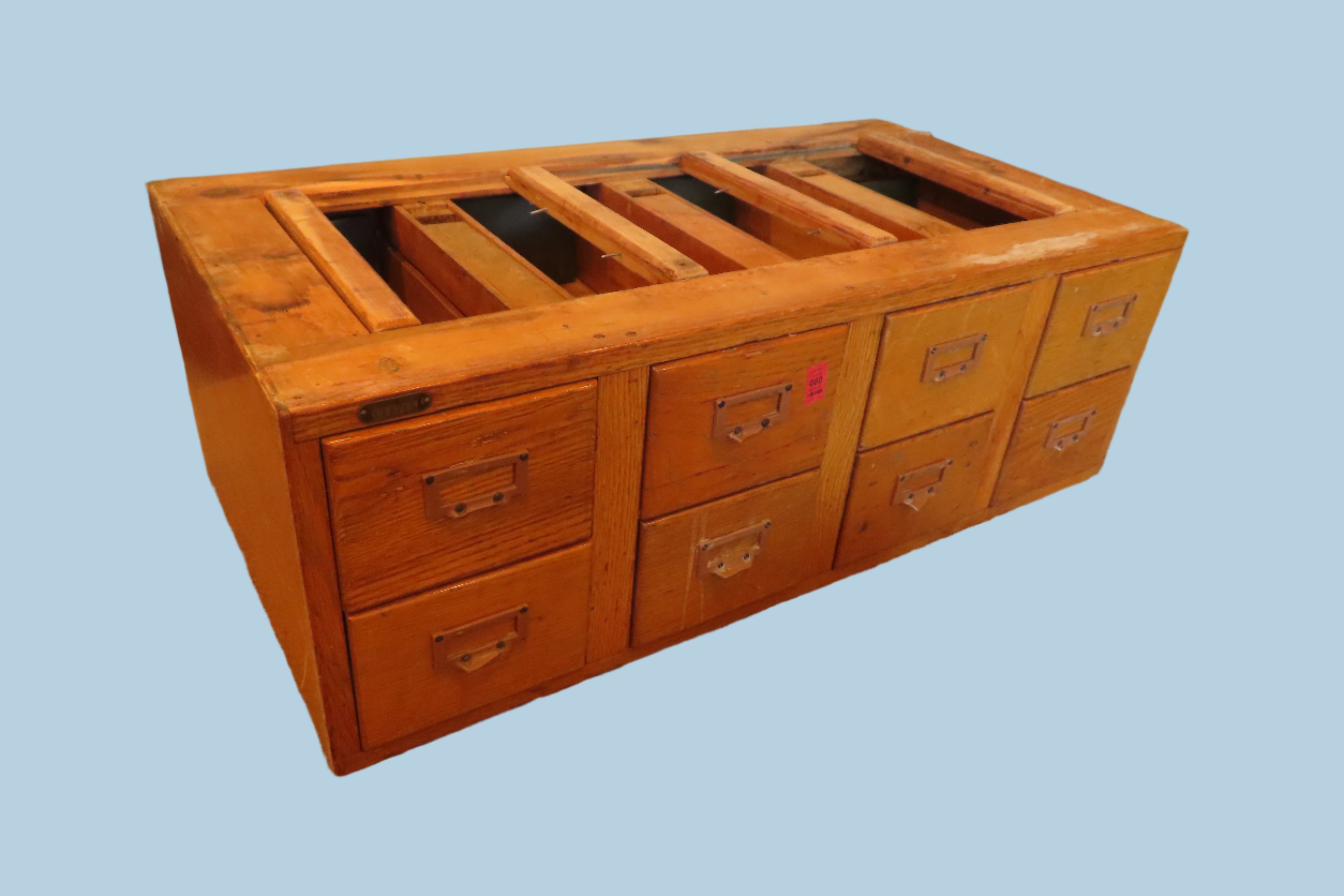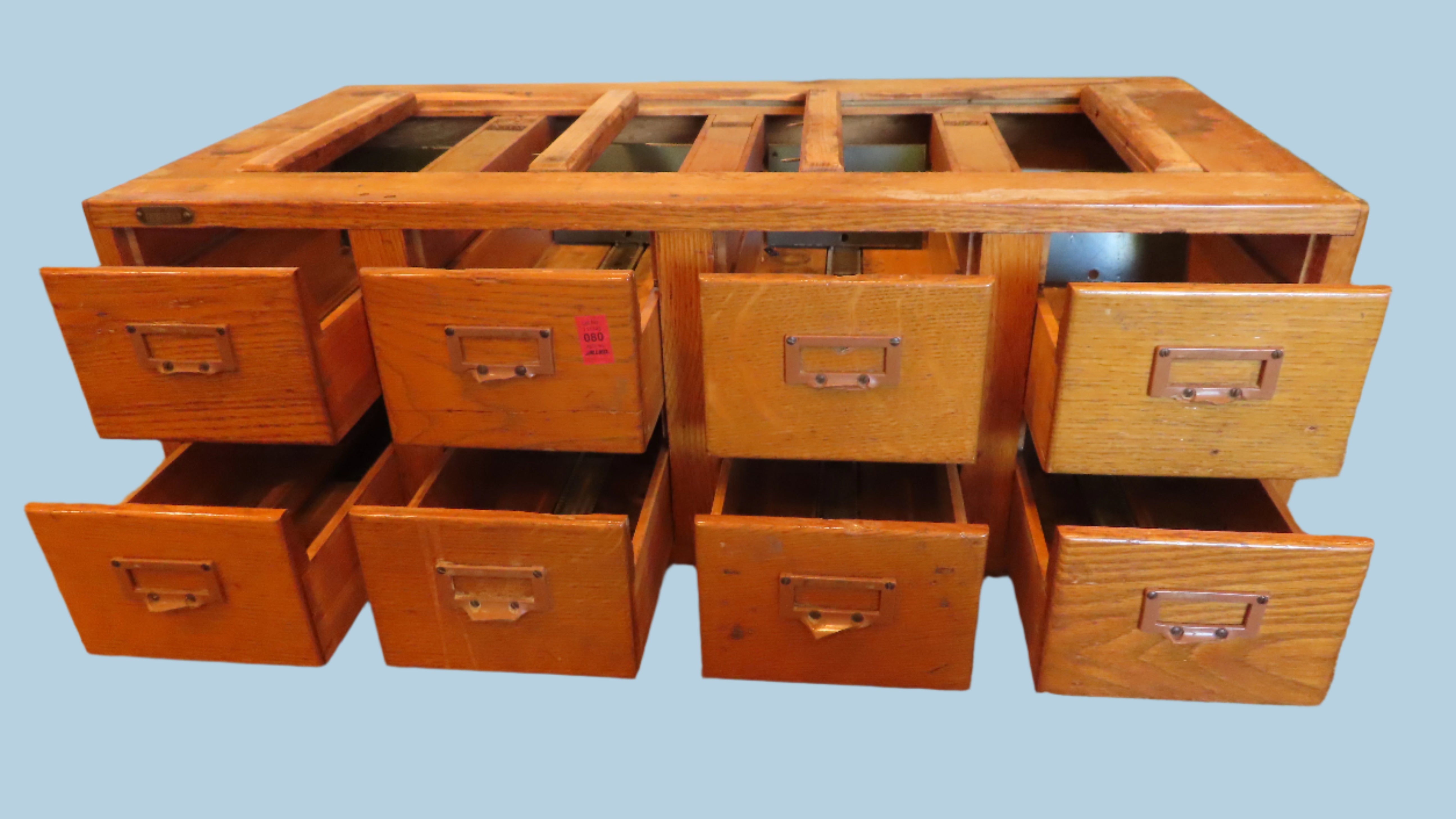Very cool vintage oak library card filing cabinet. 8 drawers in total, situated in 2 rows of 4. Made to stack with others of it's kind. Super cool for organizing or just for decorating a space with a more vintage aesthetic. Tag on left front side says Inventory Number 172715.