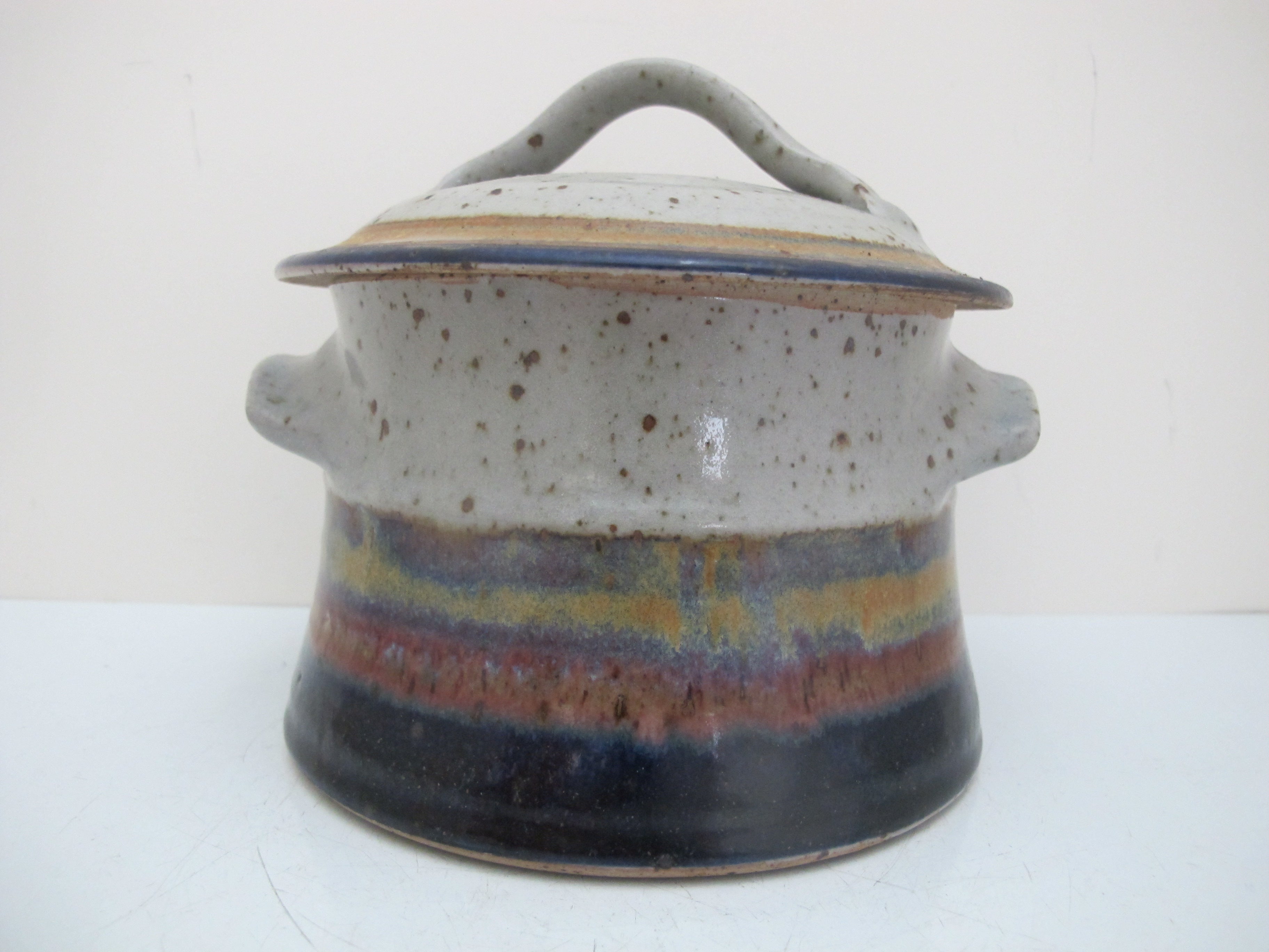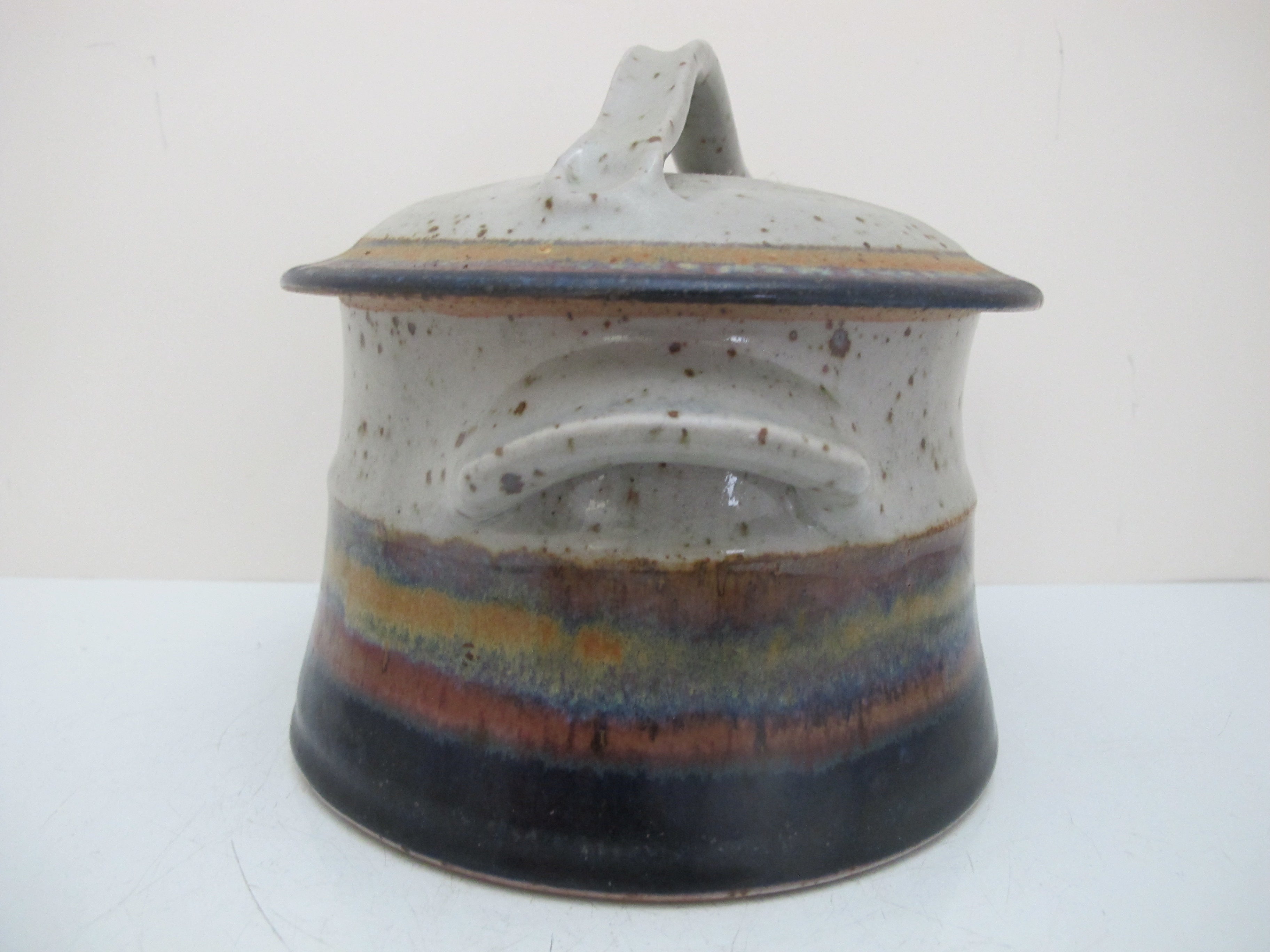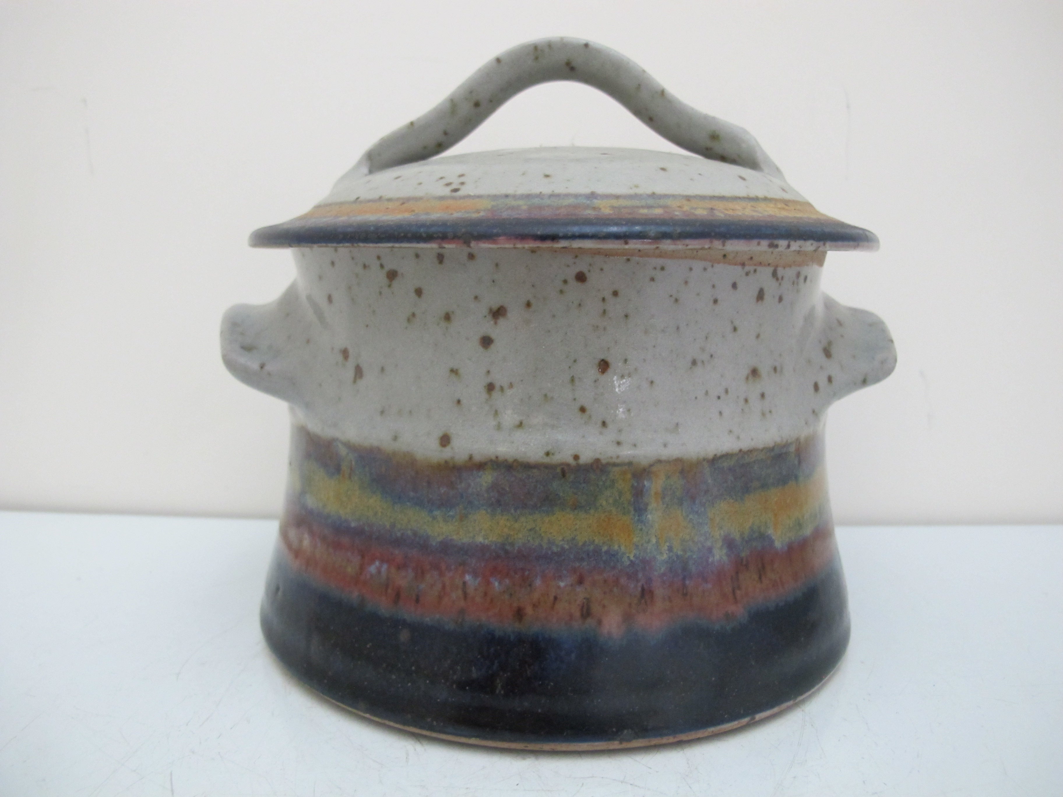 Ralph Lodewick, Pacific NW studio pottery jar with lid. Medium crock jar, round shape with handles in stoneware with circular bands in tones of blue, green, and pink.