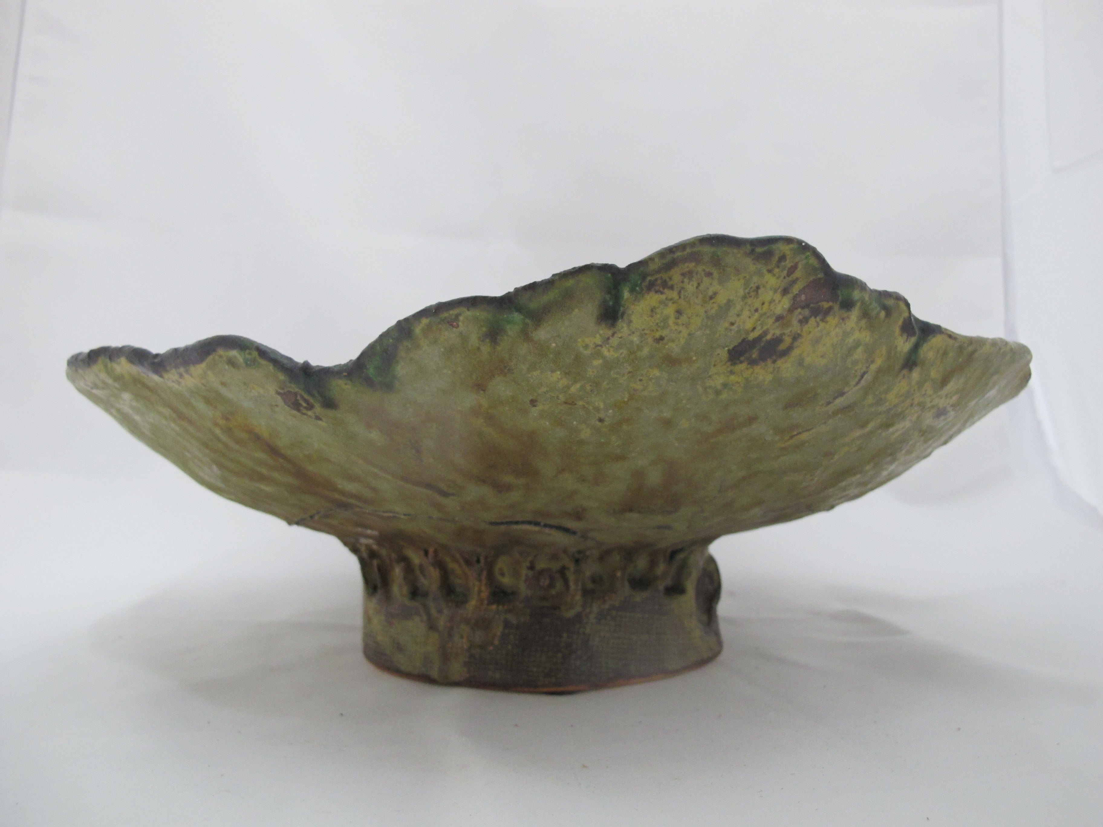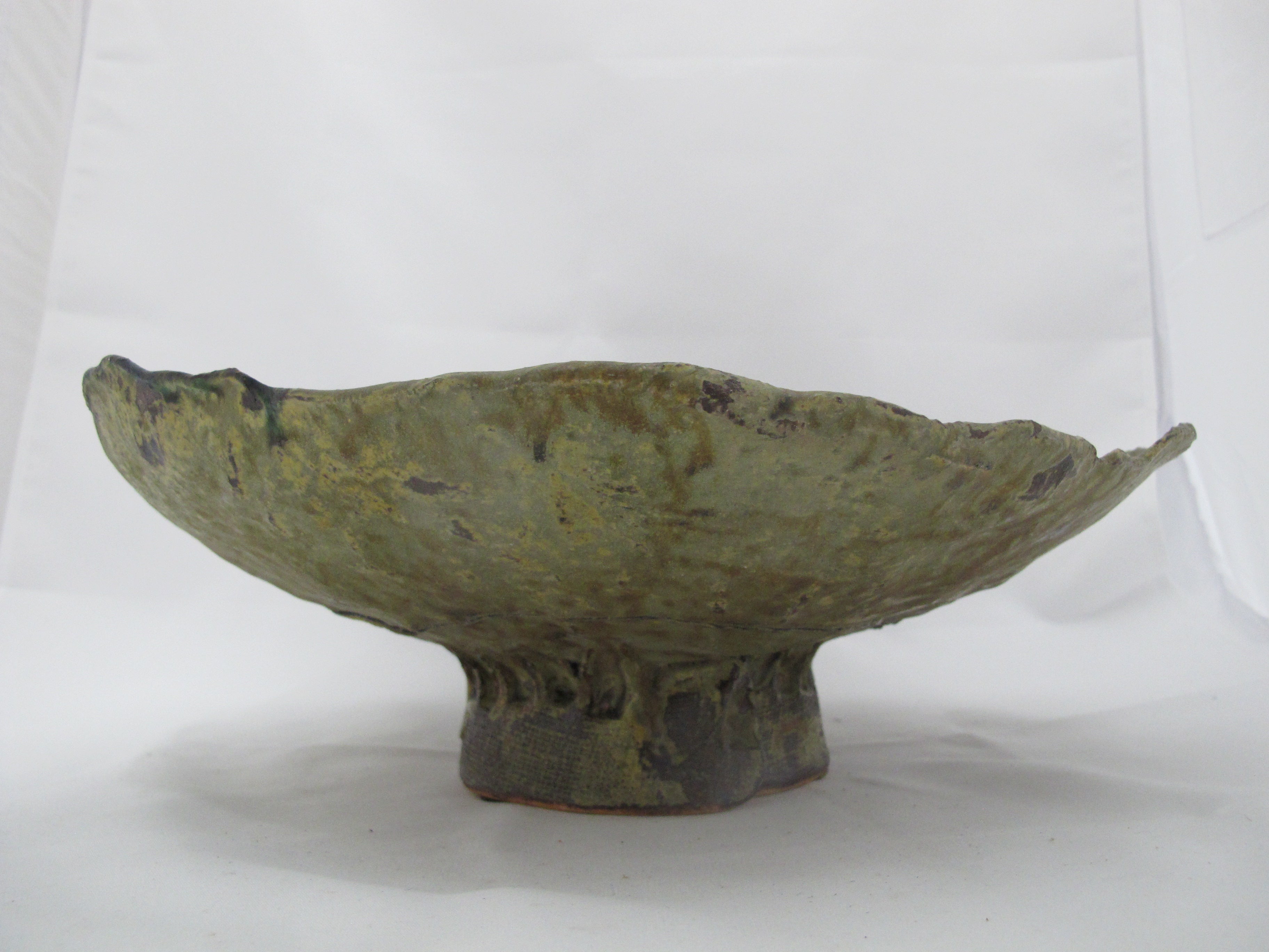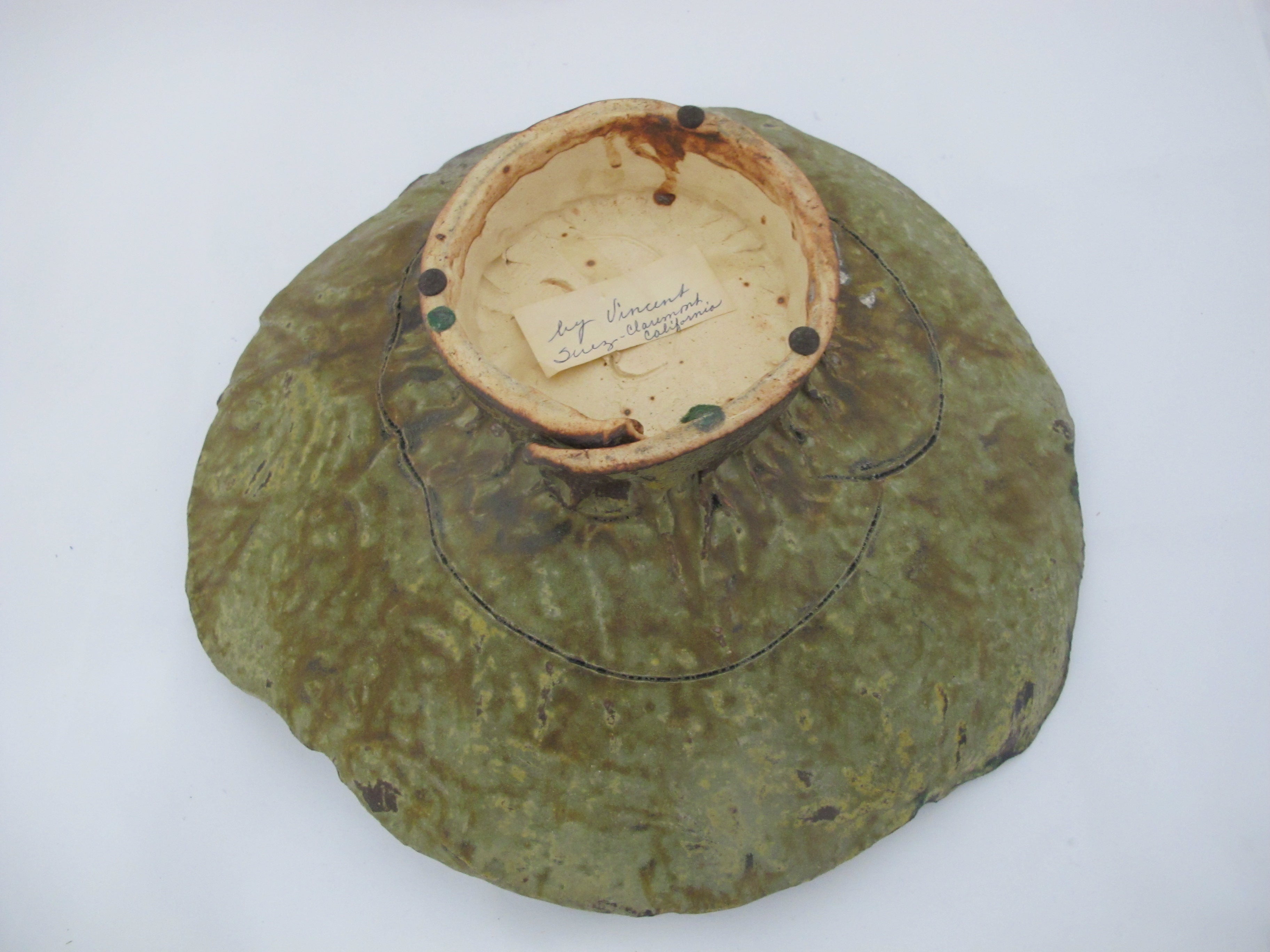 Vincent Suez studio art pottery sculpture. Footed bowl with irregular shape showing a colorful abstract enamel design on Earthenware. Measures 4 1/2" tall x 15" x 15".