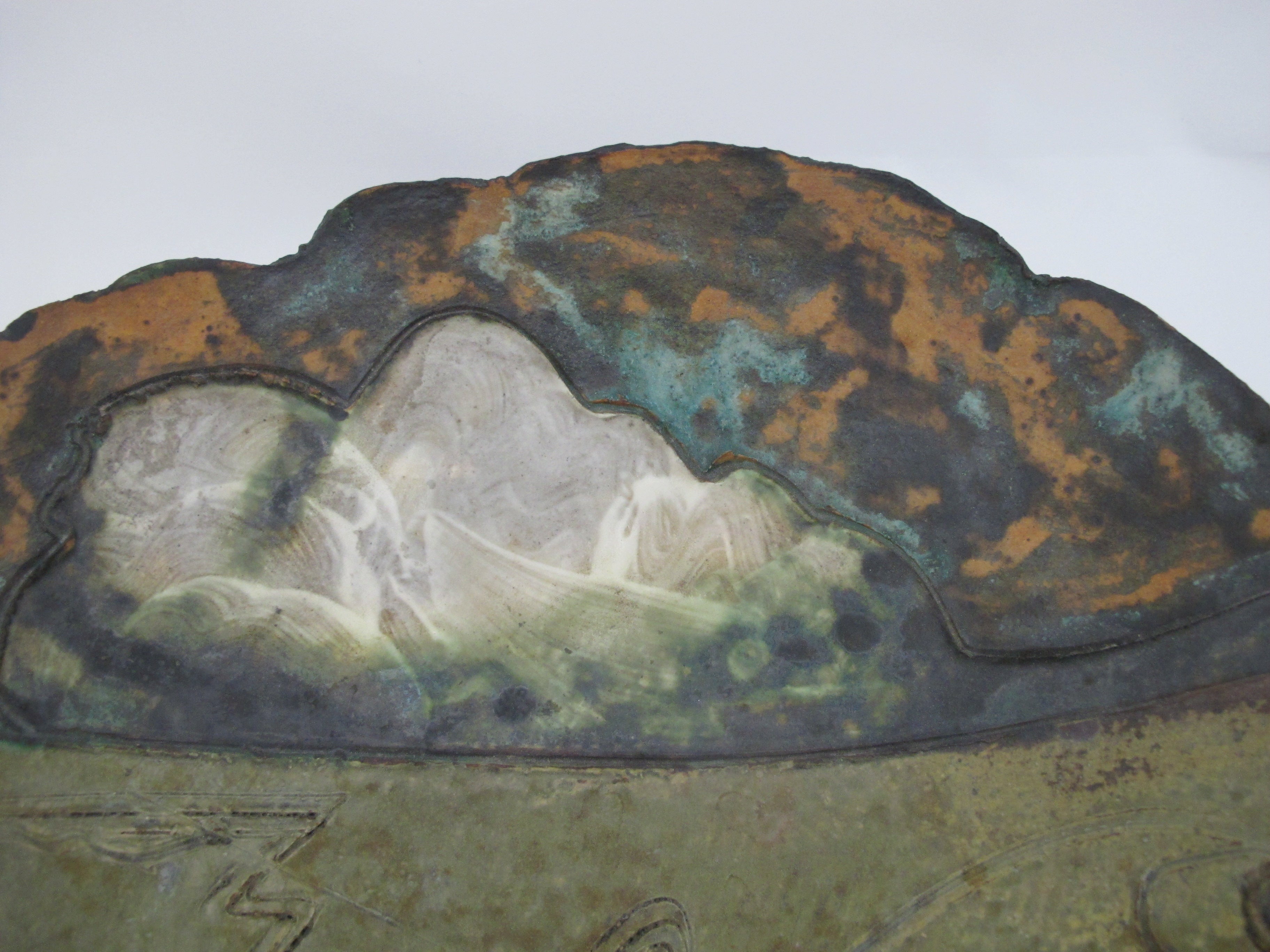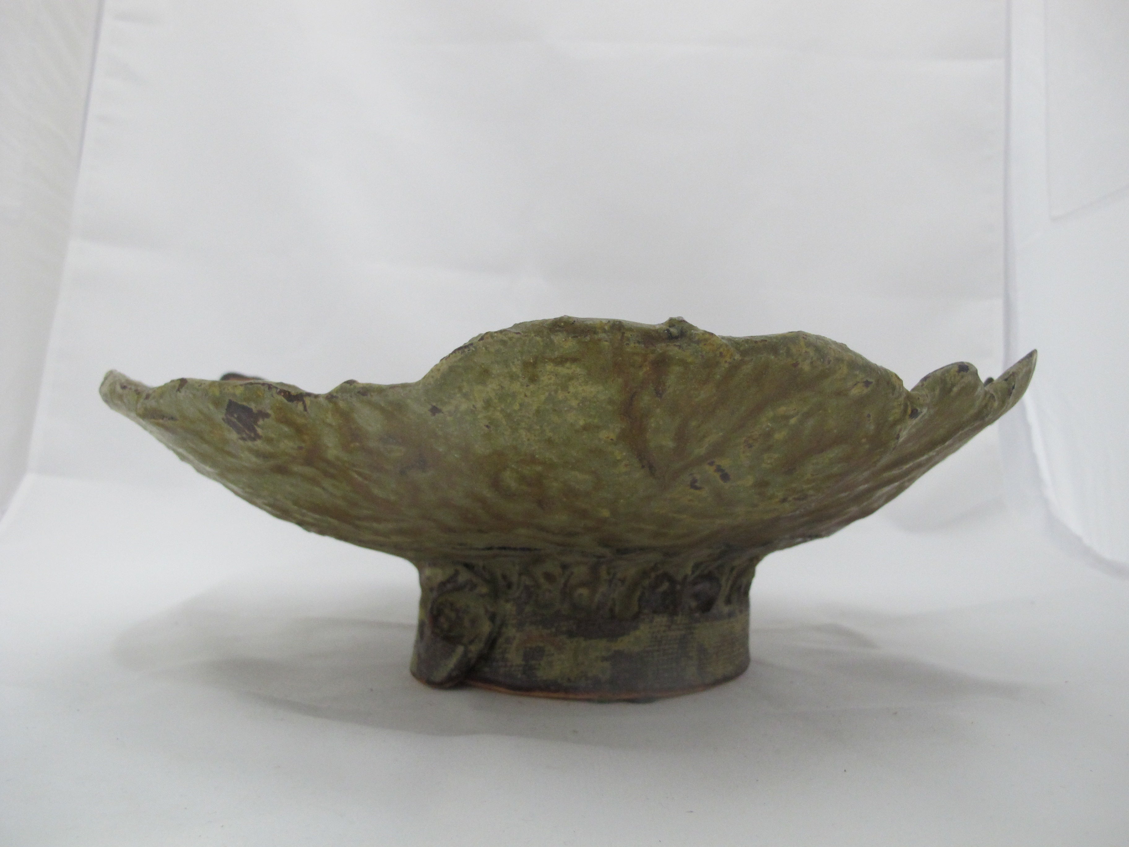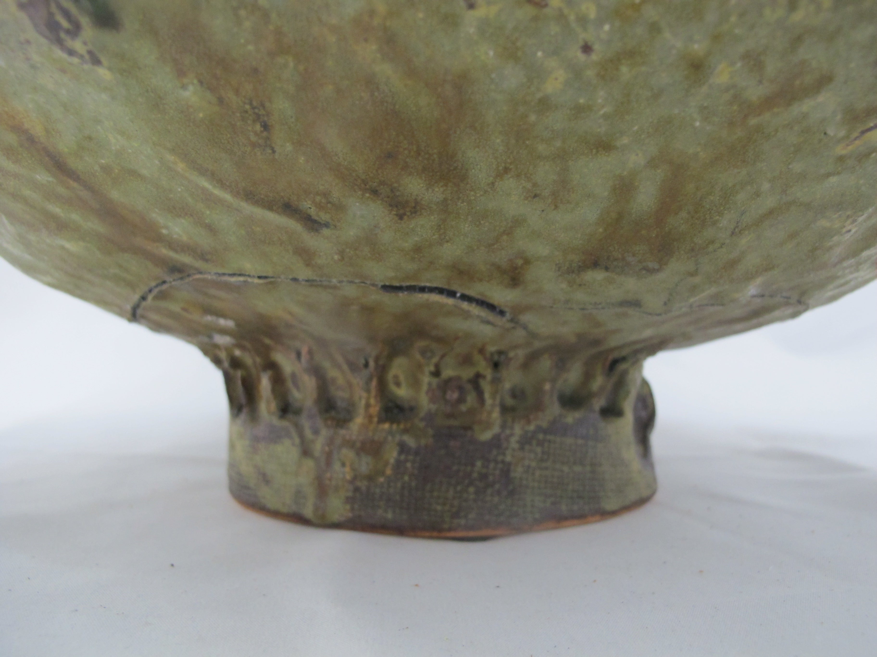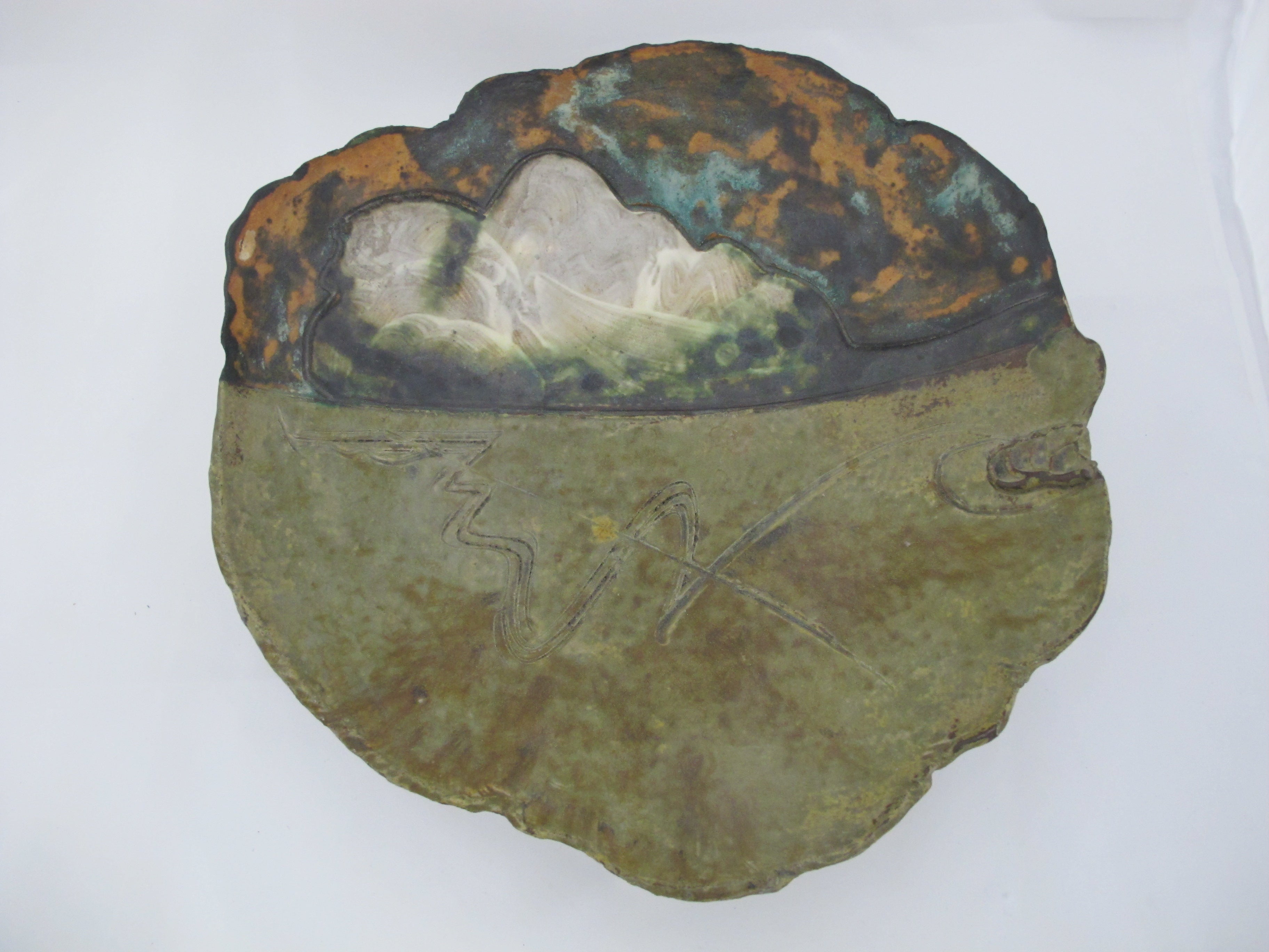 Vincent Suez studio art pottery sculpture. Footed bowl with irregular shape showing a colorful abstract enamel design on Earthenware. Measures 4 1/2" tall x 15" x 15".
