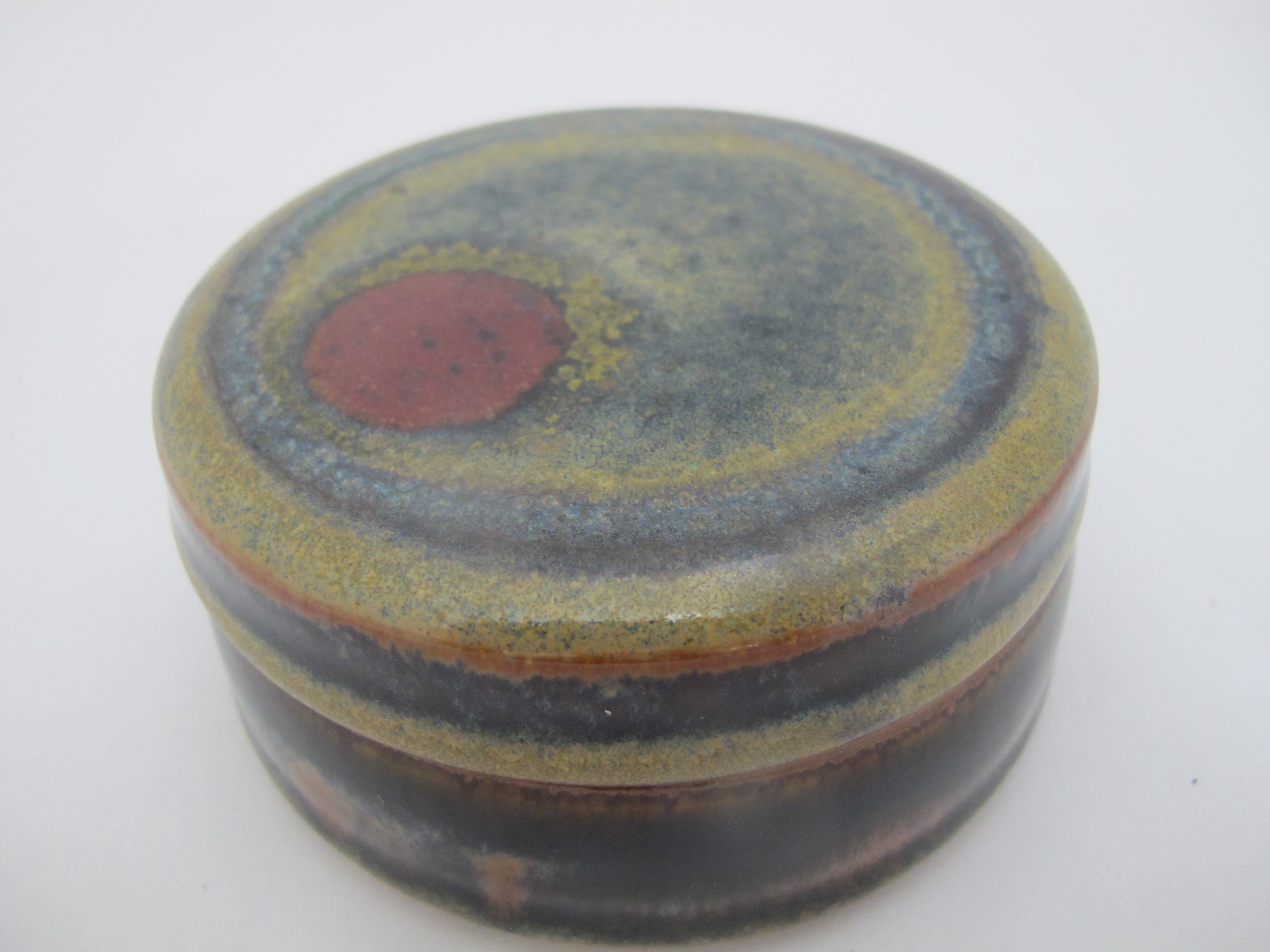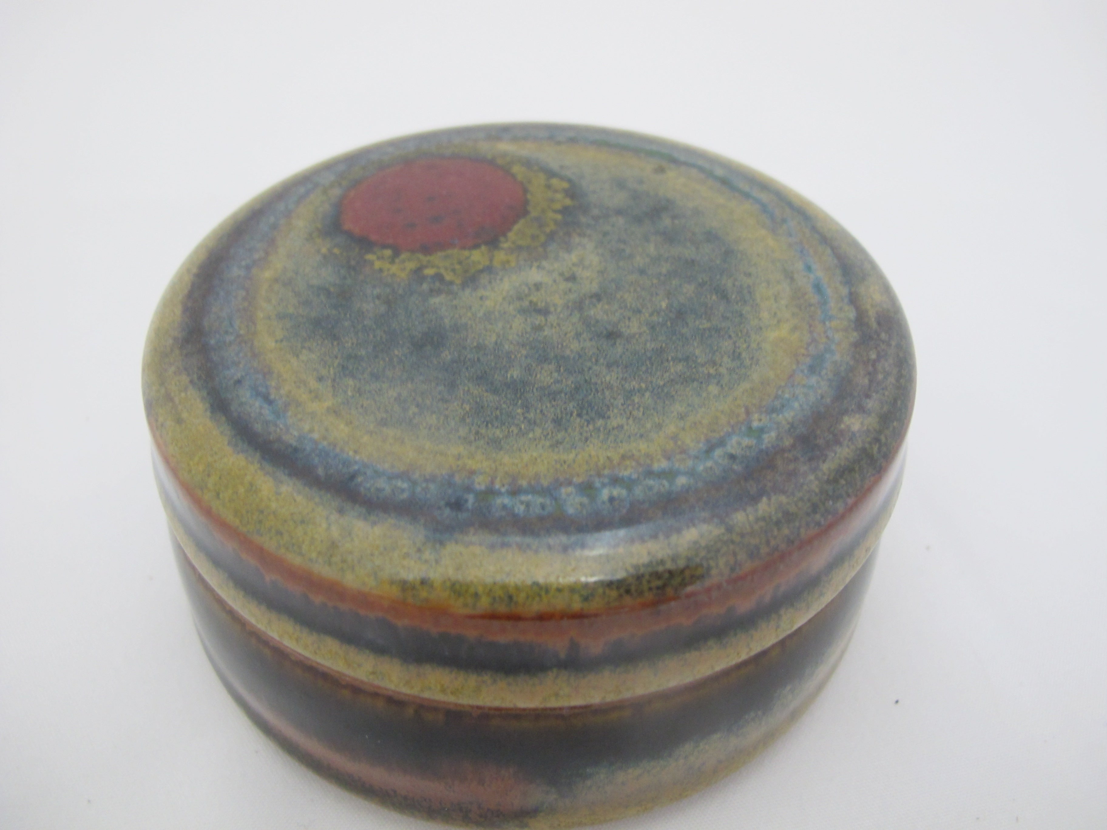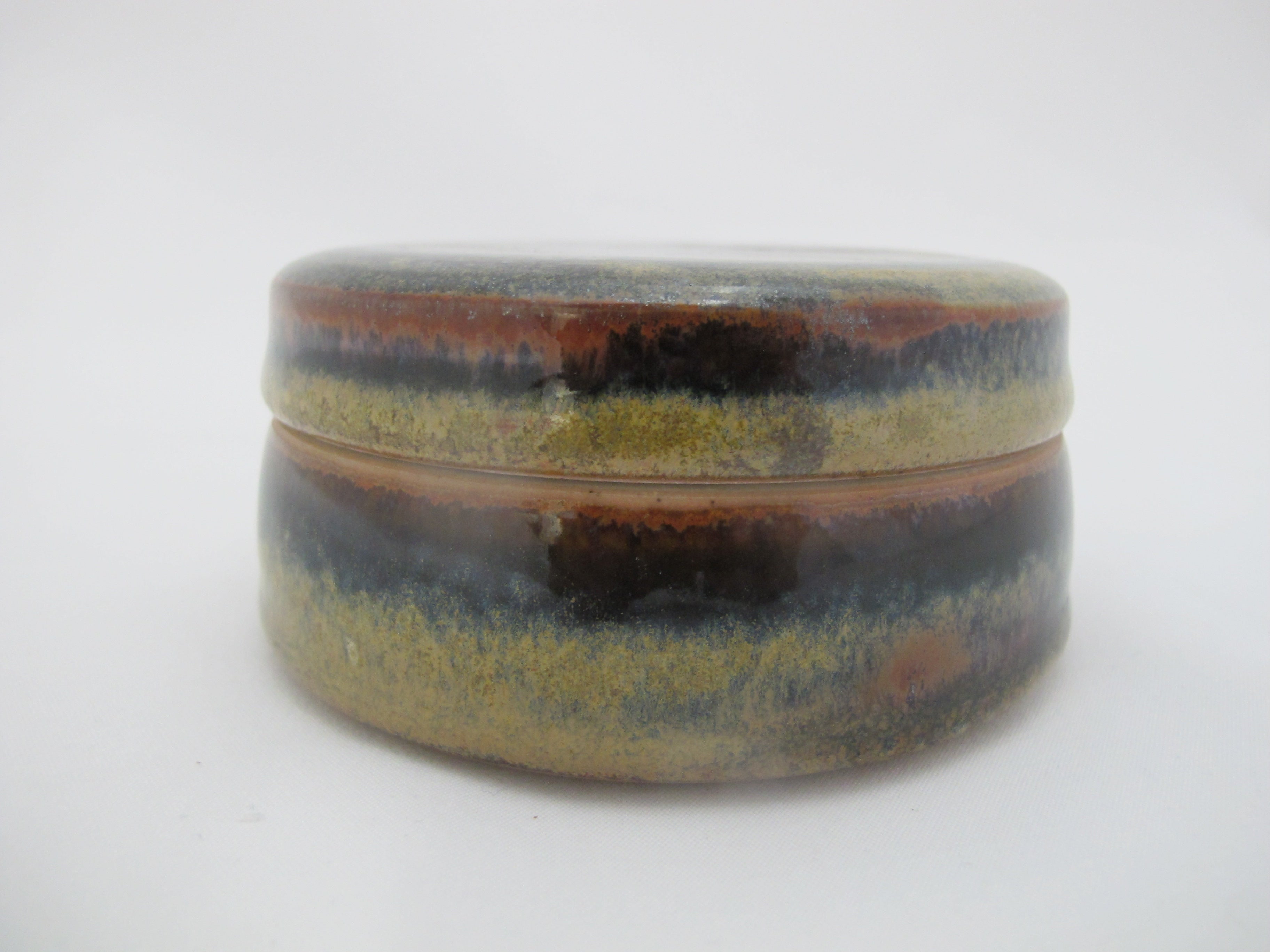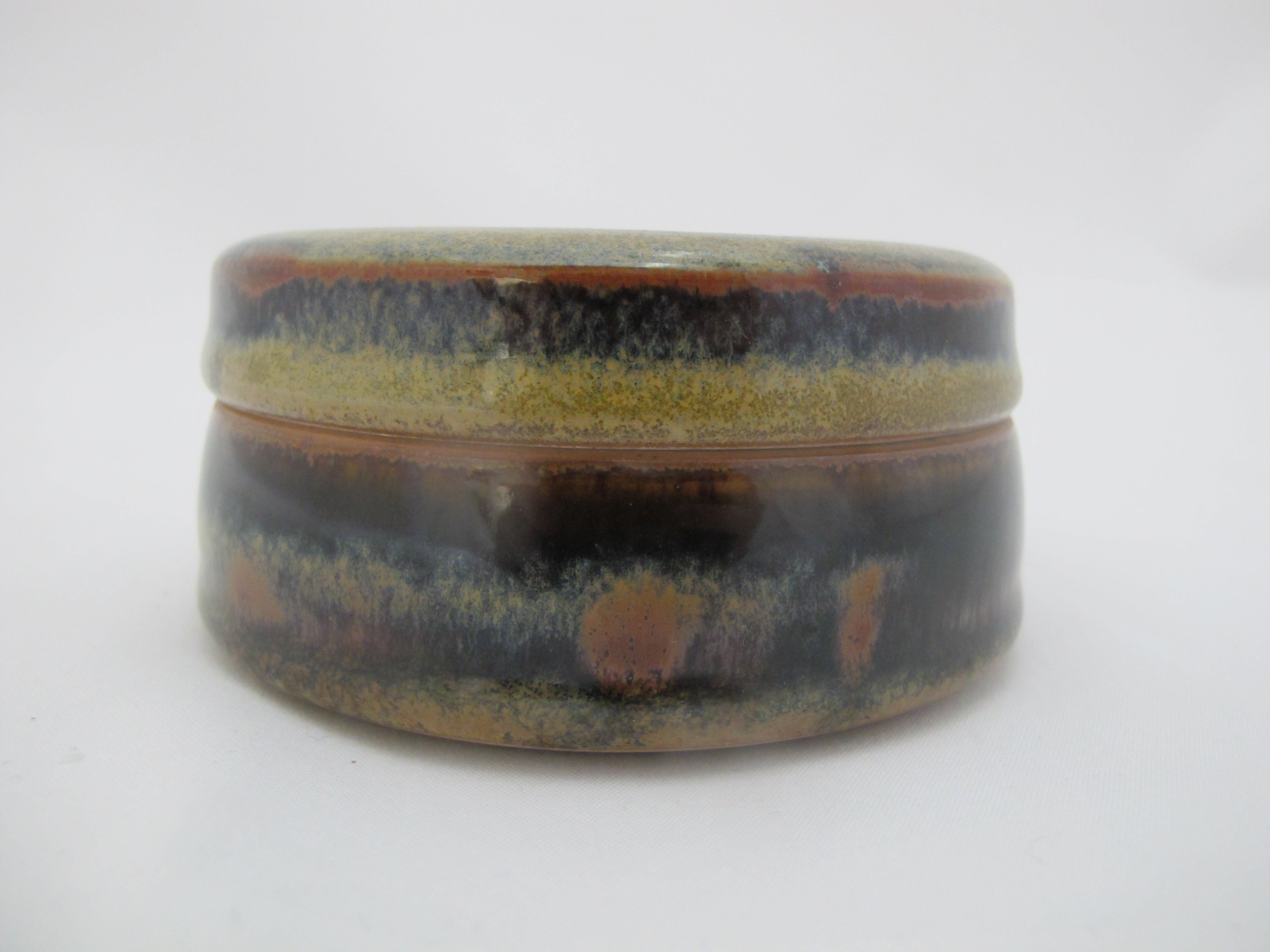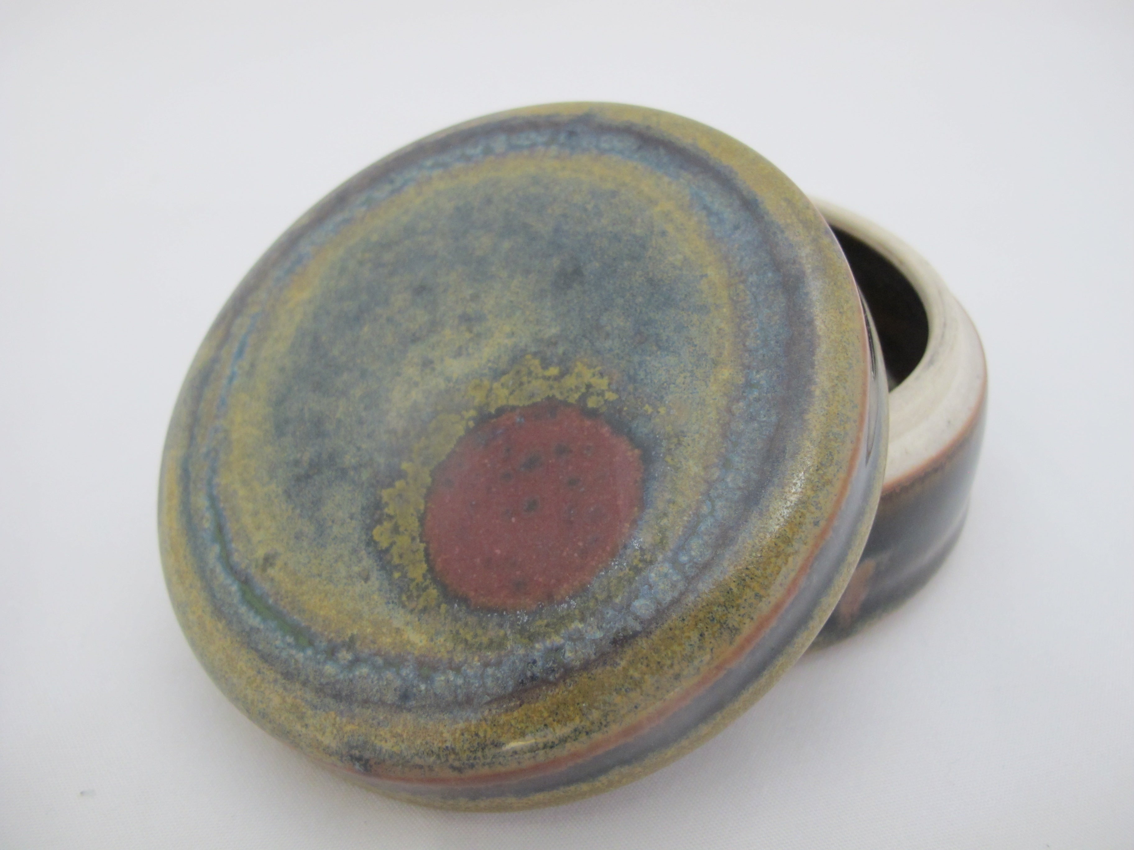 Round box or jar with lid. Glazed stoneware in earth tones of blue, red, and goly.