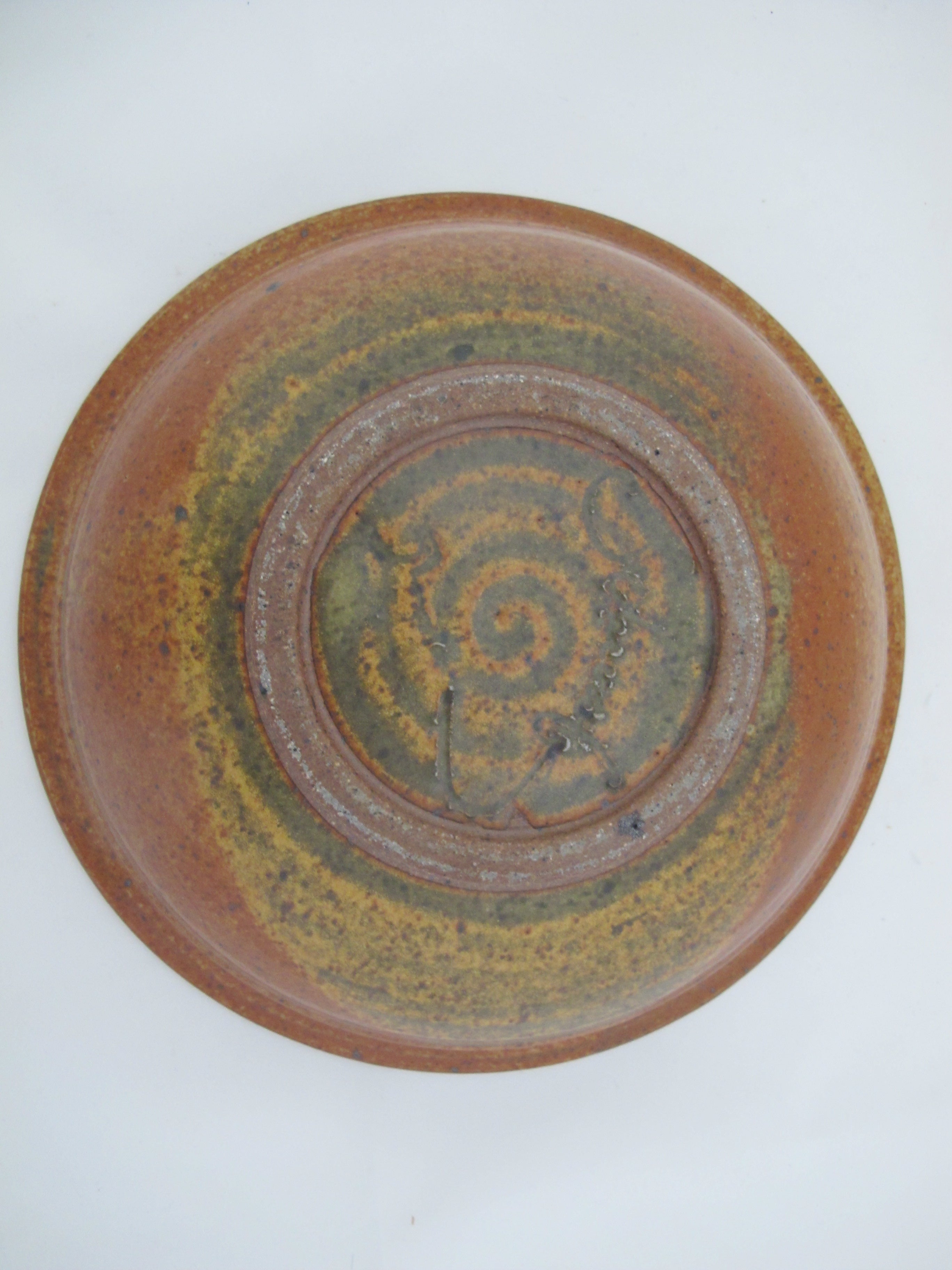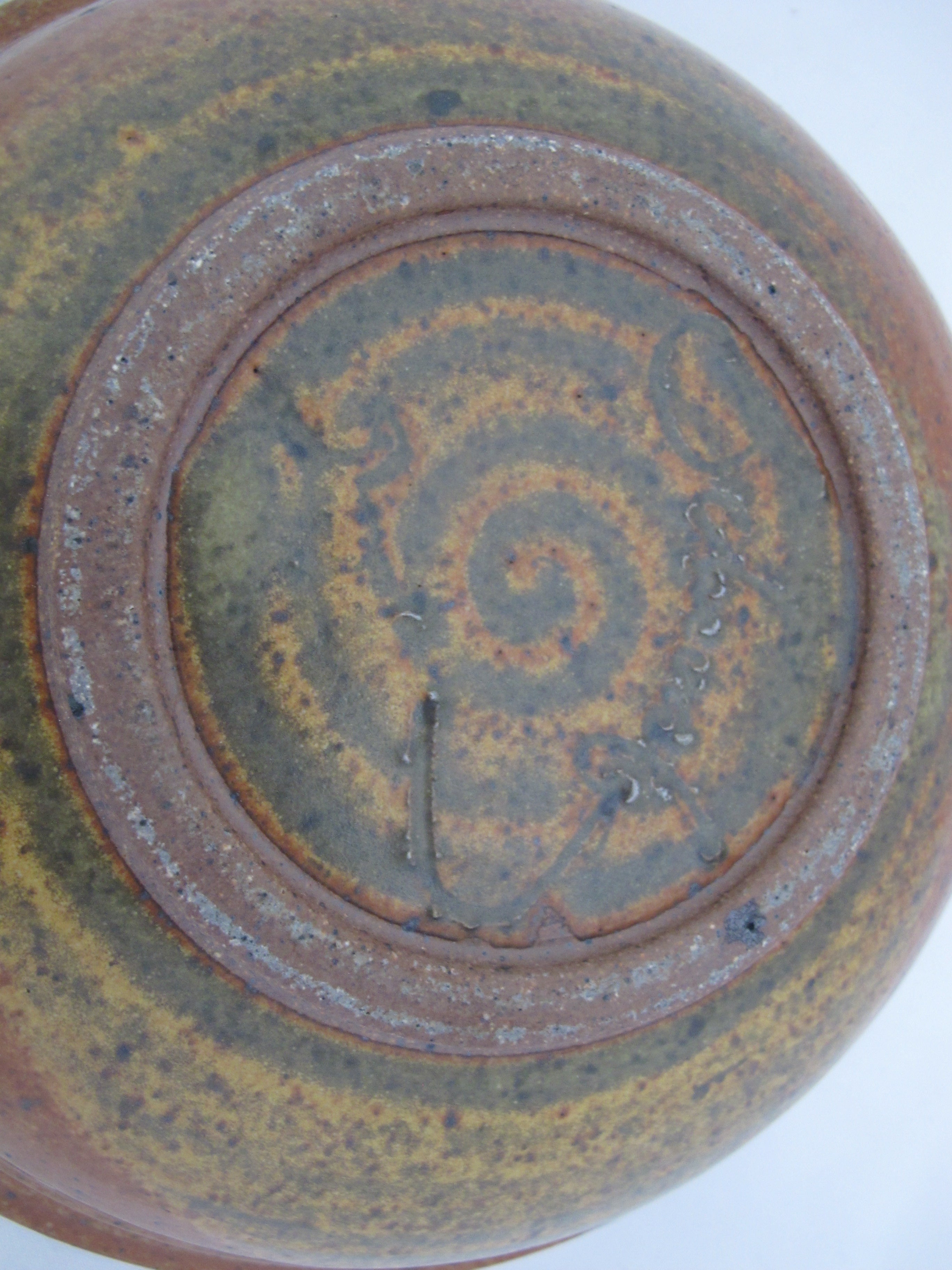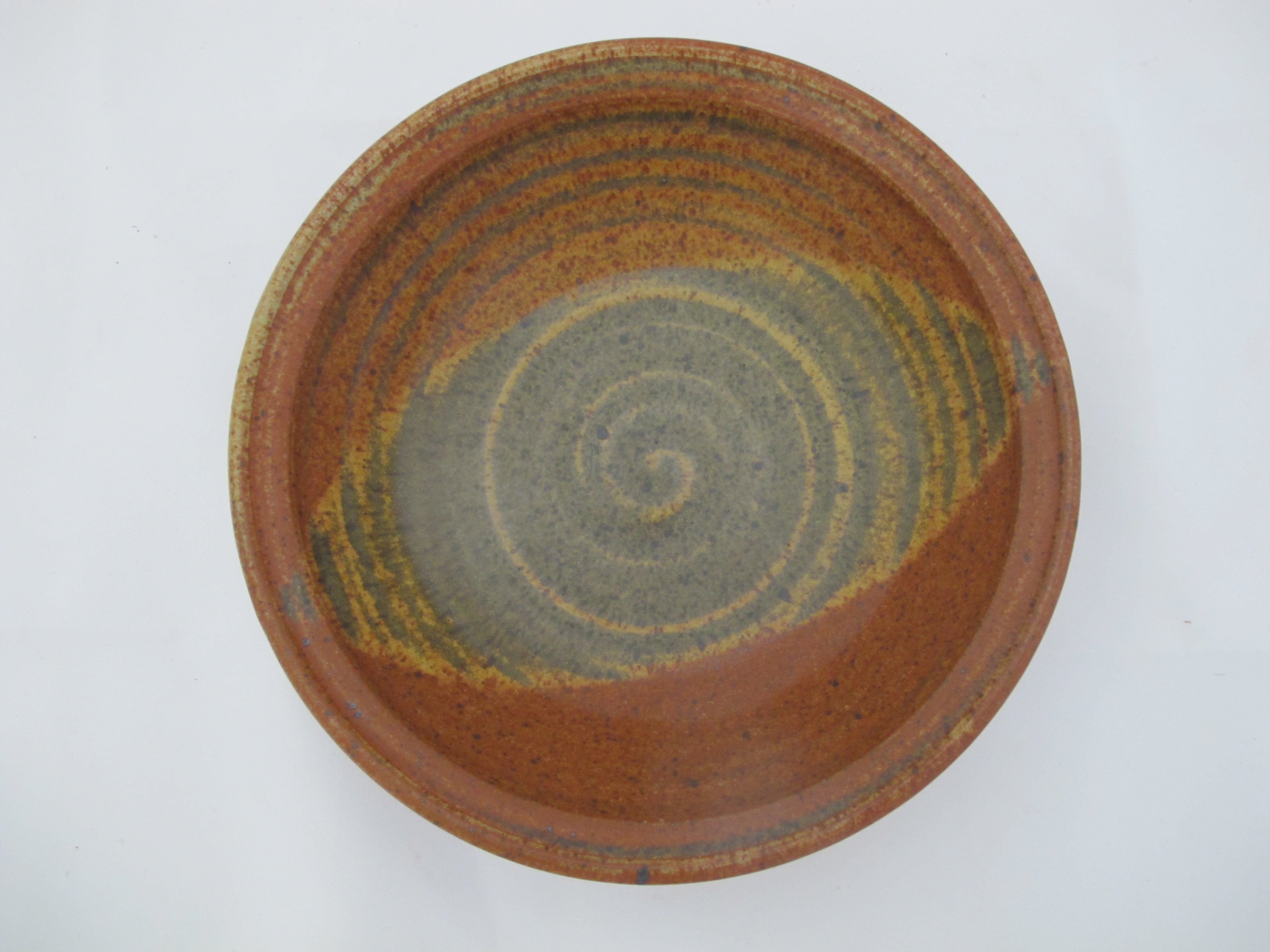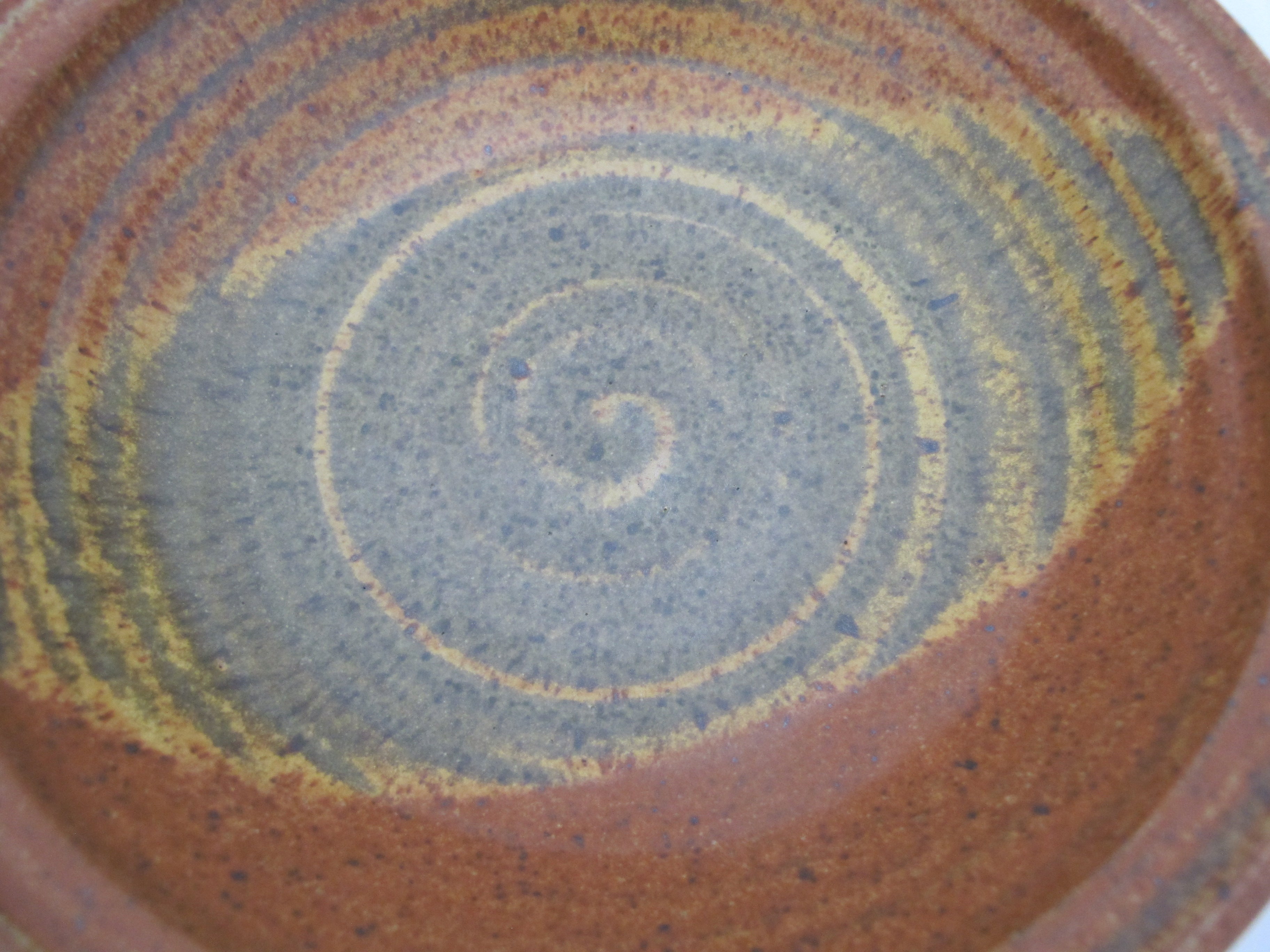 Heavy Stoneware with shadows and spirals of earth tones. Signed at base.