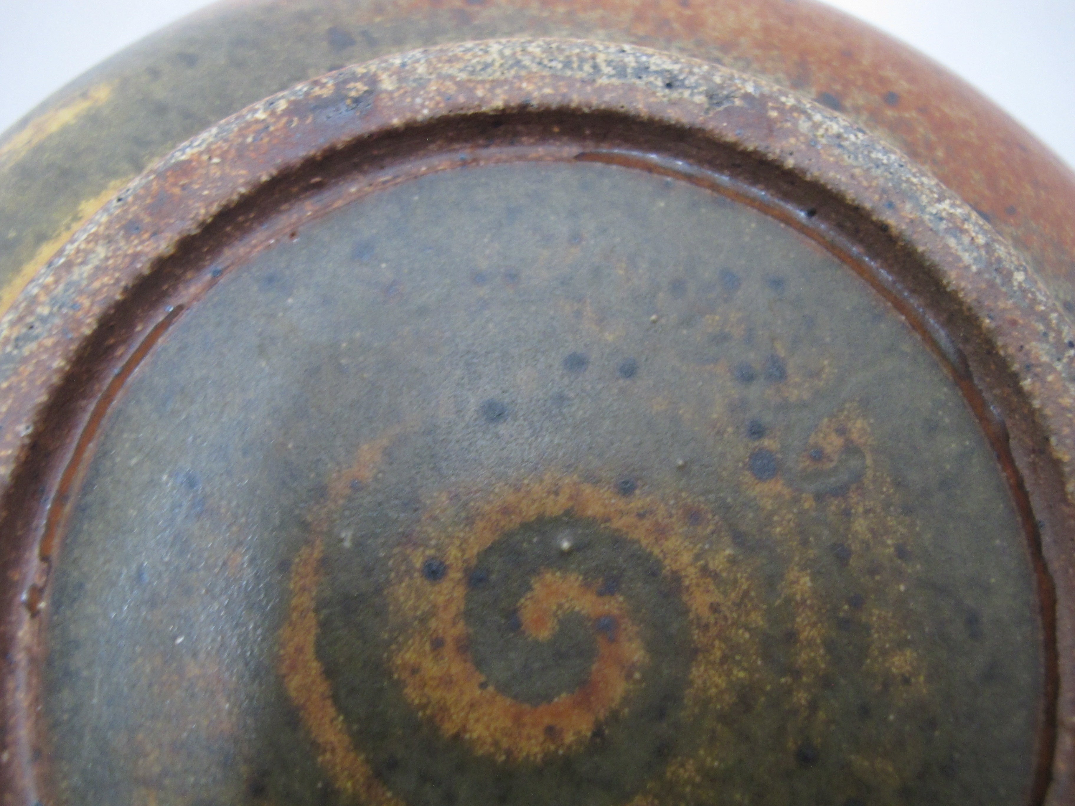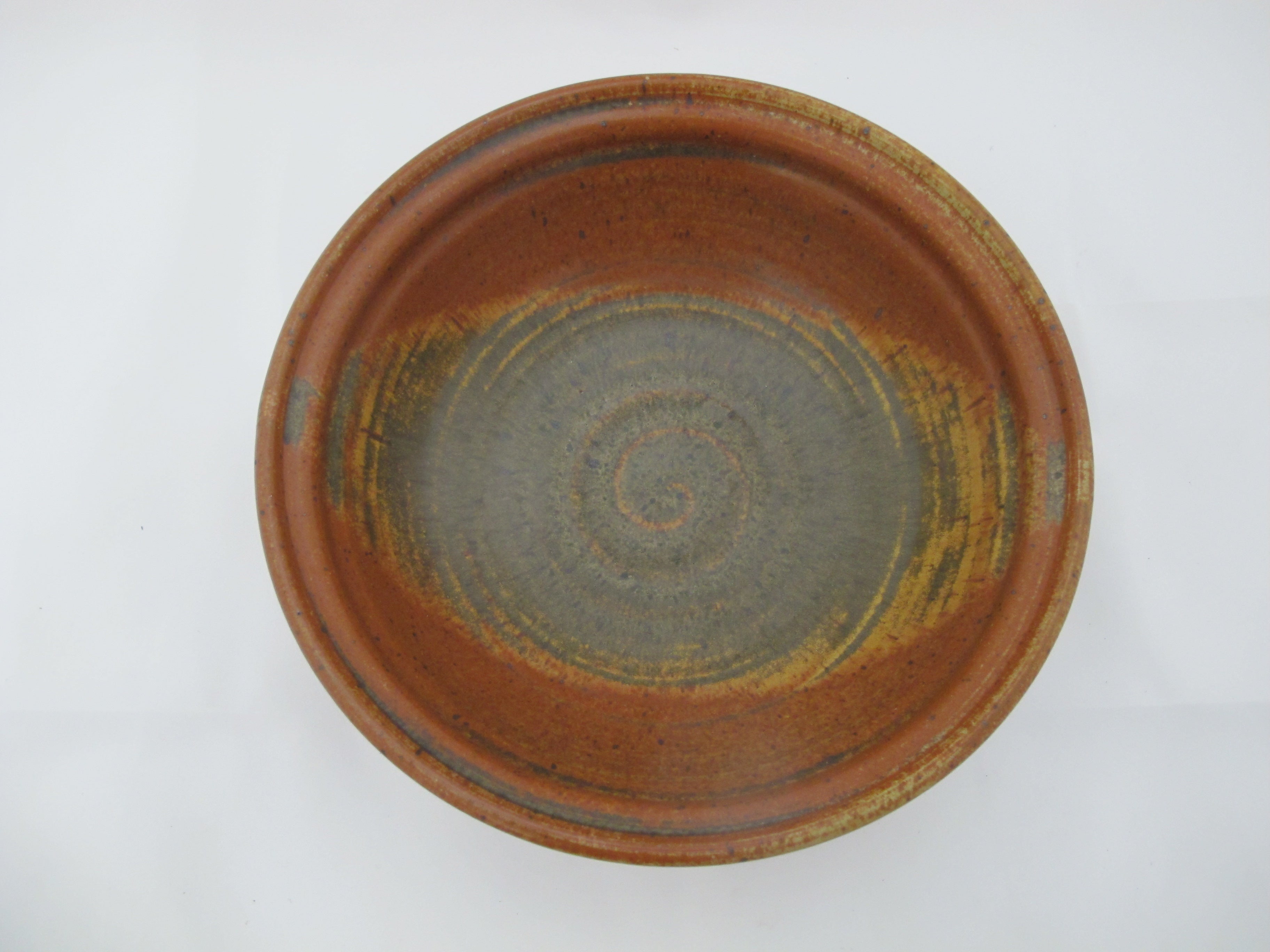 Heavy Stoneware with shadows and spirals of earth tones. Signed at base.