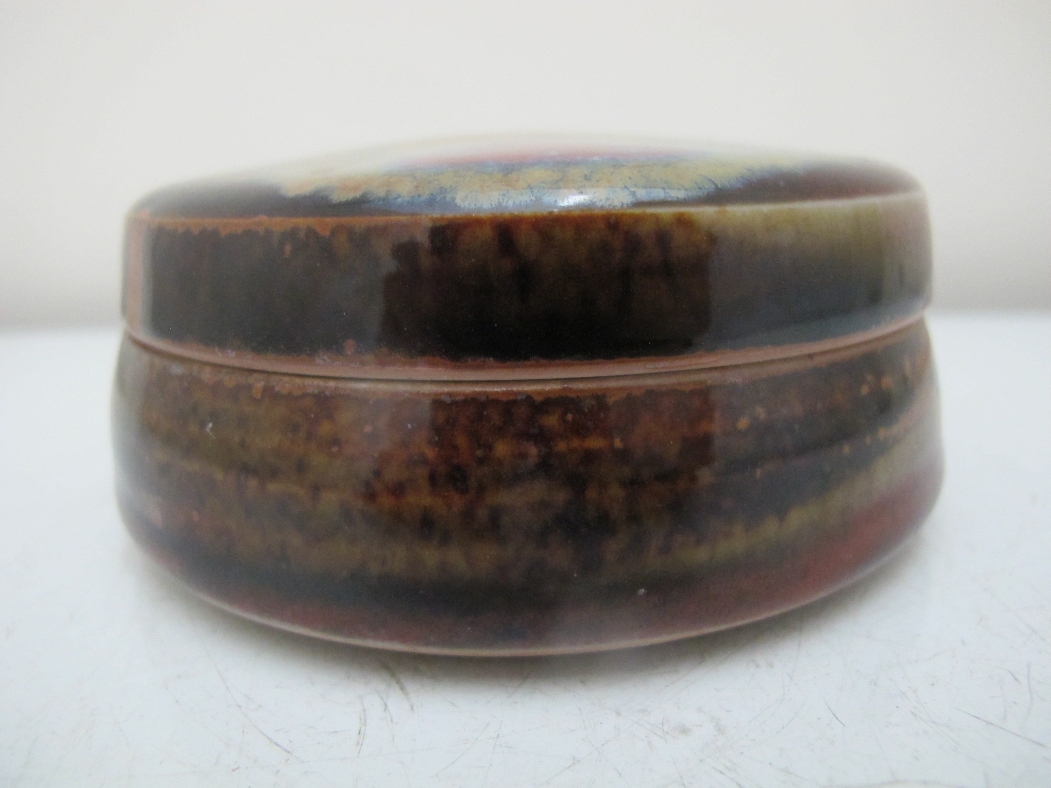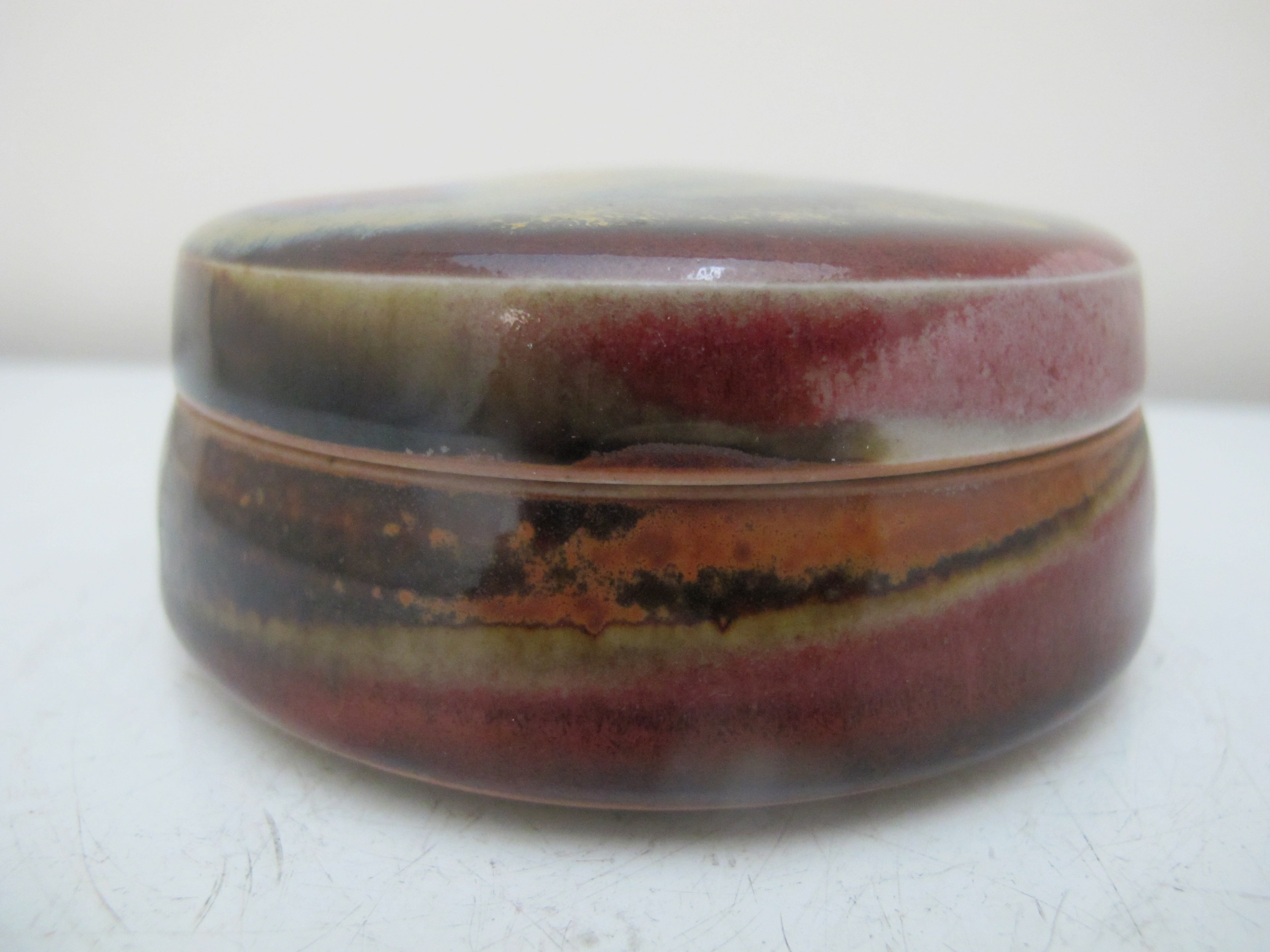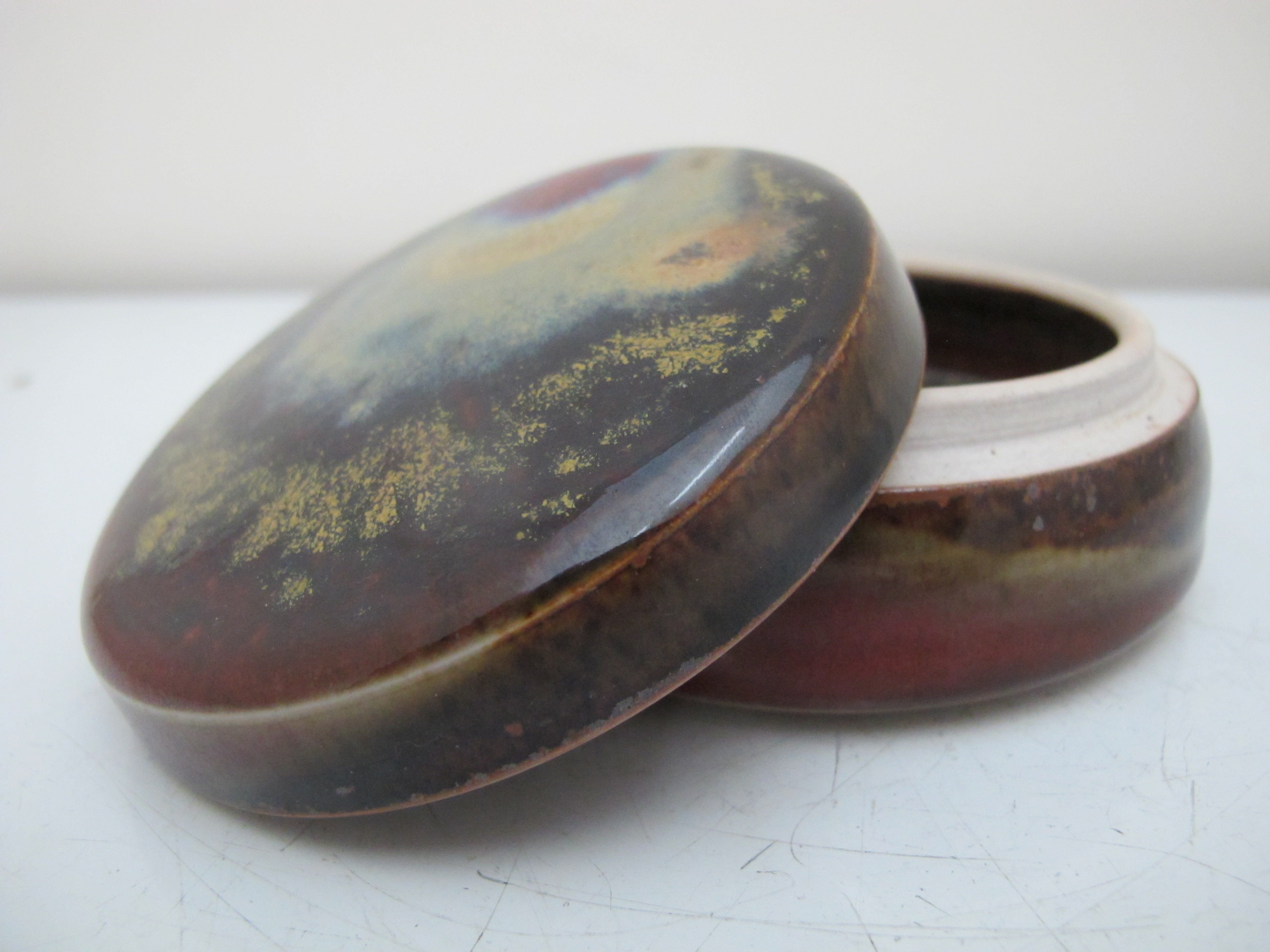 Wally Schwab stoneware box with lid. Schwab is a ceramic artist from Oregon known for creating functional stoneware with simple forms and vivid, earthy colors.