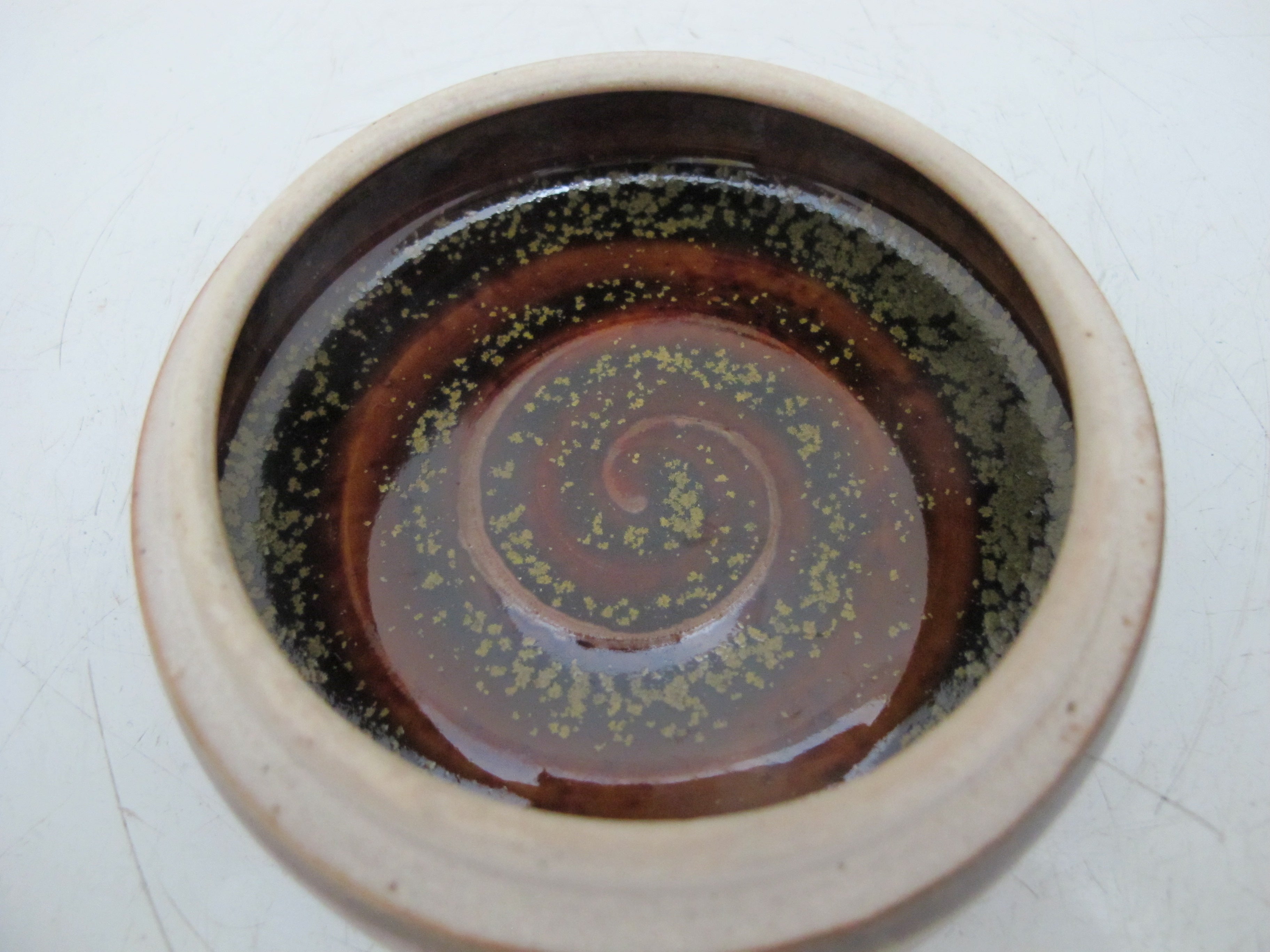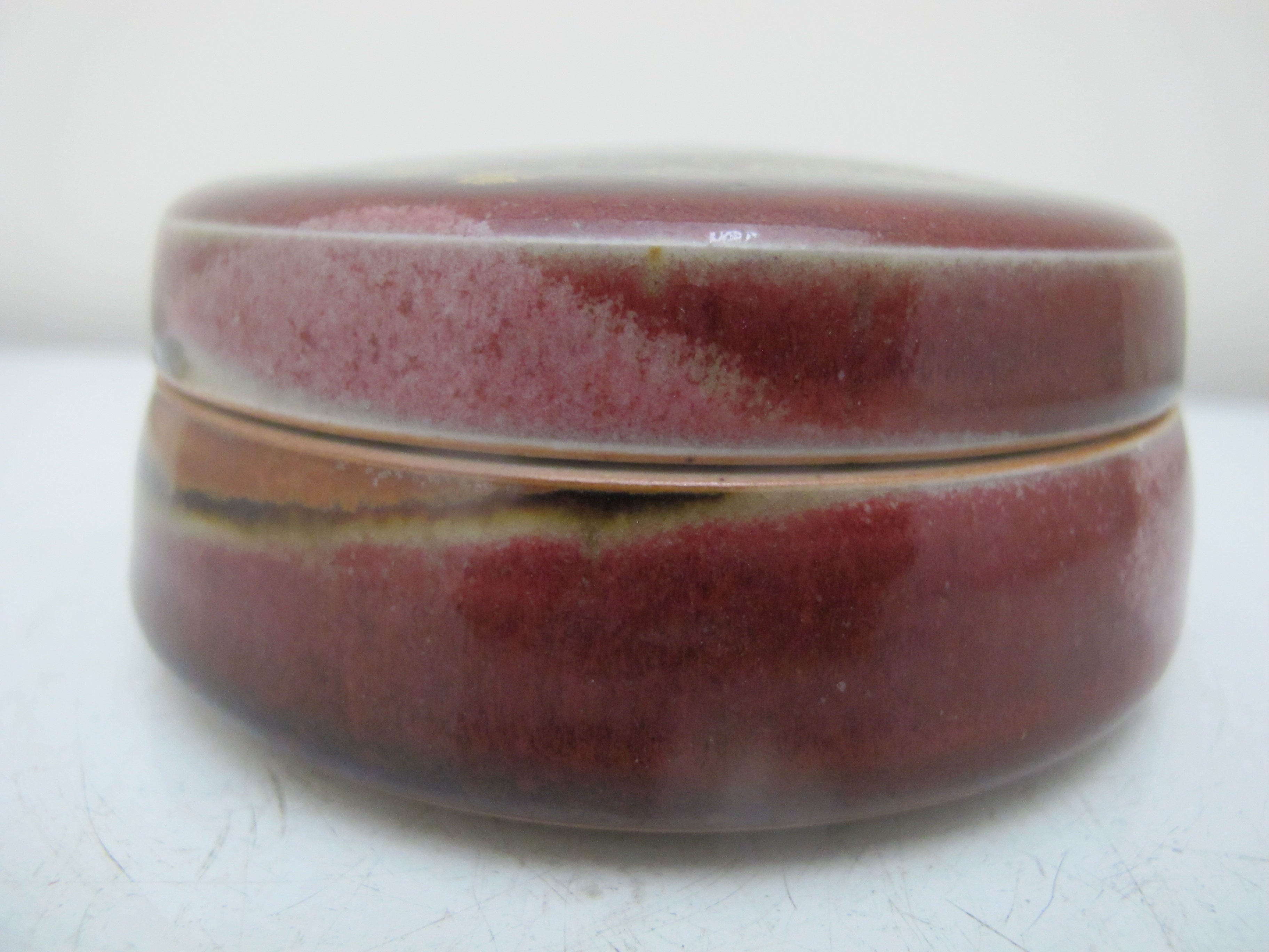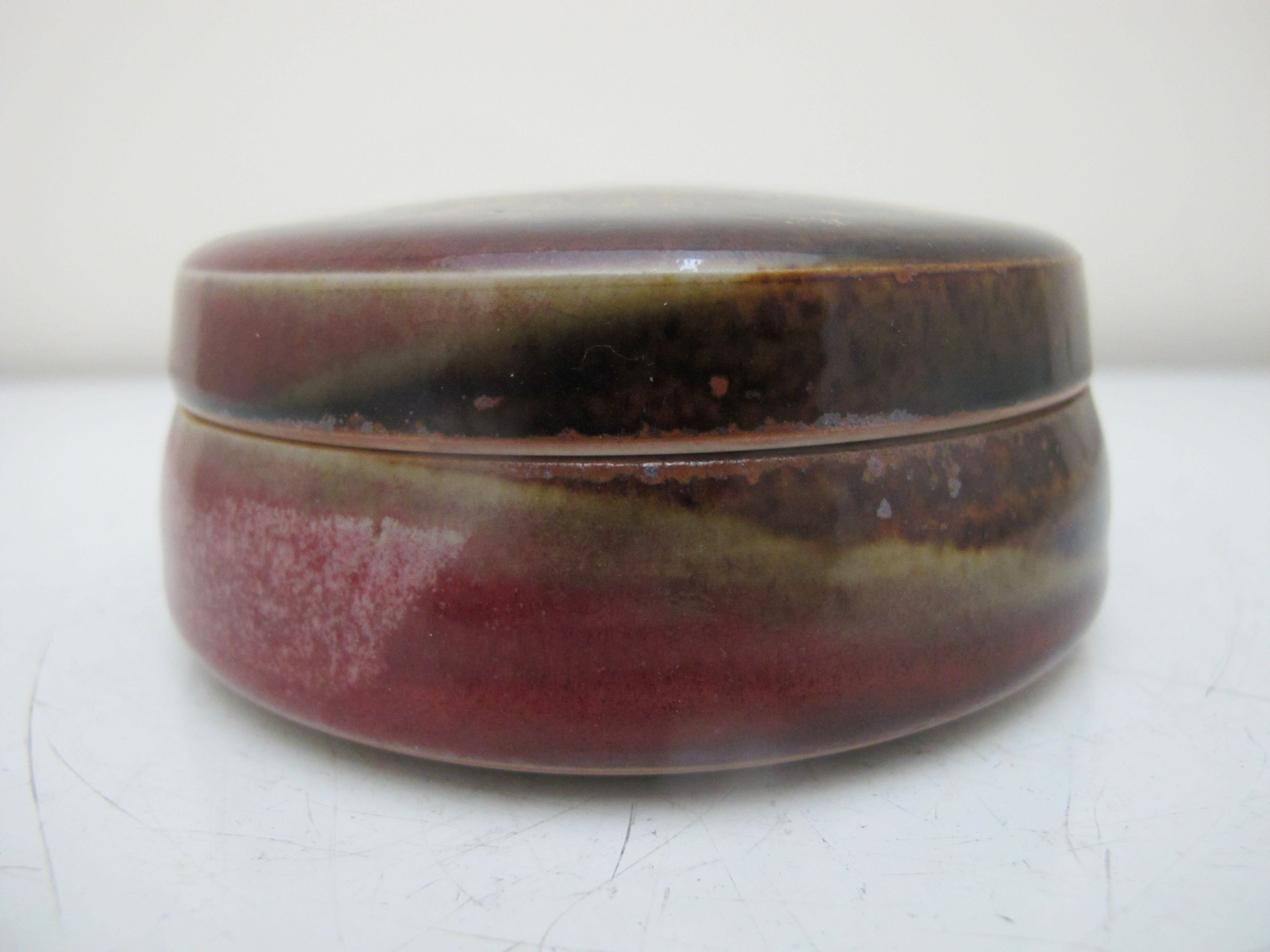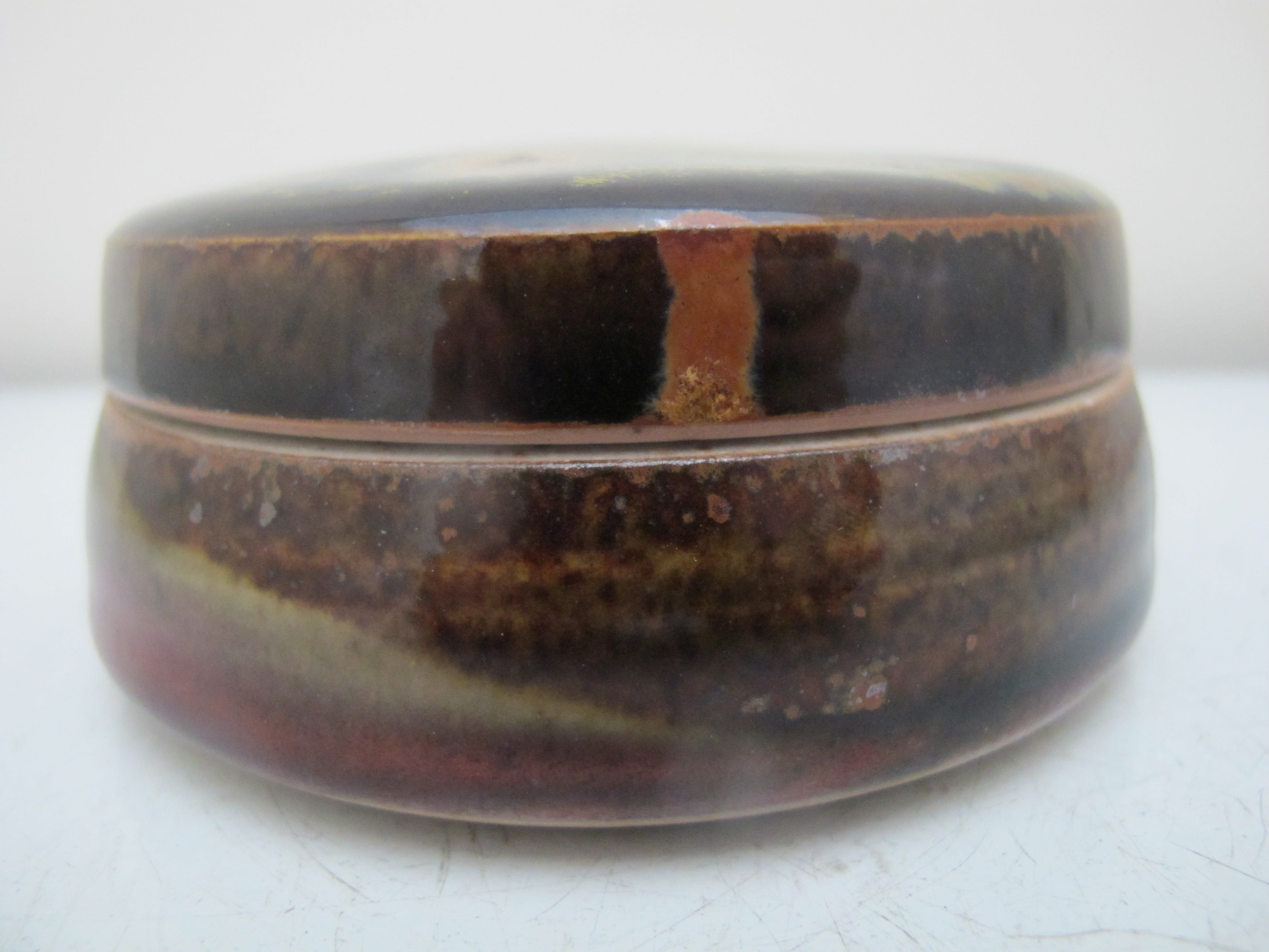 Wally Schwab stoneware box with lid. Schwab is a ceramic artist from Oregon known for creating functional stoneware with simple forms and vivid, earthy colors.