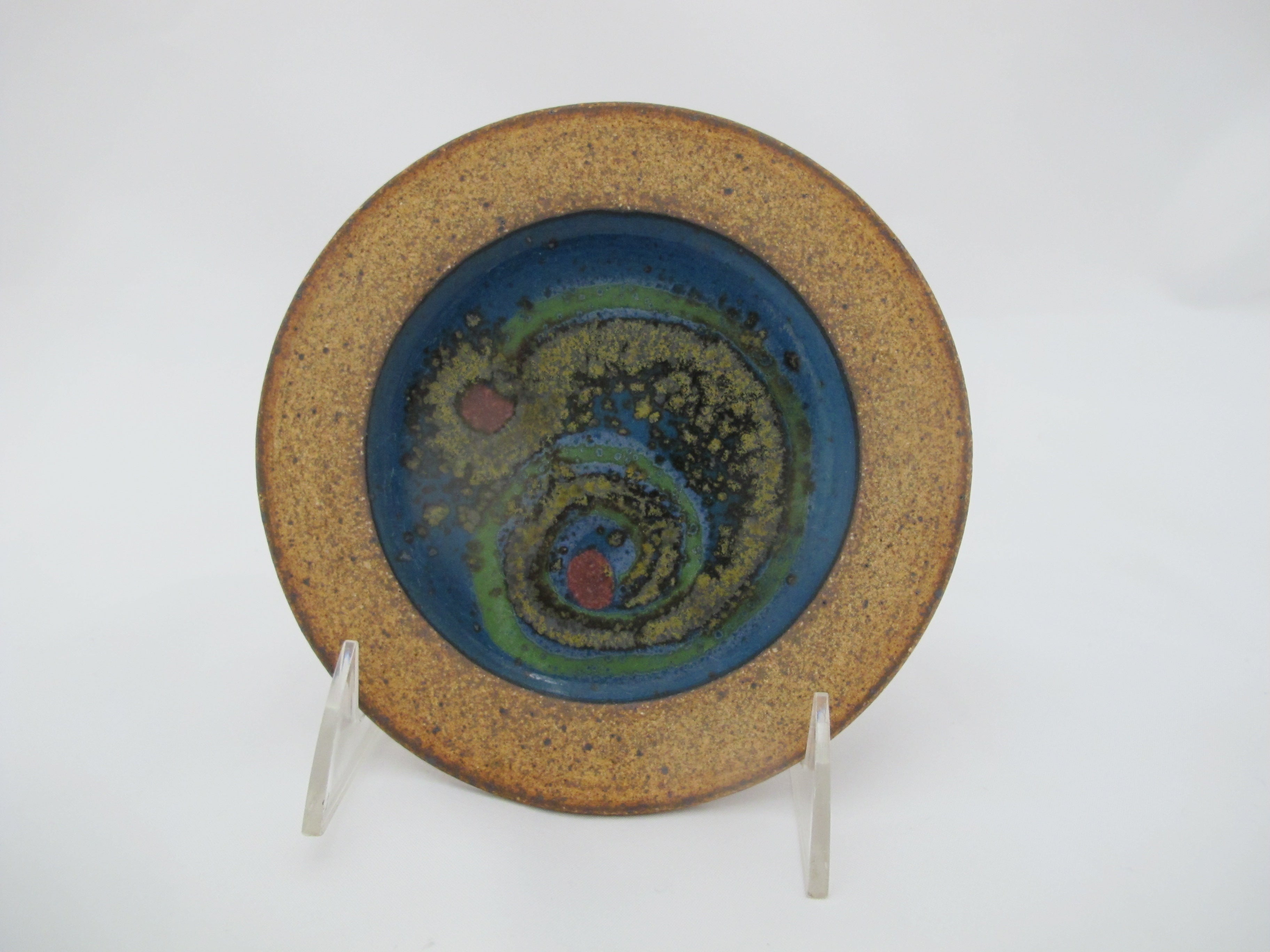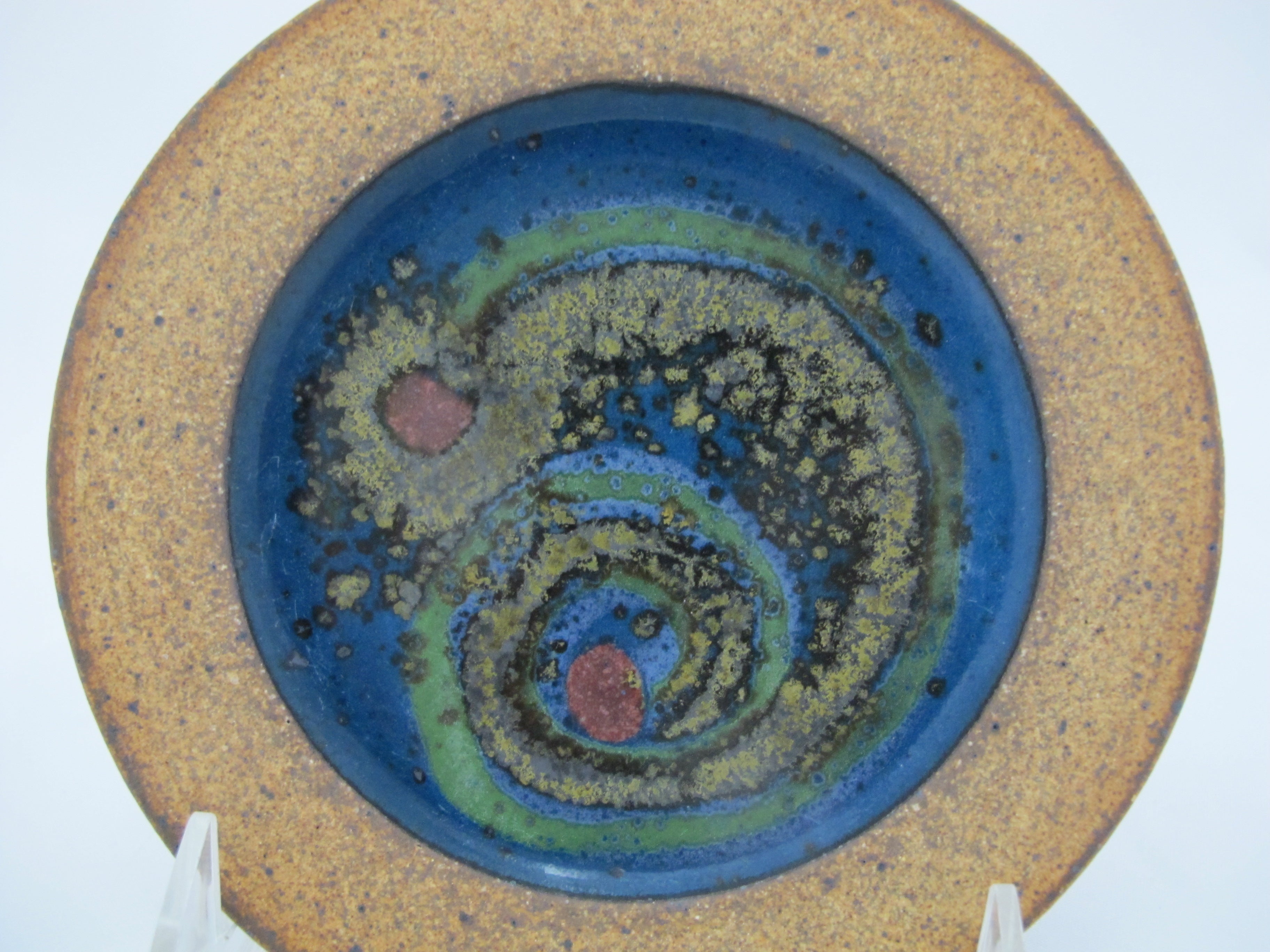 Substantial Wally Schwab studio pottery trivet dish. Schwab is a ceramic artist from Oregon known for creating functional stoneware with simple forms and vivid, earthy colors. This is prime example of his master pottery skills. Unique, rustic, and beautiful!